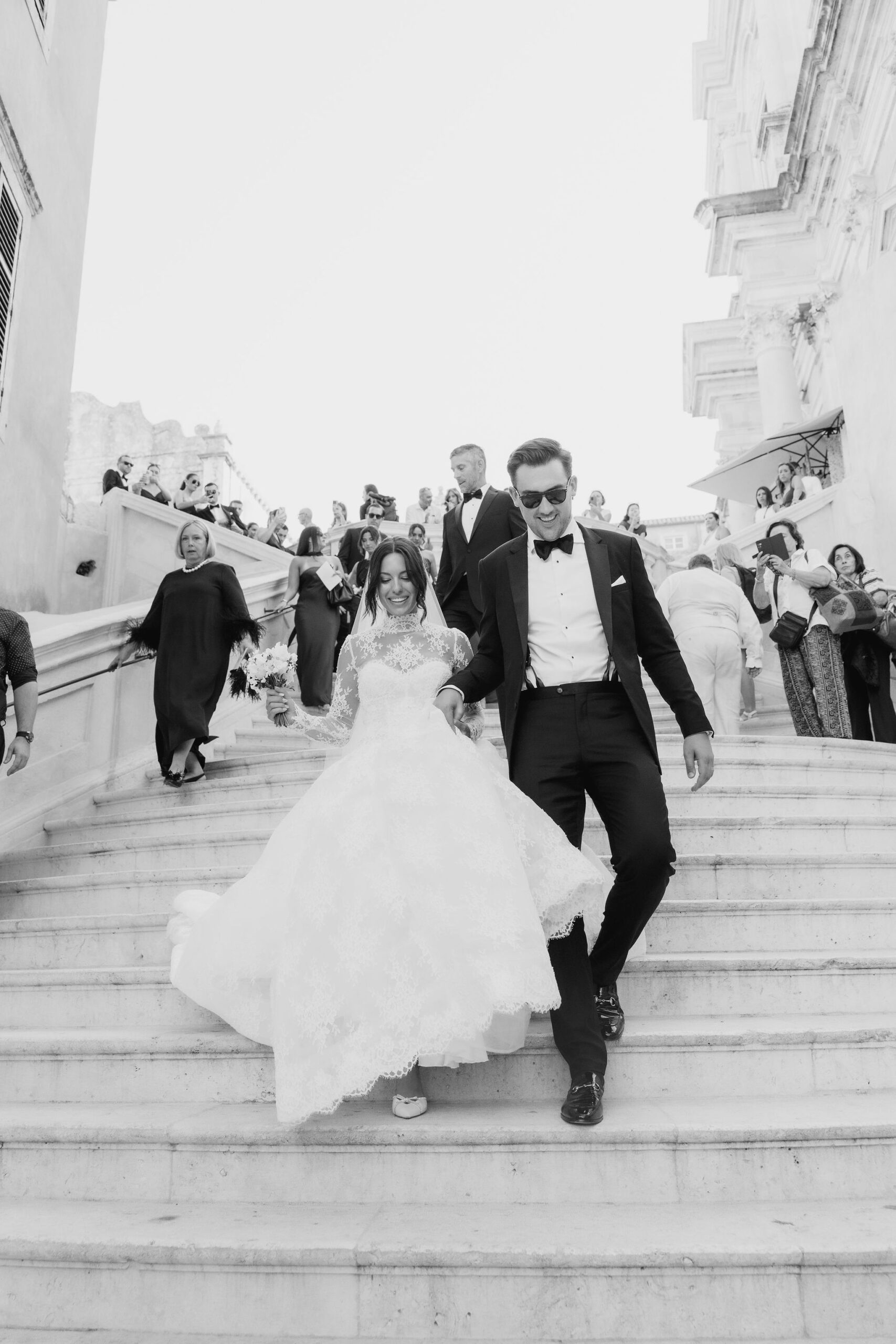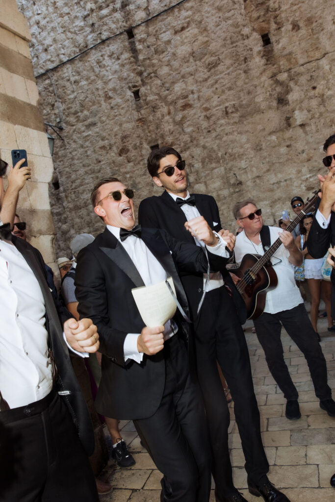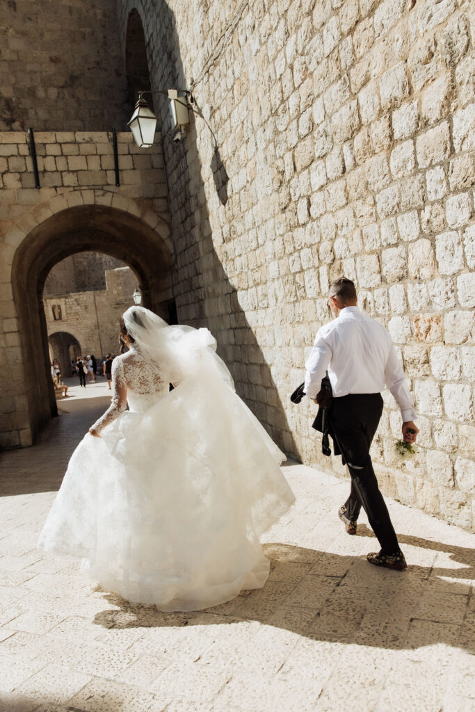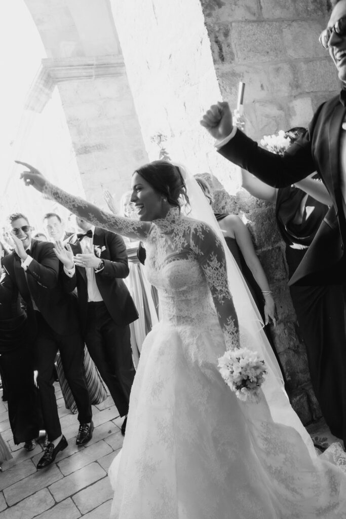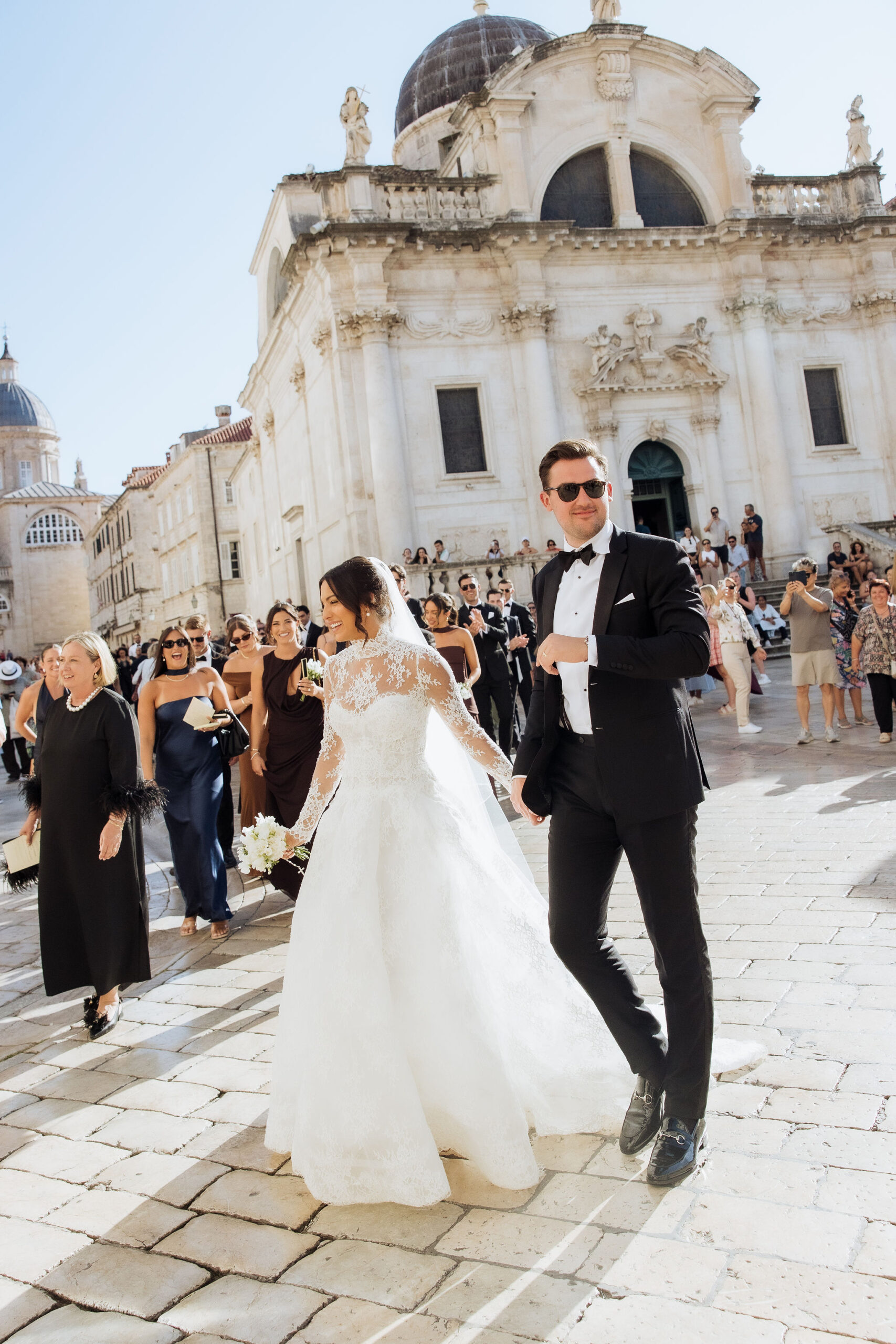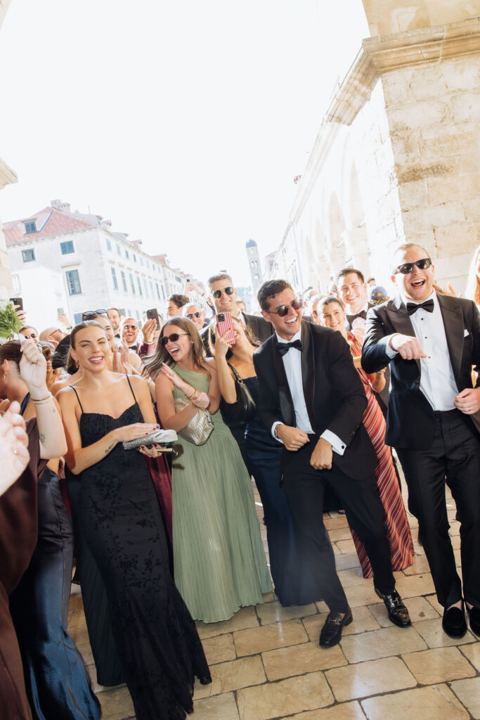 The wedding day arrived. St Ignatius Church set the frame. High Baroque interiors, layered frescoes, sculpted columns. A space built for ceremony and tradition. As Julia entered, the focus narrowed. A long-sleeve lace gown, clean and structured, moving with precision through the space. The look felt modern against the richness of the setting. Inside, everything remained still. Vows were exchanged without distraction. Measured. Intentional. Then the doors opened. Calm gave way to sound. Outside, the city took over. Cheers, movement, music, and light filled the steps as the celebration spilled into the streets. The couple moved through Dubrovnik’s historic streets, carried forward by energy and anticipation toward what came next.