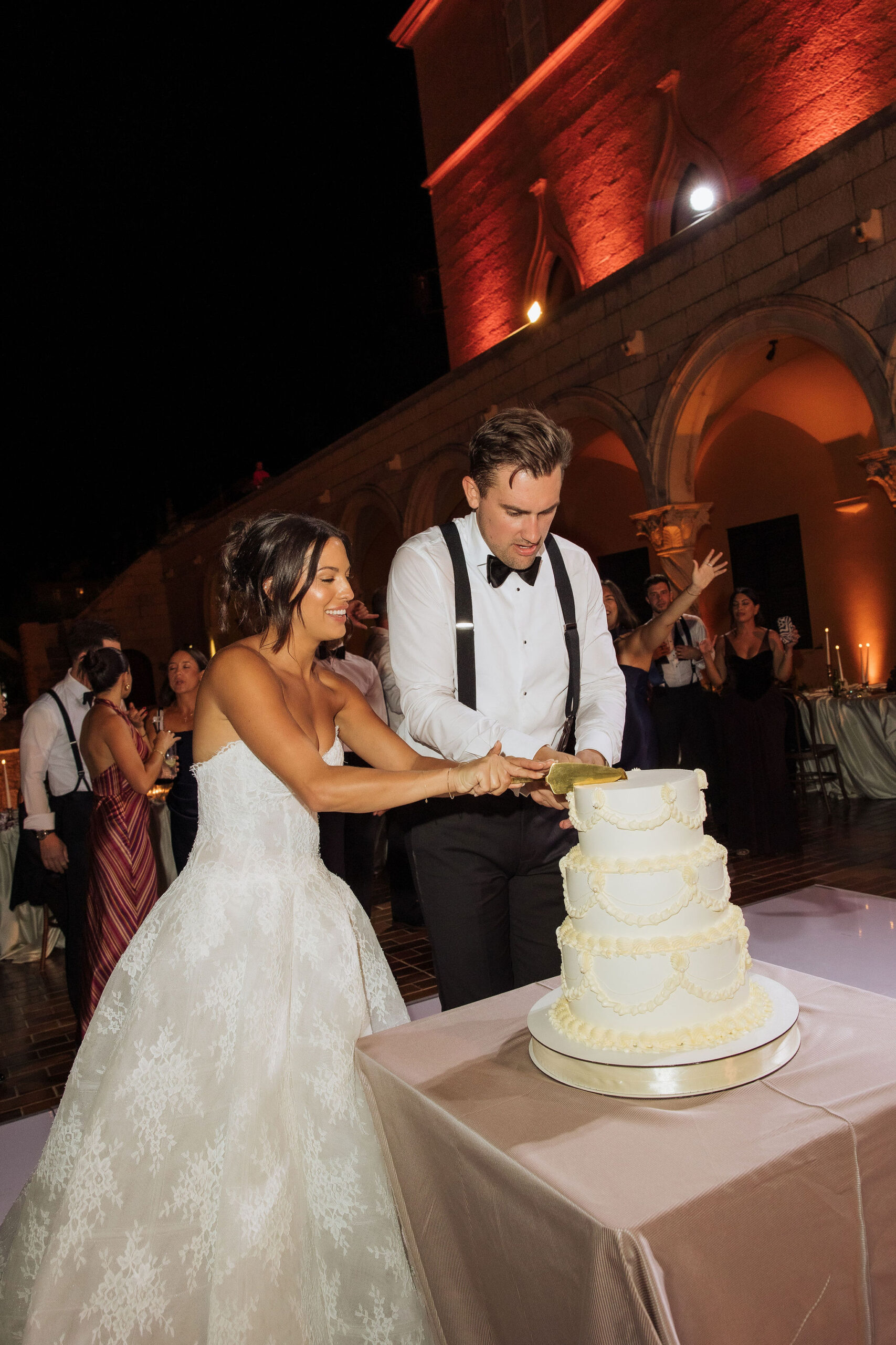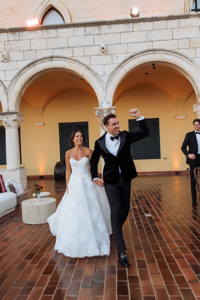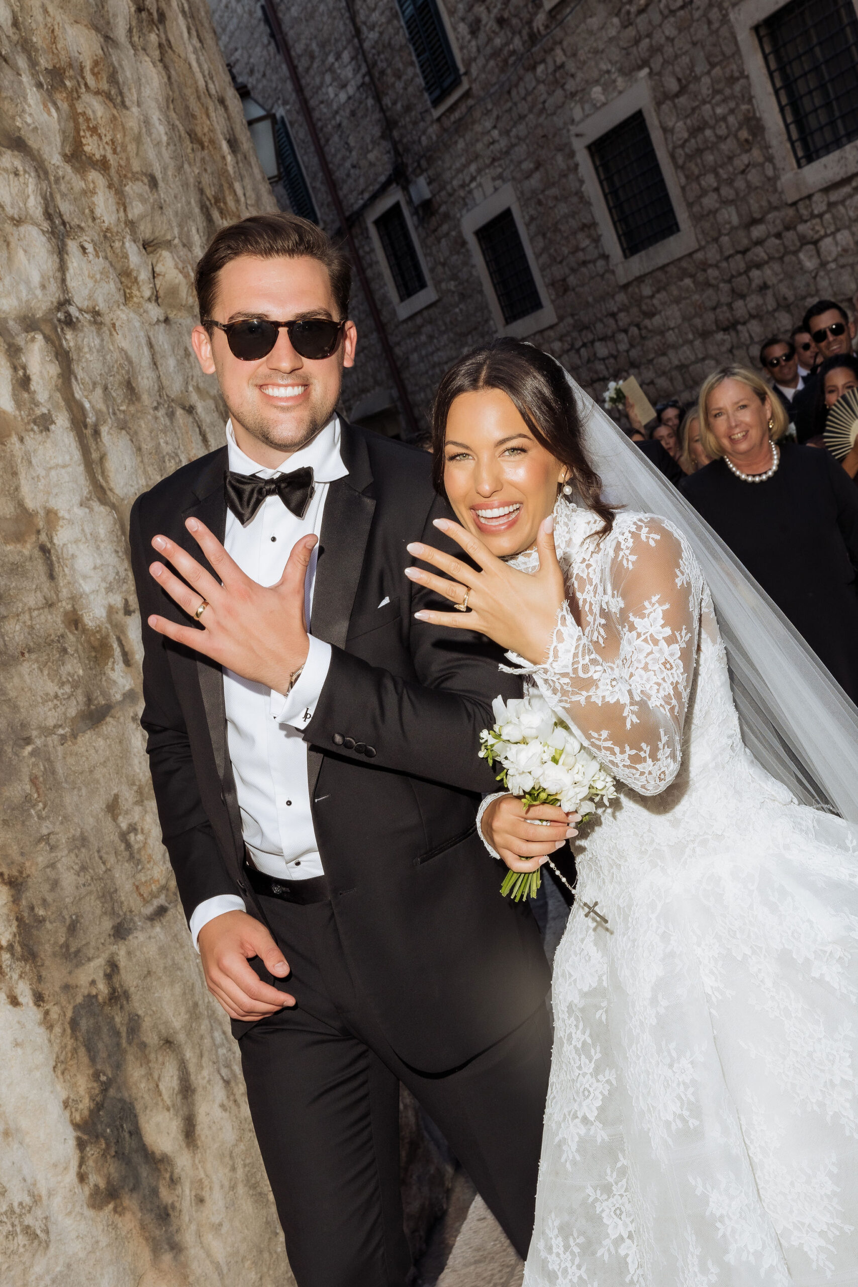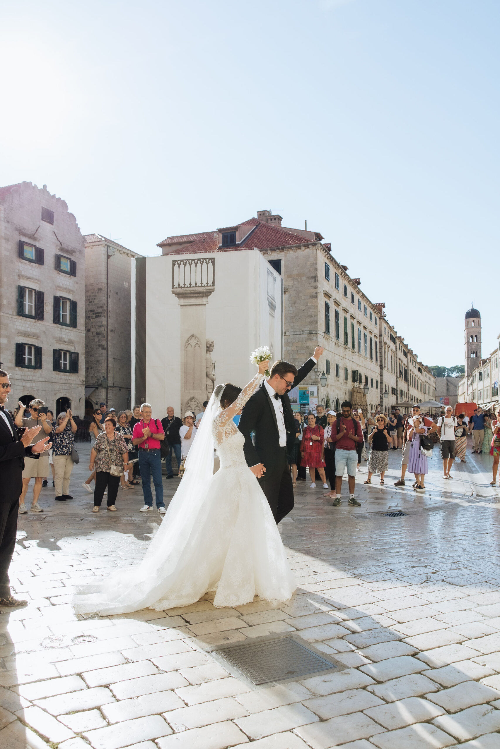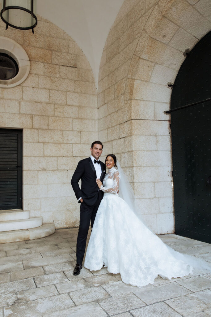 The wedding day arrived. St Ignatius Church set the frame. High Baroque interiors, layered frescoes, sculpted columns. A space built for ceremony and tradition. As Julia entered, the focus narrowed. A long-sleeve lace gown, clean and structured, moving with precision through the space. The look felt modern against the richness of the setting. Inside, everything remained still. Vows were exchanged without distraction. Measured. Intentional. Then the doors opened. Calm gave way to sound. Outside, the city took over. Cheers, movement, music, and light filled the steps as the celebration spilled into the streets. The couple moved through Dubrovnik’s historic streets, carried forward by energy and anticipation toward what came next.