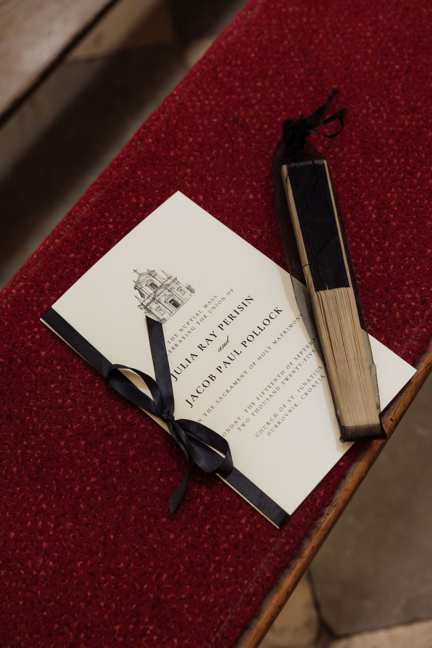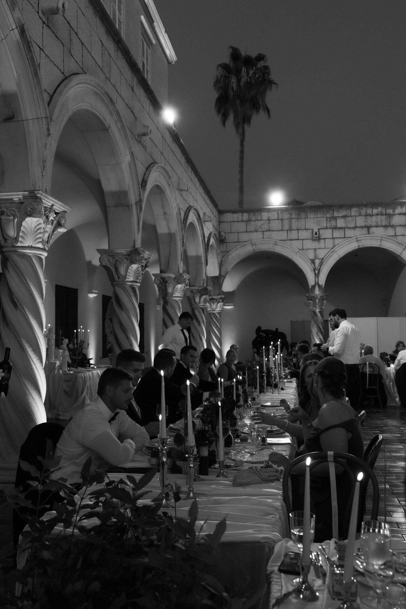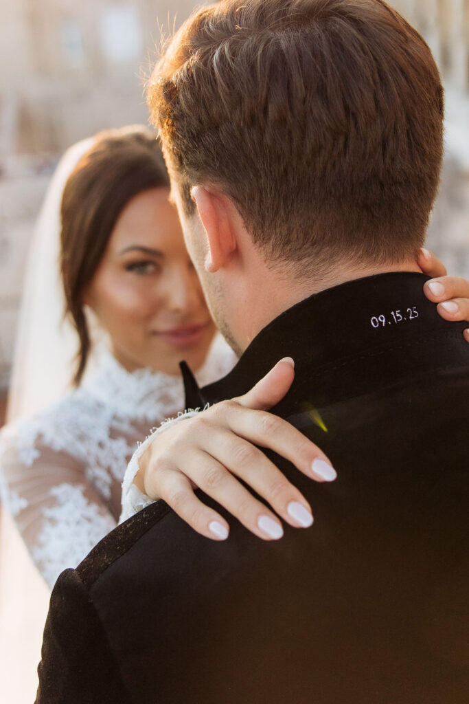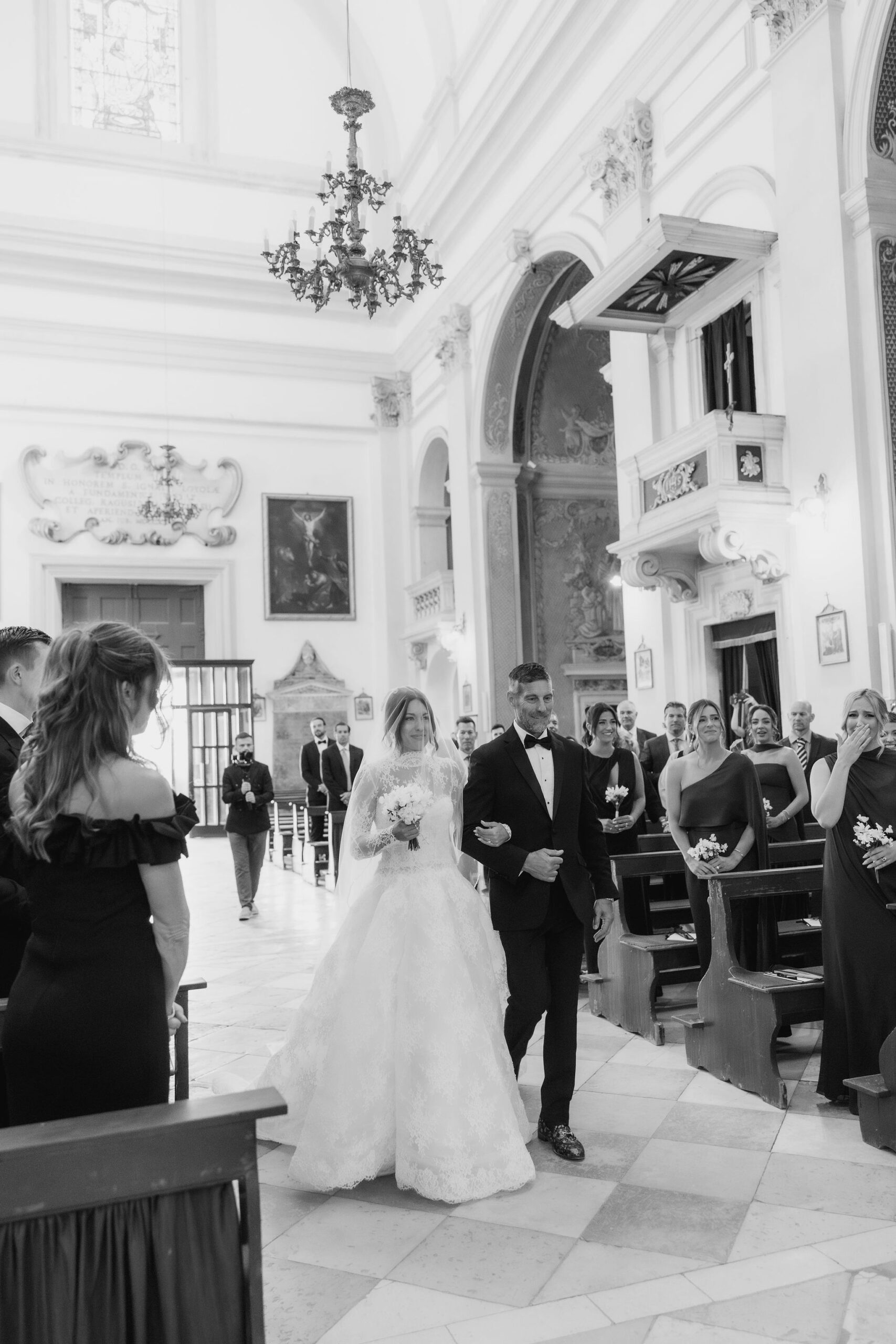 The wedding day arrived. St Ignatius Church set the frame. High Baroque interiors, layered frescoes, sculpted columns. A space built for ceremony and tradition. As Julia entered, the focus narrowed. A long-sleeve lace gown, clean and structured, moving with precision through the space. The look felt modern against the richness of the setting. Inside, everything remained still. Vows were exchanged without distraction. Measured. Intentional. Then the doors opened. Calm gave way to sound. Outside, the city took over. Cheers, movement, music, and light filled the steps as the celebration spilled into the streets. The couple moved through Dubrovnik’s historic streets, carried forward by energy and anticipation toward what came next.