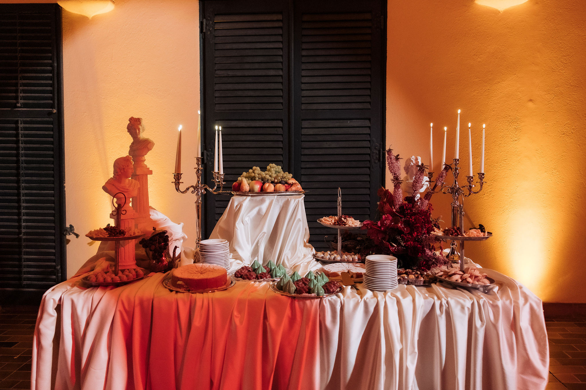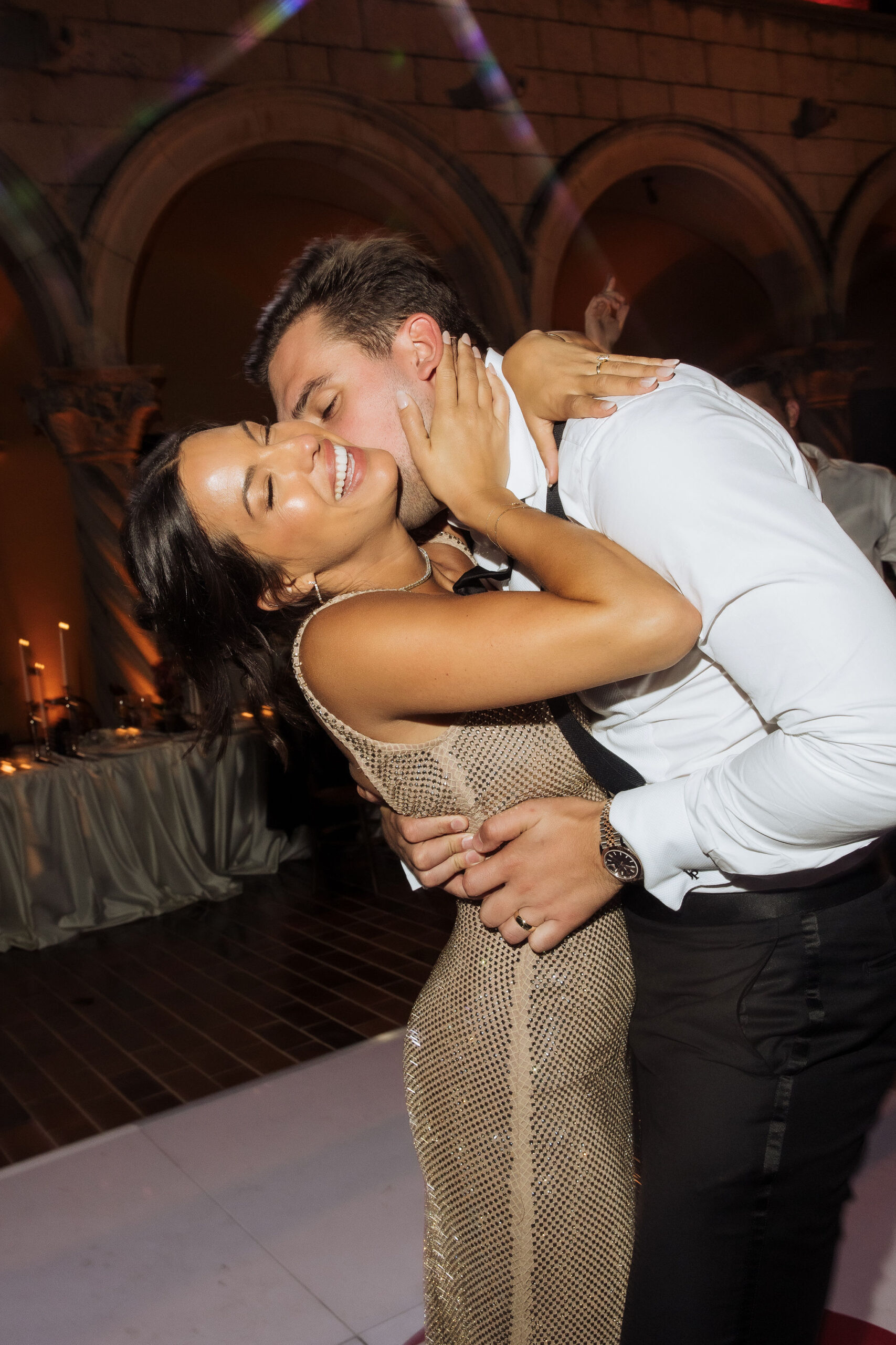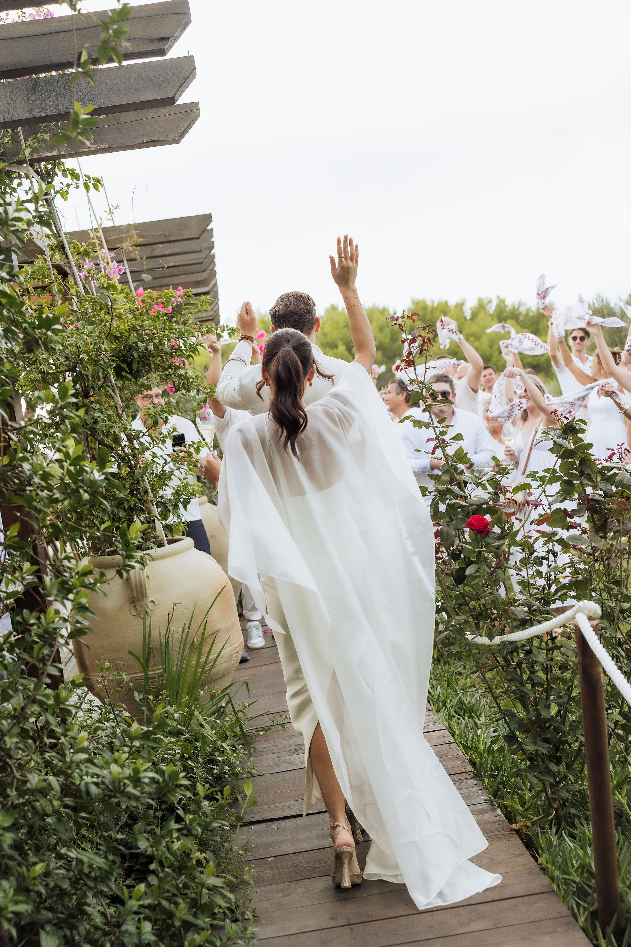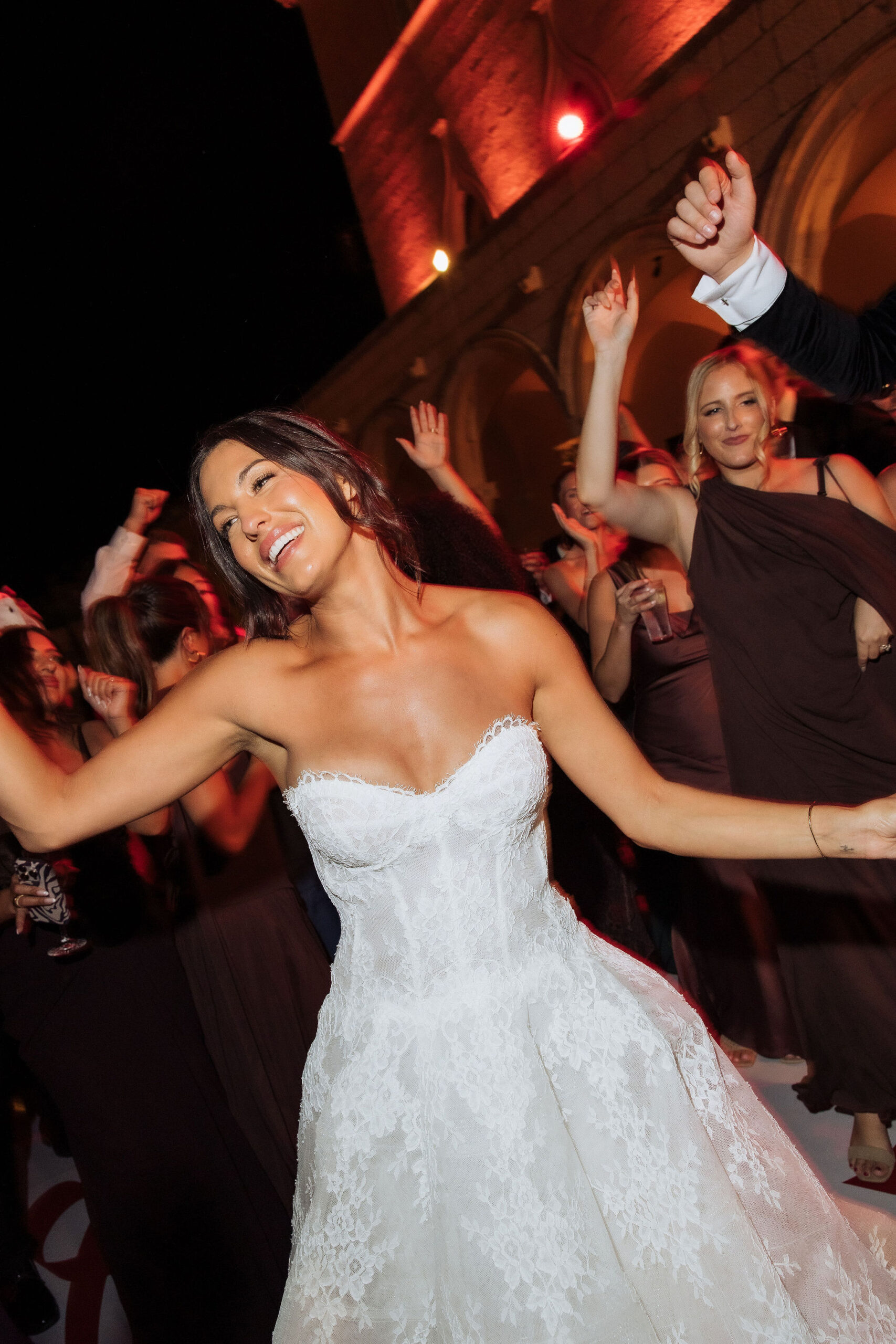 The wedding day arrived. St Ignatius Church set the frame. High Baroque interiors, layered frescoes, sculpted columns. A space built for ceremony and tradition. As Julia entered, the focus narrowed. A long-sleeve lace gown, clean and structured, moving with precision through the space. The look felt modern against the richness of the setting. Inside, everything remained still. Vows were exchanged without distraction. Measured. Intentional. Then the doors opened. Calm gave way to sound. Outside, the city took over. Cheers, movement, music, and light filled the steps as the celebration spilled into the streets. The couple moved through Dubrovnik’s historic streets, carried forward by energy and anticipation toward what came next.