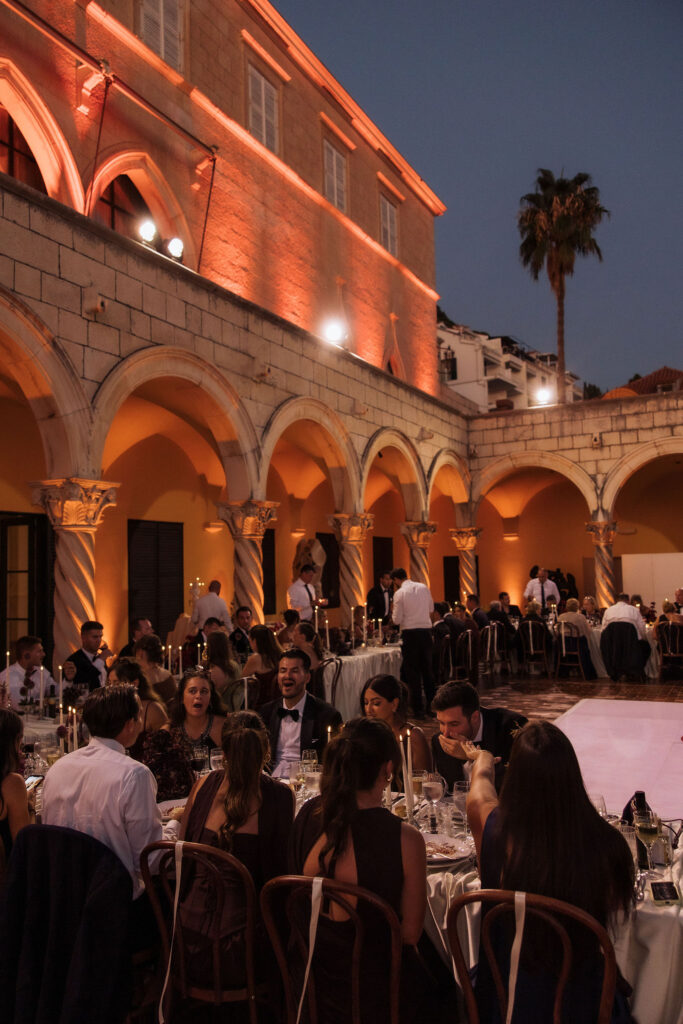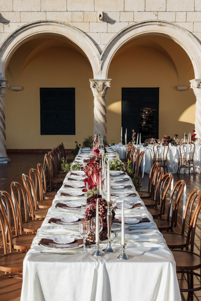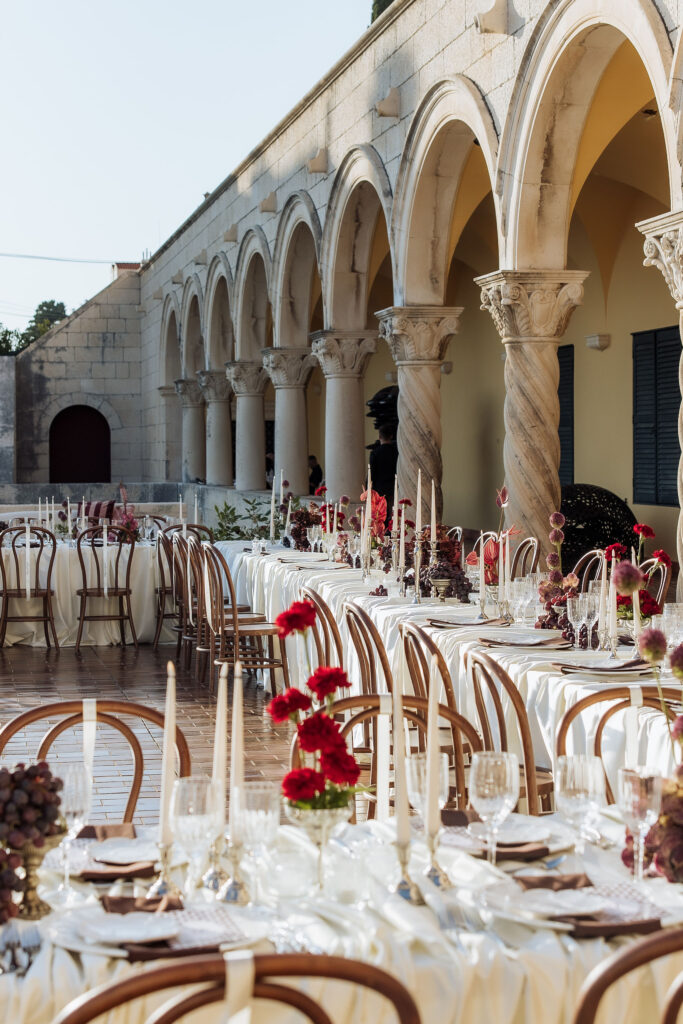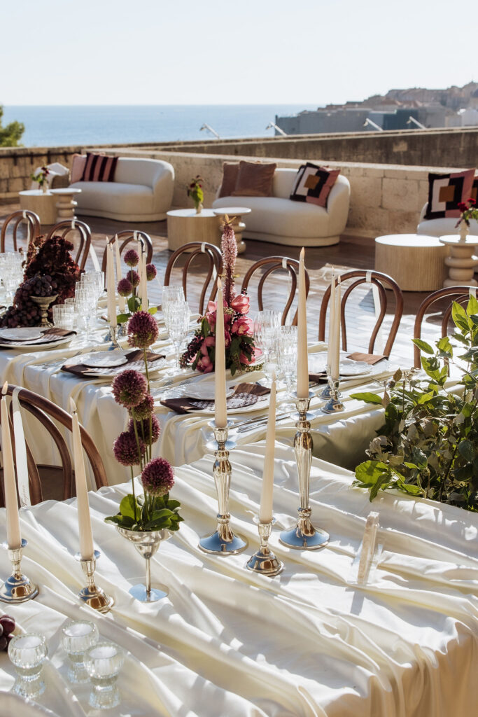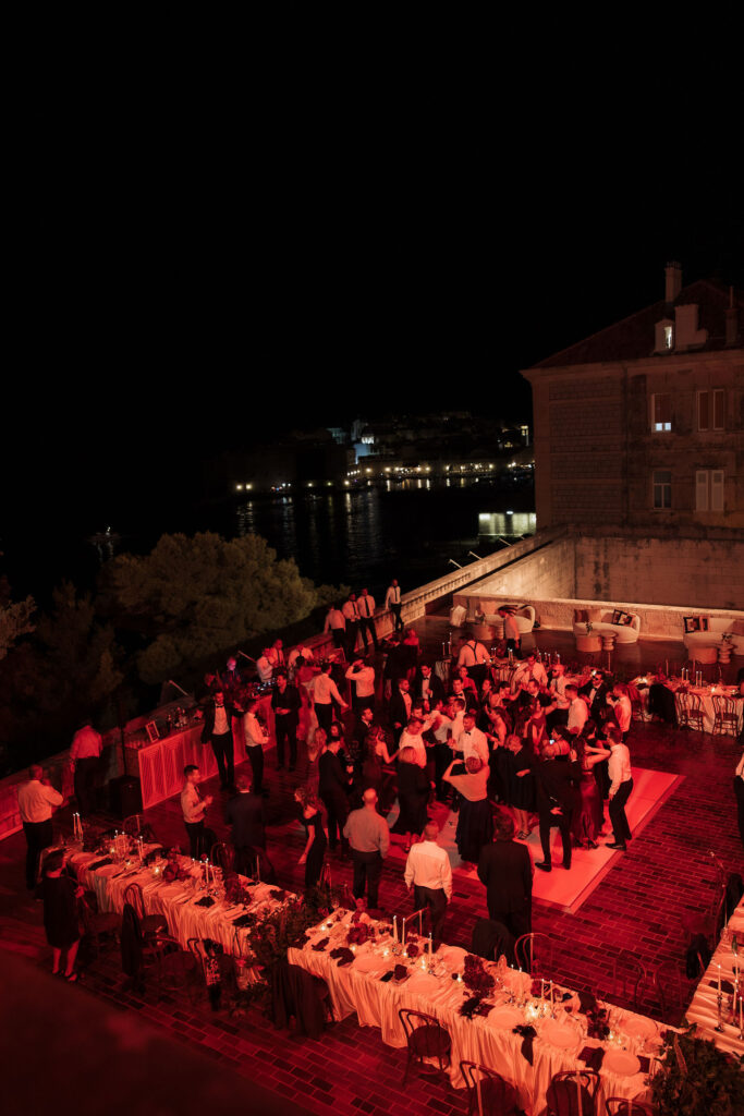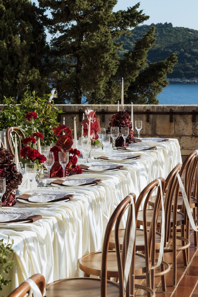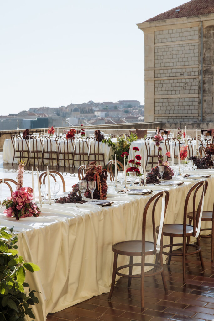 After the ceremony, the celebration moved to MOMA Dubrovnik. Set above the sea, the venue felt open and serene, with modern lines and expansive views stretching out toward the Adriatic. The contrast with the historic church was subtle yet striking. Long tables were arranged across the terrace, inviting everyone to gather together. Soft ivory linens fell naturally over the edges, paired with classic bentwood chairs that added warmth and ease. The tables were styled with restraint. Deep burgundy florals sat low and sculptural, mixed with clusters of dark grapes and clear glassware that reflected the light. Every element had space to breathe. As the day turned into evening, the atmosphere shifted. Music grew louder, lights warmed the stone walls, and the celebration came alive. Julia and Jacob danced freely, surrounded by friends, laughter, and movement. Hands were raised, voices joined in, and the energy felt effortless. The night unfolded with joy and spontaneity. Warm, intimate, and full of life, the atmosphere carried the celebration long after the sun disappeared.