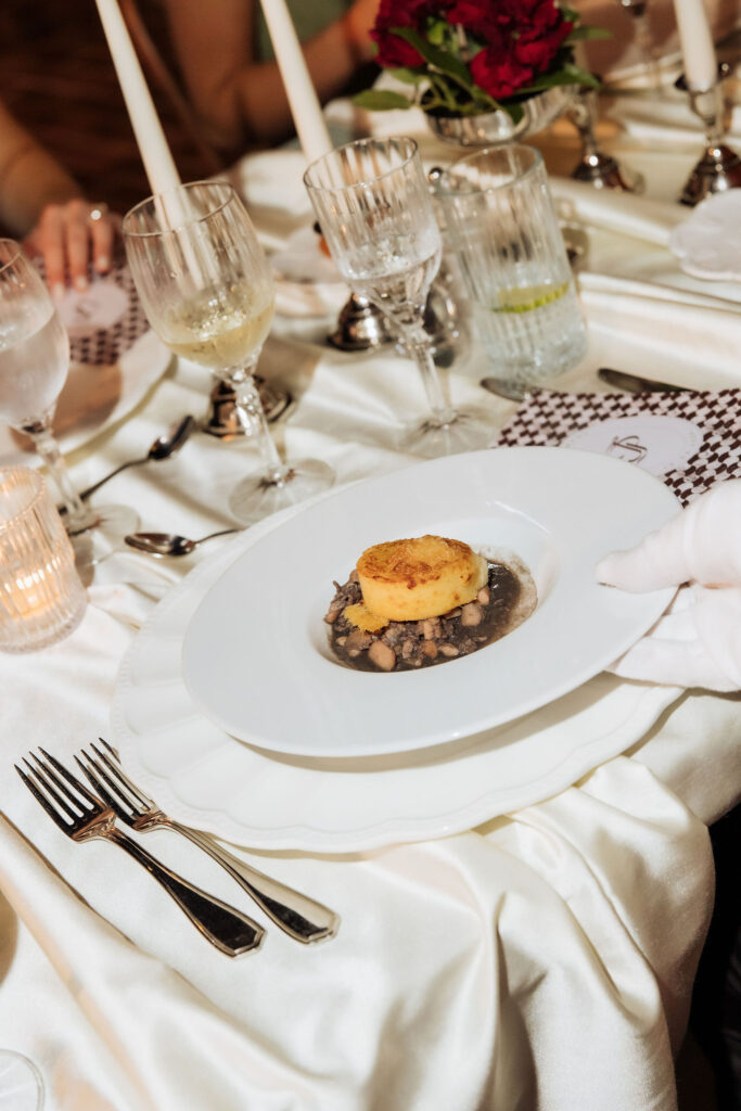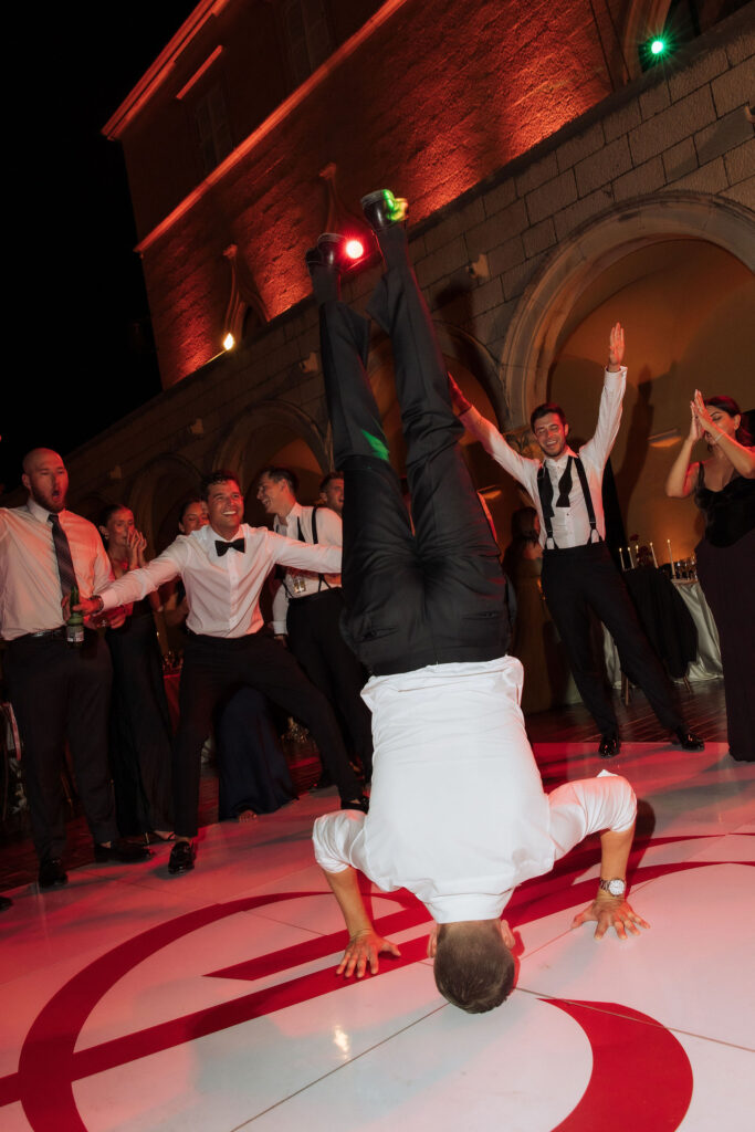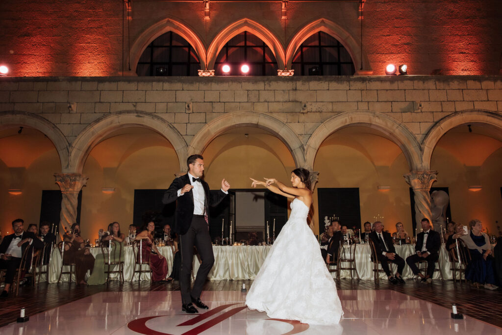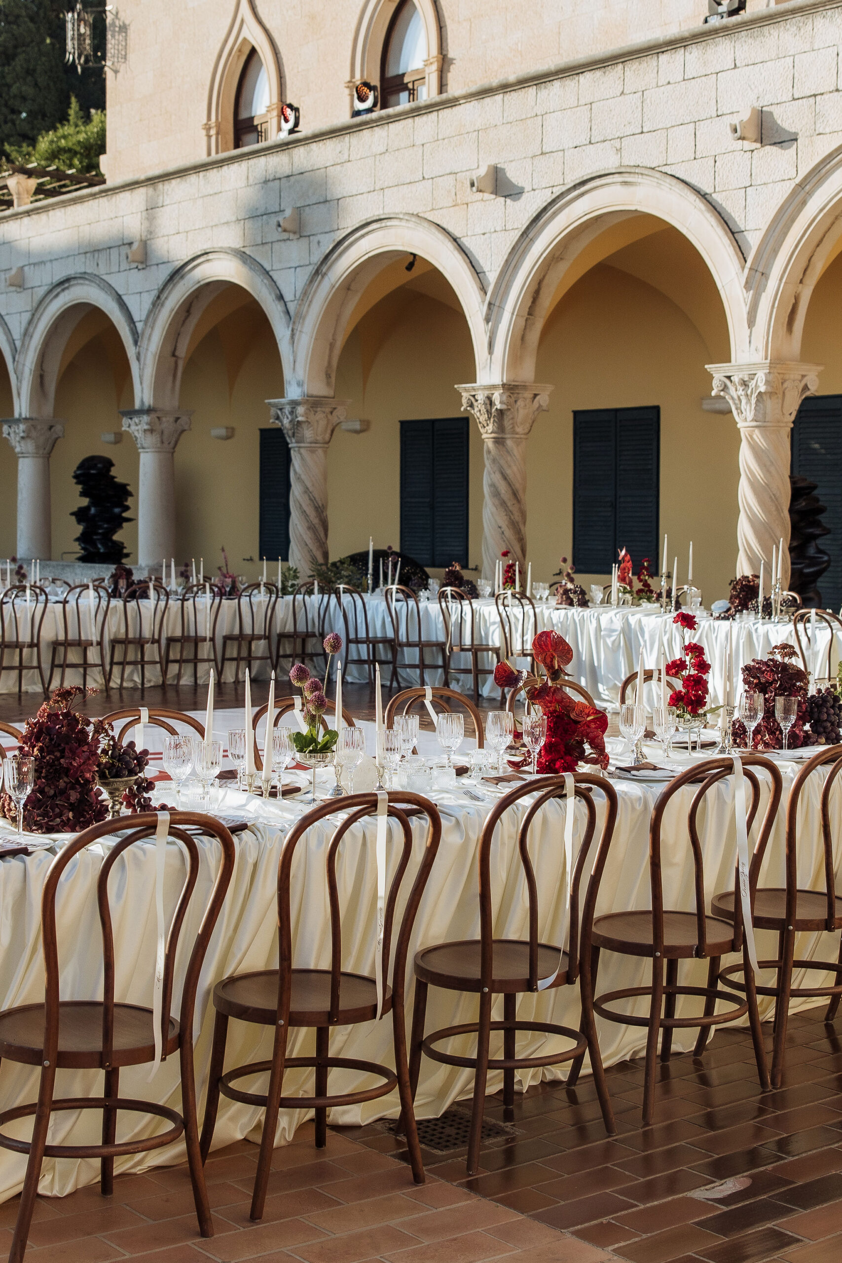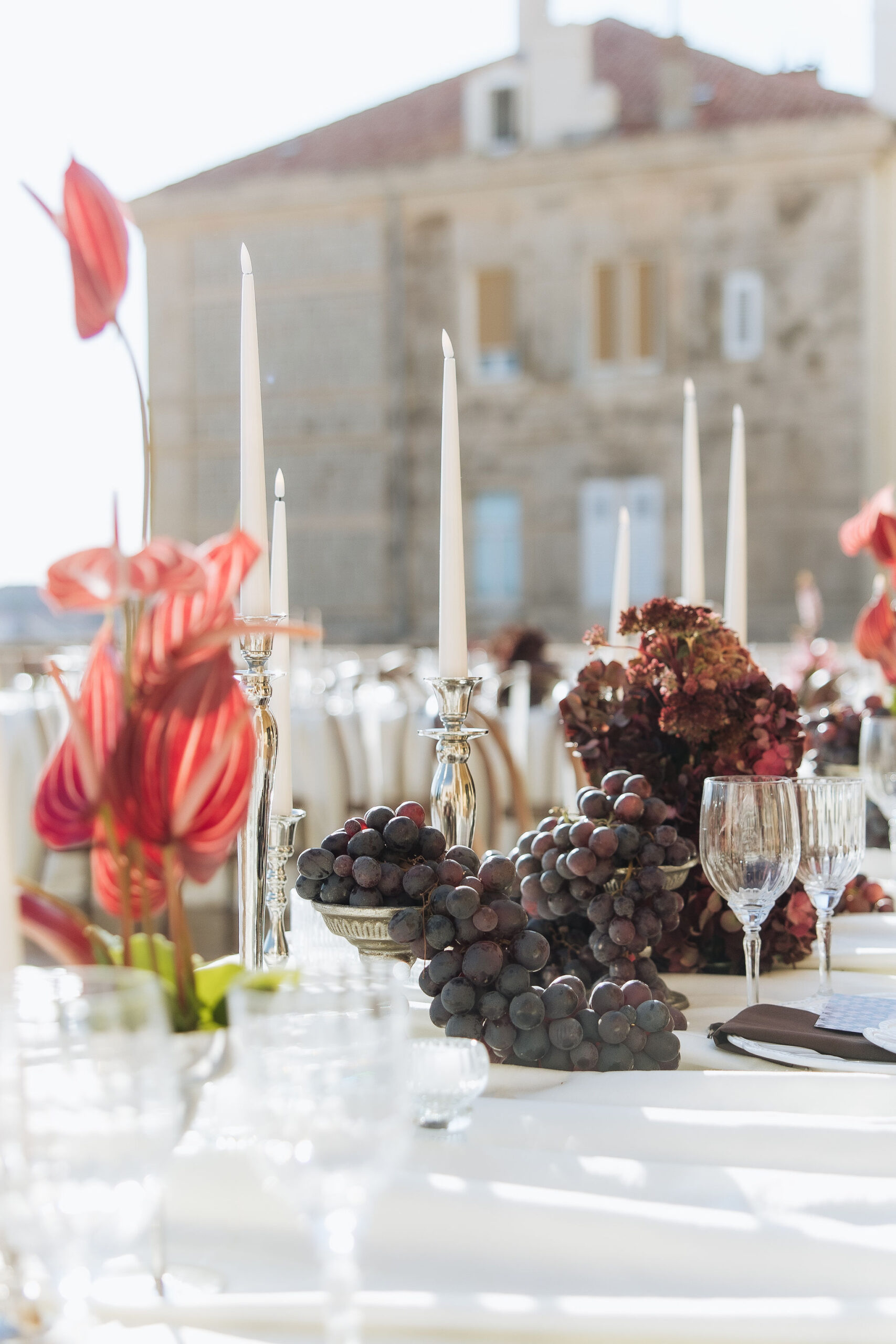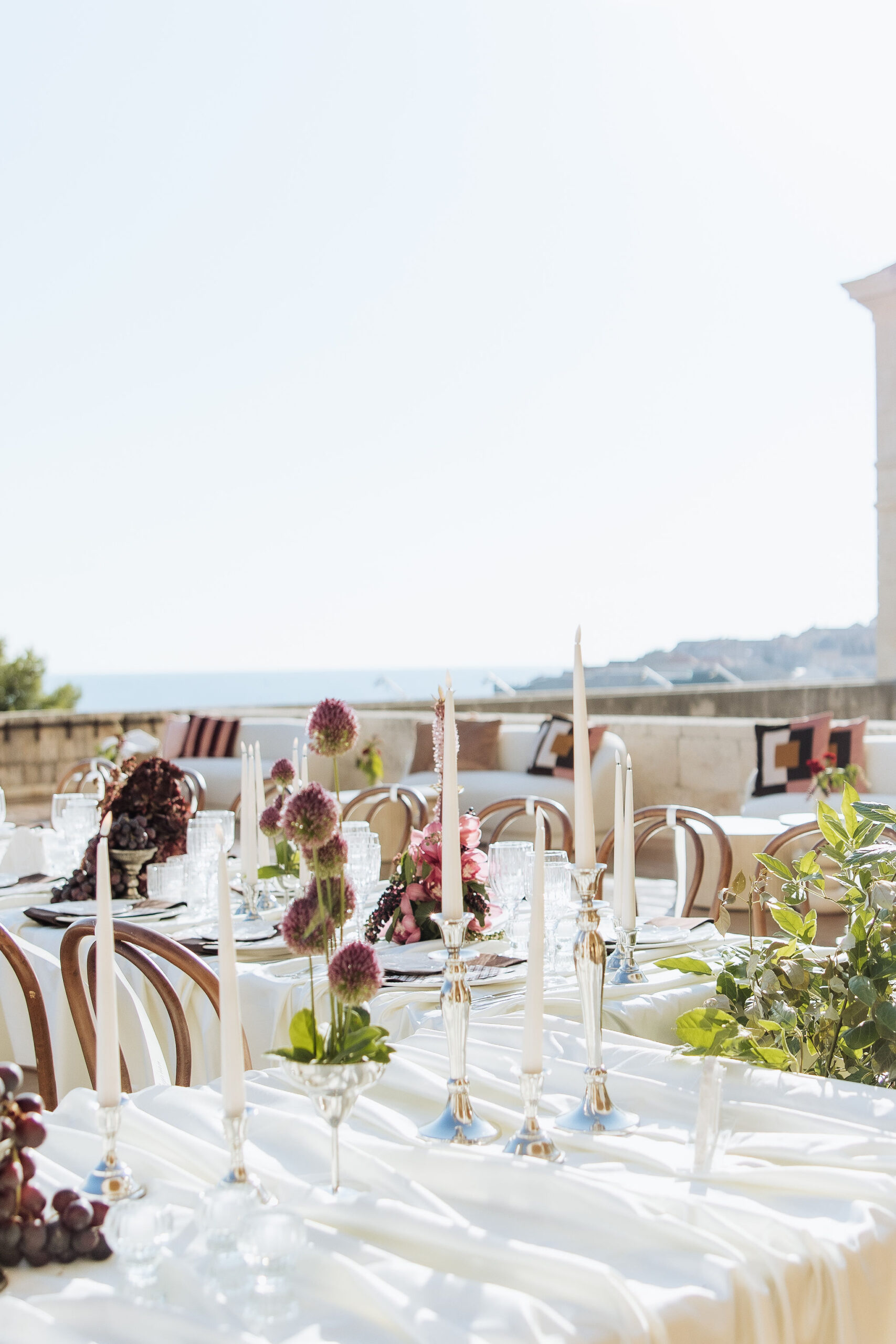 After the ceremony, the celebration moved to MOMA Dubrovnik. Set above the sea, the venue felt open and serene, with modern lines and expansive views stretching out toward the Adriatic. The contrast with the historic church was subtle yet striking. Long tables were arranged across the terrace, inviting everyone to gather together. Soft ivory linens fell naturally over the edges, paired with classic bentwood chairs that added warmth and ease. The tables were styled with restraint. Deep burgundy florals sat low and sculptural, mixed with clusters of dark grapes and clear glassware that reflected the light. Every element had space to breathe. As the day turned into evening, the atmosphere shifted. Music grew louder, lights warmed the stone walls, and the celebration came alive. Julia and Jacob danced freely, surrounded by friends, laughter, and movement. Hands were raised, voices joined in, and the energy felt effortless. The night unfolded with joy and spontaneity. Warm, intimate, and full of life, the atmosphere carried the celebration long after the sun disappeared.