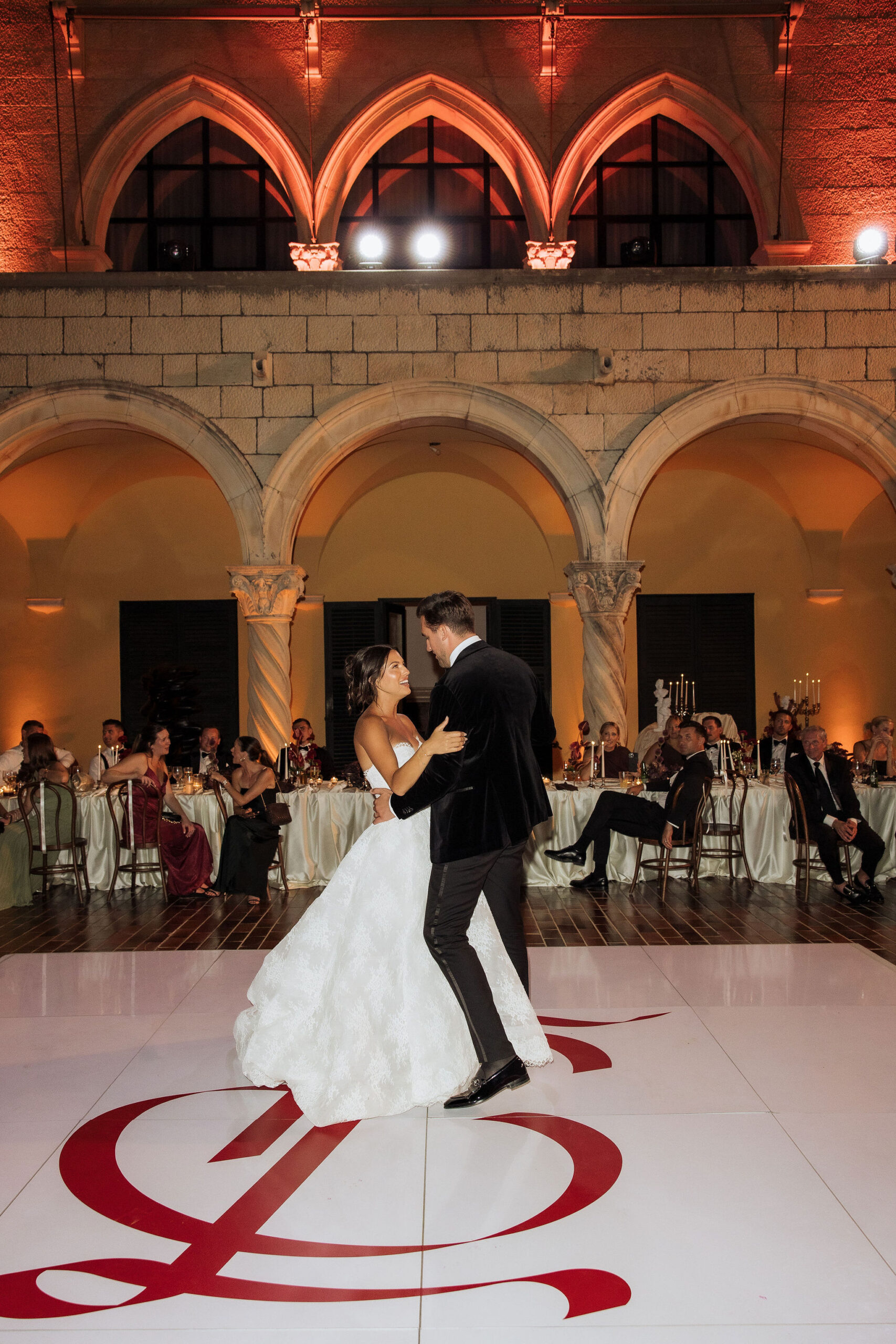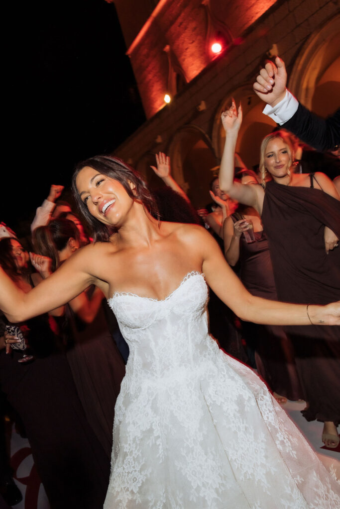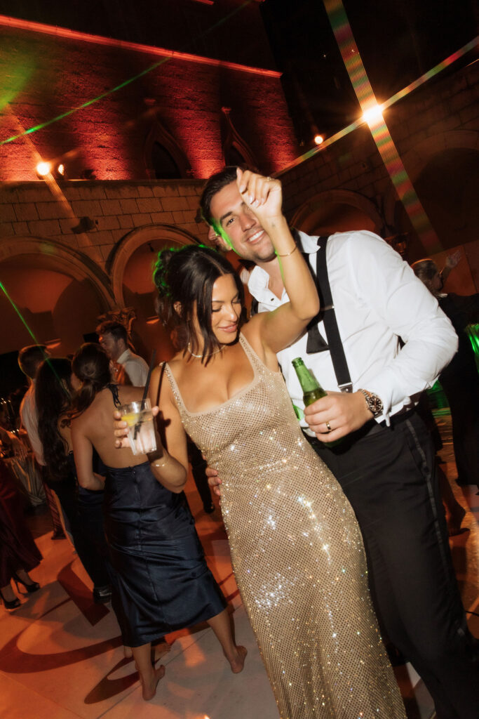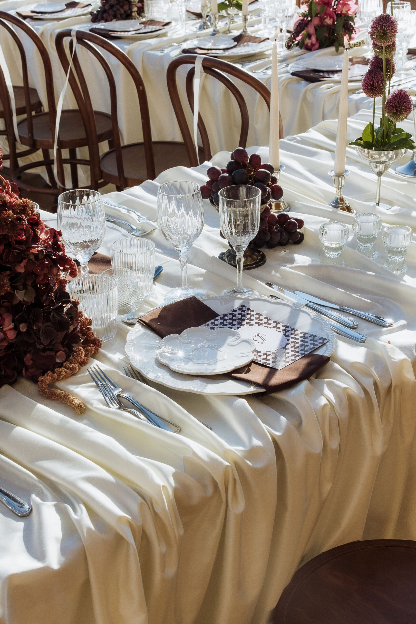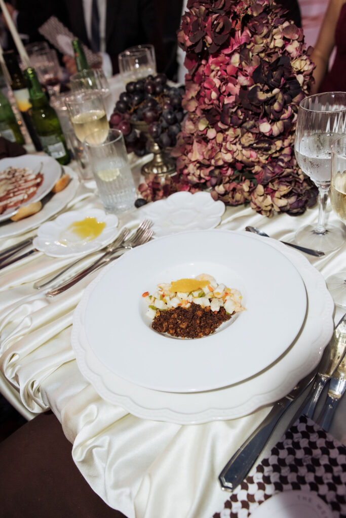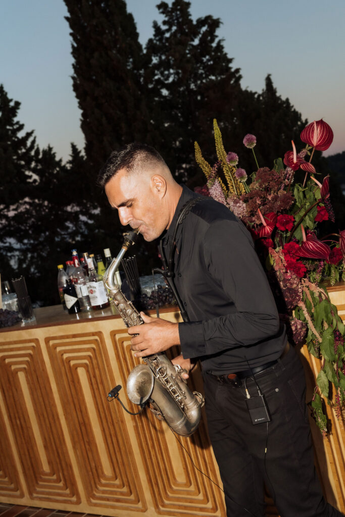 After the ceremony, the celebration moved to MOMA Dubrovnik. Set above the sea, the venue felt open and serene, with modern lines and expansive views stretching out toward the Adriatic. The contrast with the historic church was subtle yet striking. Long tables were arranged across the terrace, inviting everyone to gather together. Soft ivory linens fell naturally over the edges, paired with classic bentwood chairs that added warmth and ease. The tables were styled with restraint. Deep burgundy florals sat low and sculptural, mixed with clusters of dark grapes and clear glassware that reflected the light. Every element had space to breathe. As the day turned into evening, the atmosphere shifted. Music grew louder, lights warmed the stone walls, and the celebration came alive. Julia and Jacob danced freely, surrounded by friends, laughter, and movement. Hands were raised, voices joined in, and the energy felt effortless. The night unfolded with joy and spontaneity. Warm, intimate, and full of life, the atmosphere carried the celebration long after the sun disappeared.