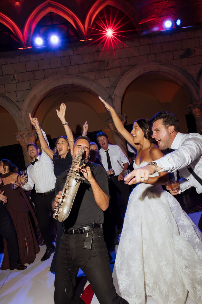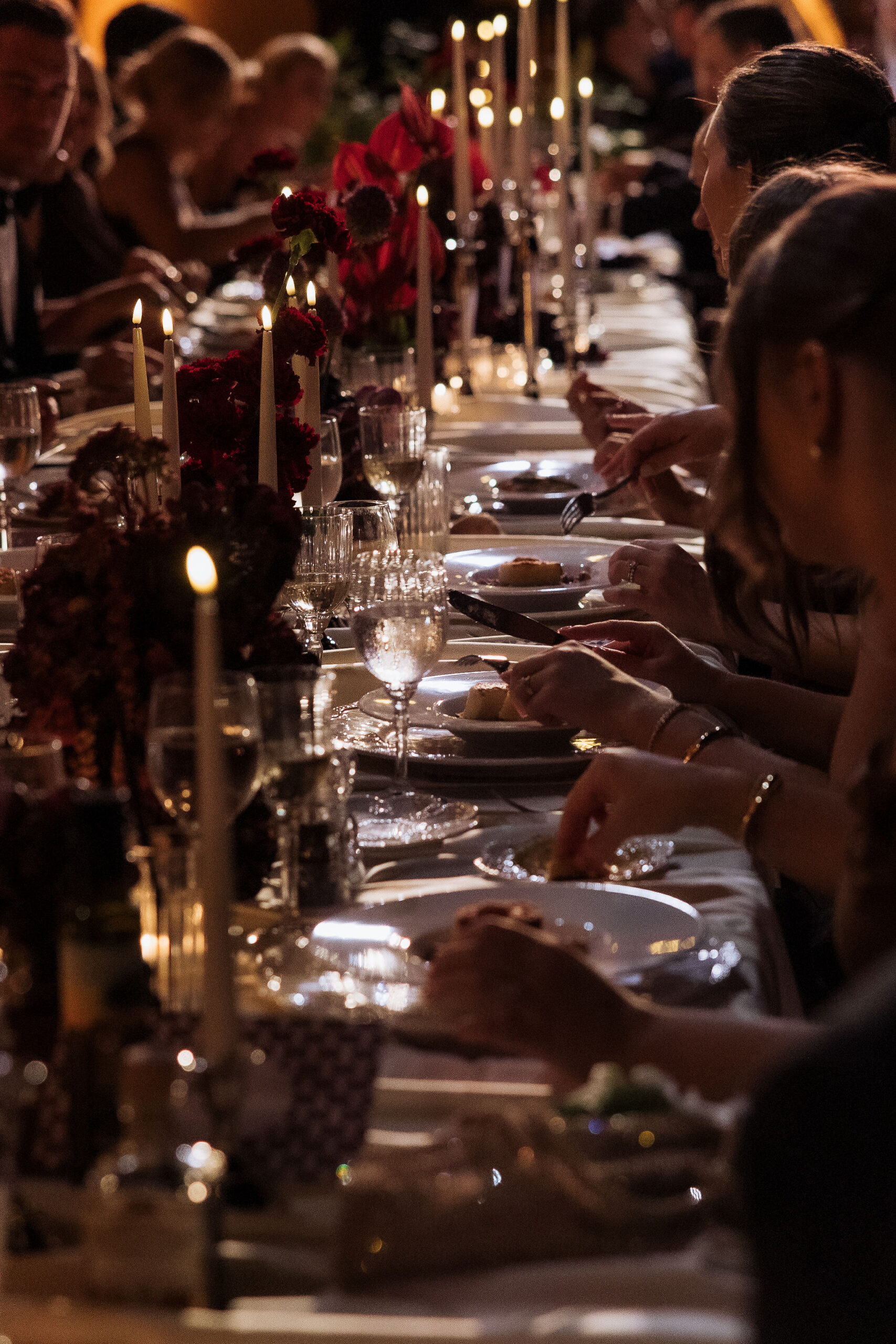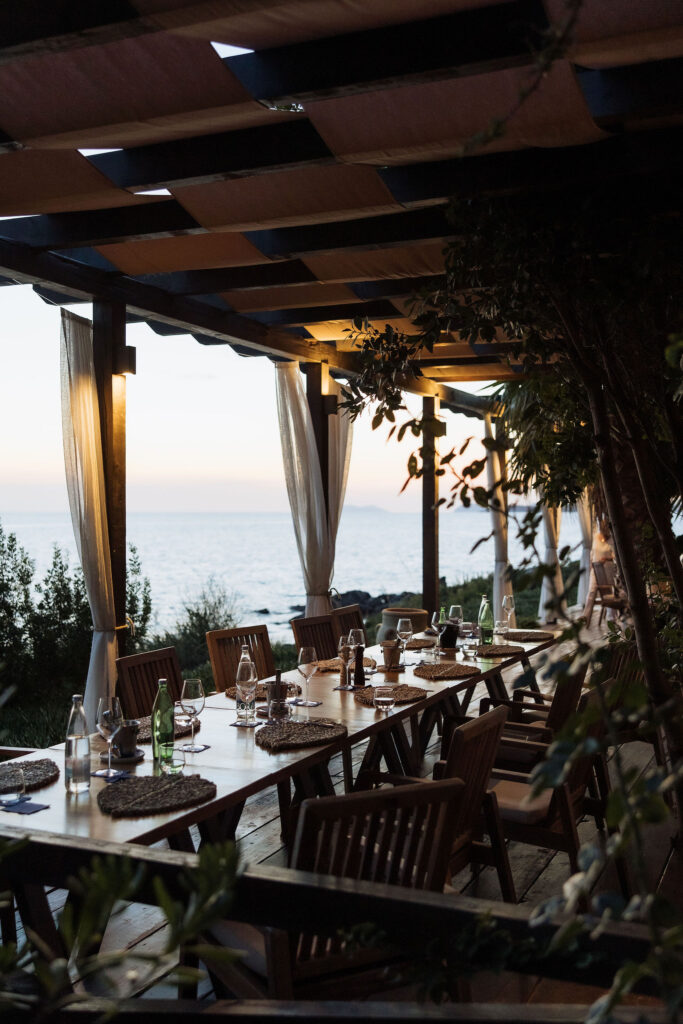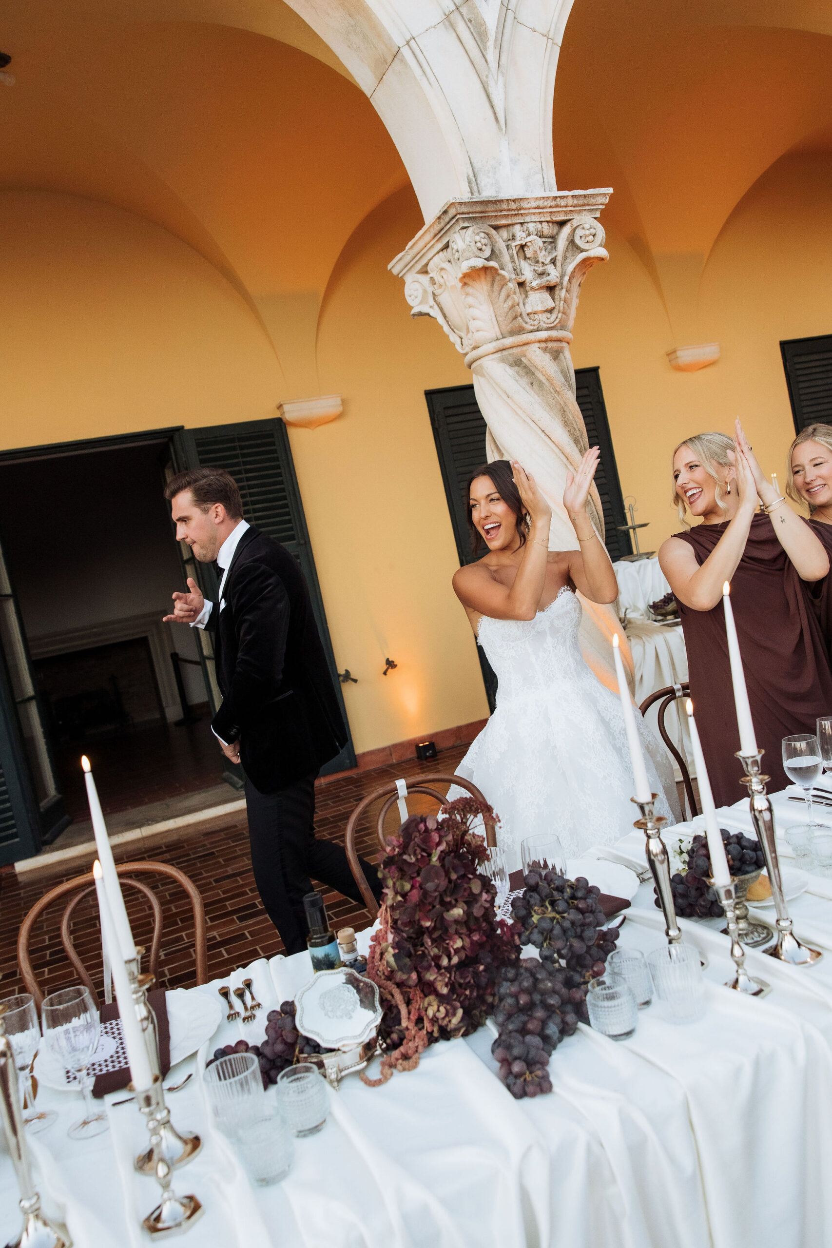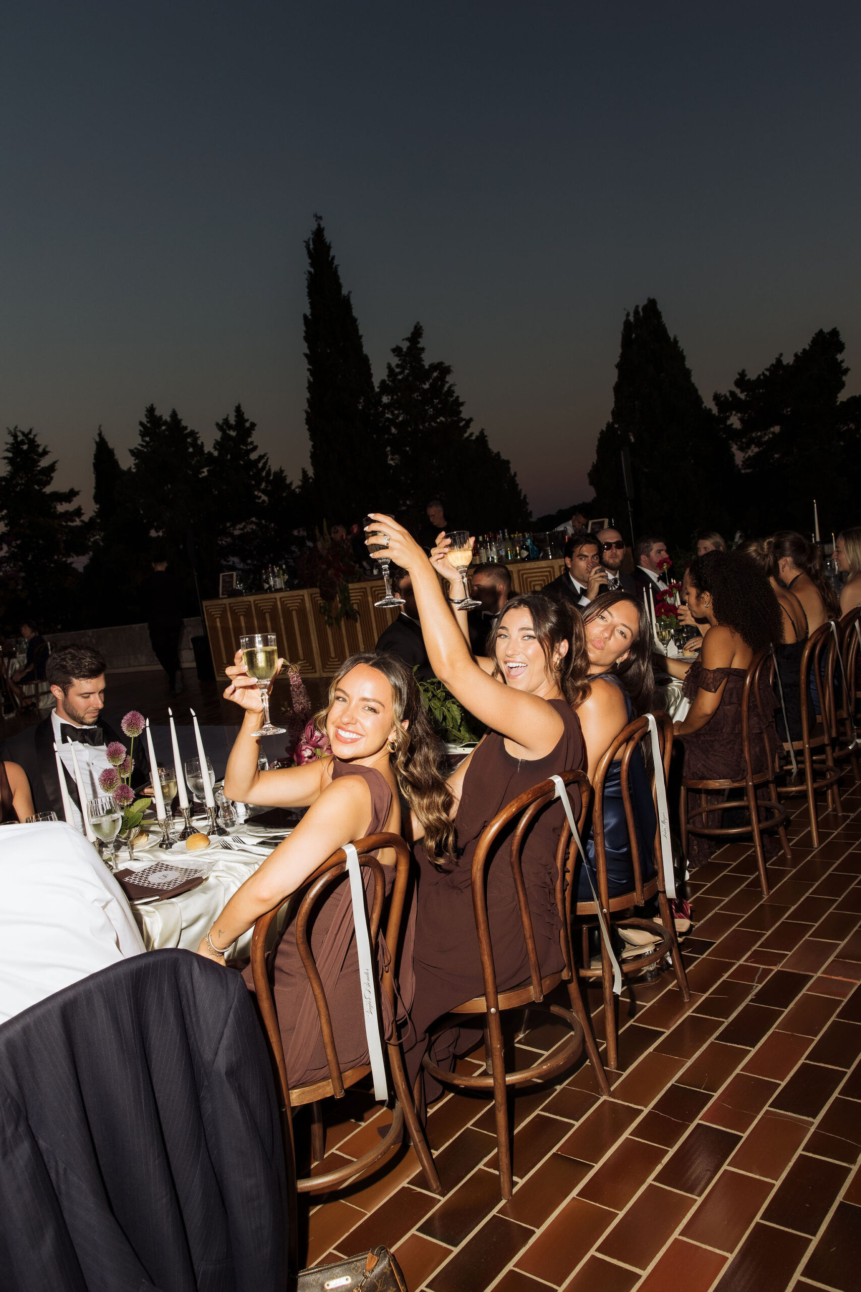 After the ceremony, the celebration moved to MOMA Dubrovnik. Set above the sea, the venue felt open and serene, with modern lines and expansive views stretching out toward the Adriatic. The contrast with the historic church was subtle yet striking. Long tables were arranged across the terrace, inviting everyone to gather together. Soft ivory linens fell naturally over the edges, paired with classic bentwood chairs that added warmth and ease. The tables were styled with restraint. Deep burgundy florals sat low and sculptural, mixed with clusters of dark grapes and clear glassware that reflected the light. Every element had space to breathe. As the day turned into evening, the atmosphere shifted. Music grew louder, lights warmed the stone walls, and the celebration came alive. Julia and Jacob danced freely, surrounded by friends, laughter, and movement. Hands were raised, voices joined in, and the energy felt effortless. The night unfolded with joy and spontaneity. Warm, intimate, and full of life, the atmosphere carried the celebration long after the sun disappeared.
