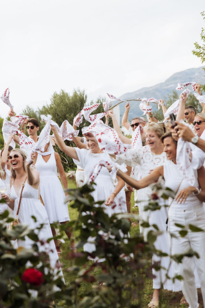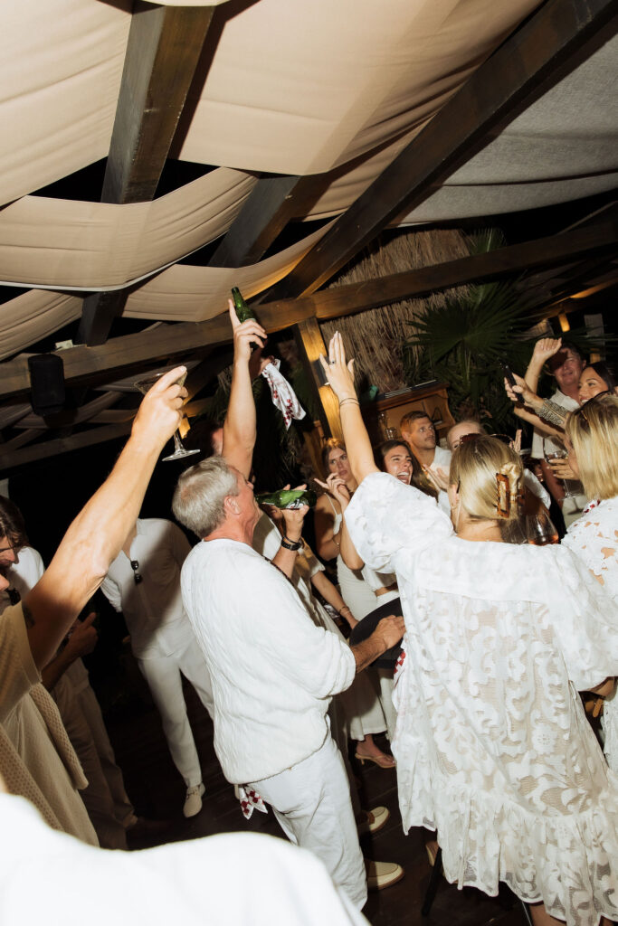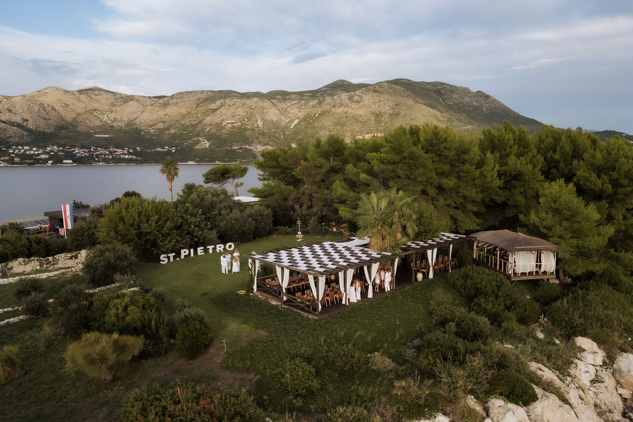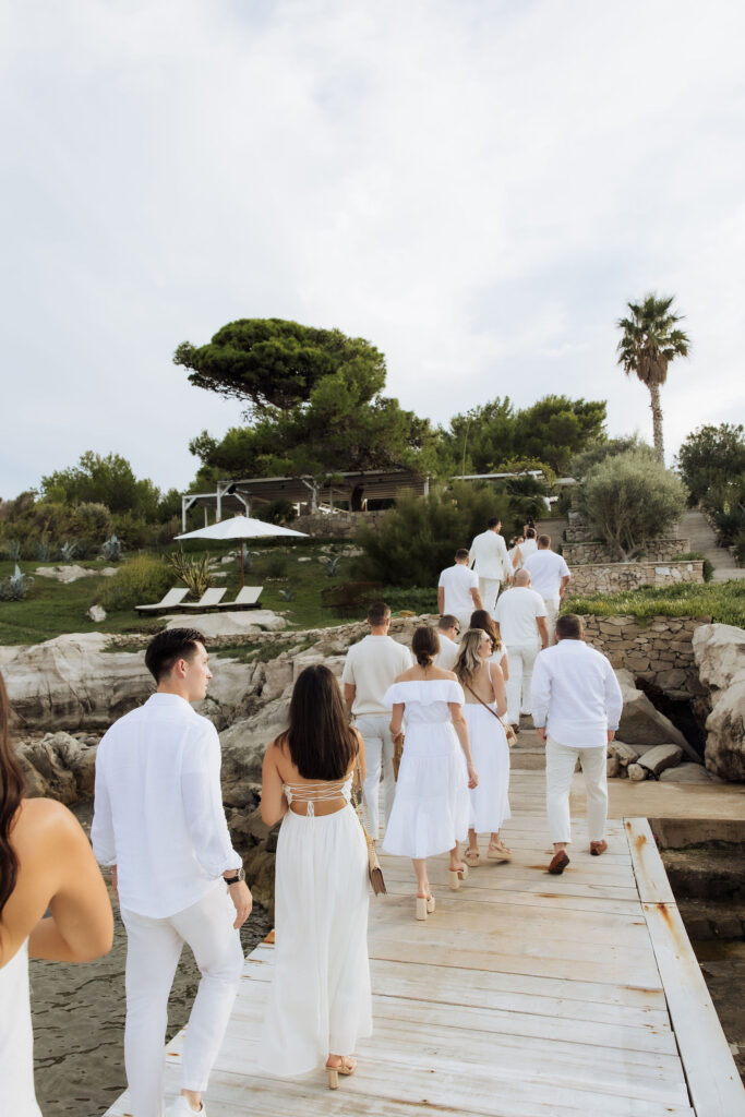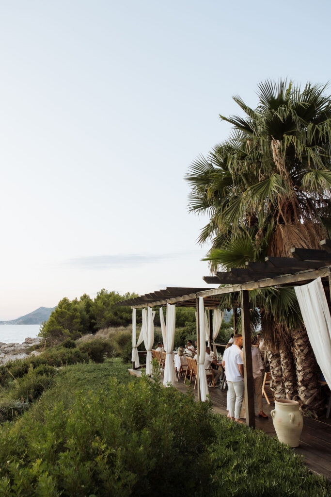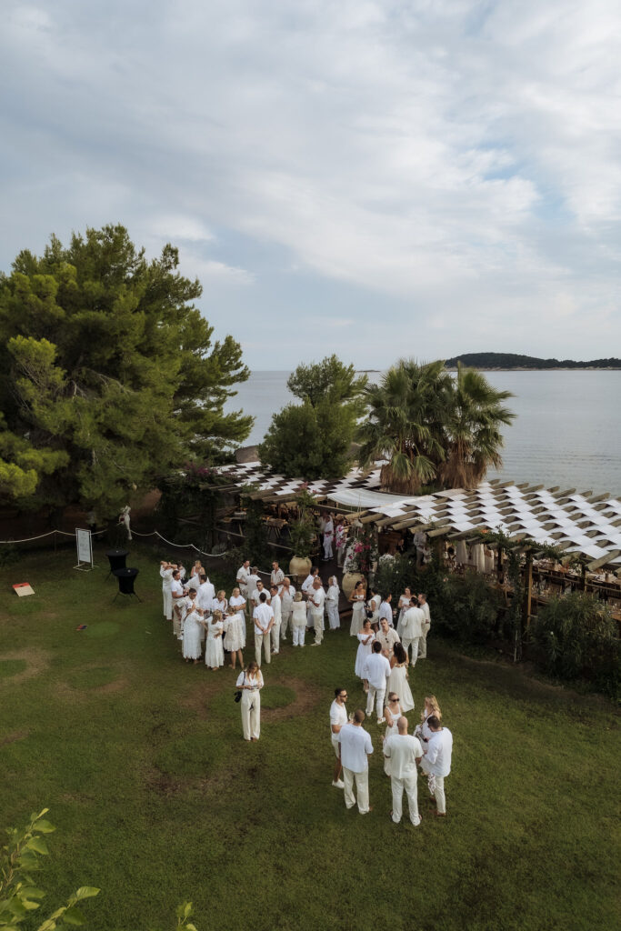 The celebrations began the day before the wedding with a welcome gathering on St Pietro Island. Guests arrived by boat. Sun, sea, and music already waiting. Dubrovnik disappeared behind them as the island took over. What started as a welcome turned into a party fast. Drinks in hand. Music up. Everyone is on their feet. No schedule, no pressure, just movement and energy under the open sky.