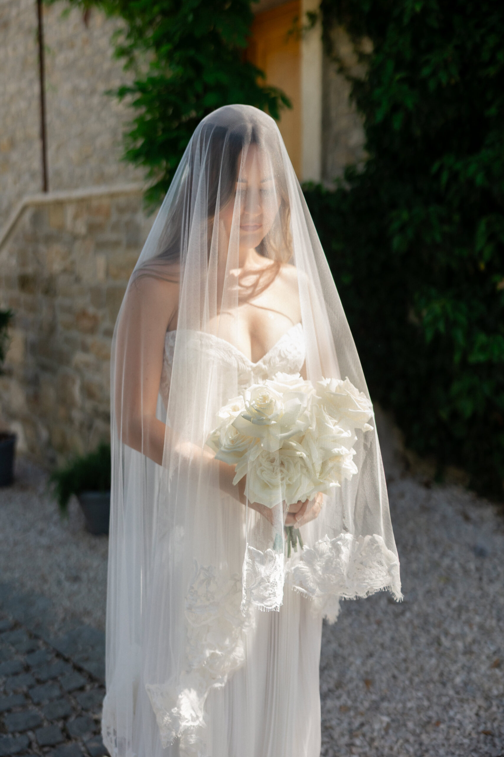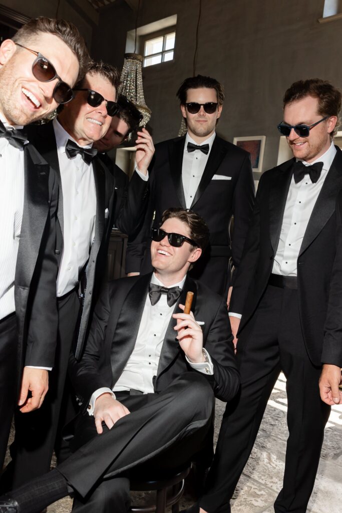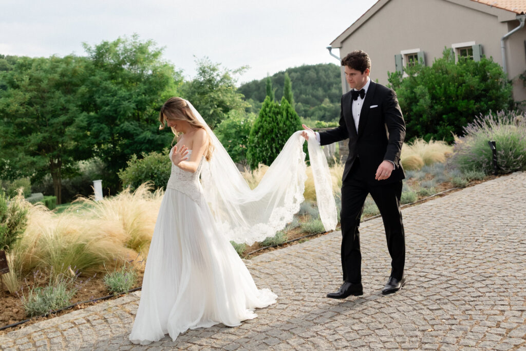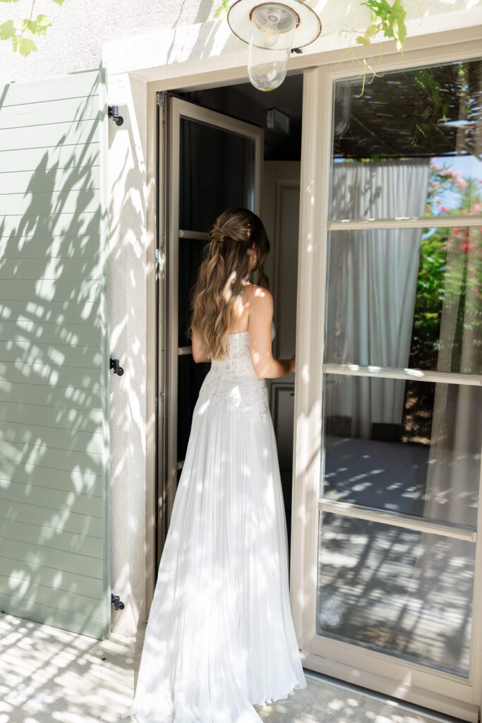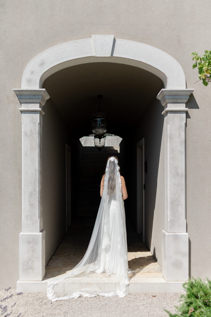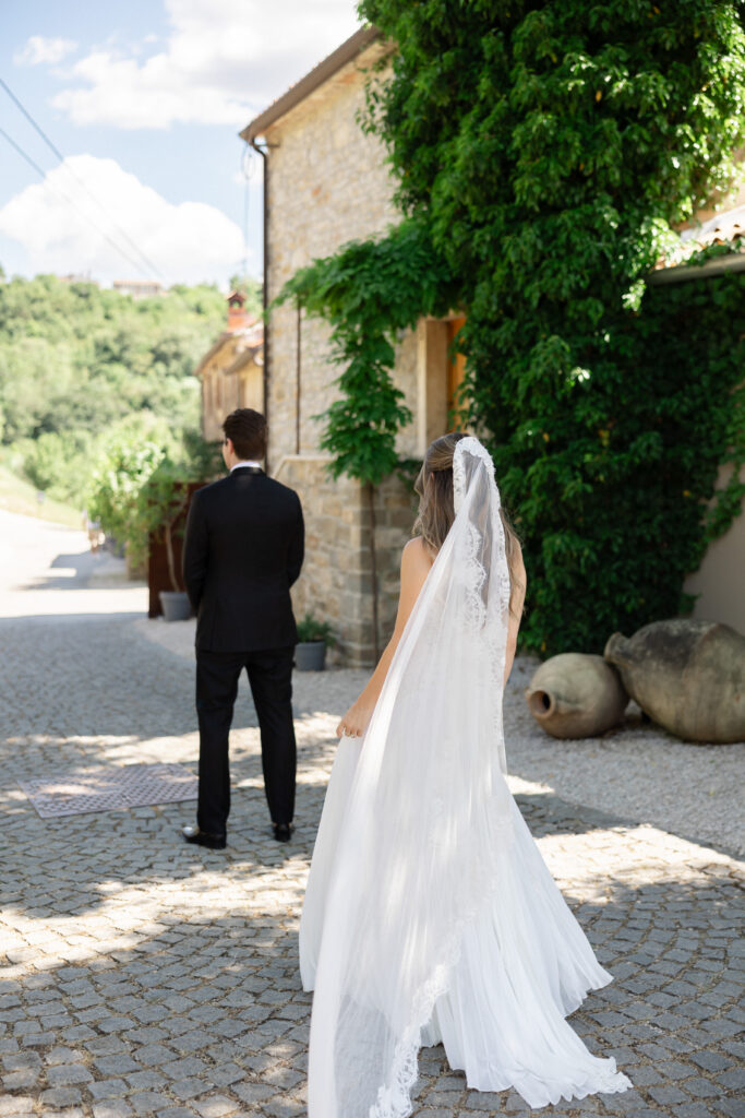 The day began slowly, in true Istrian style. Allie spent the morning getting ready surrounded by her closest friends — champagne glasses raised, laughter echoing through the stone interiors, and that quiet anticipation that only a wedding morning holds. Her bridal look felt perfectly suited to San Canzian’s aesthetic: modern yet romantic, soft yet striking. Portraits taken in the warm village light felt calm, effortless, and completely timeless.