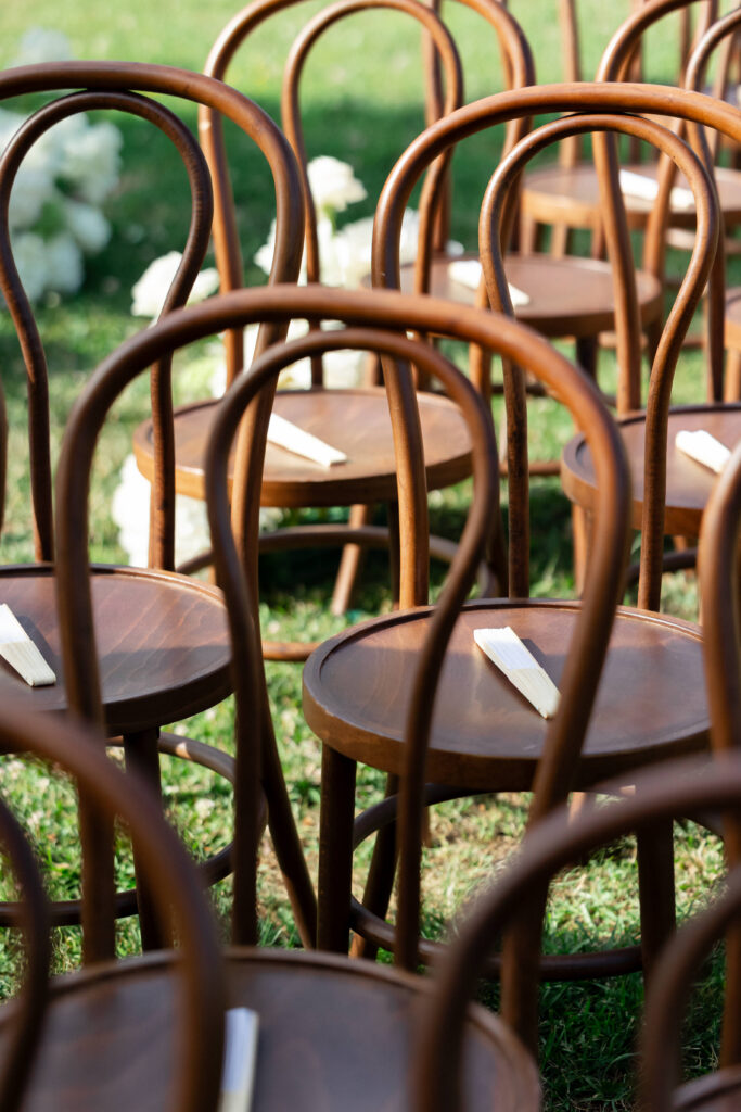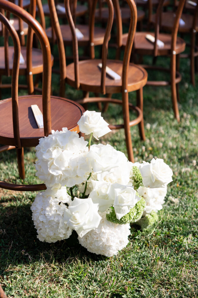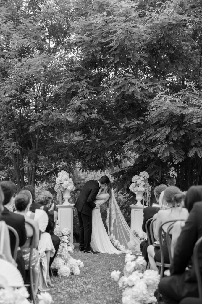 The ceremony took place outdoors on the grass, framed by greenery and the peaceful countryside beyond. Guests gathered in an intimate setting while the gentle sound of a harp created an atmosphere of pure serenity. As Allie made her entrance, everything felt still — just soft music, warm air, and emotion. And then, one of the most iconic moments of the day: Their walk back down the aisle ended with a kiss right in the middle, surrounded by cheers, applause, and the kind of happiness you can’t stage. It was celebratory, cinematic, and completely them.