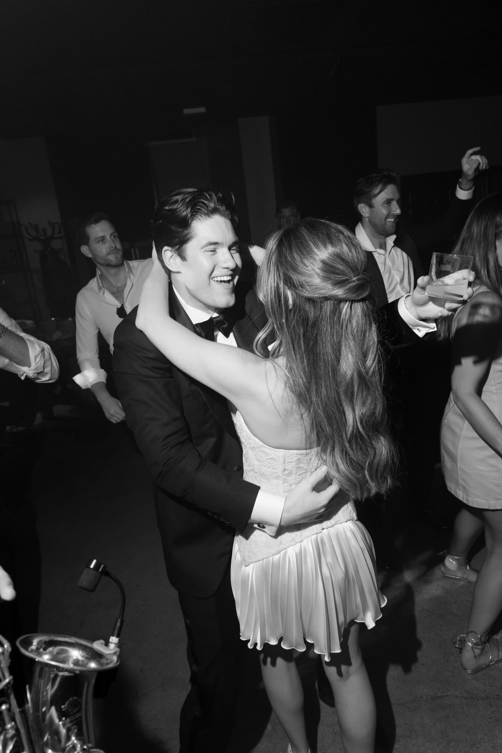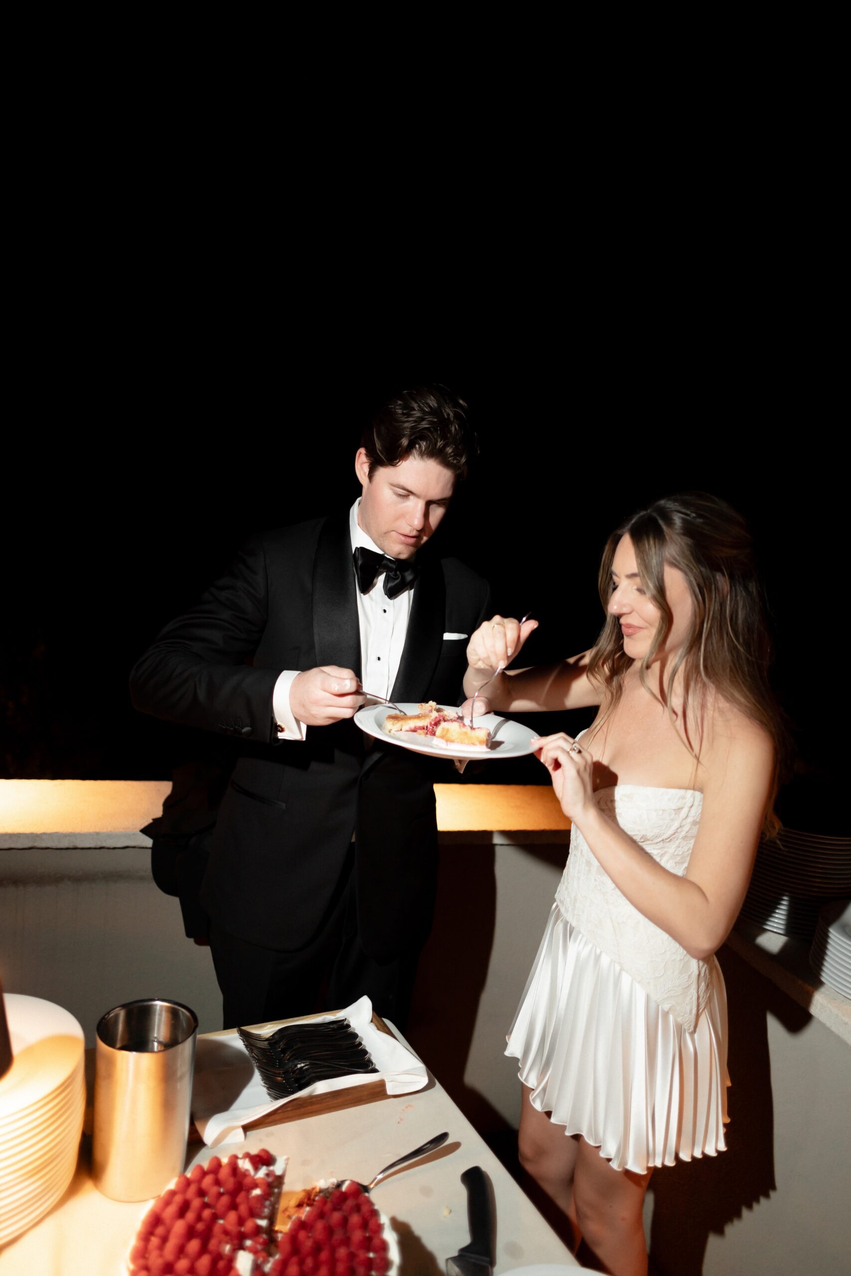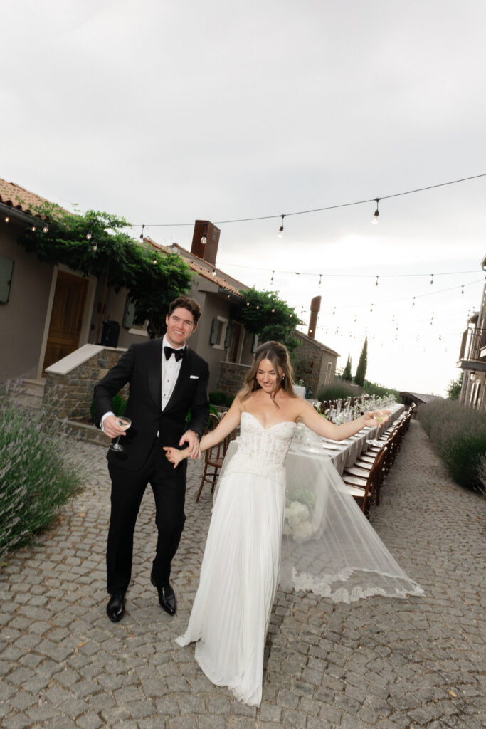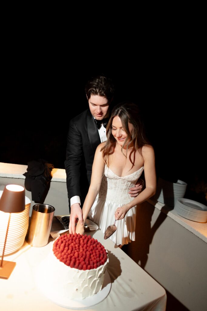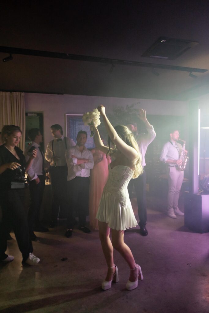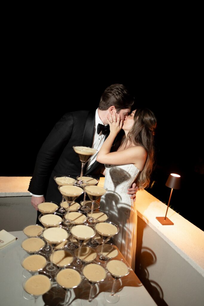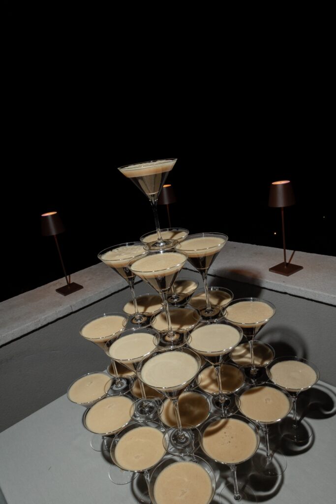 Live saxophone music carried through the evening, shifting the celebration into something more vibrant and electric. Before the party began, Allie and Connor slipped away to change — returning ready for the night ahead. The atmosphere transformed: candlelight deeper, music louder, energy rising. The evening was filled with unforgettable highlights: A dreamy wedding cake moment under the night sky, Bouquet tossing to the soundtrack of Gimme! Gimme! Gimme!” by ABBA. Guests singing, laughing, completely present, Nothing felt forced — it all unfolded naturally, beautifully, joyfully. And then came the ultimate party statement: an espresso martini tower — chic, playful, and the perfect finish to a night that balanced elegance with pure fun. Glasses stacked, cocktails poured, cheers erupting — a moment that felt both modern and timeless, exactly like the wedding itself.
