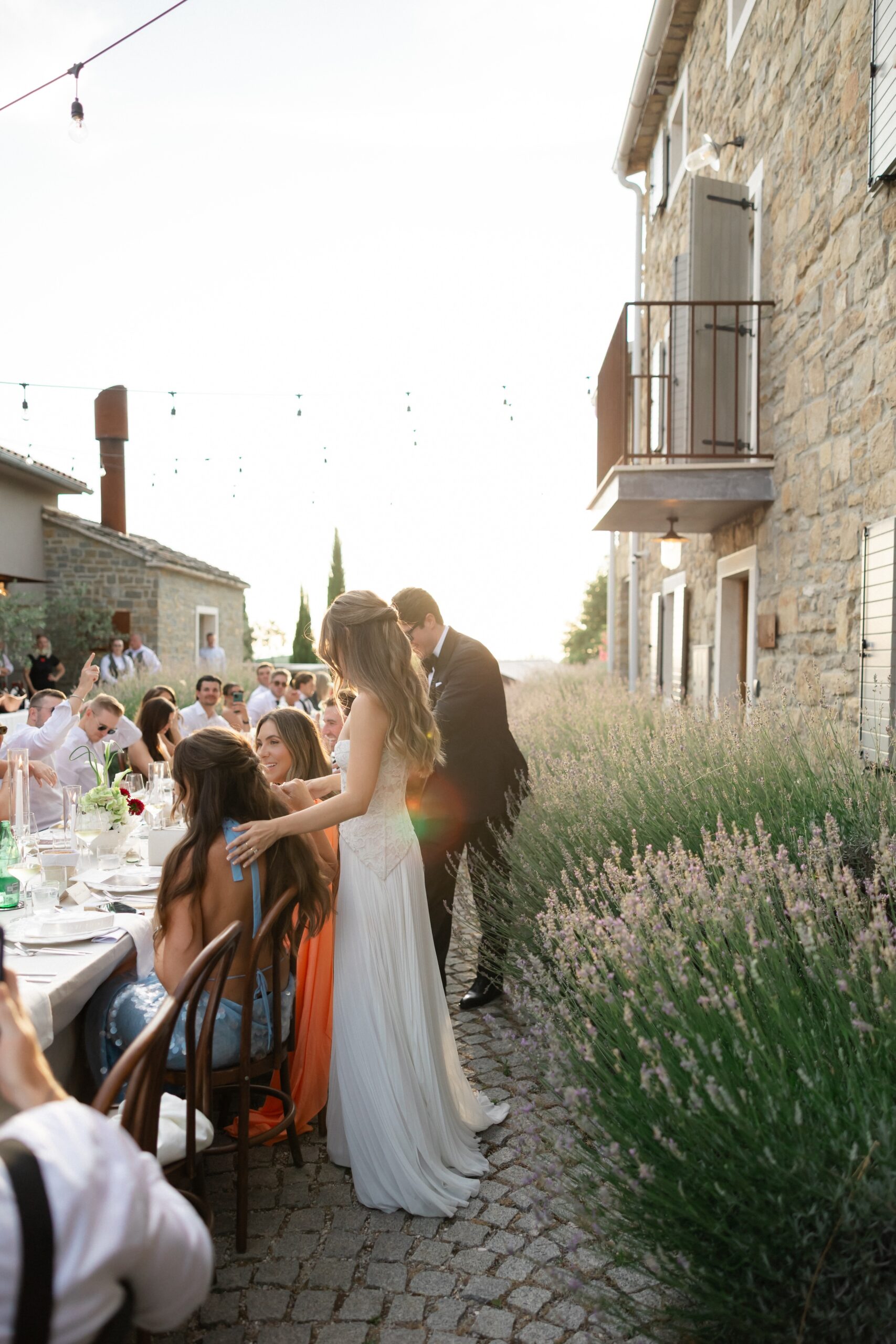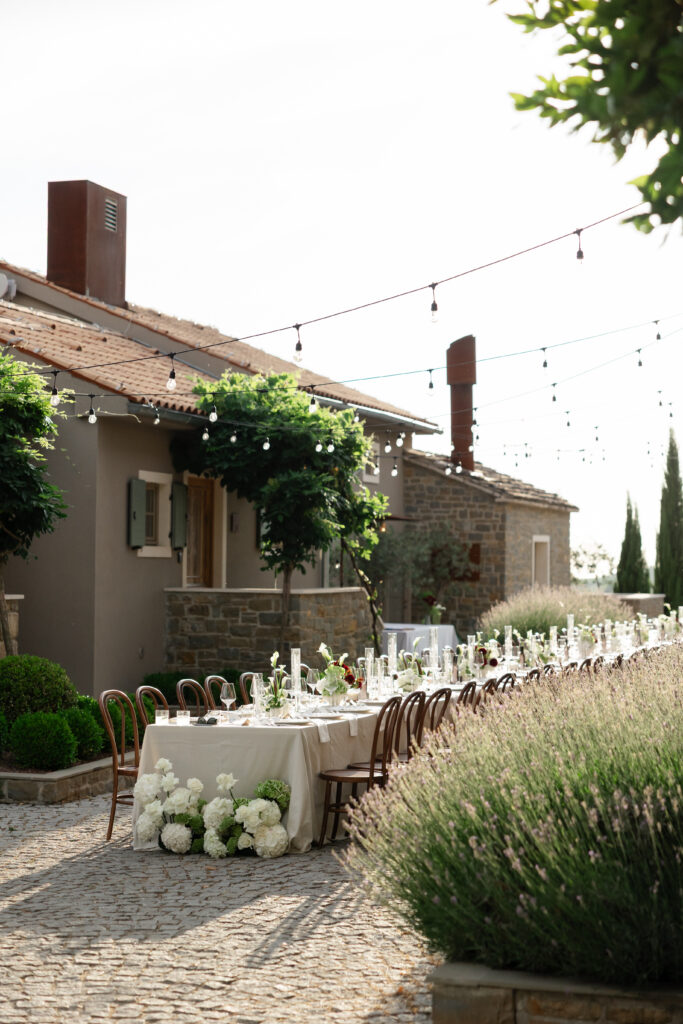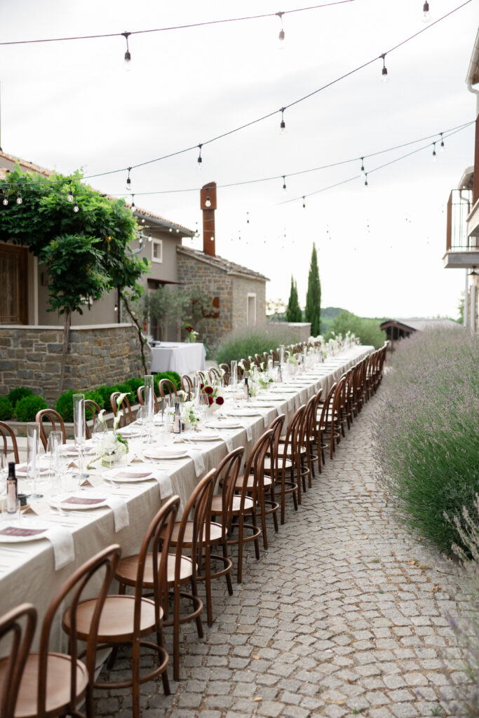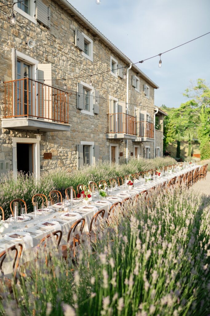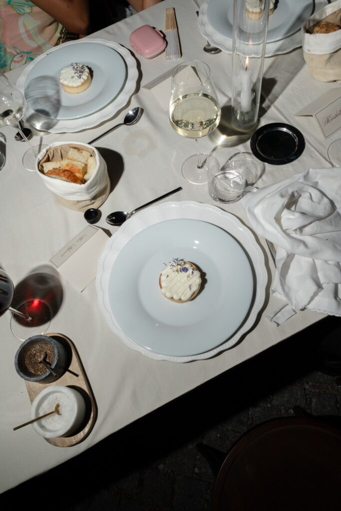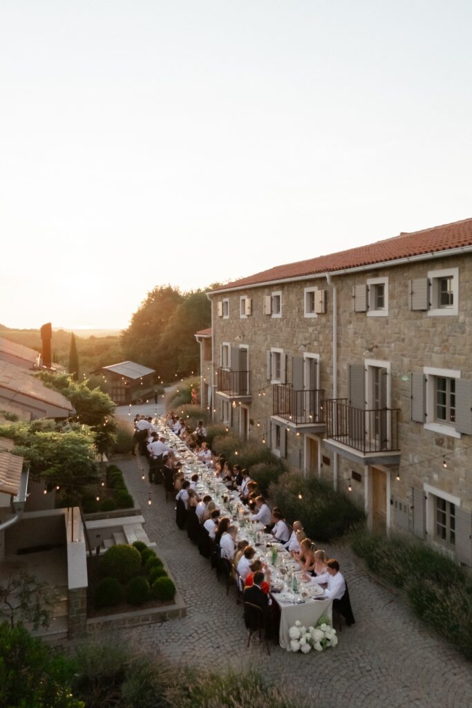 As evening approached, guests were guided to one of the most stunning settings of the weekend: a long communal table stretching through the lavender, dressed in crisp linens, candlelight, and thoughtful floral accents. San Canzian’s magic lies in how naturally it holds space for beauty — nothing feels overdone, yet everything feels intentional. Dinner was slow, atmospheric, and full of conversation as the sky turned soft and dusk settled over the village.