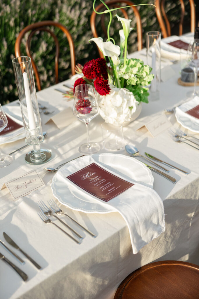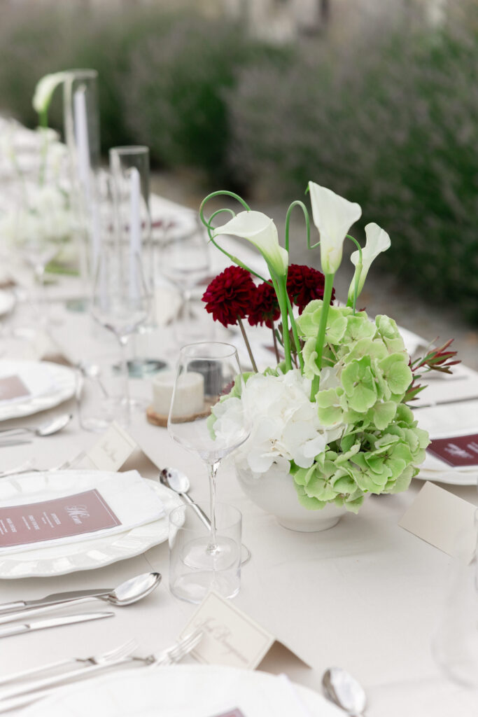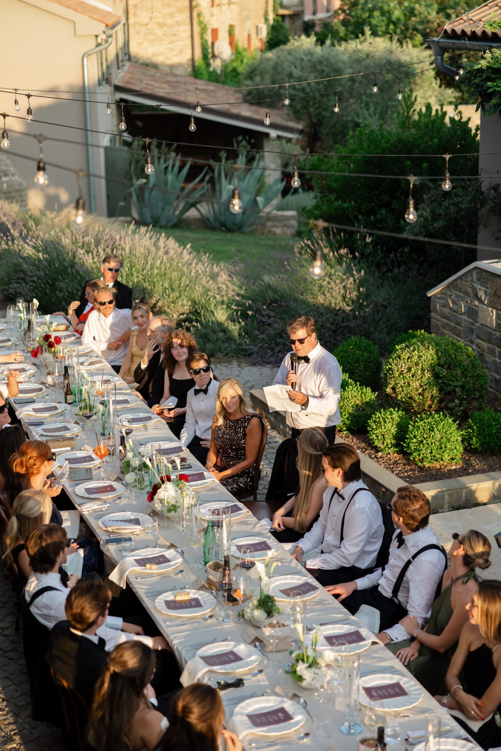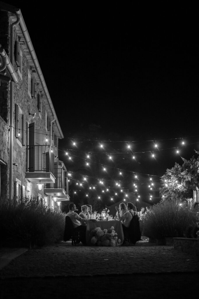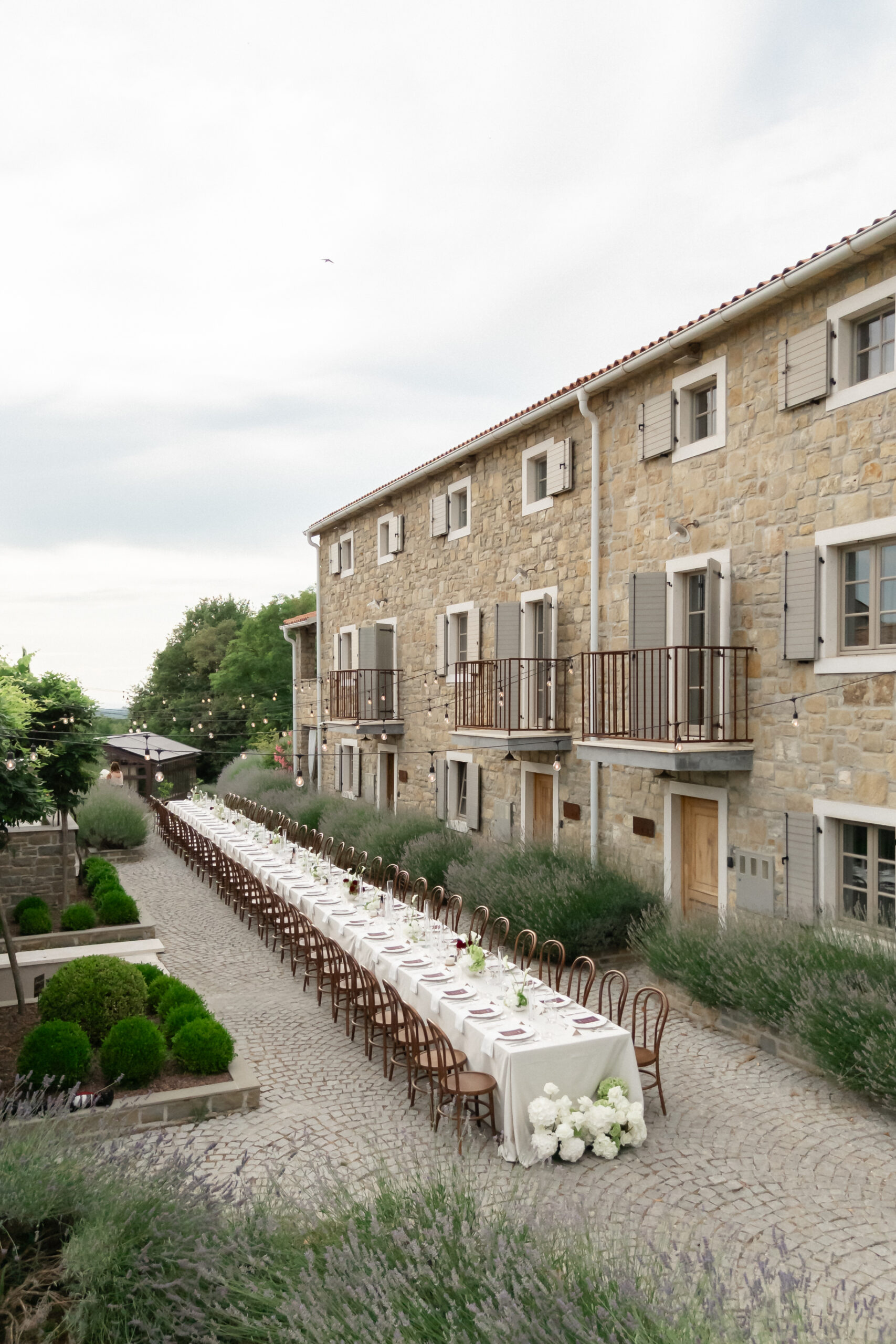 As evening approached, guests were guided to one of the most stunning settings of the weekend: a long communal table stretching through the lavender, dressed in crisp linens, candlelight, and thoughtful floral accents. San Canzian’s magic lies in how naturally it holds space for beauty — nothing feels overdone, yet everything feels intentional. Dinner was slow, atmospheric, and full of conversation as the sky turned soft and dusk settled over the village.