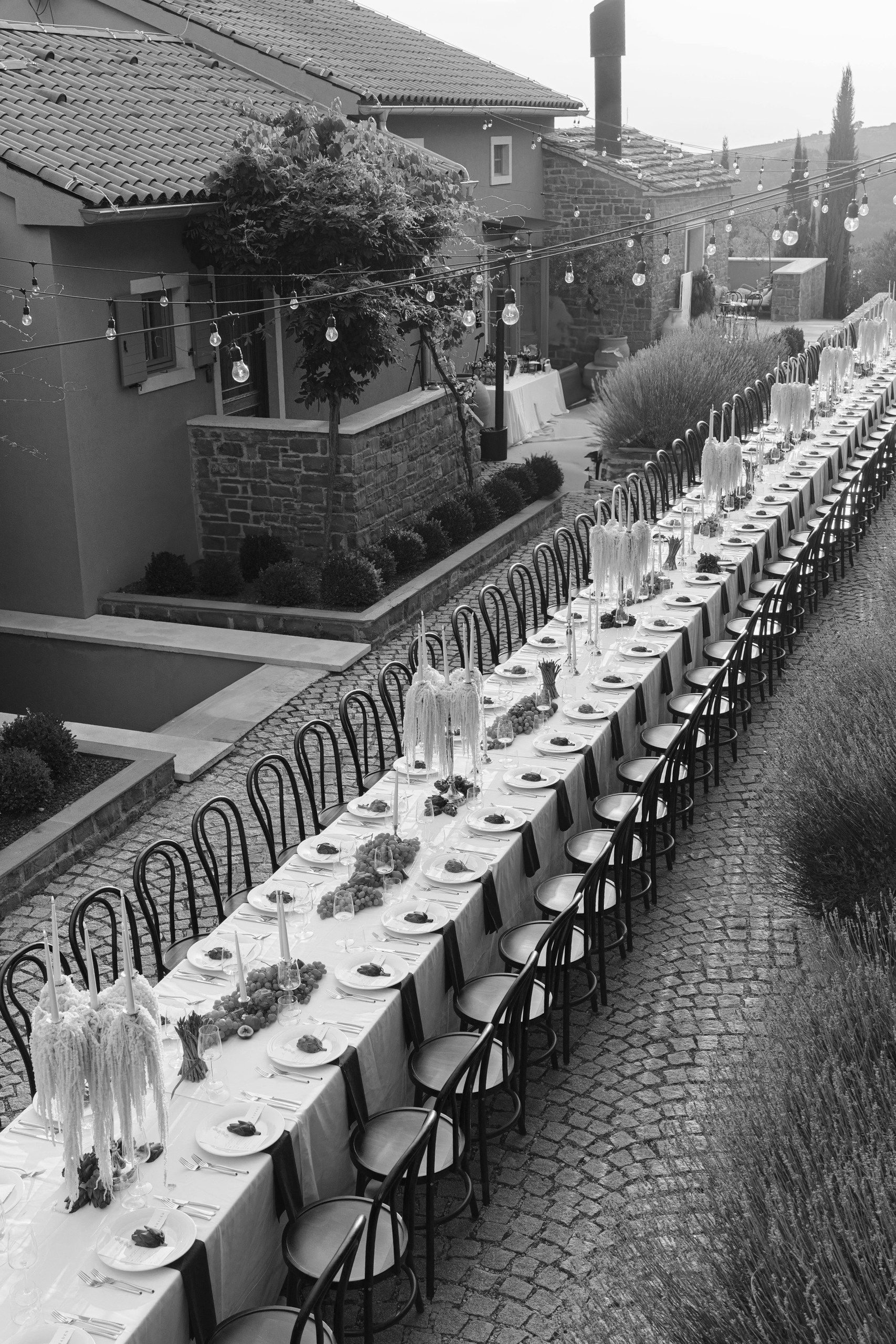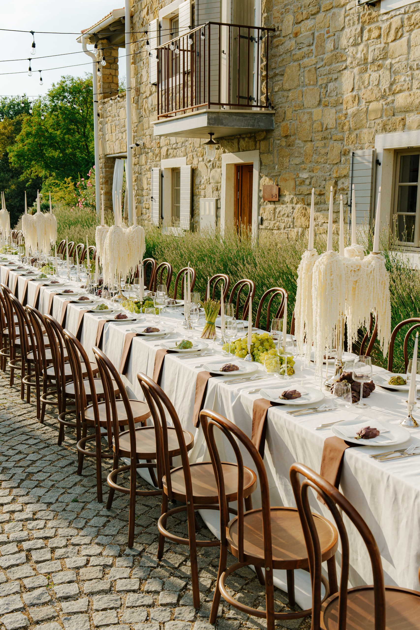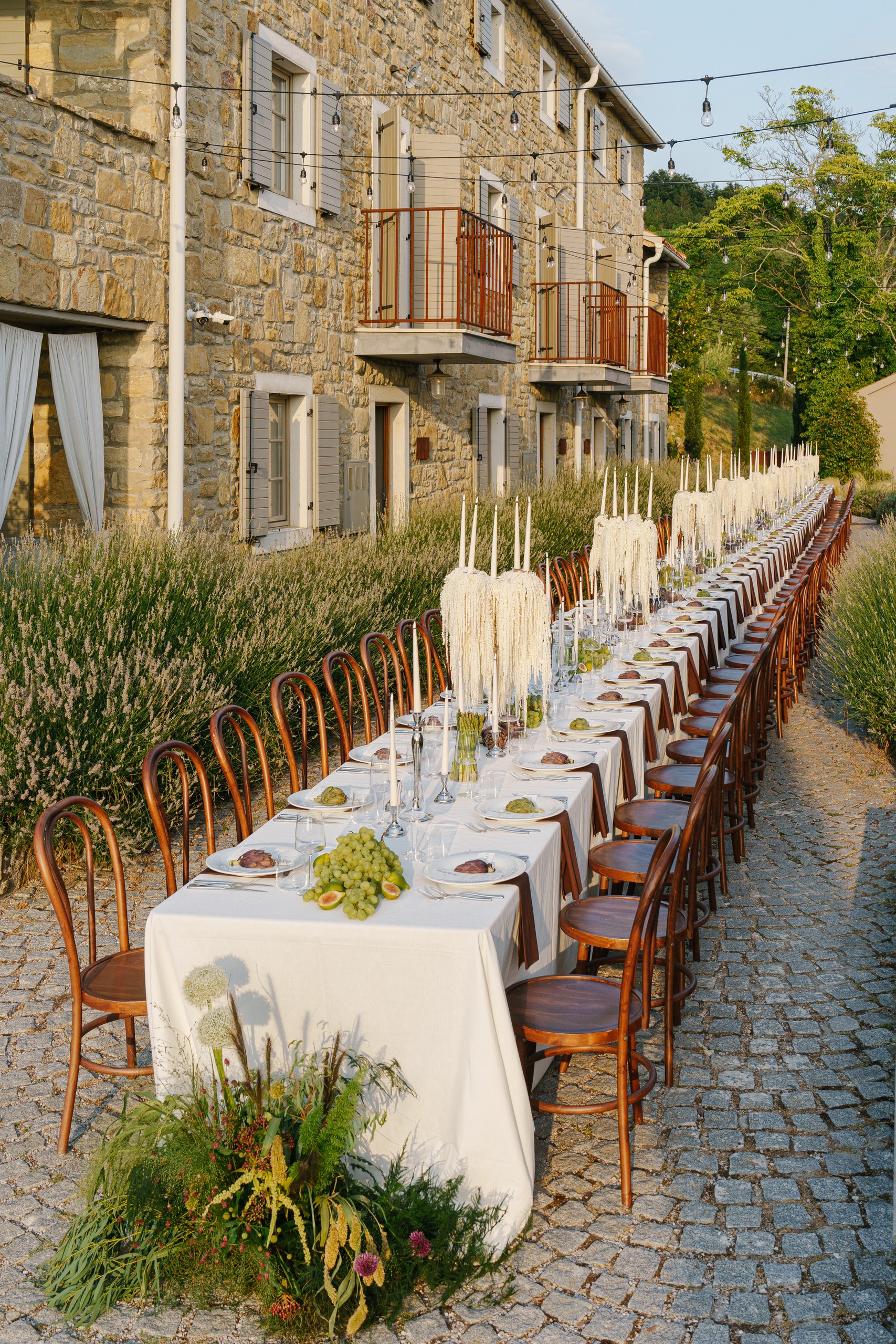 Rustic Elegance at San Canzian The wedding day at San Canzian in Istria was designed to feel earthy, natural, and refined — effortlessly blending rustic elements with chic sophistication. The aesthetic was understated yet timeless, embracing a palette of warm, tonal hues that echoed the surrounding landscape. The tablescape became the centerpiece of the design — a vision of artisanal beauty with textured linens, seasonal fruits, and sculptural florals in muted tones. Long wooden chairs, natural stone, and candlelight created a warm and intimate atmosphere that evoked community, harmony, and connection to nature. Every detail felt intentional and organic, balancing elegance with authenticity.