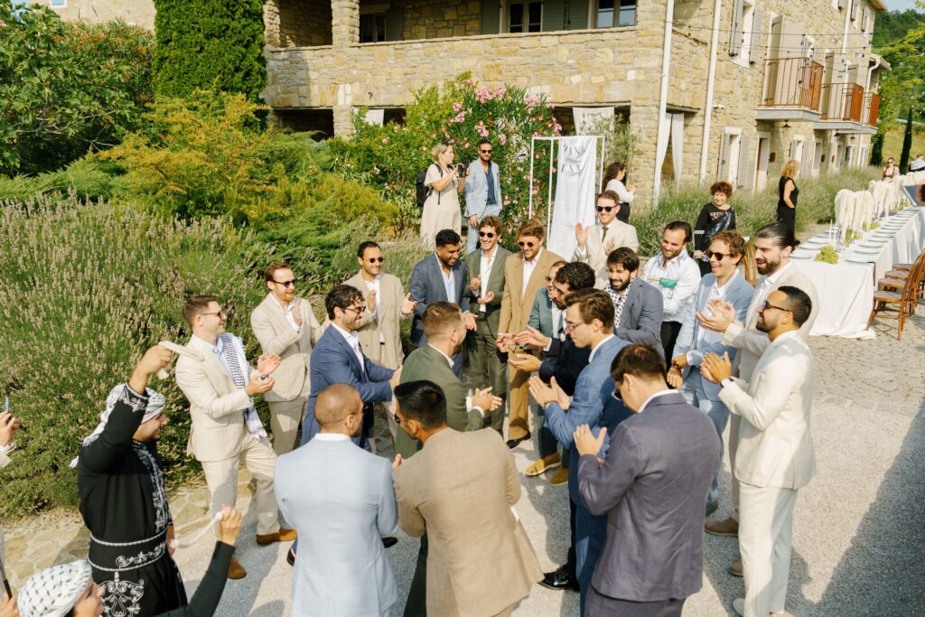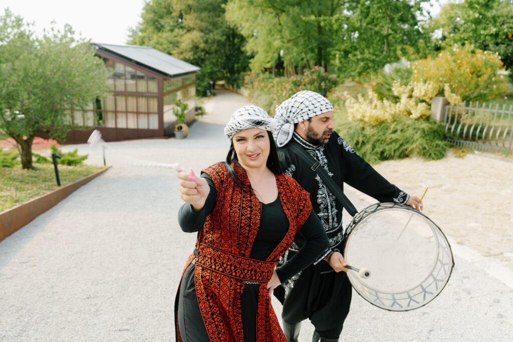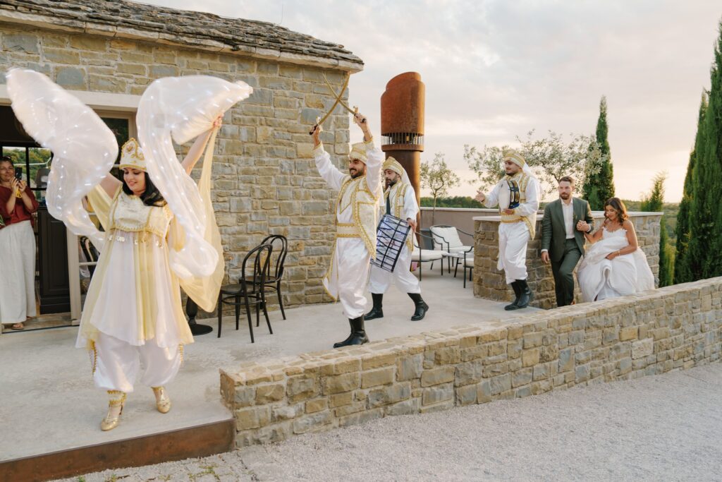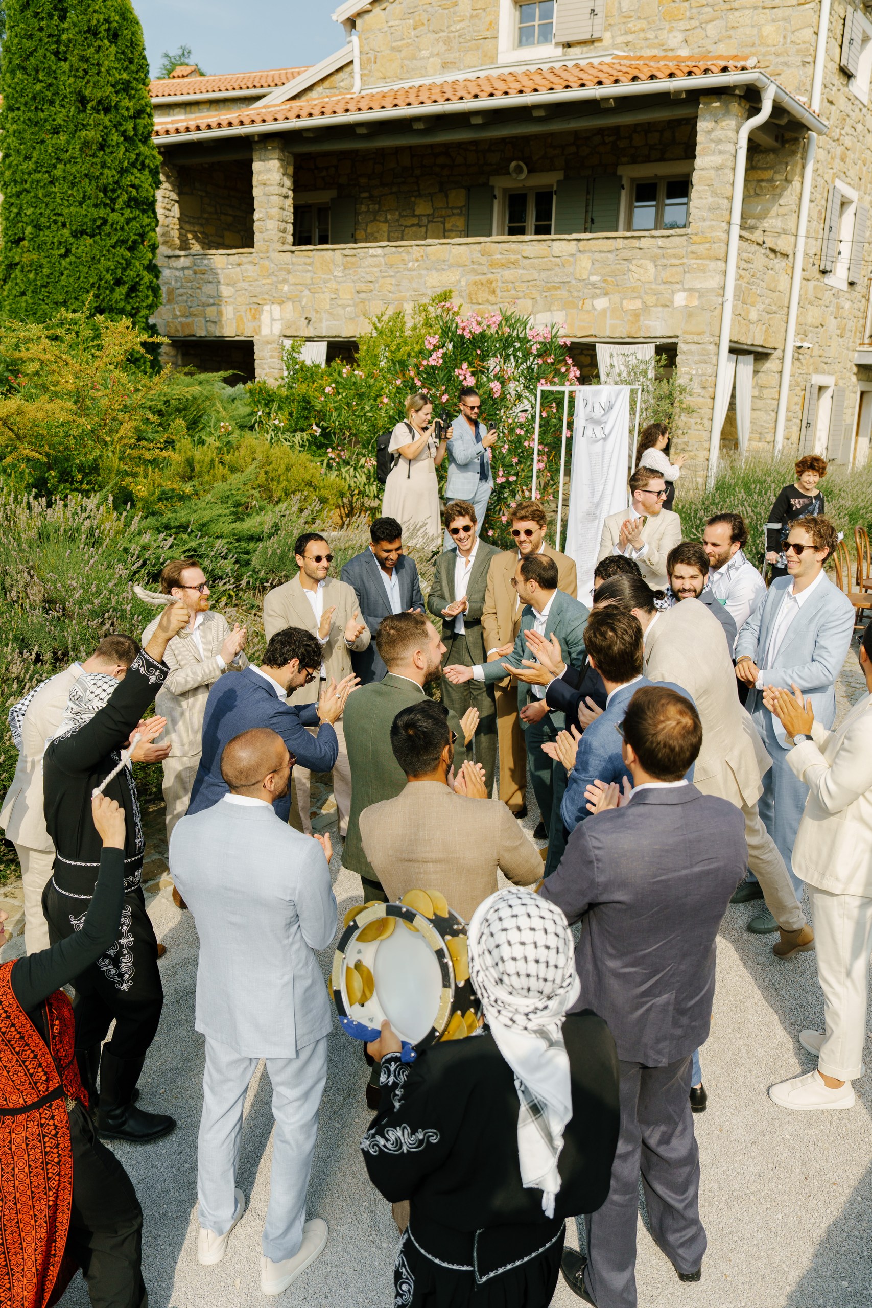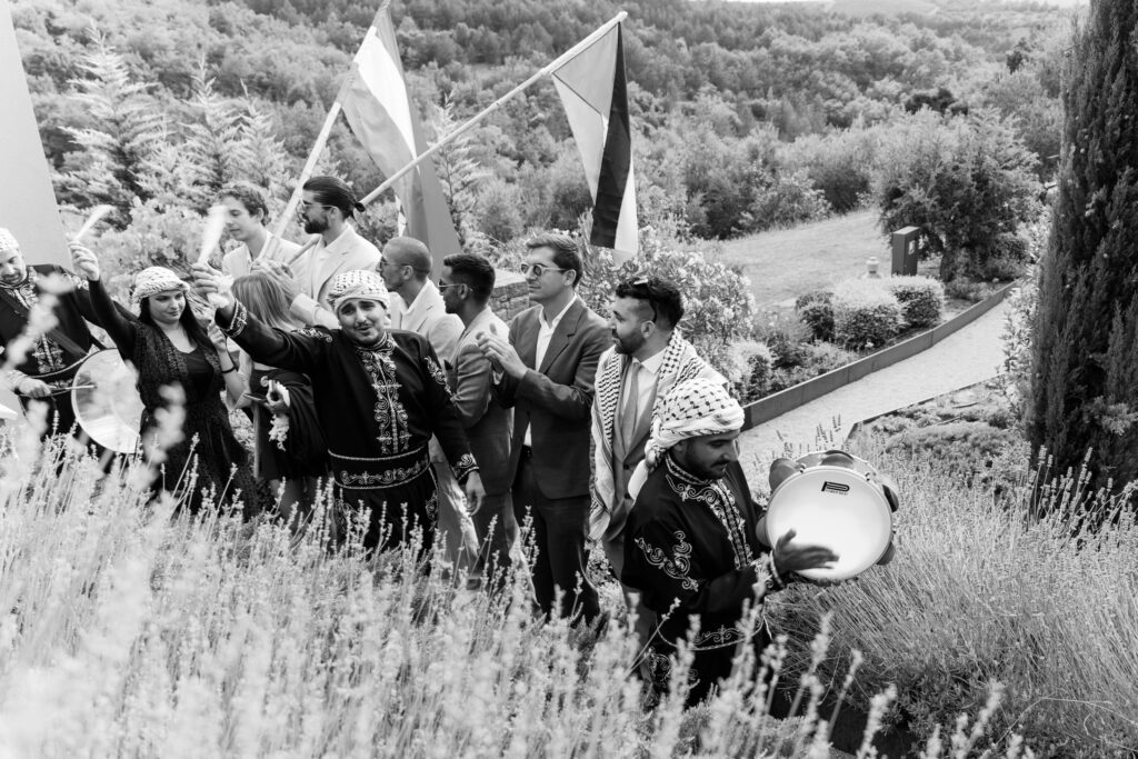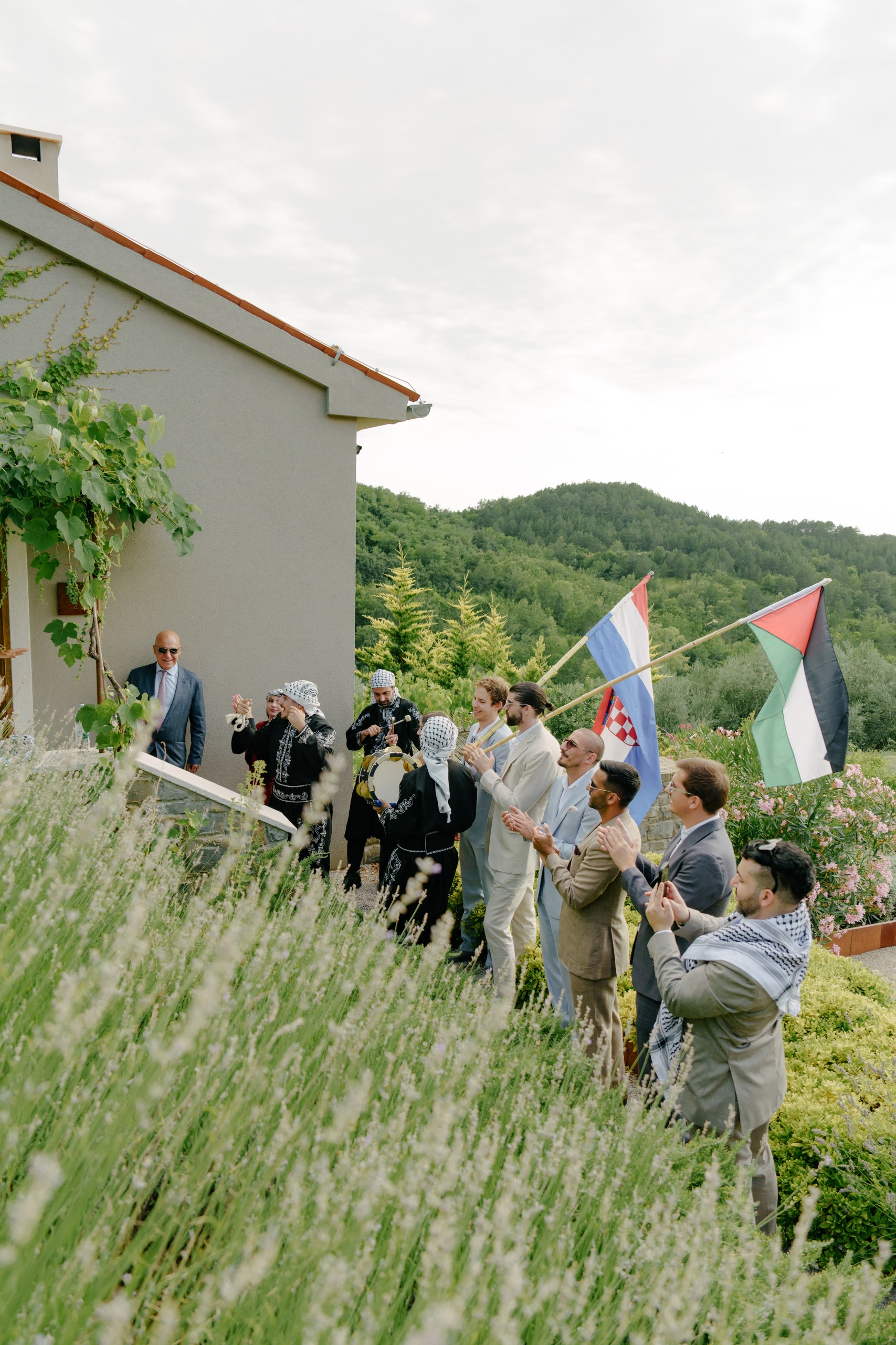 A Multicultural Celebration As the sun dipped behind the hills, the energy of the day shifted with Palestinian drums and dancers leading a spirited entrance. Croatian and Palestinian flags waved side by side, symbolizing unity and shared joy. Dinner unfolded beneath string lights, followed by heartfelt speeches, laughter, and dancing late into the night. Instead of a traditional cake, guests were treated to a tiramisu tower — a playful and delicious nod to Italian influence and a perfect finale to a weekend that felt both deeply personal and joyfully international.