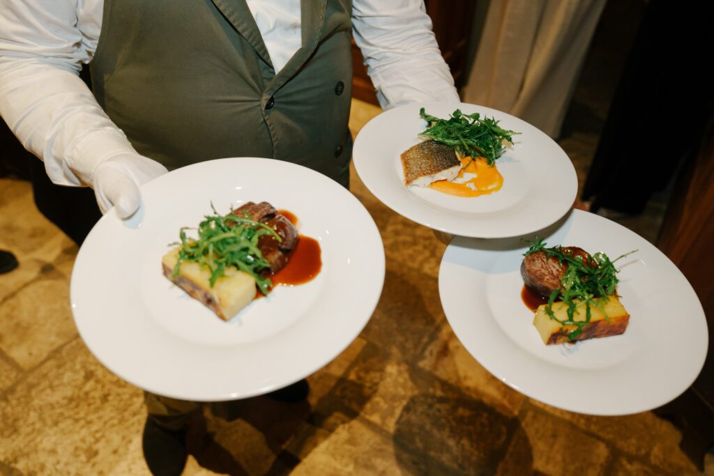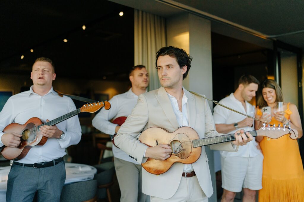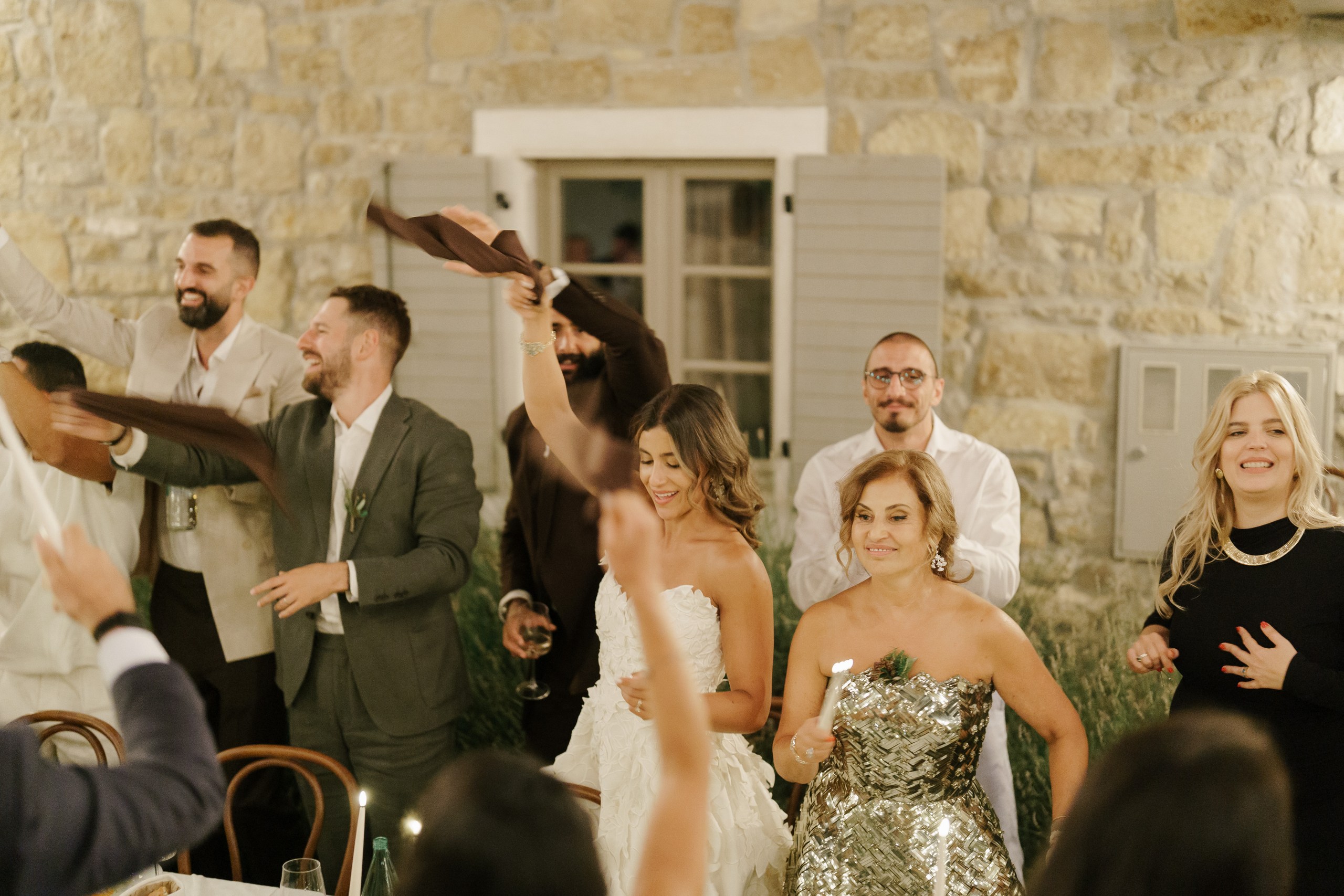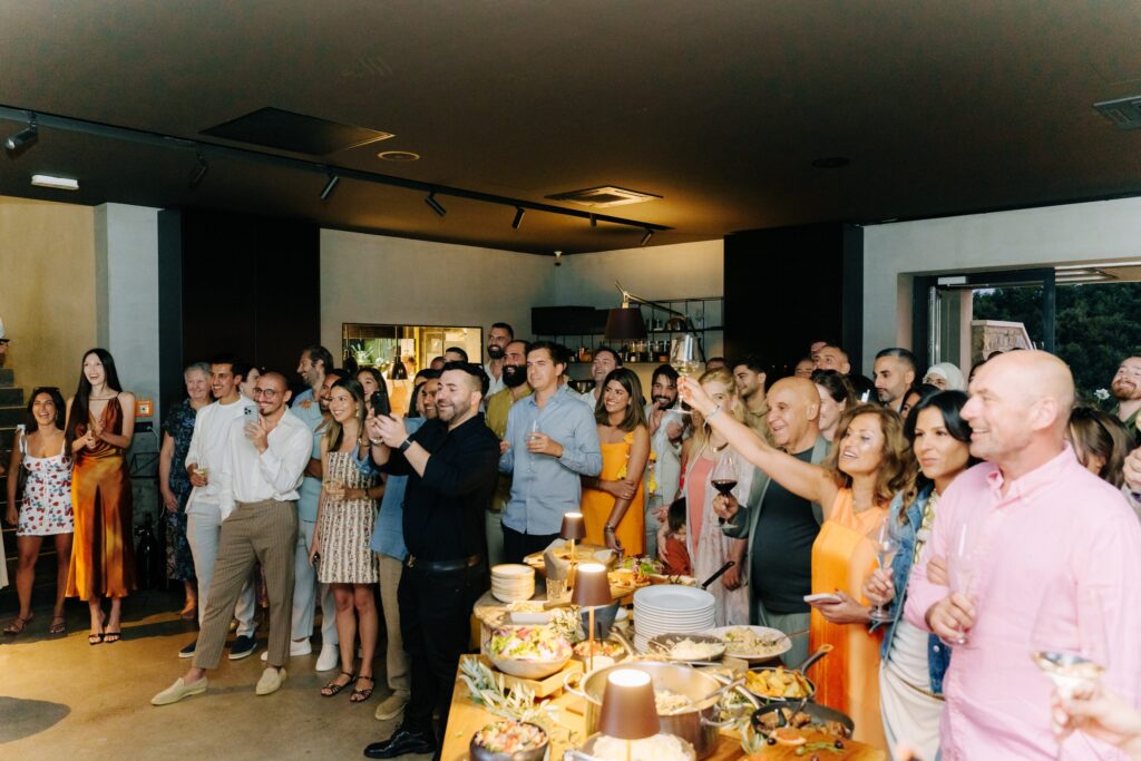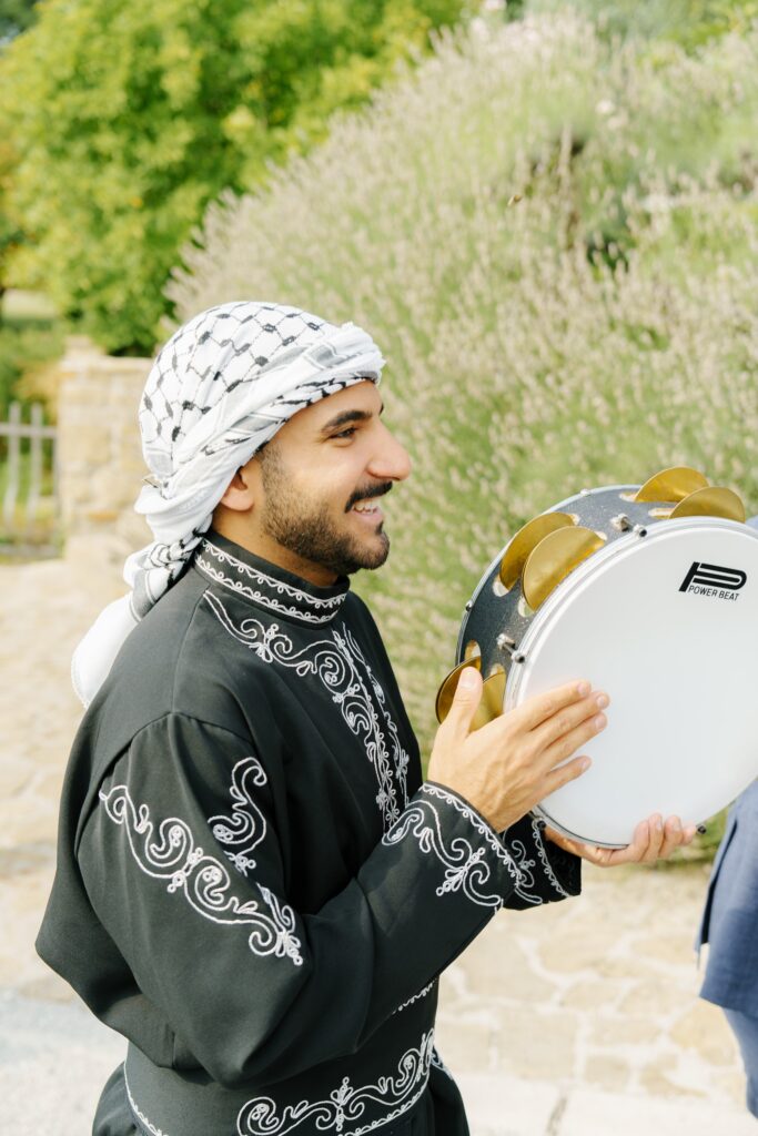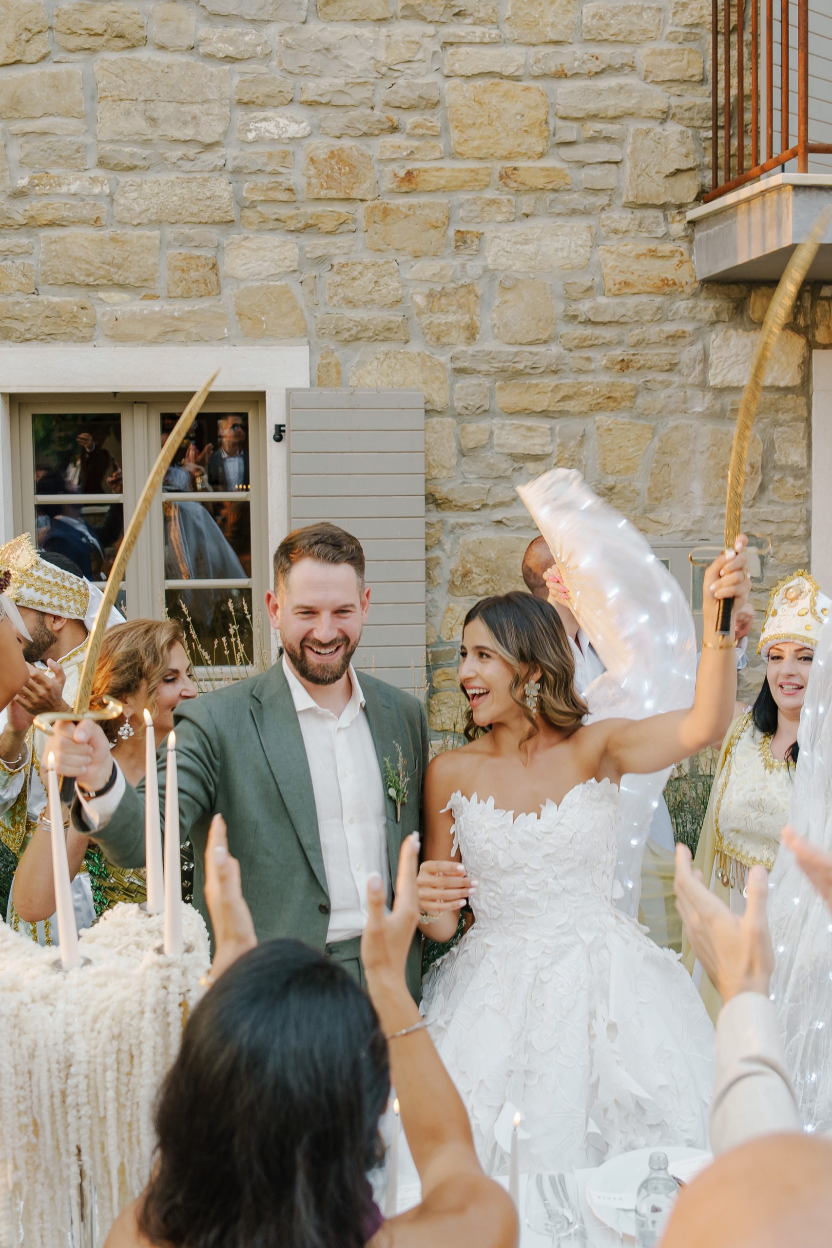 A Multicultural Celebration As the sun dipped behind the hills, the energy of the day shifted with Palestinian drums and dancers leading a spirited entrance. Croatian and Palestinian flags waved side by side, symbolizing unity and shared joy. Dinner unfolded beneath string lights, followed by heartfelt speeches, laughter, and dancing late into the night. Instead of a traditional cake, guests were treated to a tiramisu tower — a playful and delicious nod to Italian influence and a perfect finale to a weekend that felt both deeply personal and joyfully international.