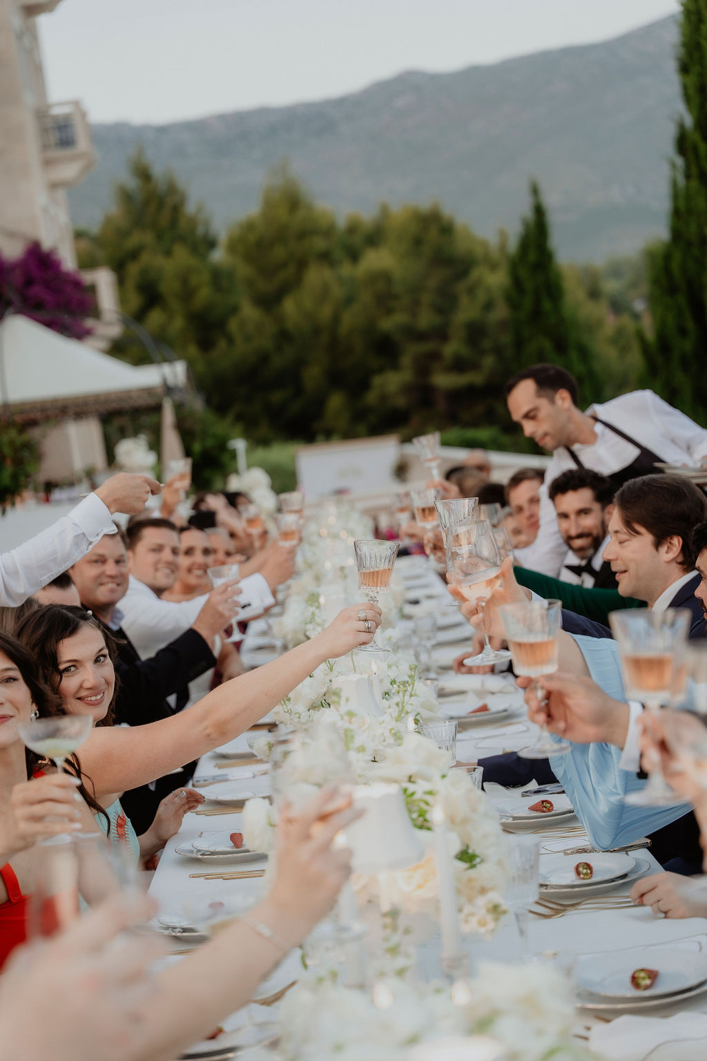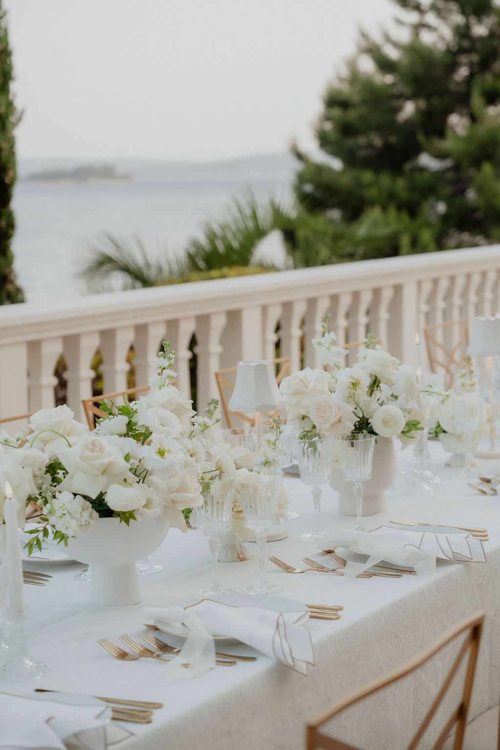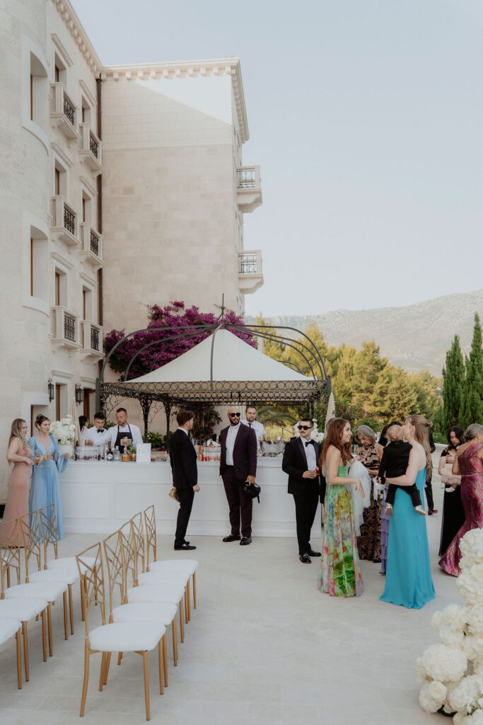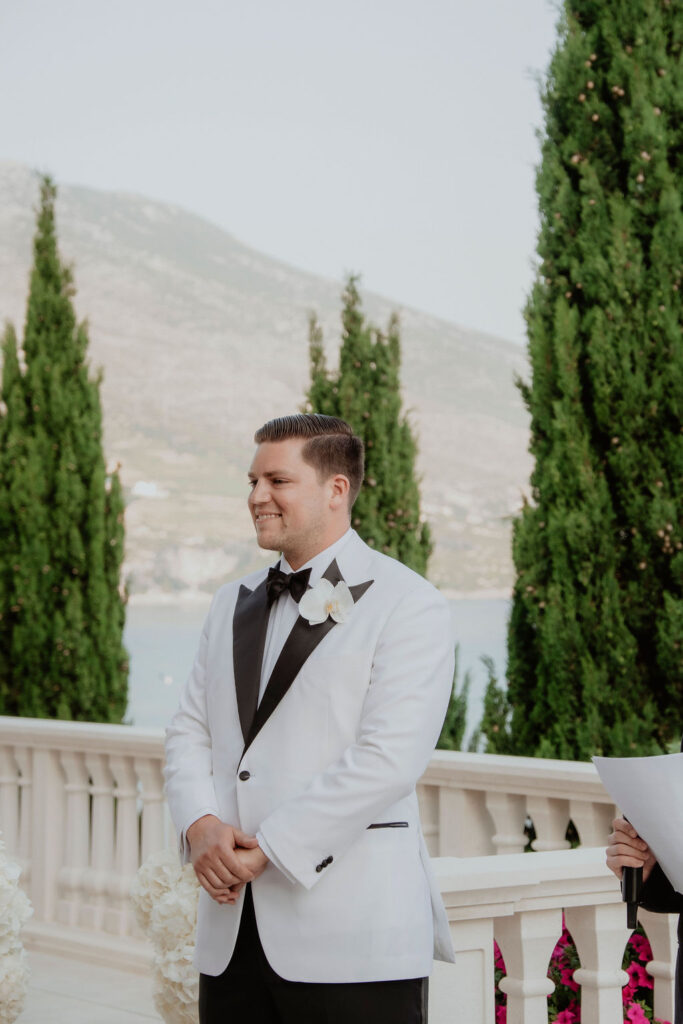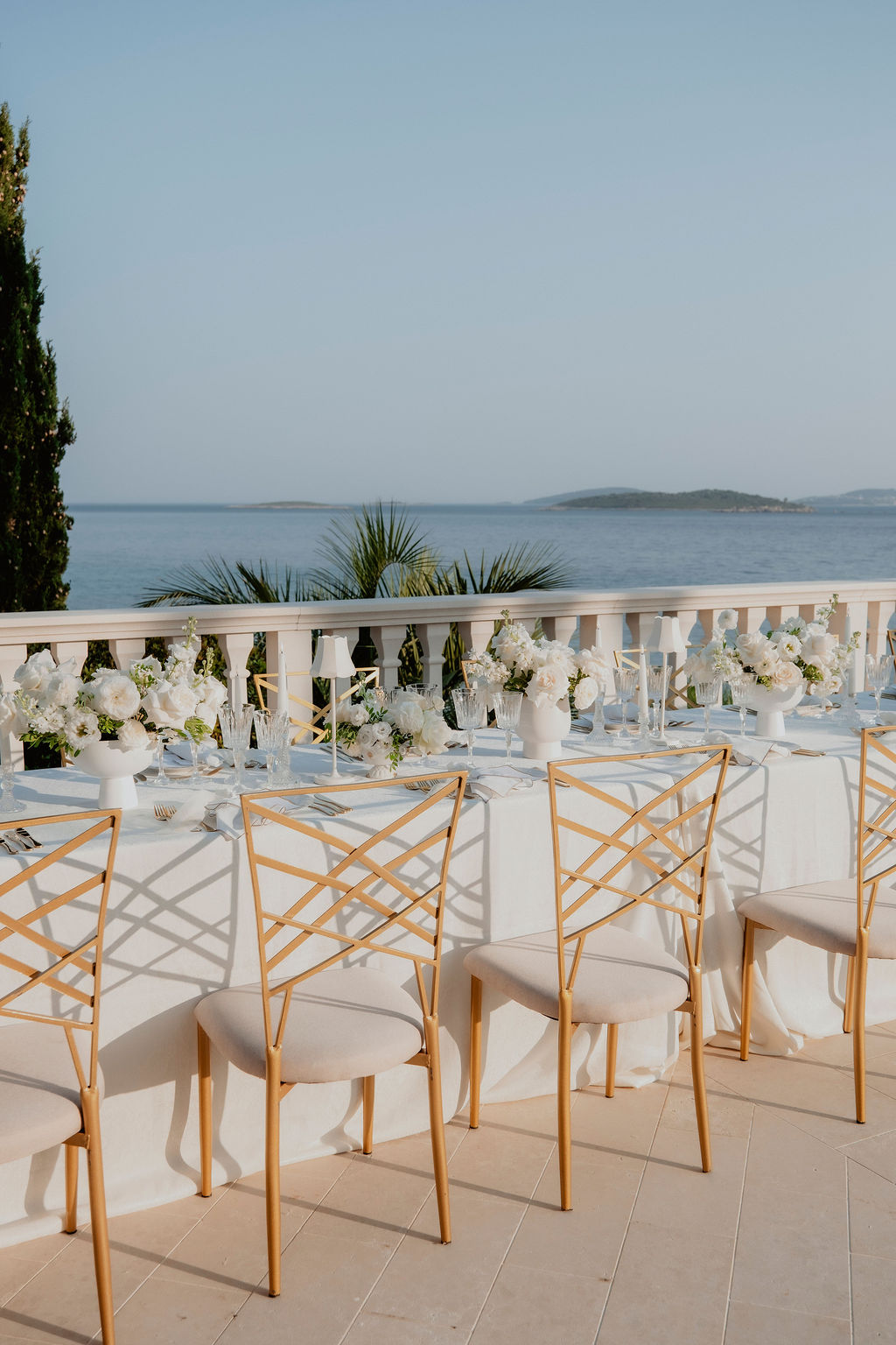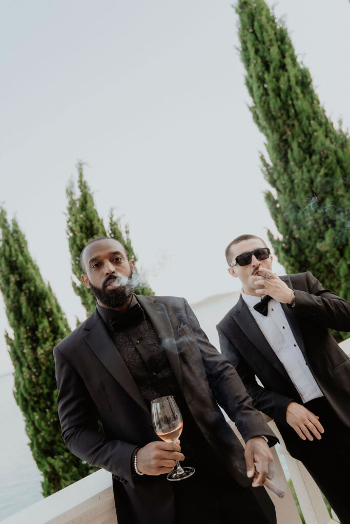 The next morning unfolded slowly. Guests and the couple relaxed by the pool, enjoying the sunshine and lighthearted chatter. The bride spent her afternoon in the villa’s suite, surrounded by laughter, calm energy, and anticipation. Meanwhile, the groom and his friends gathered at the bar, raising a glass of whiskey to the day ahead. As the afternoon faded, guests took their seats overlooking the Adriatic. The ceremony design mirrored the natural beauty around them — soft florals in creamy whites, organic textures, and a light sea breeze. Everything felt serene and timeless. After the ceremony, guests enjoyed a cocktail hour with canapés, signature drinks, and a cigar-rolling experience. It was a relaxed yet refined transition into the evening. Dinner followed on the terrace under the stars. The tablescape reflected elegant sophistication — linen textures, golden accents, and soft candlelight. Each dish highlighted local flavors, paired with the villa’s fine wines. Later, guests gathered for the wedding cake and an unforgettable party that lasted well into the night.