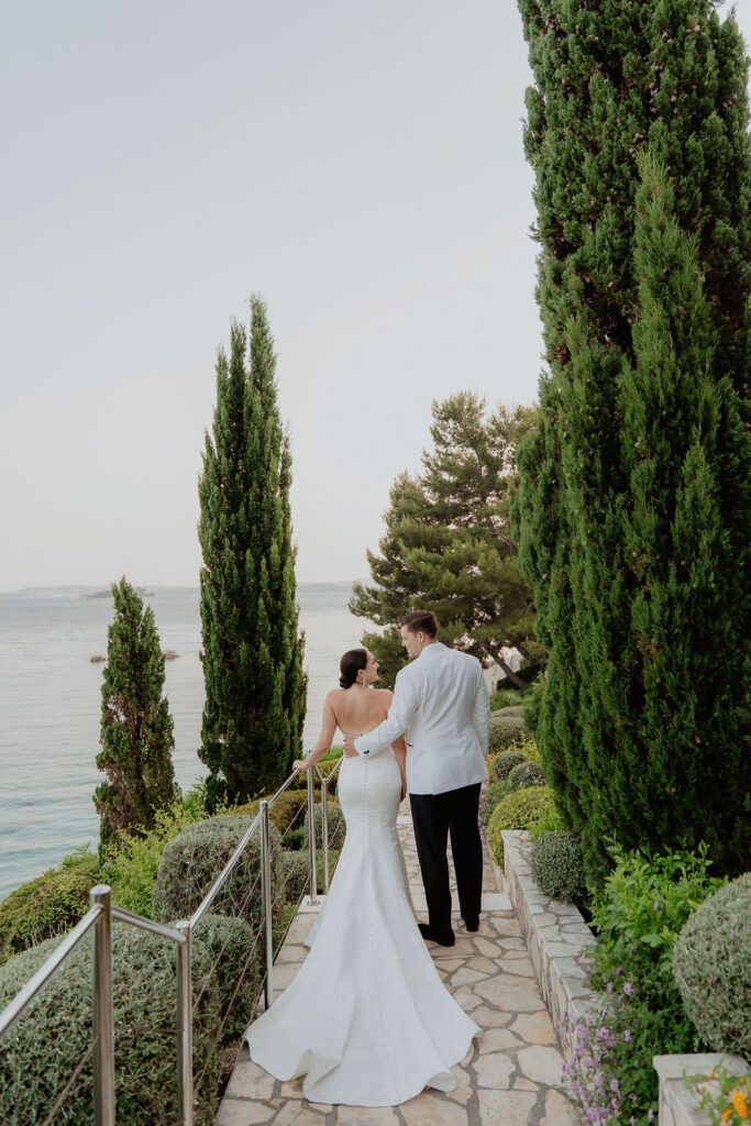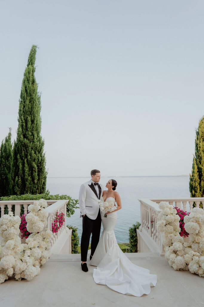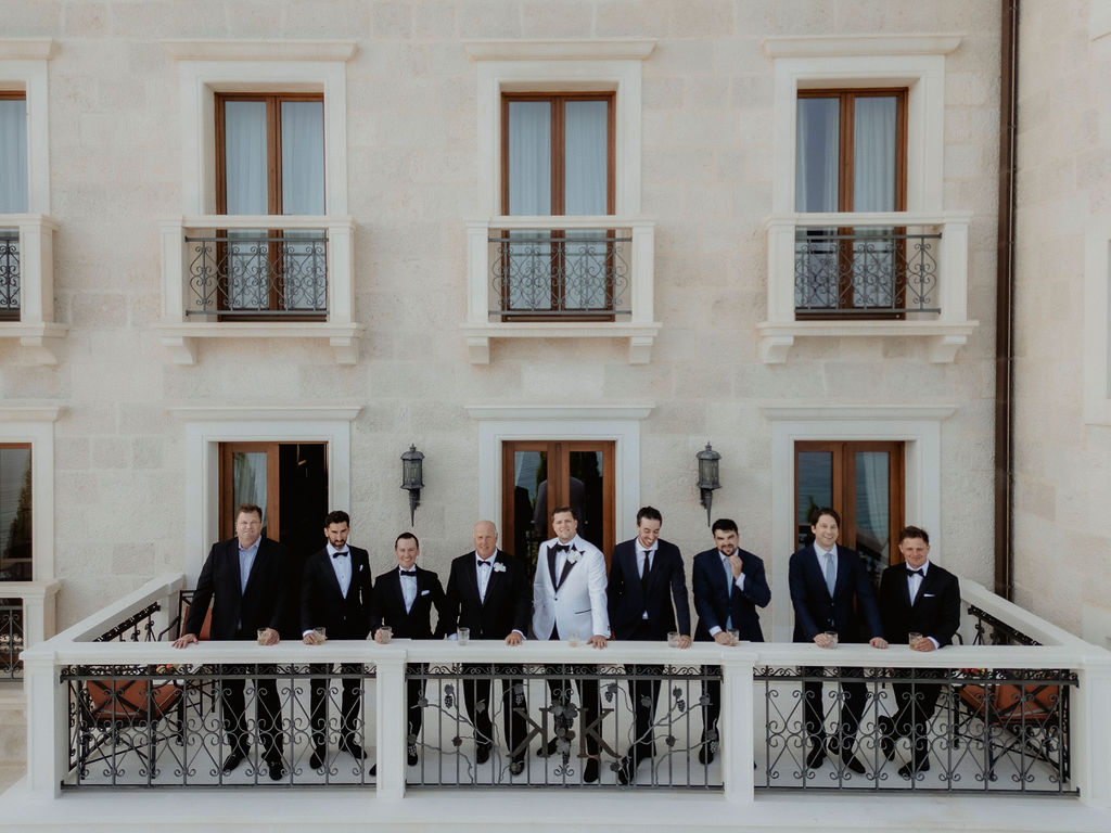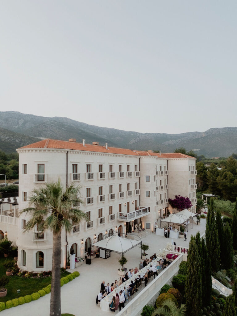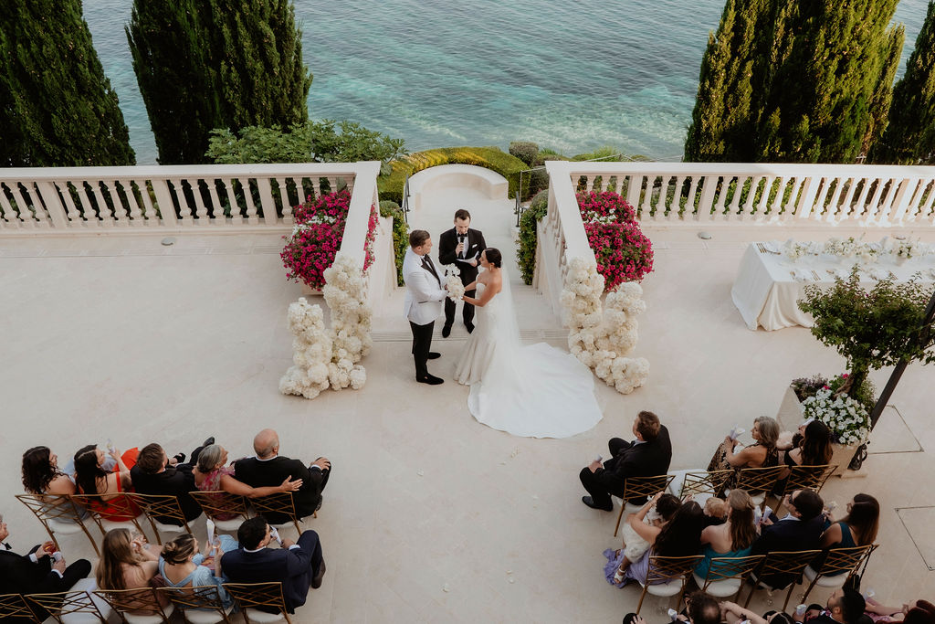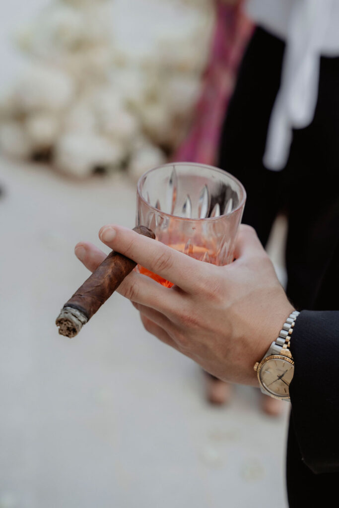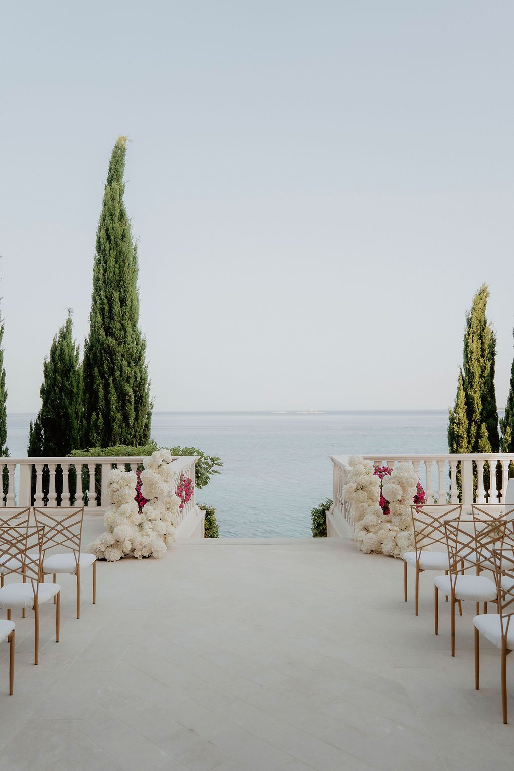 The next morning unfolded slowly. Guests and the couple relaxed by the pool, enjoying the sunshine and lighthearted chatter. The bride spent her afternoon in the villa’s suite, surrounded by laughter, calm energy, and anticipation. Meanwhile, the groom and his friends gathered at the bar, raising a glass of whiskey to the day ahead. As the afternoon faded, guests took their seats overlooking the Adriatic. The ceremony design mirrored the natural beauty around them — soft florals in creamy whites, organic textures, and a light sea breeze. Everything felt serene and timeless. After the ceremony, guests enjoyed a cocktail hour with canapés, signature drinks, and a cigar-rolling experience. It was a relaxed yet refined transition into the evening. Dinner followed on the terrace under the stars. The tablescape reflected elegant sophistication — linen textures, golden accents, and soft candlelight. Each dish highlighted local flavors, paired with the villa’s fine wines. Later, guests gathered for the wedding cake and an unforgettable party that lasted well into the night.