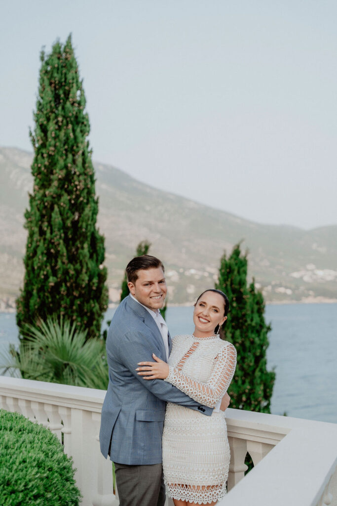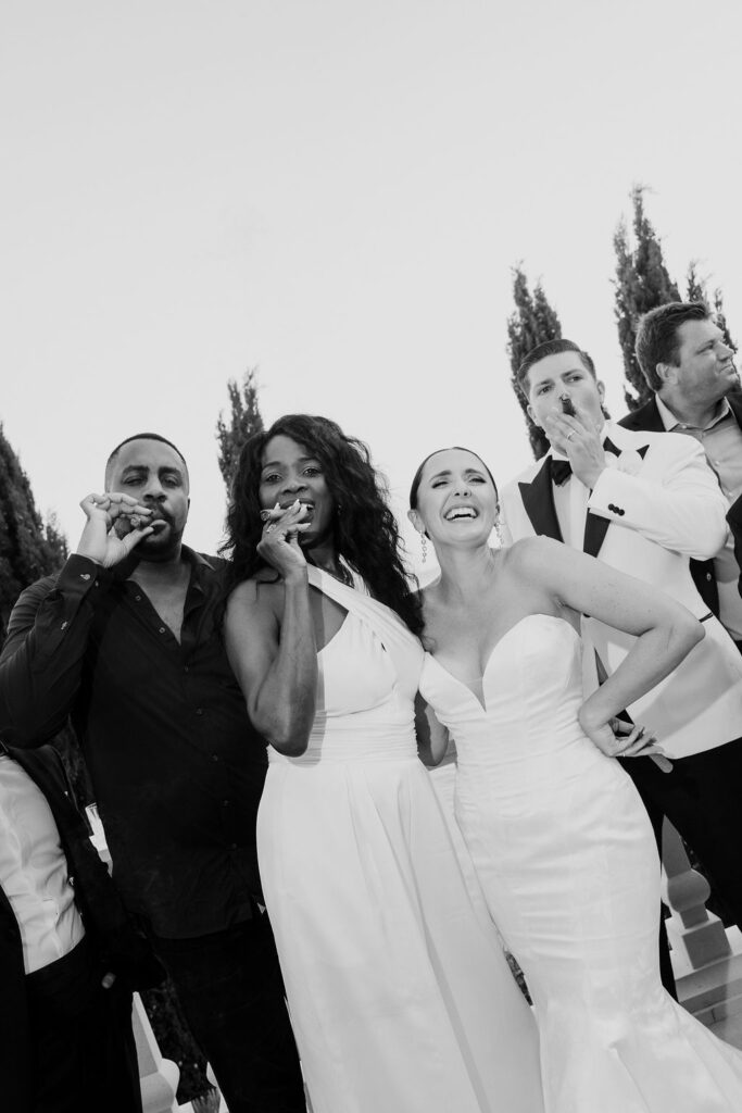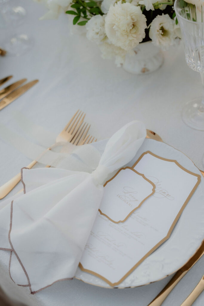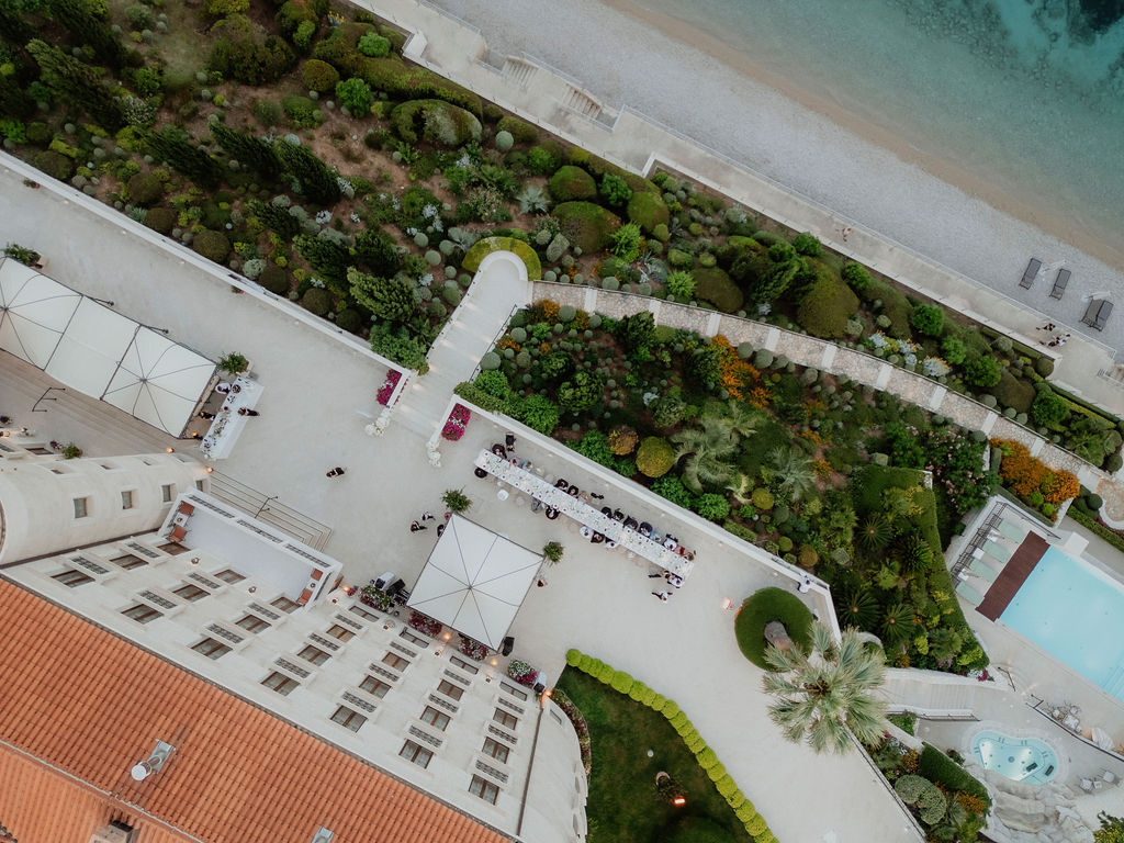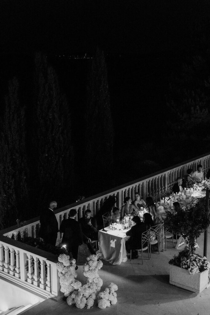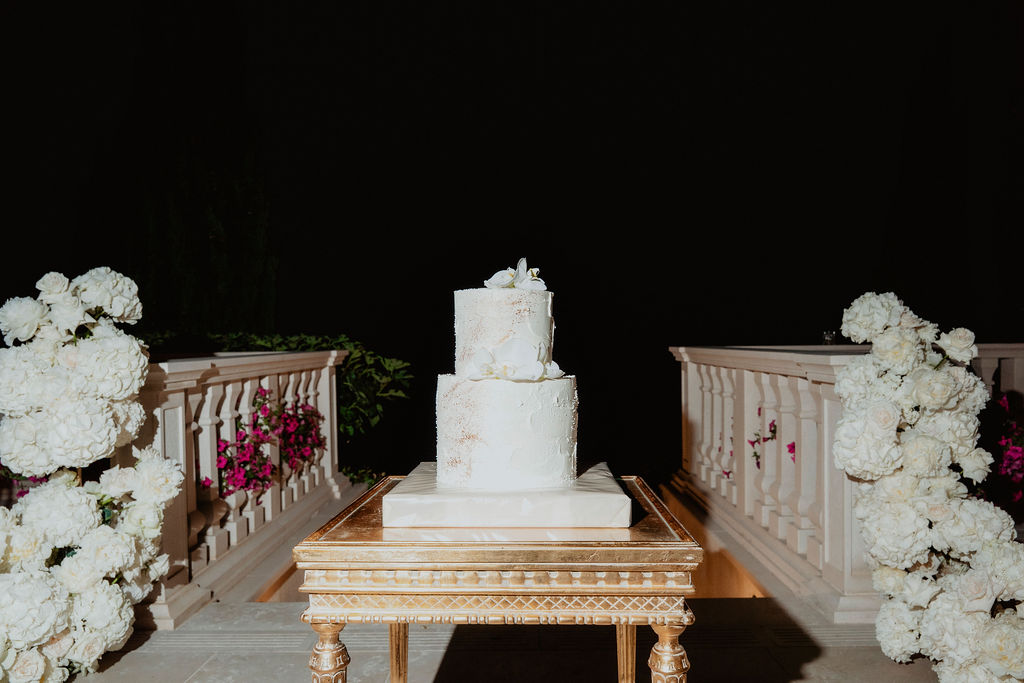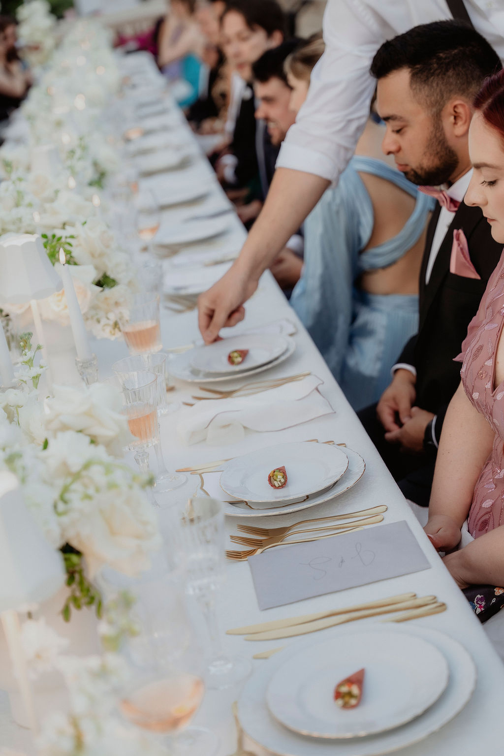 The next morning unfolded slowly. Guests and the couple relaxed by the pool, enjoying the sunshine and lighthearted chatter. The bride spent her afternoon in the villa’s suite, surrounded by laughter, calm energy, and anticipation. Meanwhile, the groom and his friends gathered at the bar, raising a glass of whiskey to the day ahead. As the afternoon faded, guests took their seats overlooking the Adriatic. The ceremony design mirrored the natural beauty around them — soft florals in creamy whites, organic textures, and a light sea breeze. Everything felt serene and timeless. After the ceremony, guests enjoyed a cocktail hour with canapés, signature drinks, and a cigar-rolling experience. It was a relaxed yet refined transition into the evening. Dinner followed on the terrace under the stars. The tablescape reflected elegant sophistication — linen textures, golden accents, and soft candlelight. Each dish highlighted local flavors, paired with the villa’s fine wines. Later, guests gathered for the wedding cake and an unforgettable party that lasted well into the night.