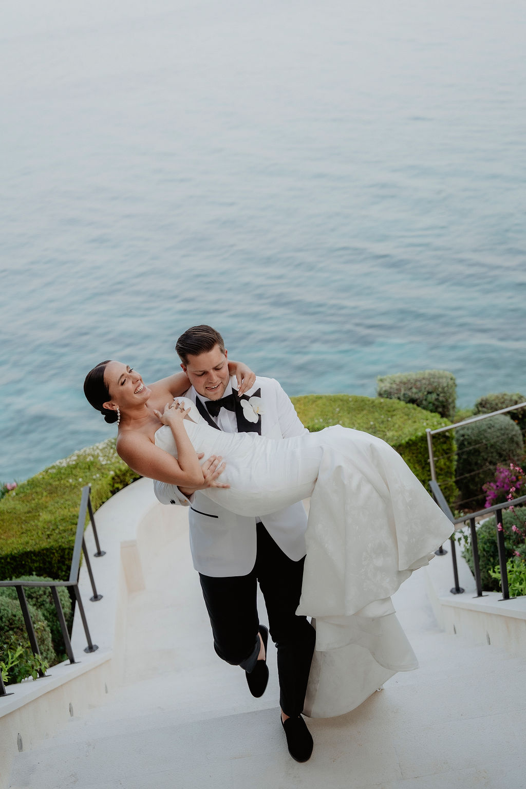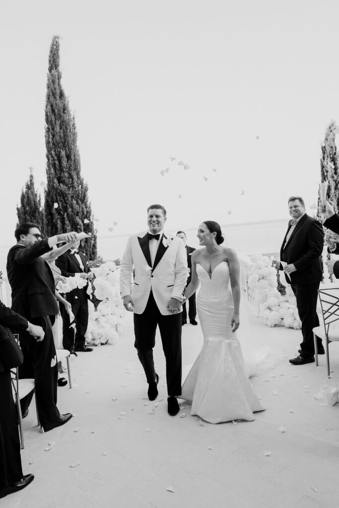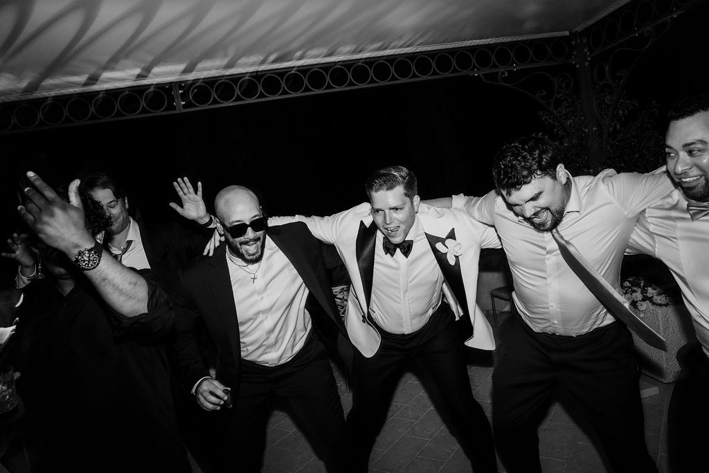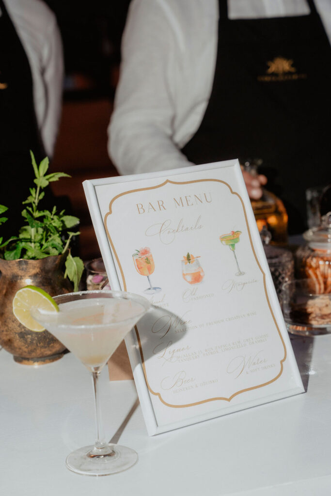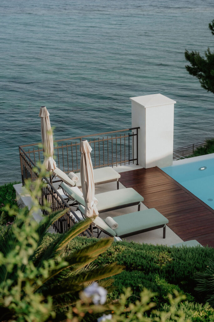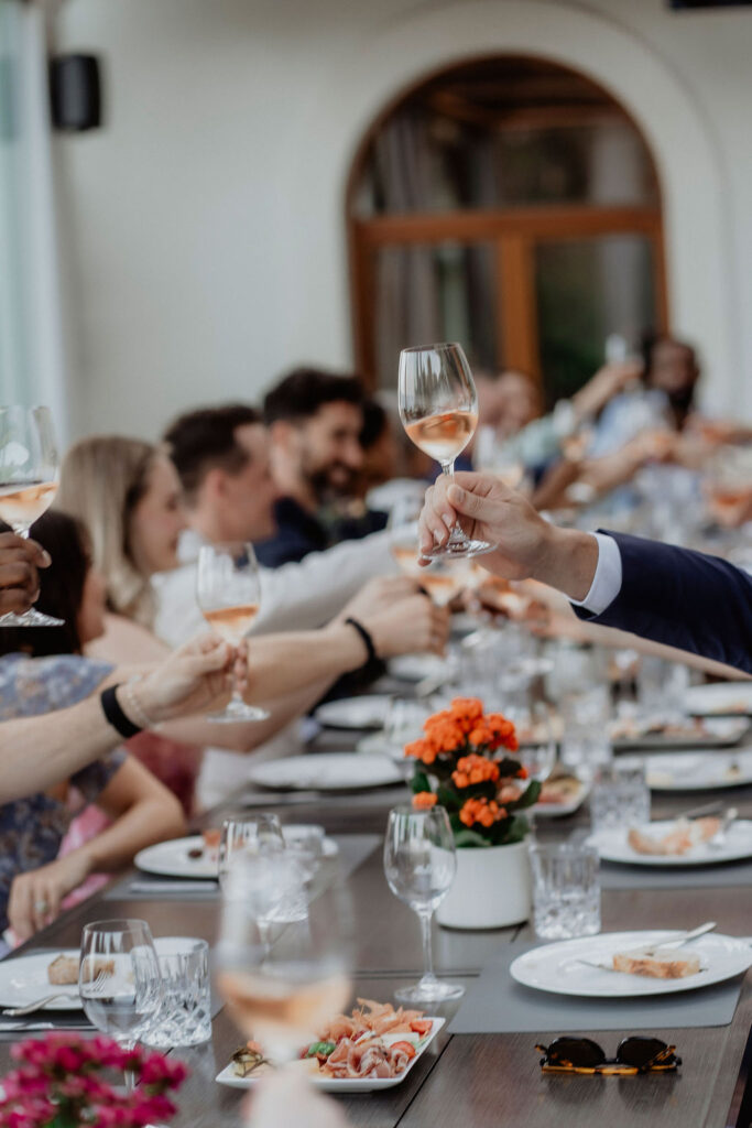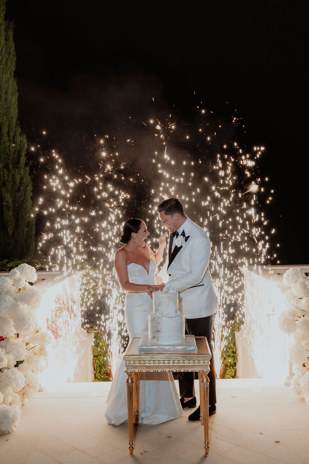 The next morning unfolded slowly. Guests and the couple relaxed by the pool, enjoying the sunshine and lighthearted chatter. The bride spent her afternoon in the villa’s suite, surrounded by laughter, calm energy, and anticipation. Meanwhile, the groom and his friends gathered at the bar, raising a glass of whiskey to the day ahead. As the afternoon faded, guests took their seats overlooking the Adriatic. The ceremony design mirrored the natural beauty around them — soft florals in creamy whites, organic textures, and a light sea breeze. Everything felt serene and timeless. After the ceremony, guests enjoyed a cocktail hour with canapés, signature drinks, and a cigar-rolling experience. It was a relaxed yet refined transition into the evening. Dinner followed on the terrace under the stars. The tablescape reflected elegant sophistication — linen textures, golden accents, and soft candlelight. Each dish highlighted local flavors, paired with the villa’s fine wines. Later, guests gathered for the wedding cake and an unforgettable party that lasted well into the night.