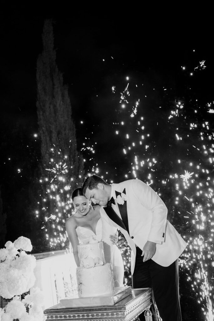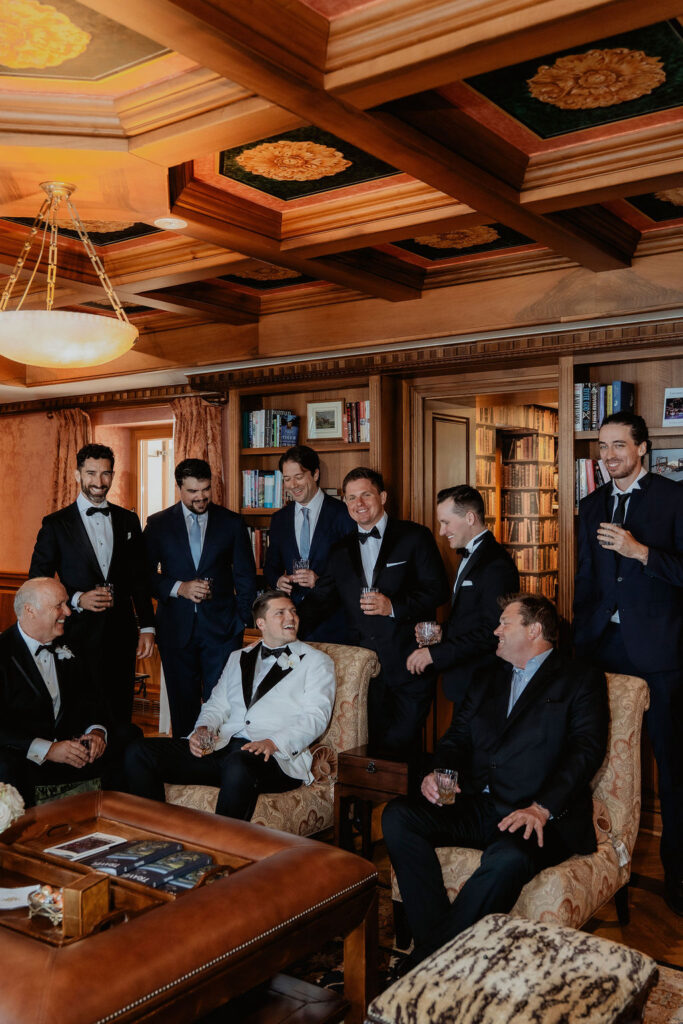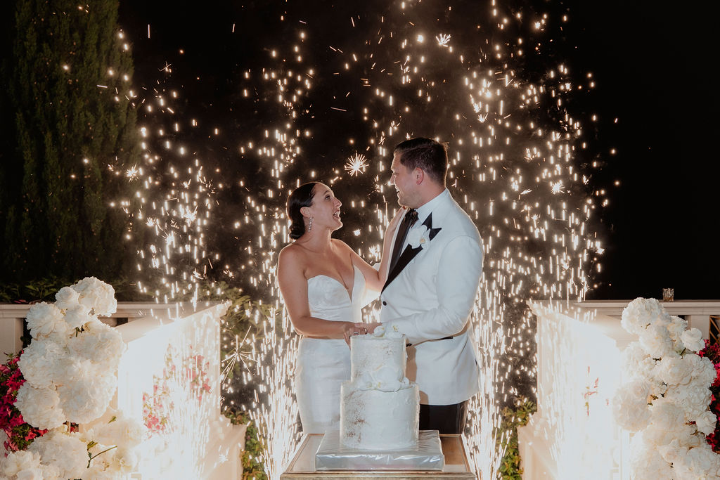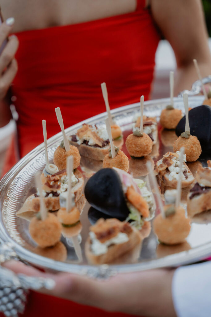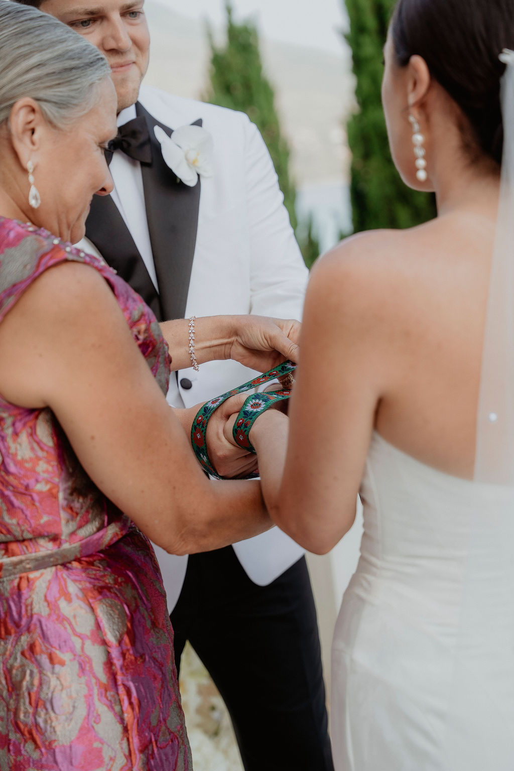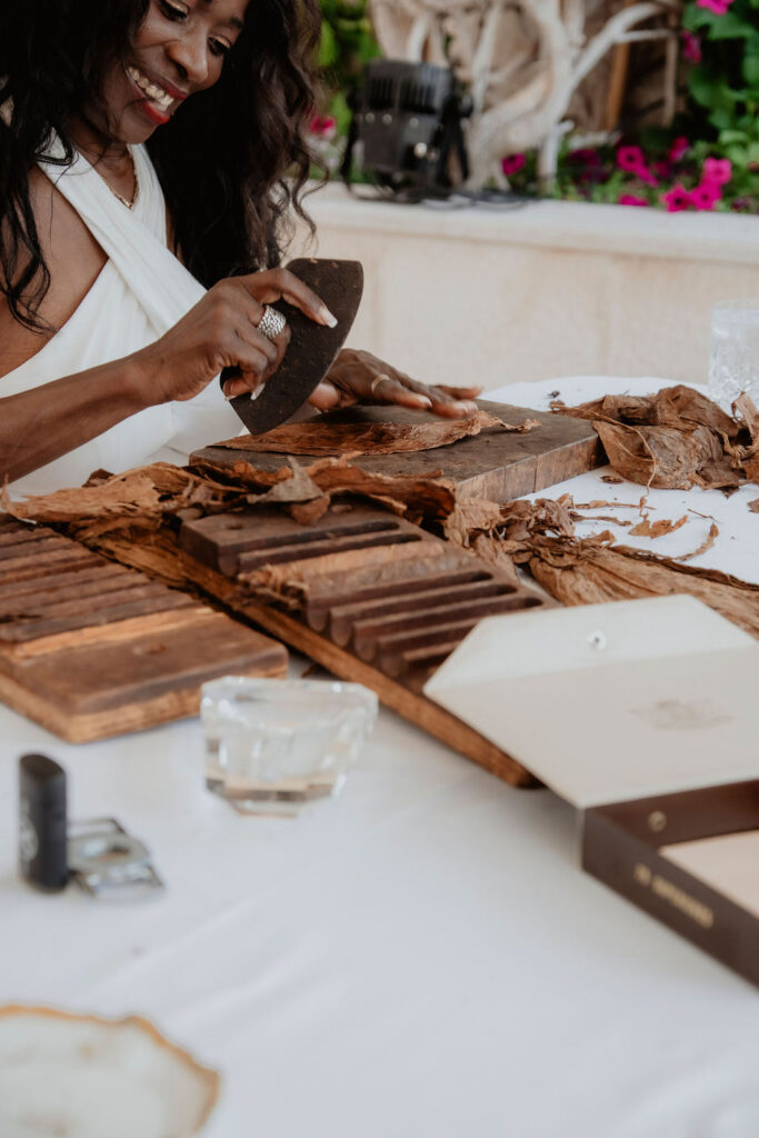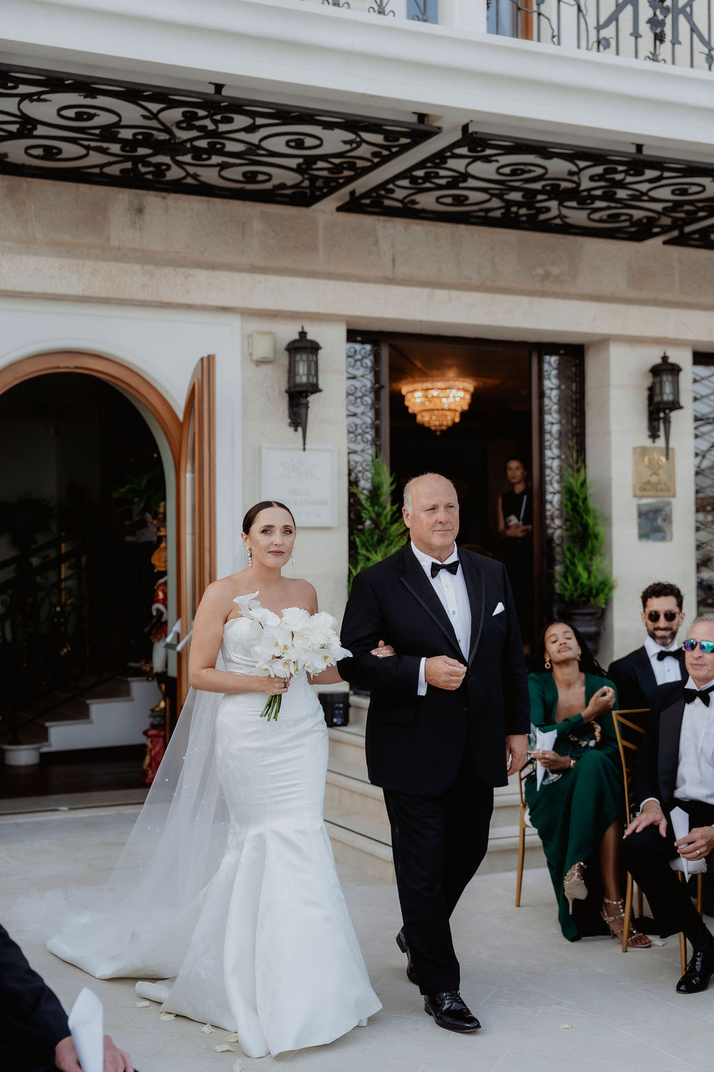 The next morning unfolded slowly. Guests and the couple relaxed by the pool, enjoying the sunshine and lighthearted chatter. The bride spent her afternoon in the villa’s suite, surrounded by laughter, calm energy, and anticipation. Meanwhile, the groom and his friends gathered at the bar, raising a glass of whiskey to the day ahead. As the afternoon faded, guests took their seats overlooking the Adriatic. The ceremony design mirrored the natural beauty around them — soft florals in creamy whites, organic textures, and a light sea breeze. Everything felt serene and timeless. After the ceremony, guests enjoyed a cocktail hour with canapés, signature drinks, and a cigar-rolling experience. It was a relaxed yet refined transition into the evening. Dinner followed on the terrace under the stars. The tablescape reflected elegant sophistication — linen textures, golden accents, and soft candlelight. Each dish highlighted local flavors, paired with the villa’s fine wines. Later, guests gathered for the wedding cake and an unforgettable party that lasted well into the night.