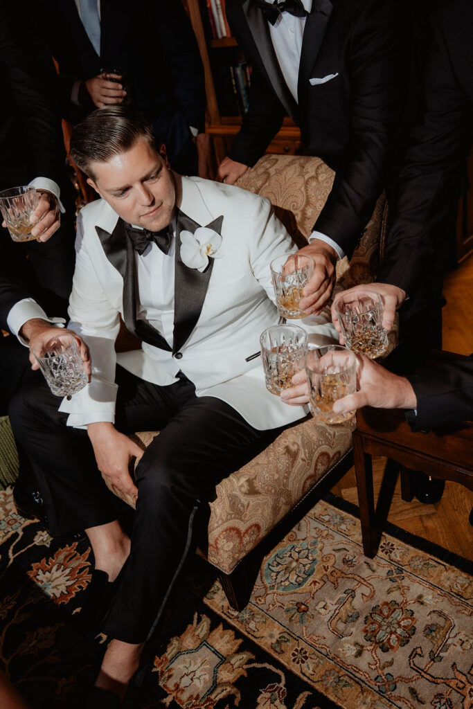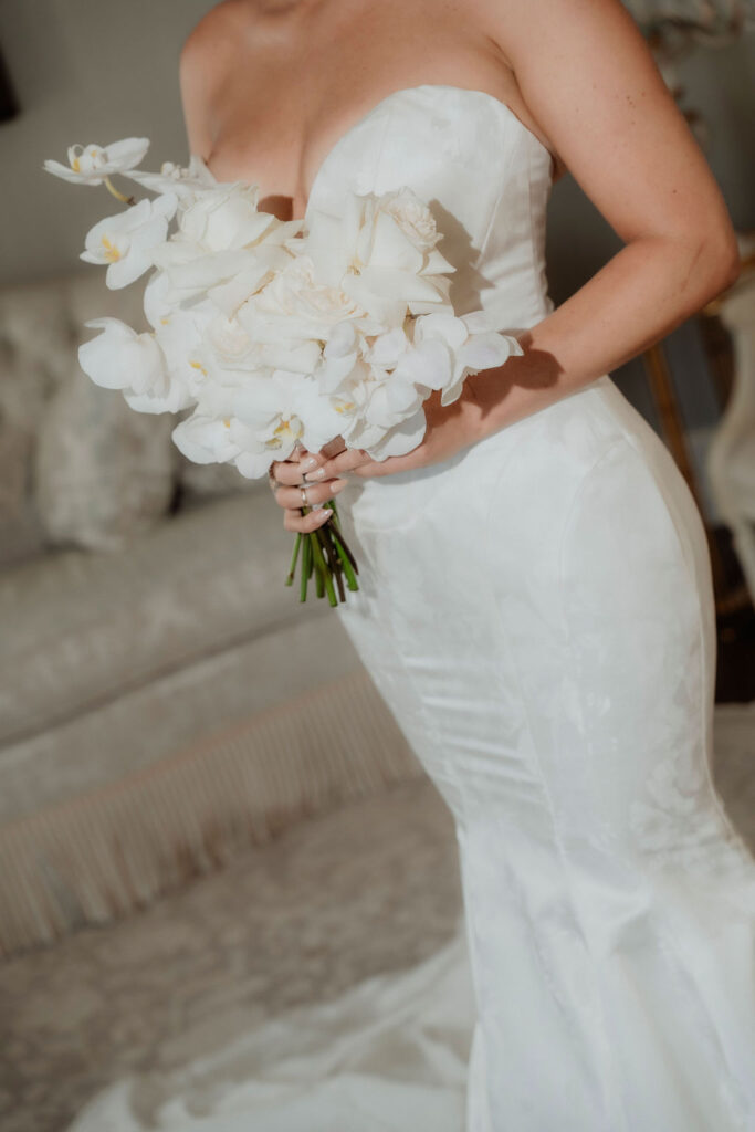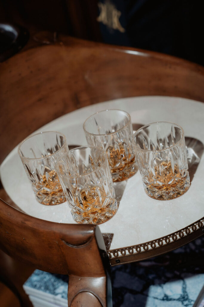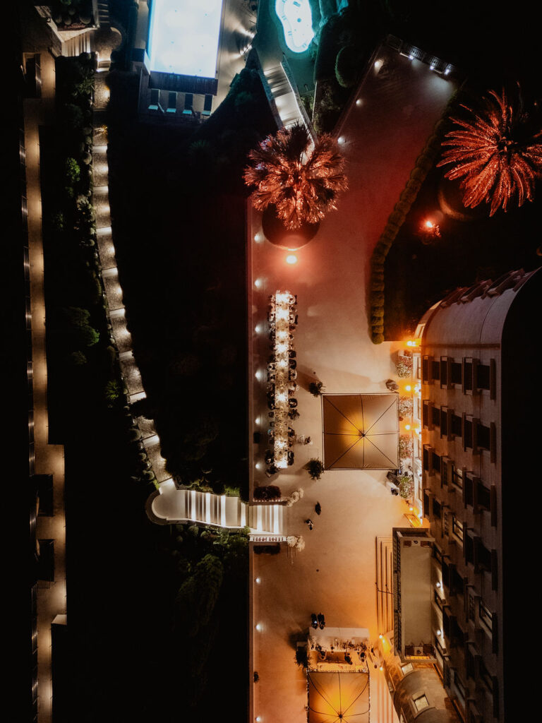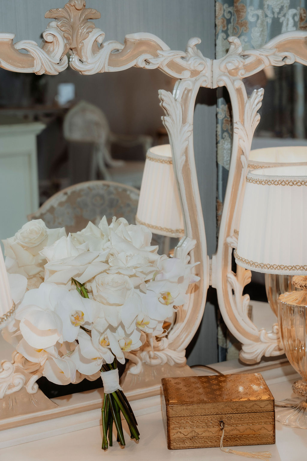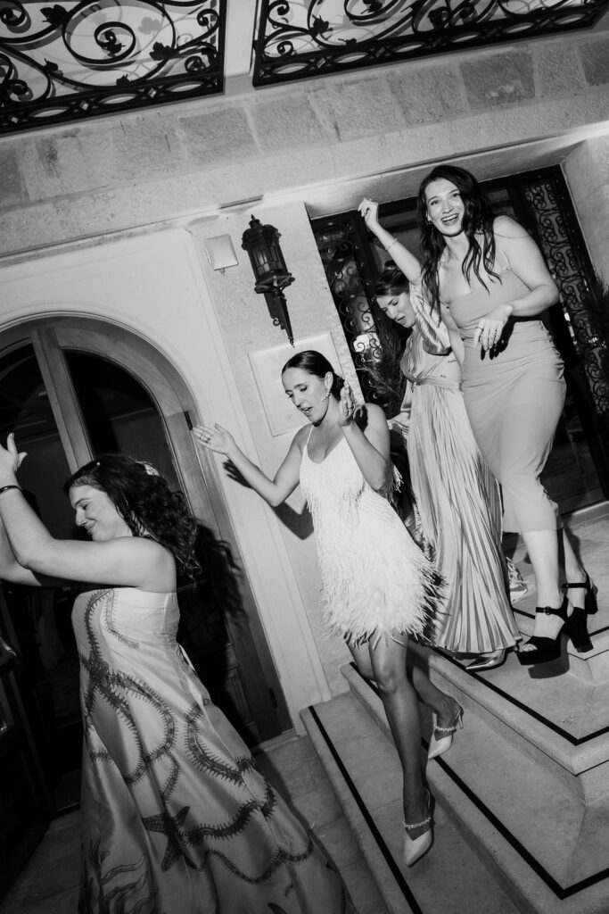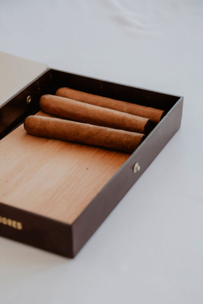 The next morning unfolded slowly. Guests and the couple relaxed by the pool, enjoying the sunshine and lighthearted chatter. The bride spent her afternoon in the villa’s suite, surrounded by laughter, calm energy, and anticipation. Meanwhile, the groom and his friends gathered at the bar, raising a glass of whiskey to the day ahead. As the afternoon faded, guests took their seats overlooking the Adriatic. The ceremony design mirrored the natural beauty around them — soft florals in creamy whites, organic textures, and a light sea breeze. Everything felt serene and timeless. After the ceremony, guests enjoyed a cocktail hour with canapés, signature drinks, and a cigar-rolling experience. It was a relaxed yet refined transition into the evening. Dinner followed on the terrace under the stars. The tablescape reflected elegant sophistication — linen textures, golden accents, and soft candlelight. Each dish highlighted local flavors, paired with the villa’s fine wines. Later, guests gathered for the wedding cake and an unforgettable party that lasted well into the night.
