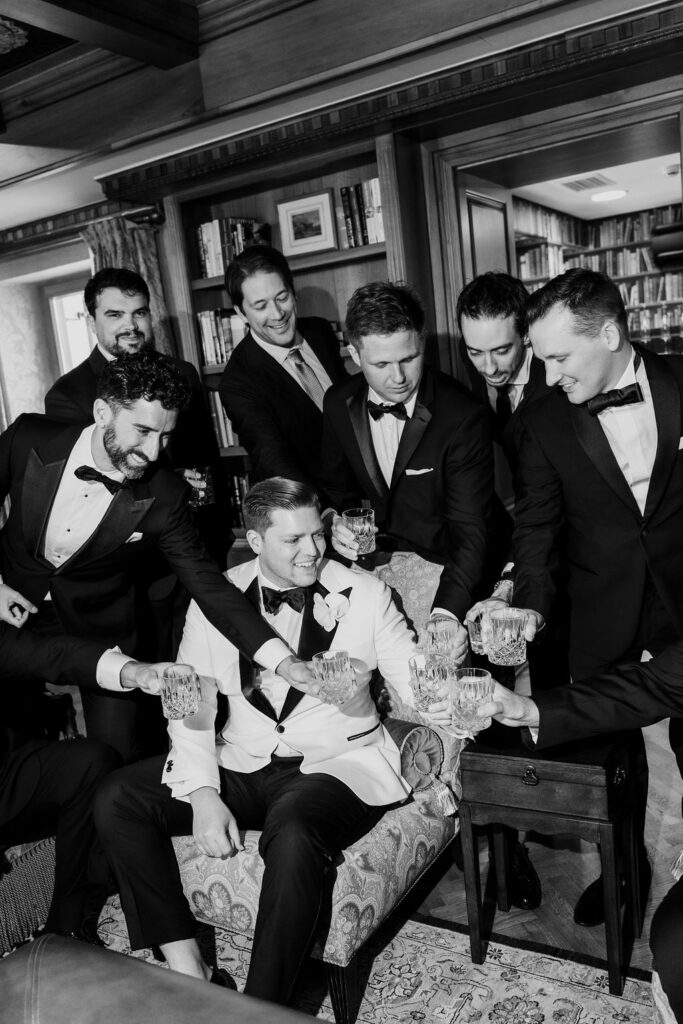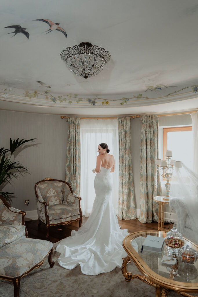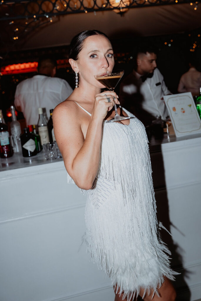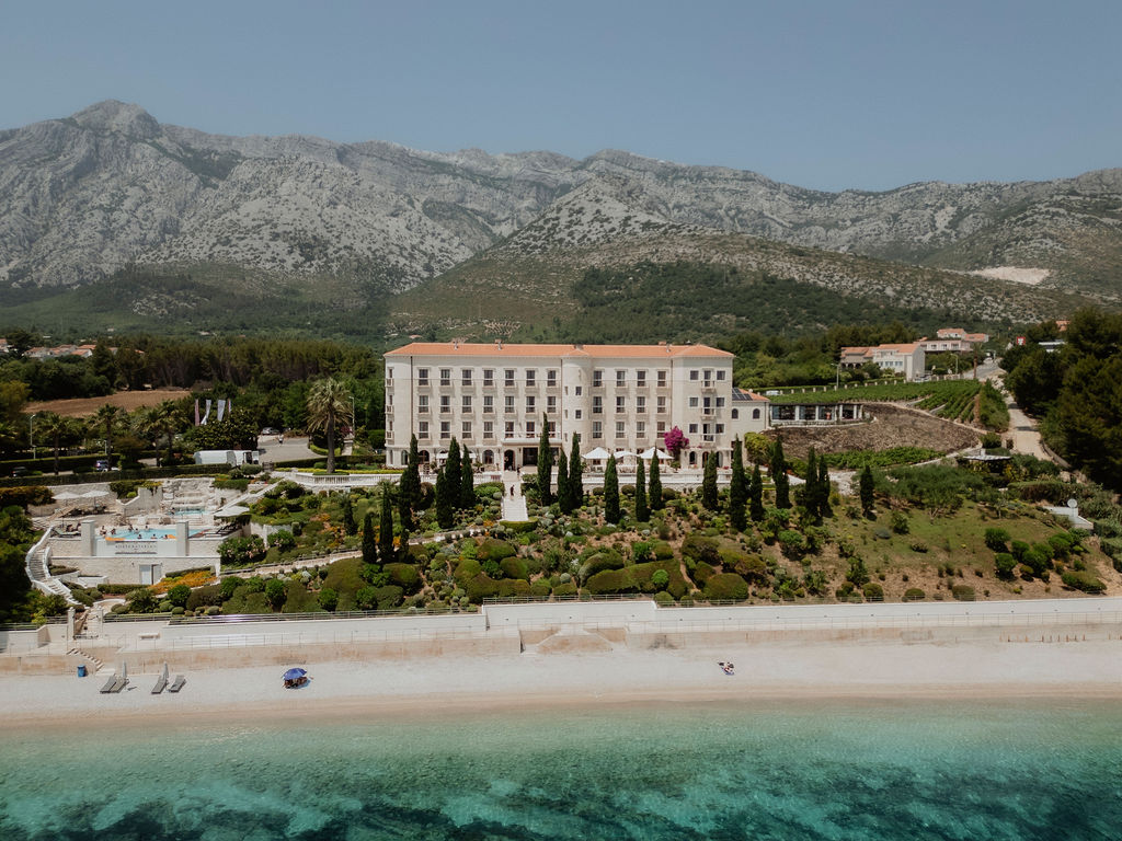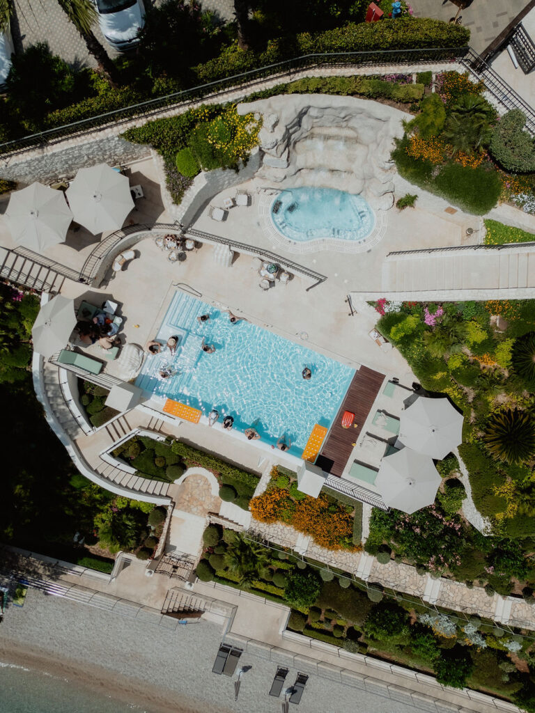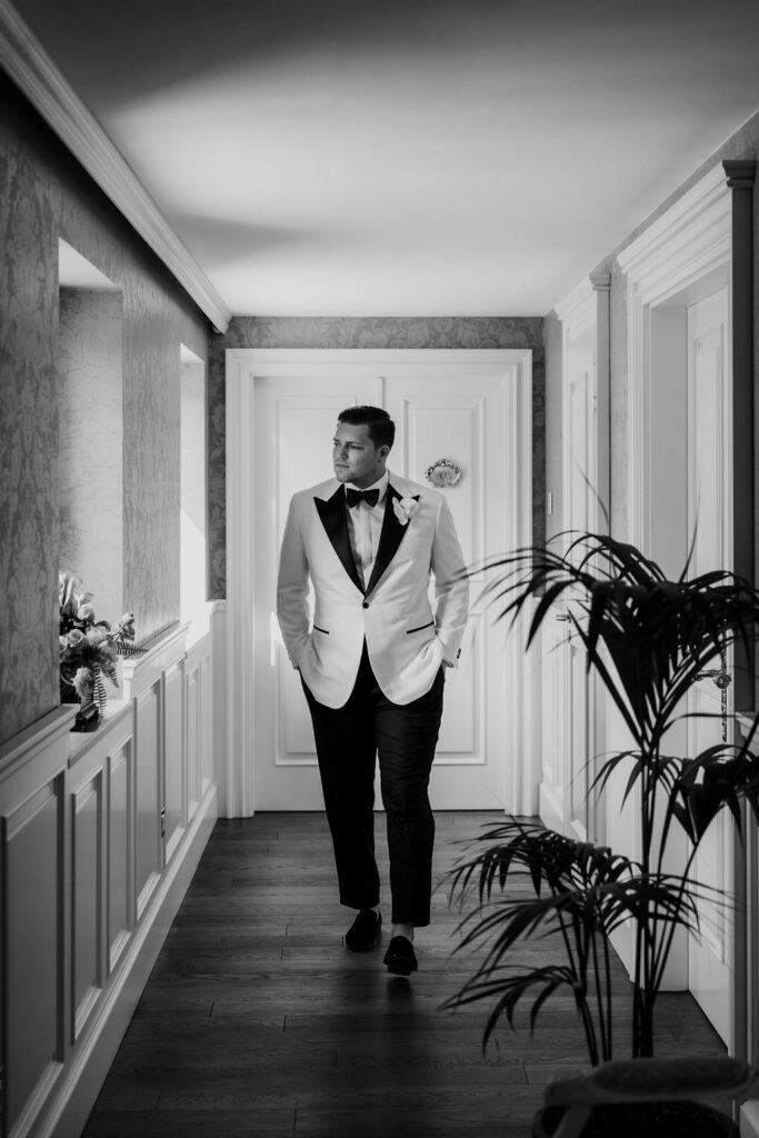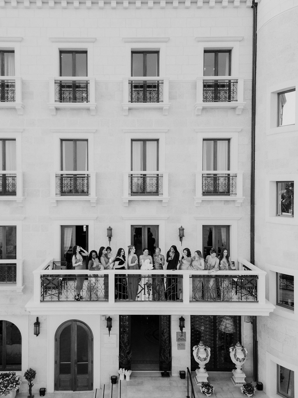 The next morning unfolded slowly. Guests and the couple relaxed by the pool, enjoying the sunshine and lighthearted chatter. The bride spent her afternoon in the villa’s suite, surrounded by laughter, calm energy, and anticipation. Meanwhile, the groom and his friends gathered at the bar, raising a glass of whiskey to the day ahead. As the afternoon faded, guests took their seats overlooking the Adriatic. The ceremony design mirrored the natural beauty around them — soft florals in creamy whites, organic textures, and a light sea breeze. Everything felt serene and timeless. After the ceremony, guests enjoyed a cocktail hour with canapés, signature drinks, and a cigar-rolling experience. It was a relaxed yet refined transition into the evening. Dinner followed on the terrace under the stars. The tablescape reflected elegant sophistication — linen textures, golden accents, and soft candlelight. Each dish highlighted local flavors, paired with the villa’s fine wines. Later, guests gathered for the wedding cake and an unforgettable party that lasted well into the night.