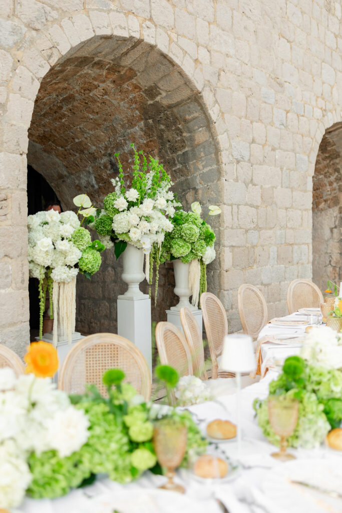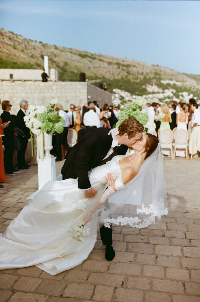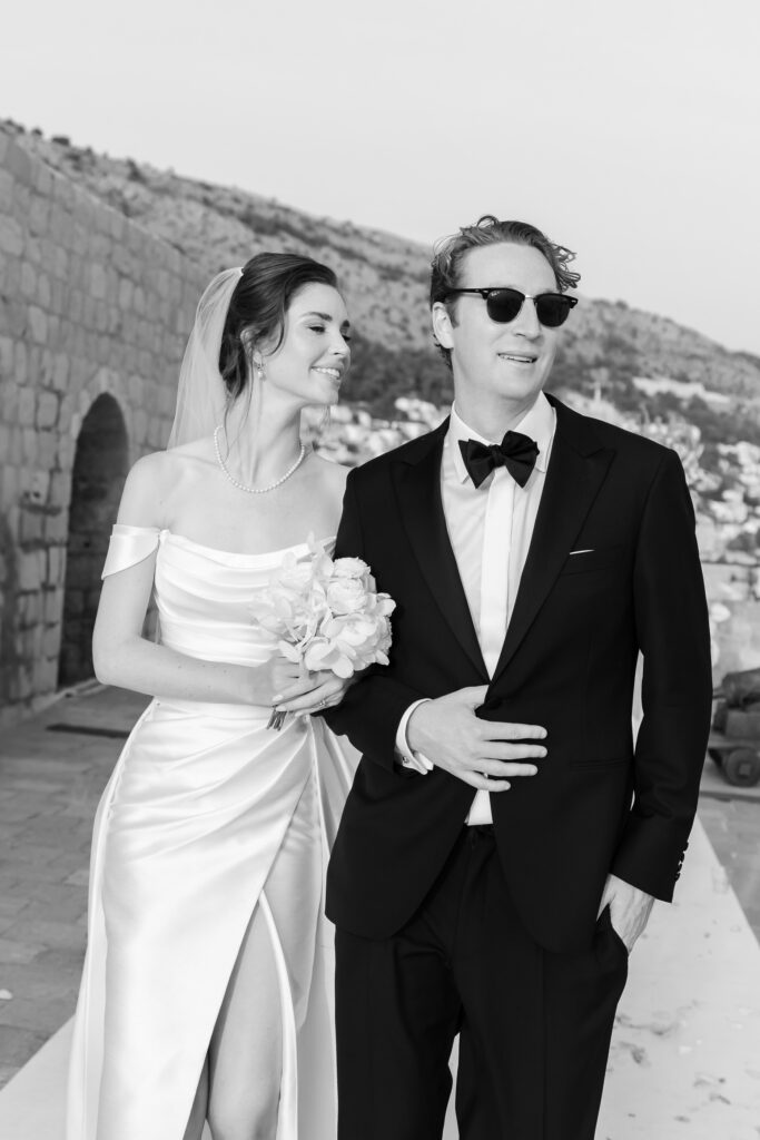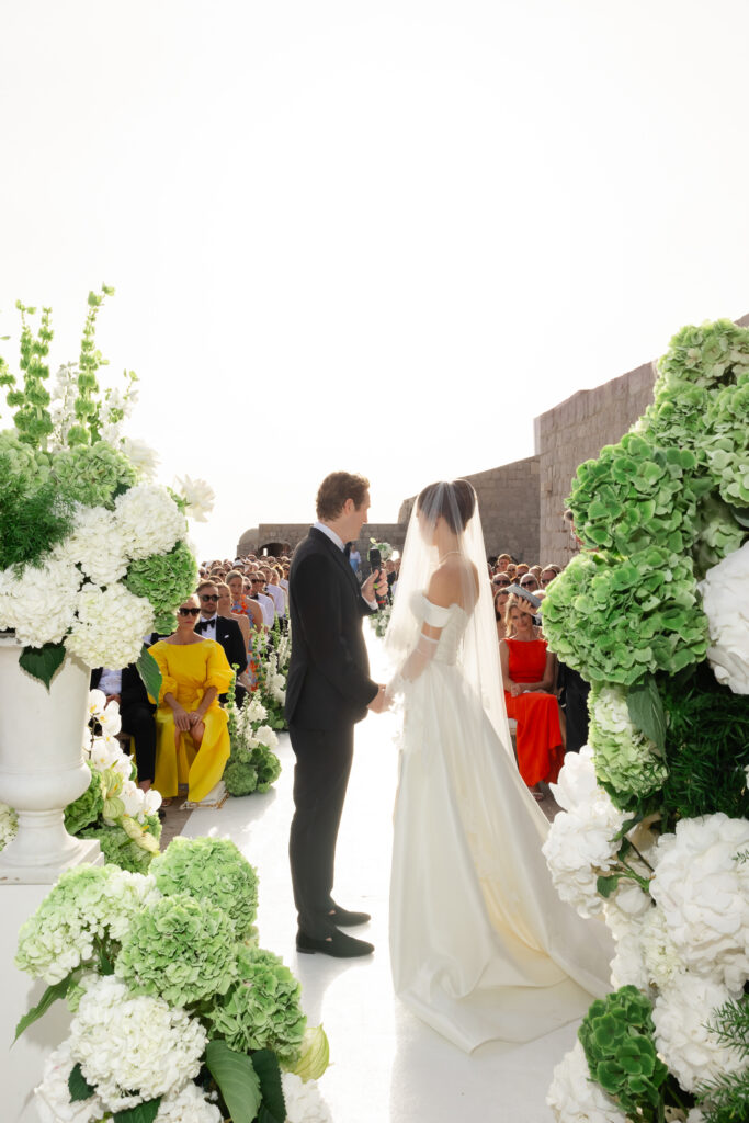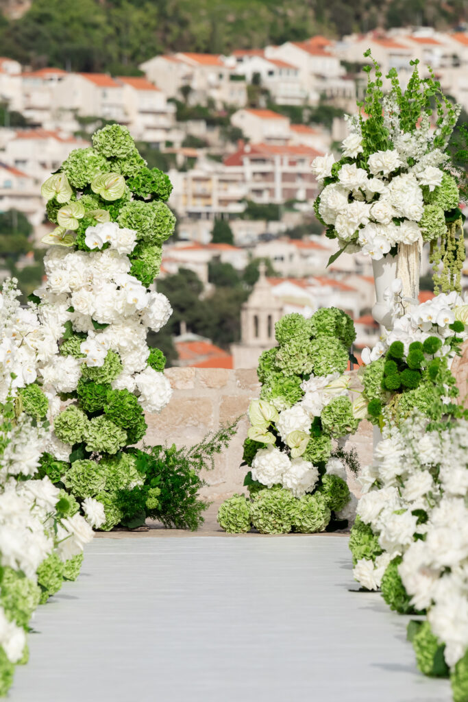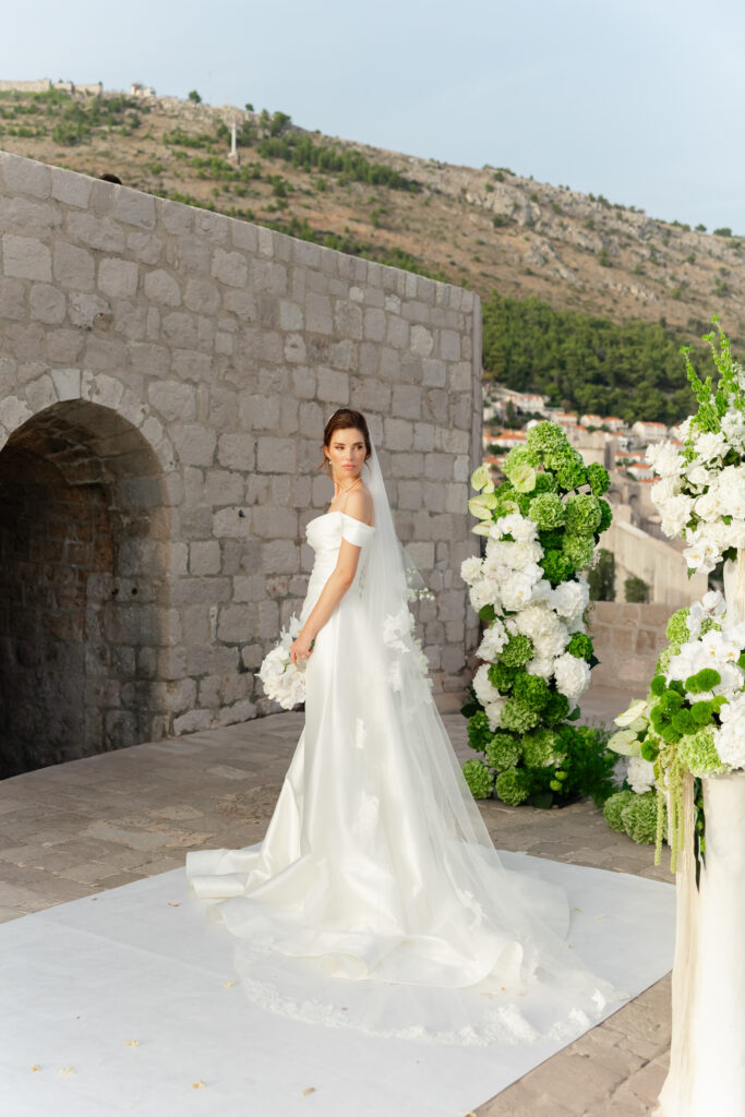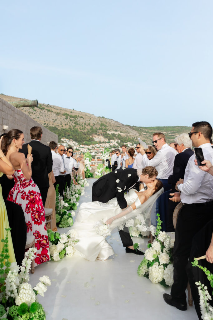 The wedding day itself was pure magic. Held within the stone embrace of Fort Lawrence Dubrovnik, the ceremony offered panoramic views of the Adriatic and Old Town rooftops. Lush white and green florals adorned the fortress, punctuated with vibrant touches of orange that mirrored the terracotta cityscape below.