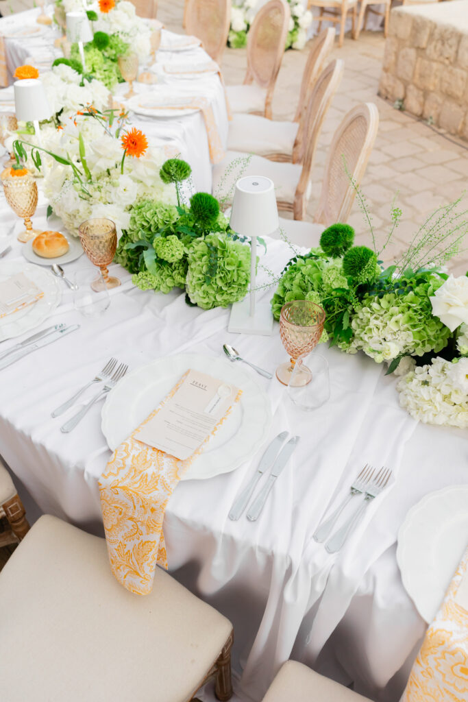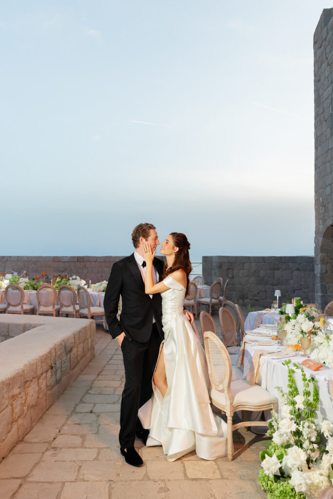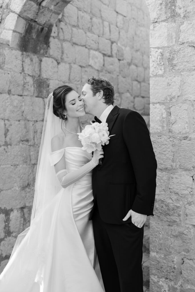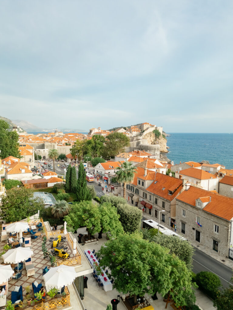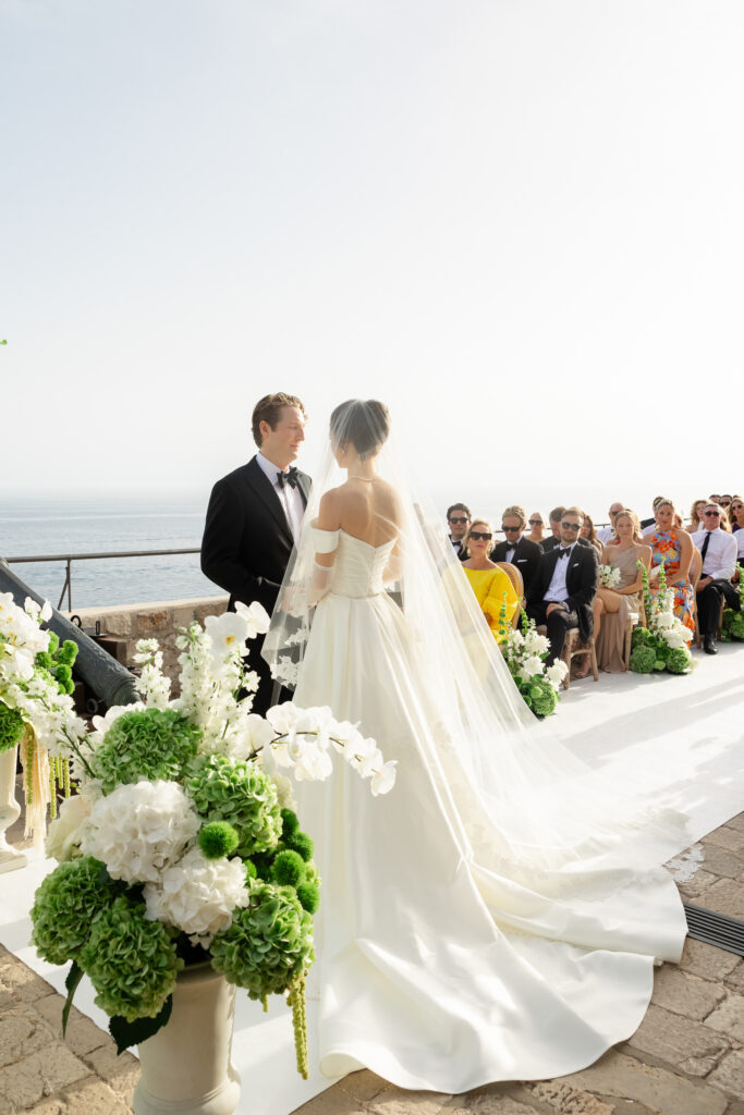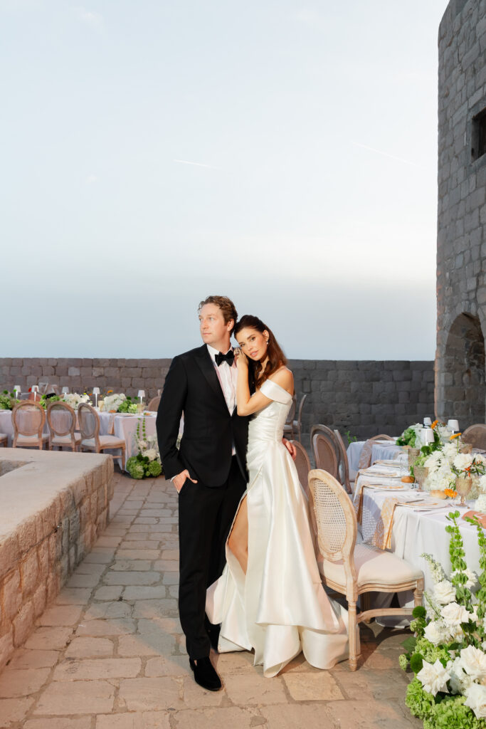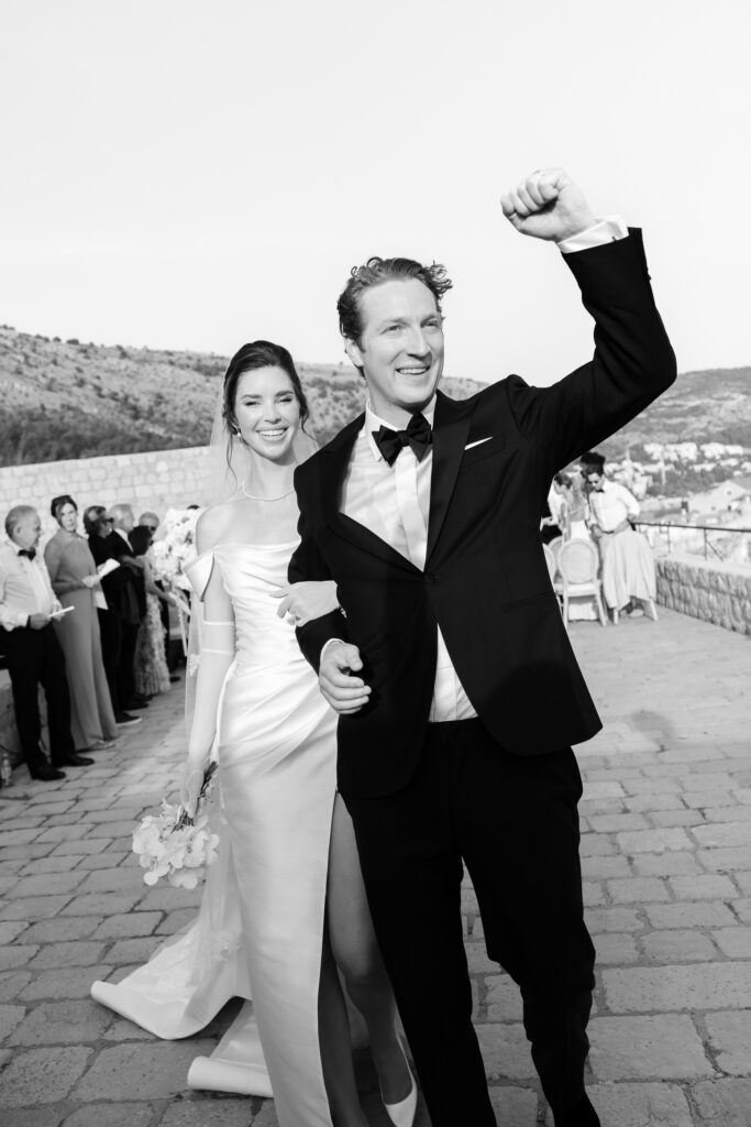 The wedding day itself was pure magic. Held within the stone embrace of Fort Lawrence Dubrovnik, the ceremony offered panoramic views of the Adriatic and Old Town rooftops. Lush white and green florals adorned the fortress, punctuated with vibrant touches of orange that mirrored the terracotta cityscape below.
