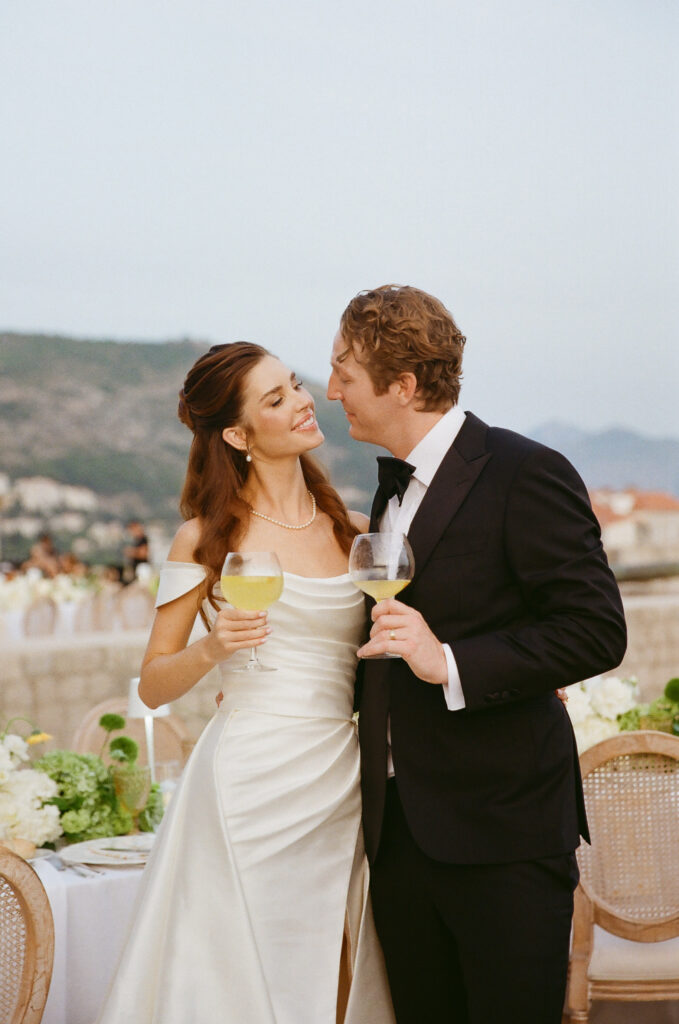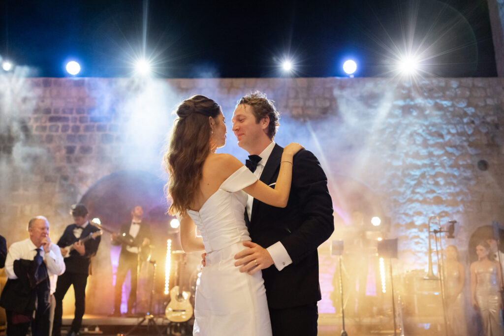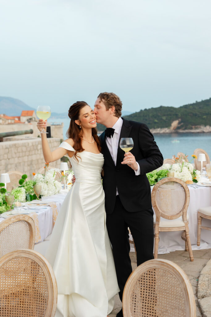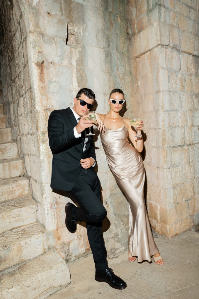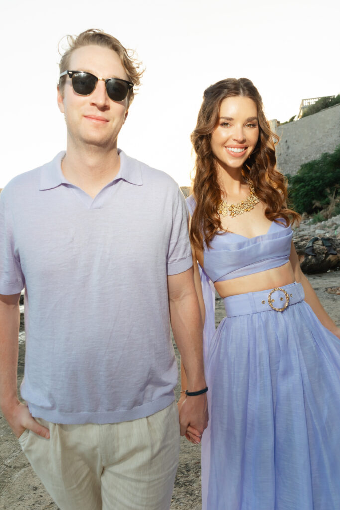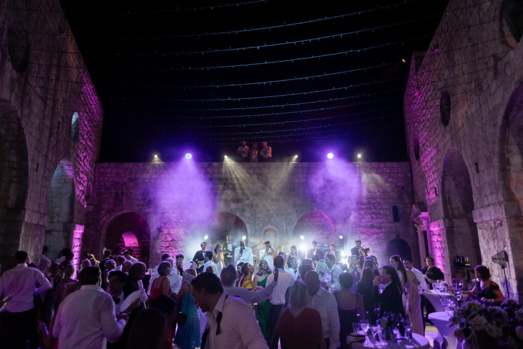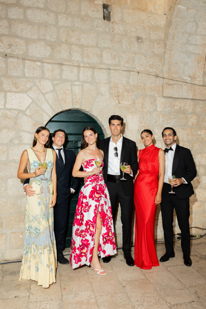 The next evening, an all-white welcome party at Banje Beach set a fun, elegant tone. The couple arrived in coordinated lavender attire, setting the tone for a night of stylish celebration. Meanwhile, the evening danced with music, custom cocktails, and laughter under the stars, all against the backdrop of the shimmering sea and the fortress high above.
