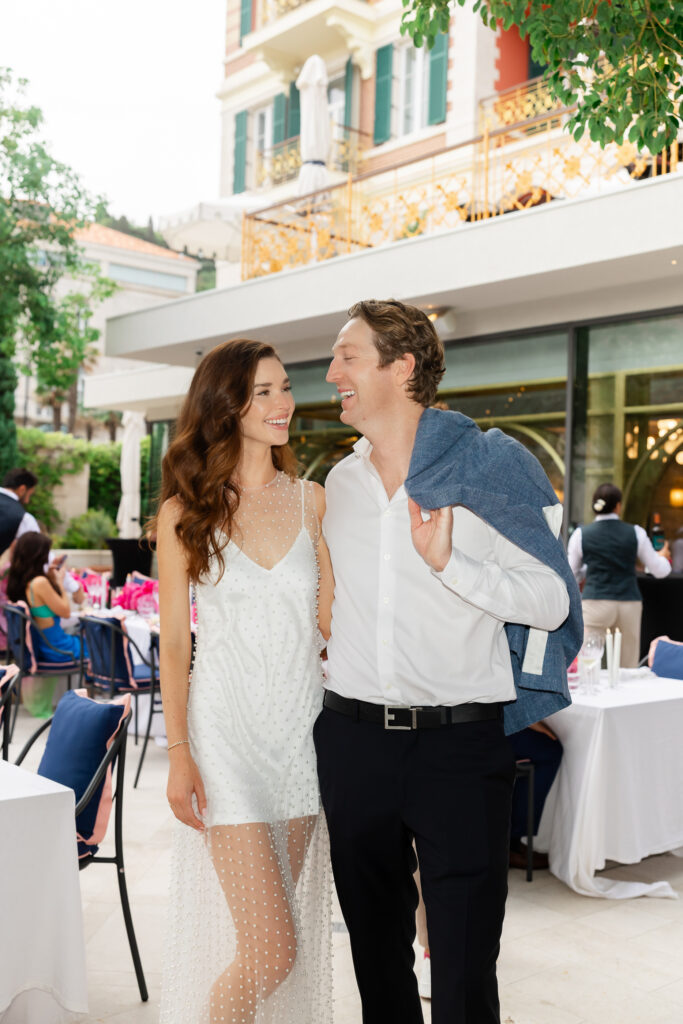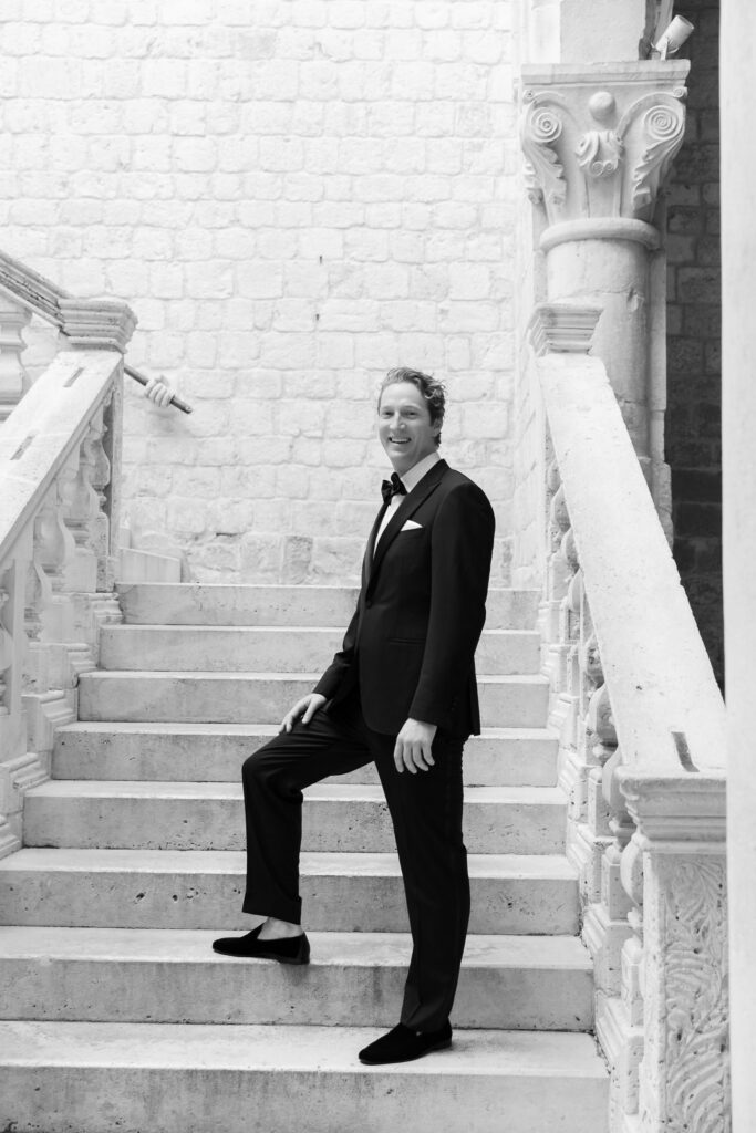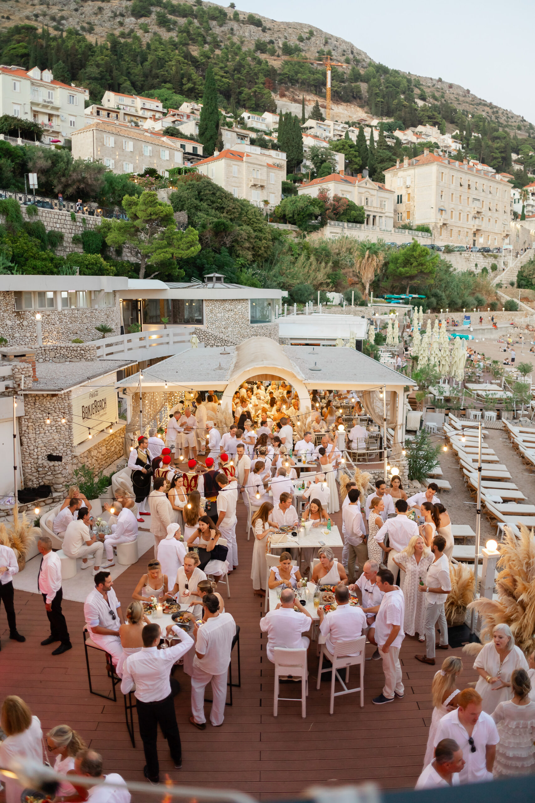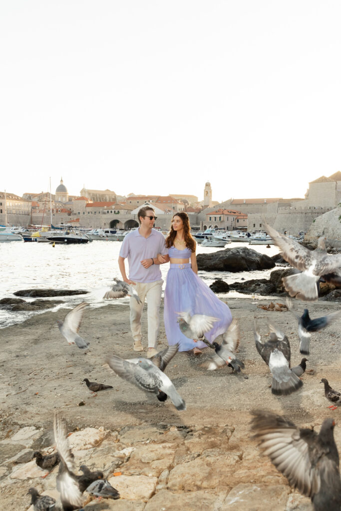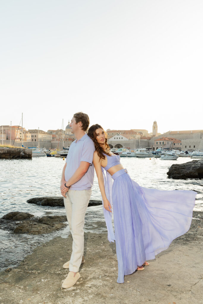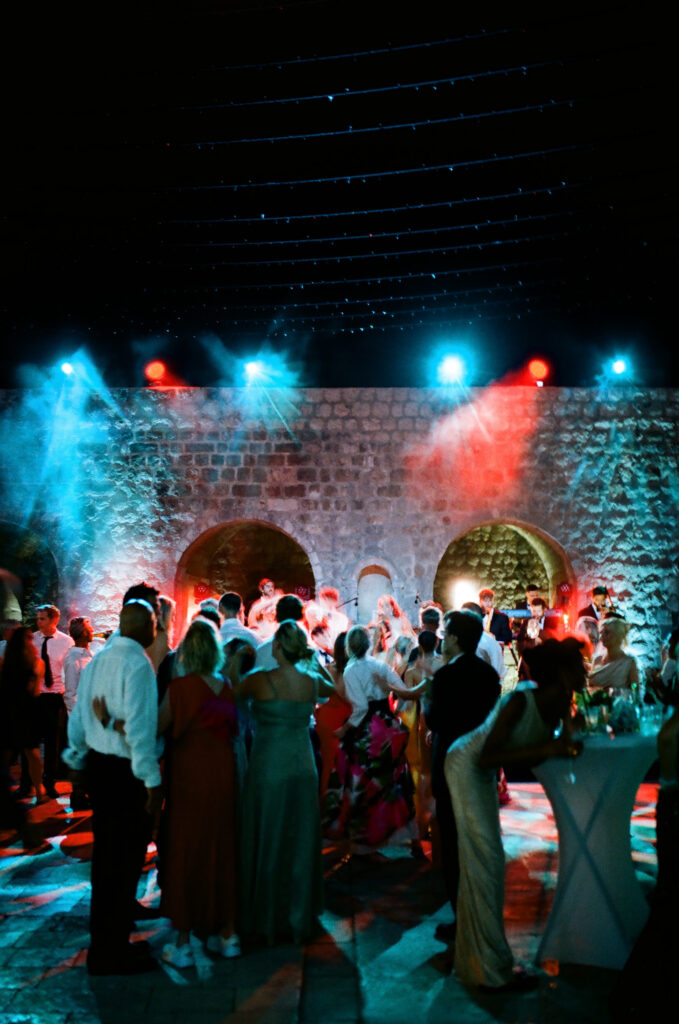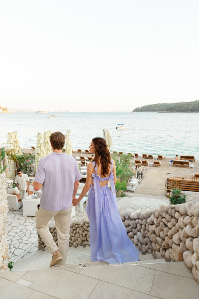 The next evening, an all-white welcome party at Banje Beach set a fun, elegant tone. The couple arrived in coordinated lavender attire, setting the tone for a night of stylish celebration. Meanwhile, the evening danced with music, custom cocktails, and laughter under the stars, all against the backdrop of the shimmering sea and the fortress high above.