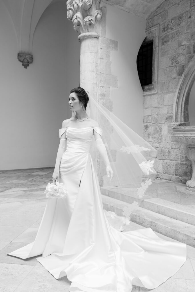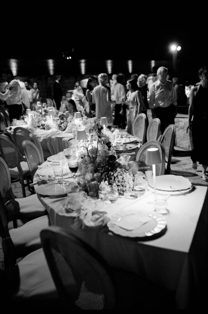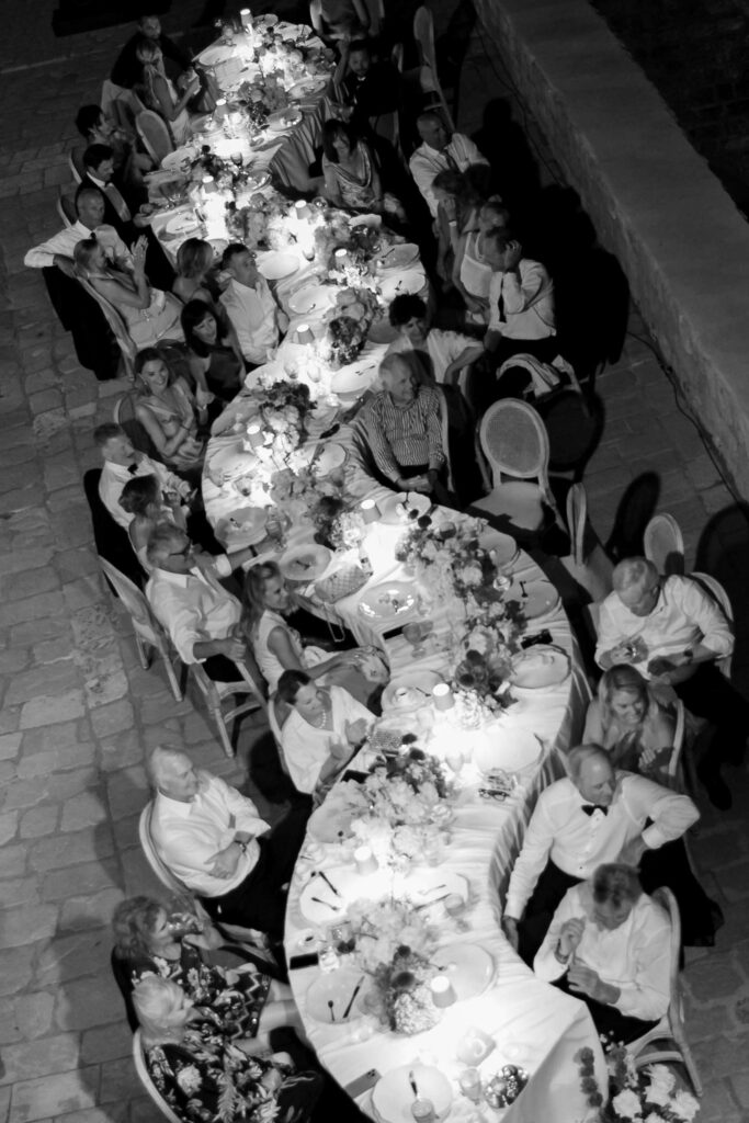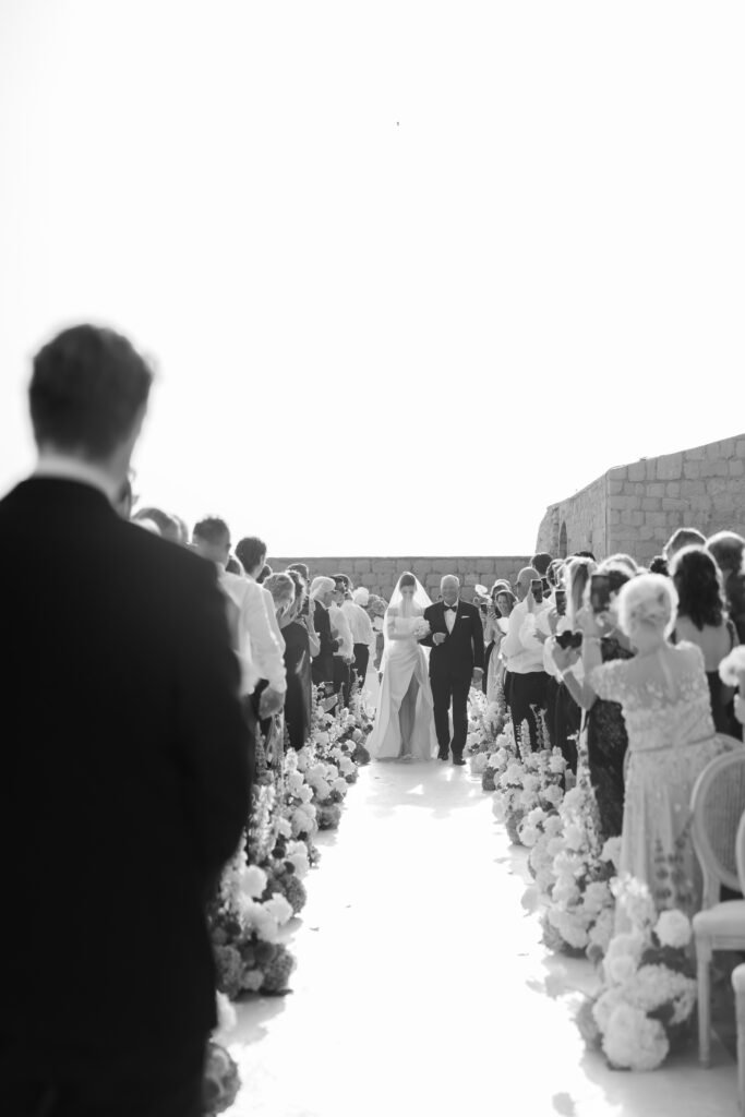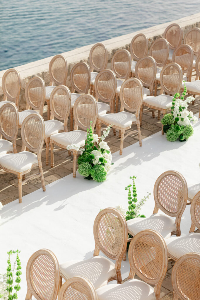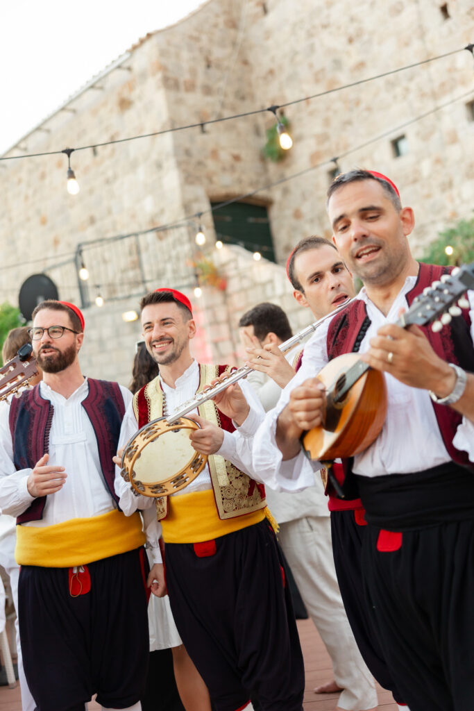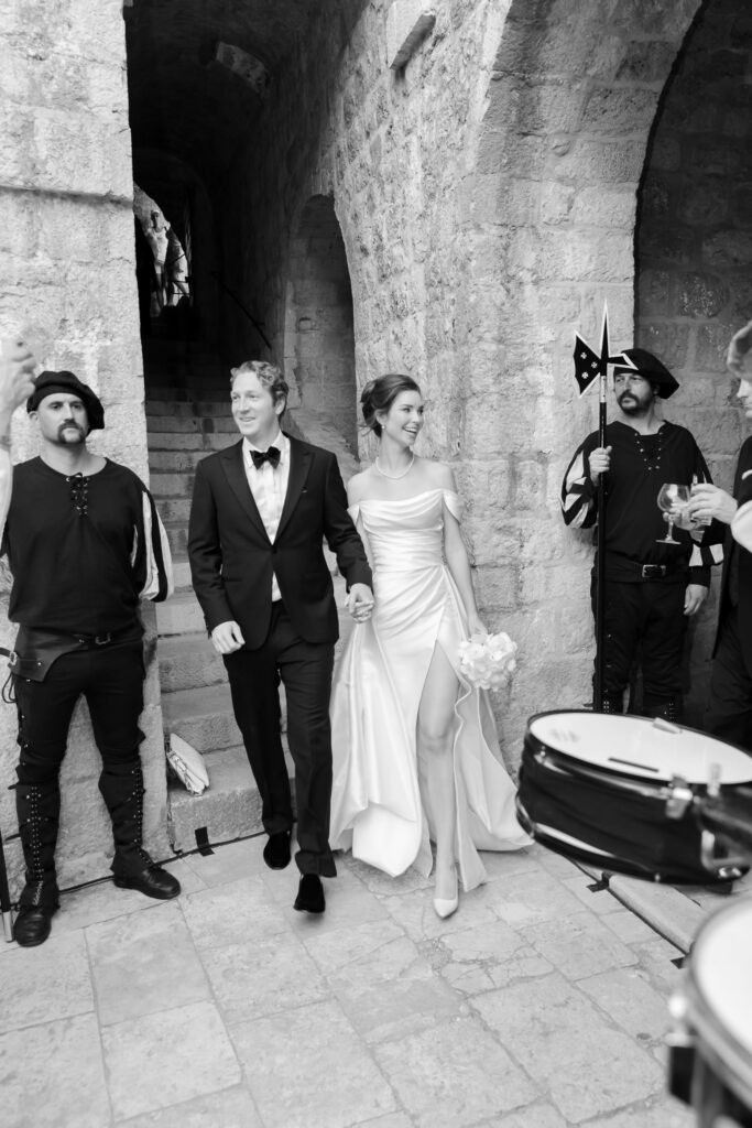 In addition, guests found their seats via vintage bells inscribed with names—a nod to tradition, and a whimsical touch. As Morgan and Robbie made their entrance, the bells rang out in celebration. Simultaneously, traditional Dubrovnik guards and drummers signaled their arrival, blending history with festivity in a regal fanfare.