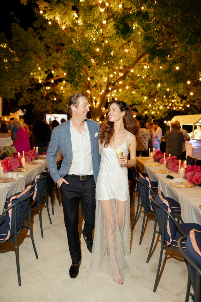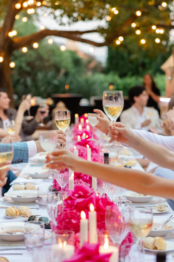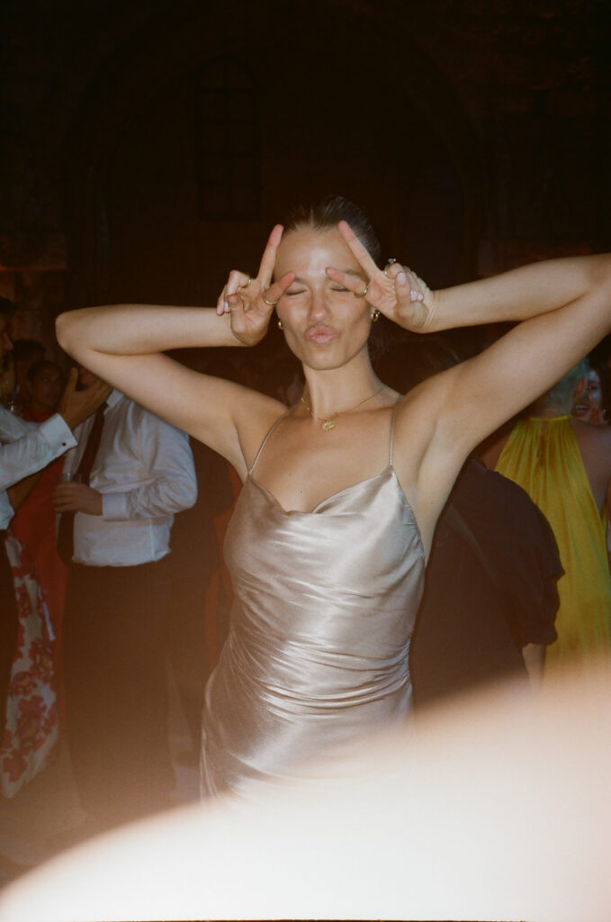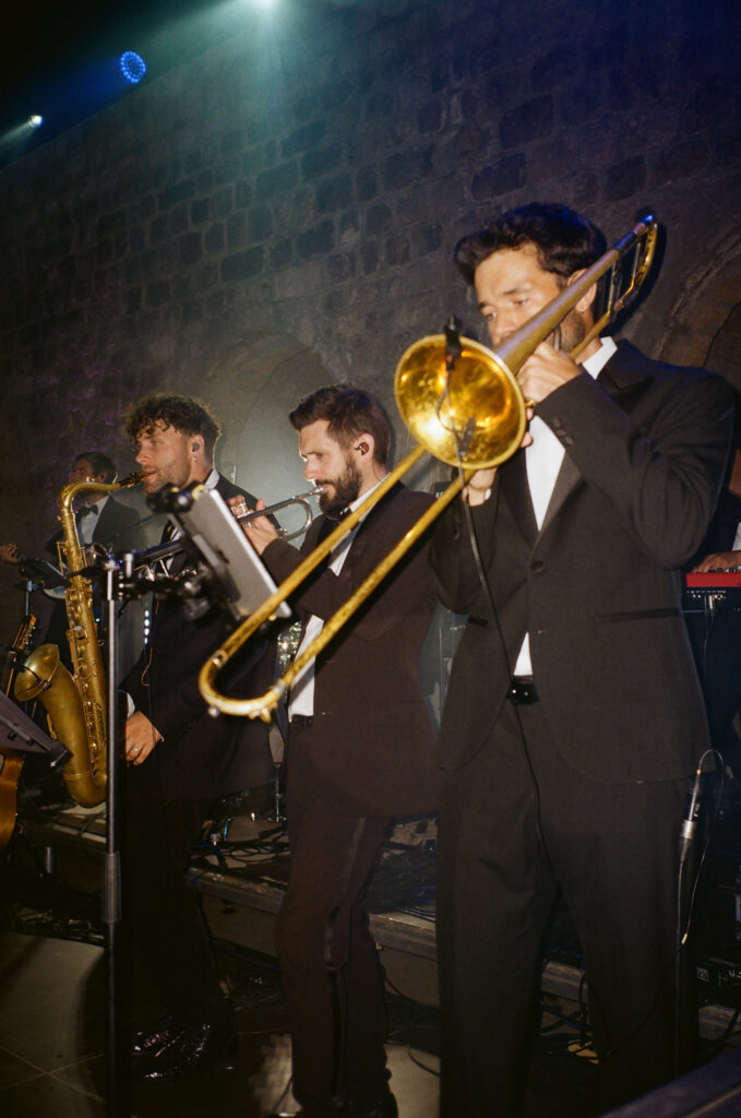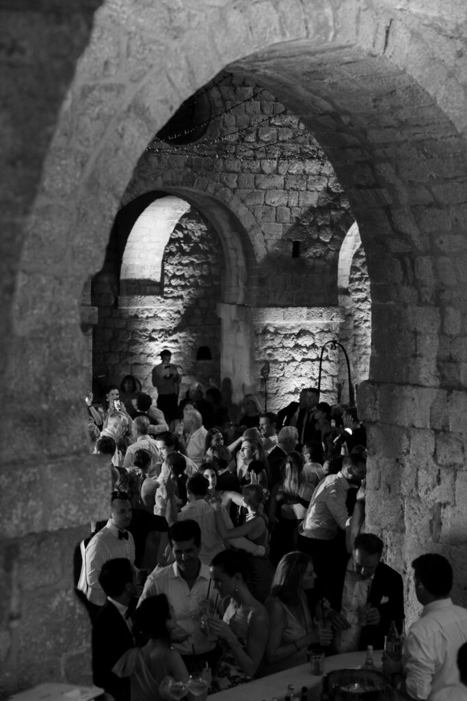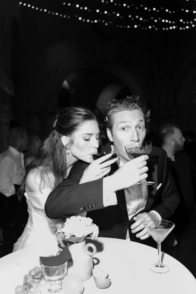 As night fell, the celebration moved into the vaulted chambers of the fortress. A glittering espresso martini tower welcomed guests, while a French band brought the dance floor to life. Overhead, a projection of classic movie dance scenes spun dreams into motion—cinematic, soulful, and unforgettable.