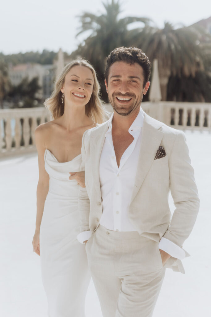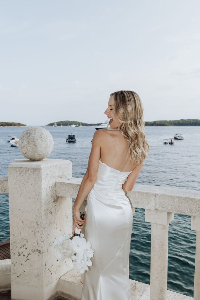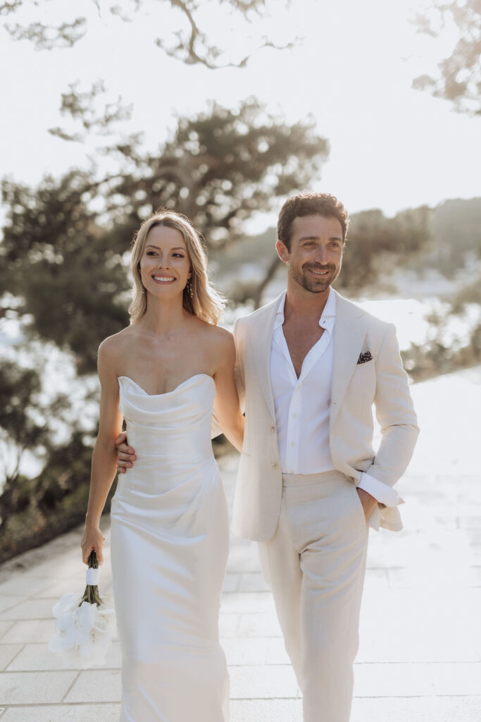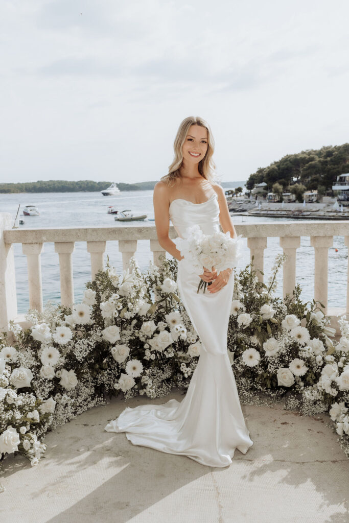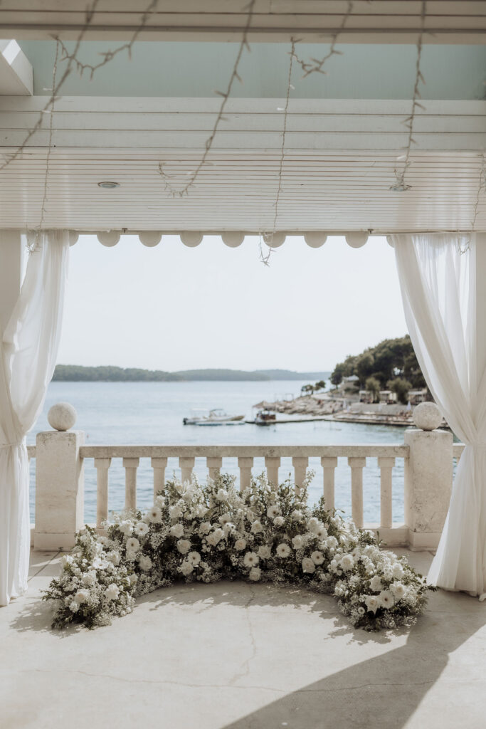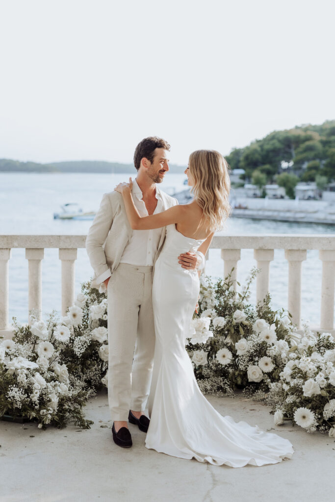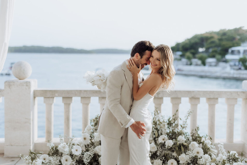 The next day, Susan and Aaron exchanged heartfelt vows at the magnificent Beach Club Hvar. Nestled along the Adriatic coastline, this venue provided a breathtaking setting for their ceremony. A floral arch framed the couple as they pledged their love, with the sparkling sea and gentle breeze adding to the romantic atmosphere.