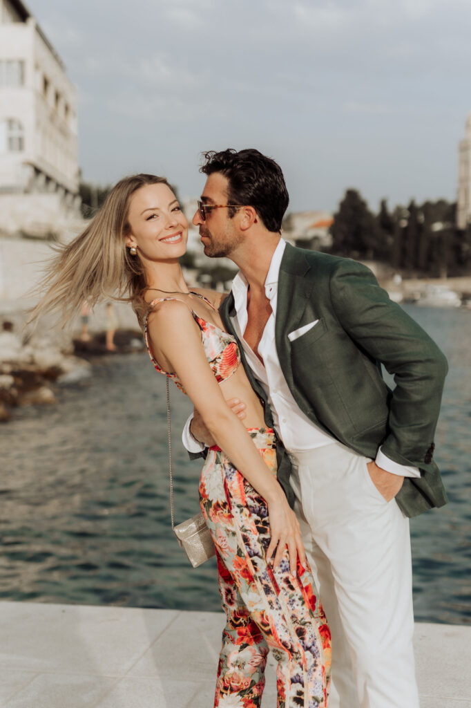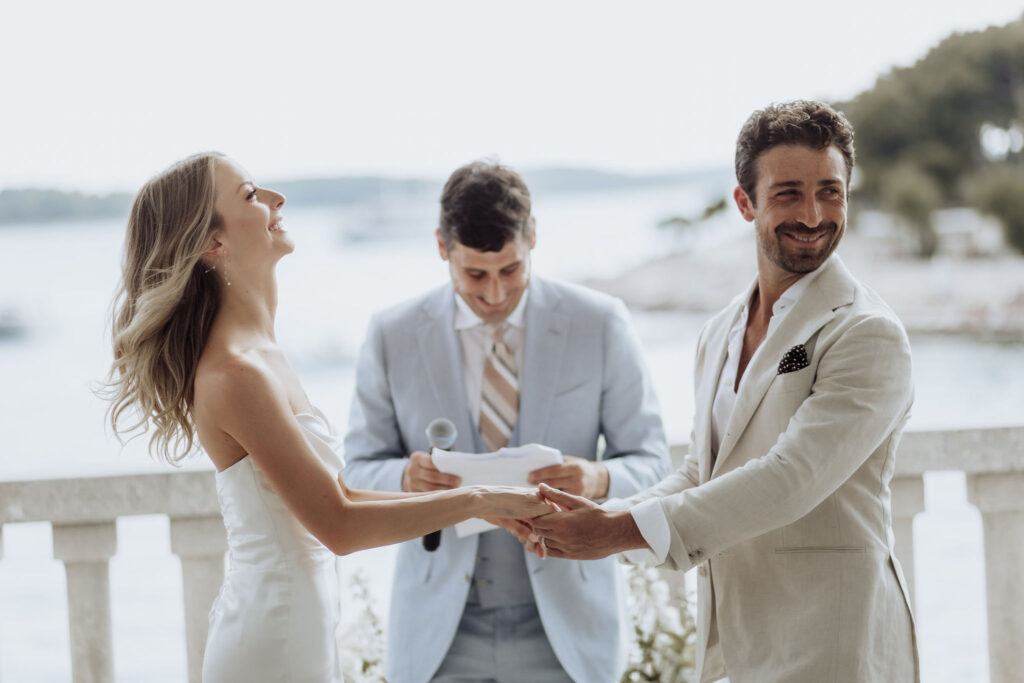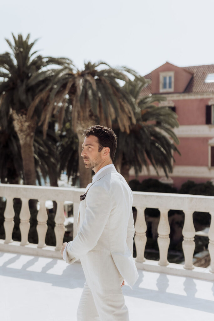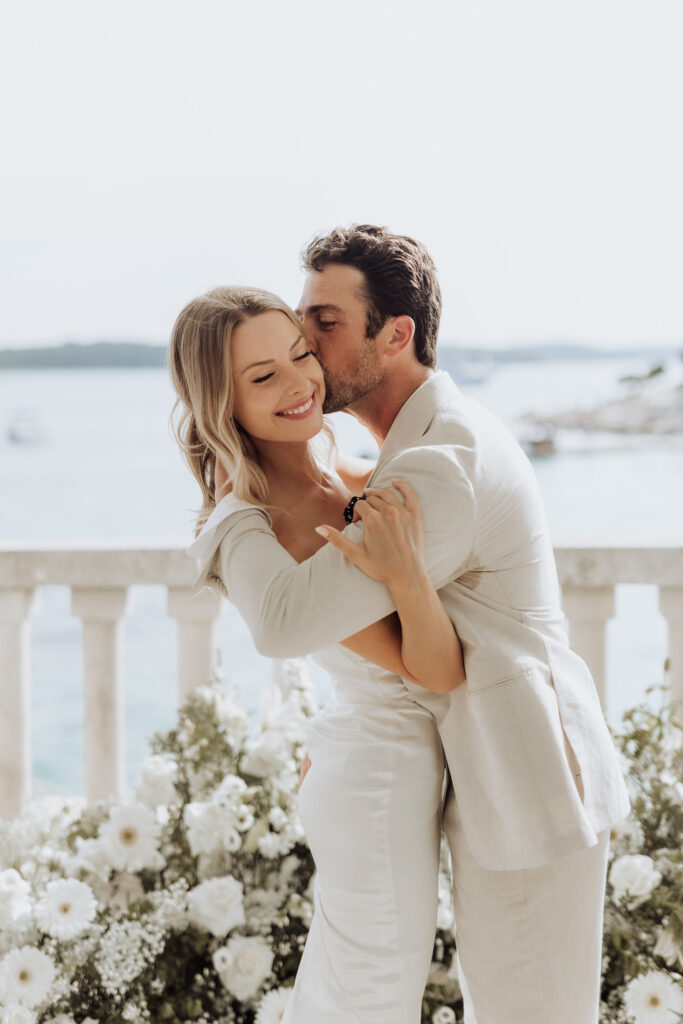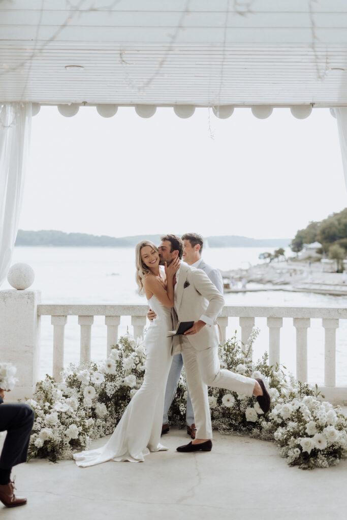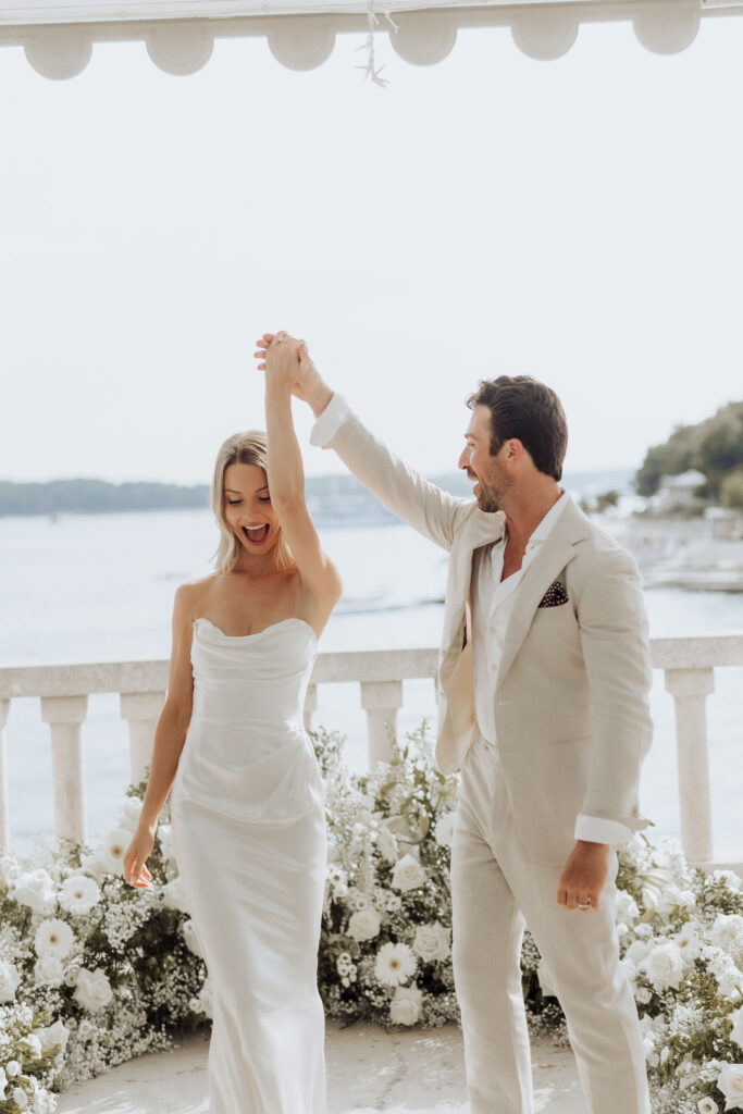 The next day, Susan and Aaron exchanged heartfelt vows at the magnificent Beach Club Hvar. Nestled along the Adriatic coastline, this venue provided a breathtaking setting for their ceremony. A floral arch framed the couple as they pledged their love, with the sparkling sea and gentle breeze adding to the romantic atmosphere.