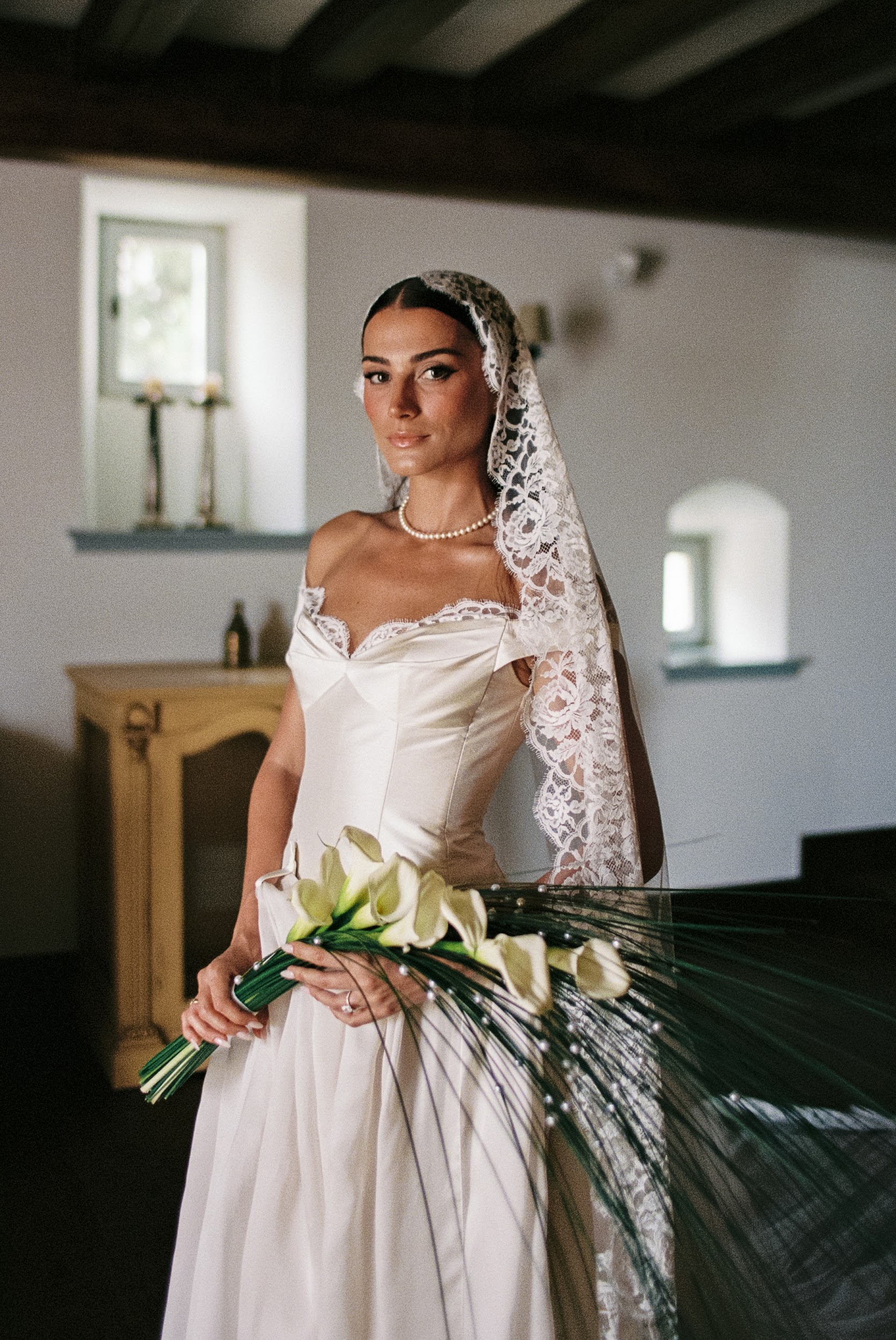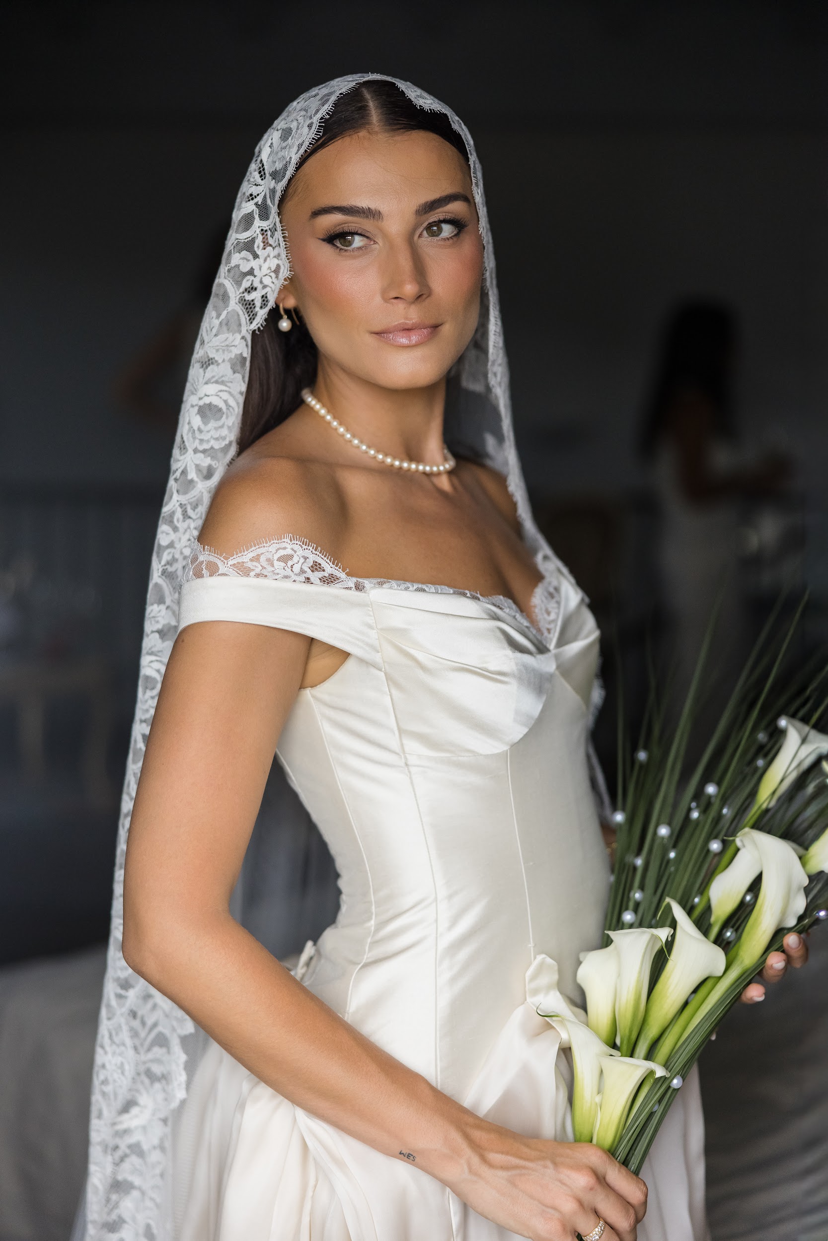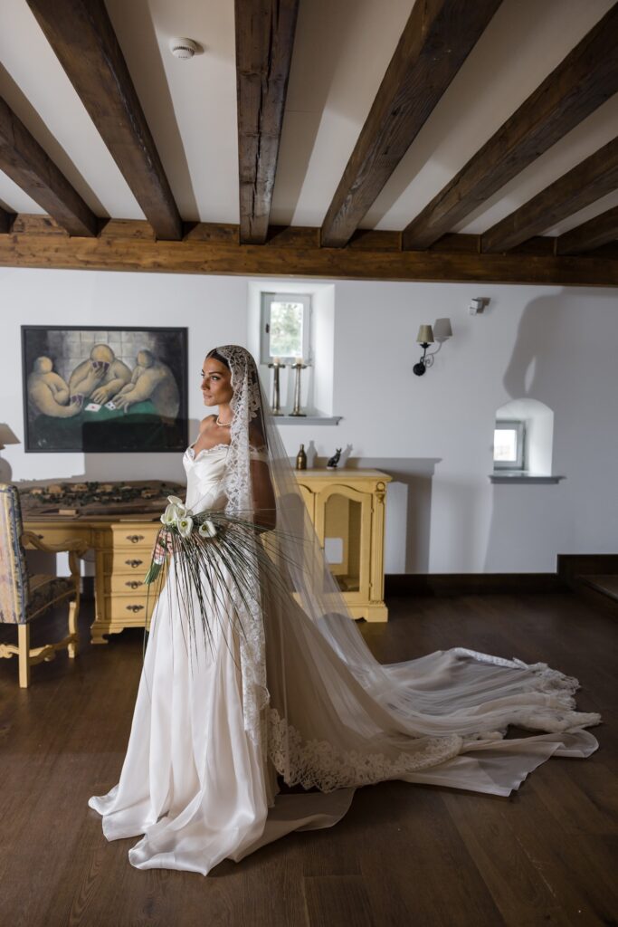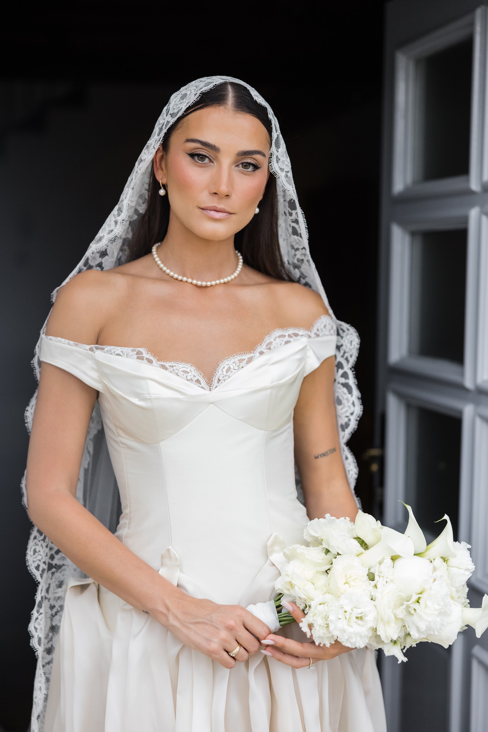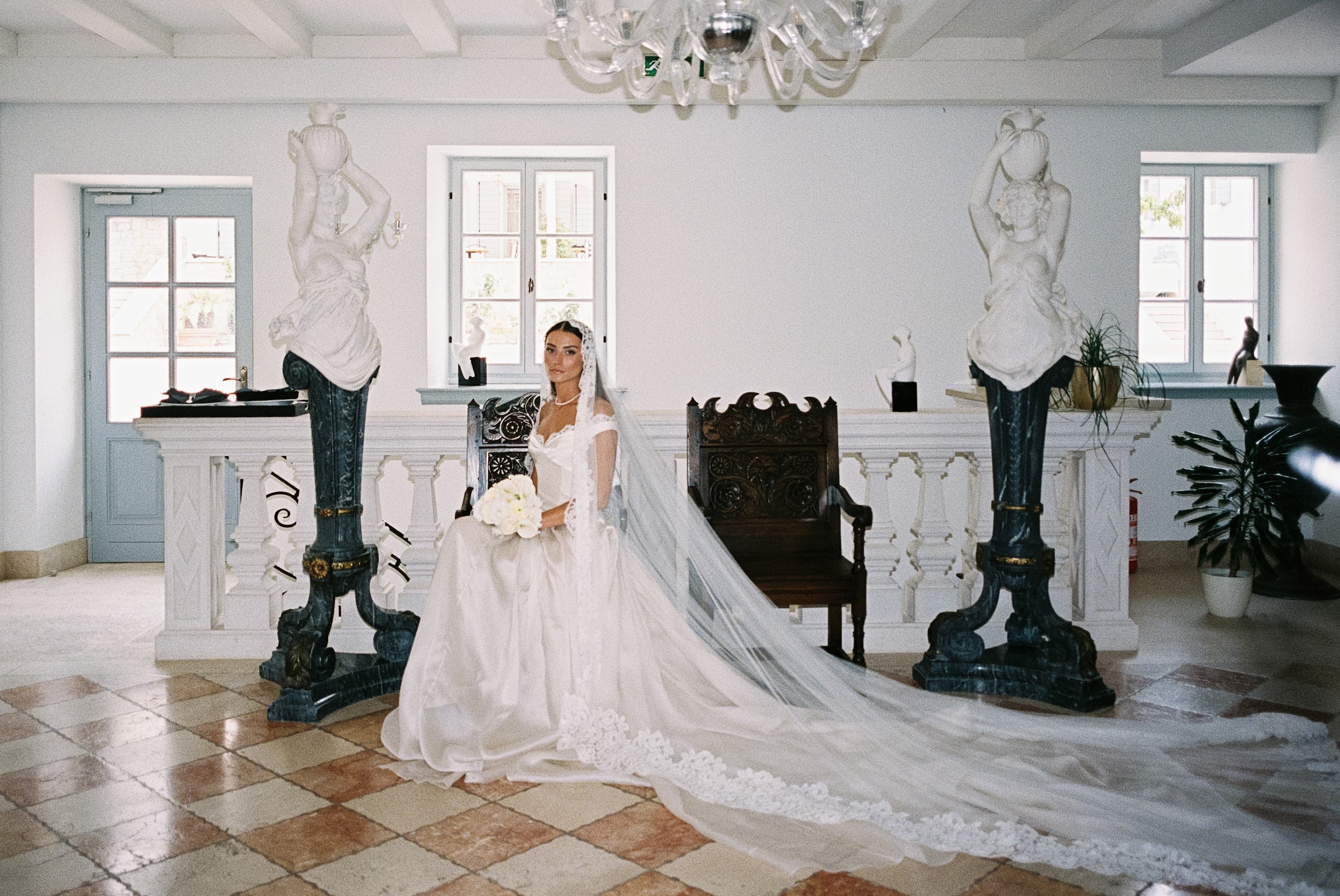 Lauren’s bridal look echoed the spirit of the day: timeless, restrained, and deeply personal. Her off-the-shoulder gown balanced structure and softness, finished with delicate lace detailing and a long, mantilla-style veil that moved beautifully through the historic interiors of Martinis Marchi. Her jewellery belonged to her grandmother — heirloom pieces worn as a quiet tribute, adding another layer of meaning to the day. Paired with a bouquet of white calla lilies, the look felt sculptural and calm, never overworked. Inside the castle, surrounded by classical statues and stone floors, the portraits felt almost cinematic — moments of stillness before the celebration continued.