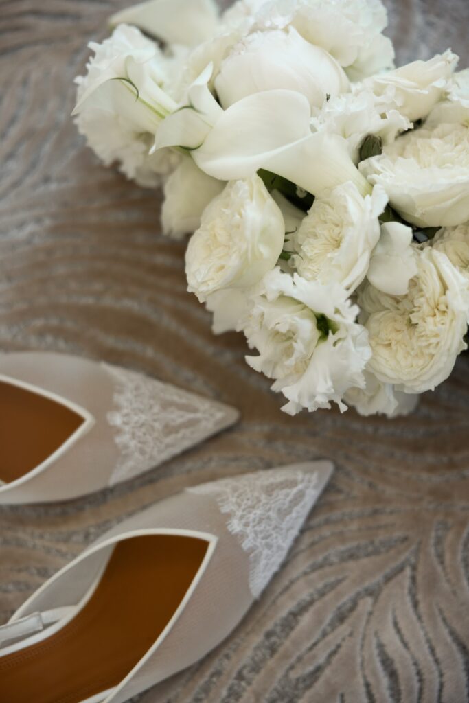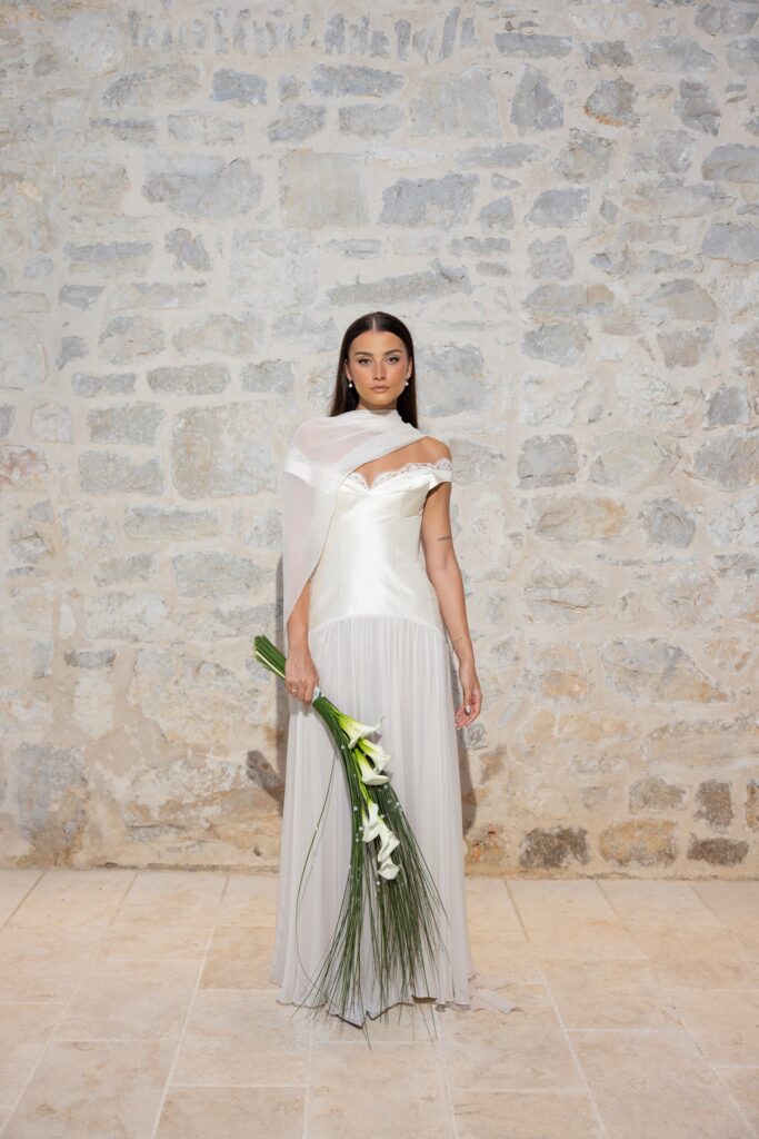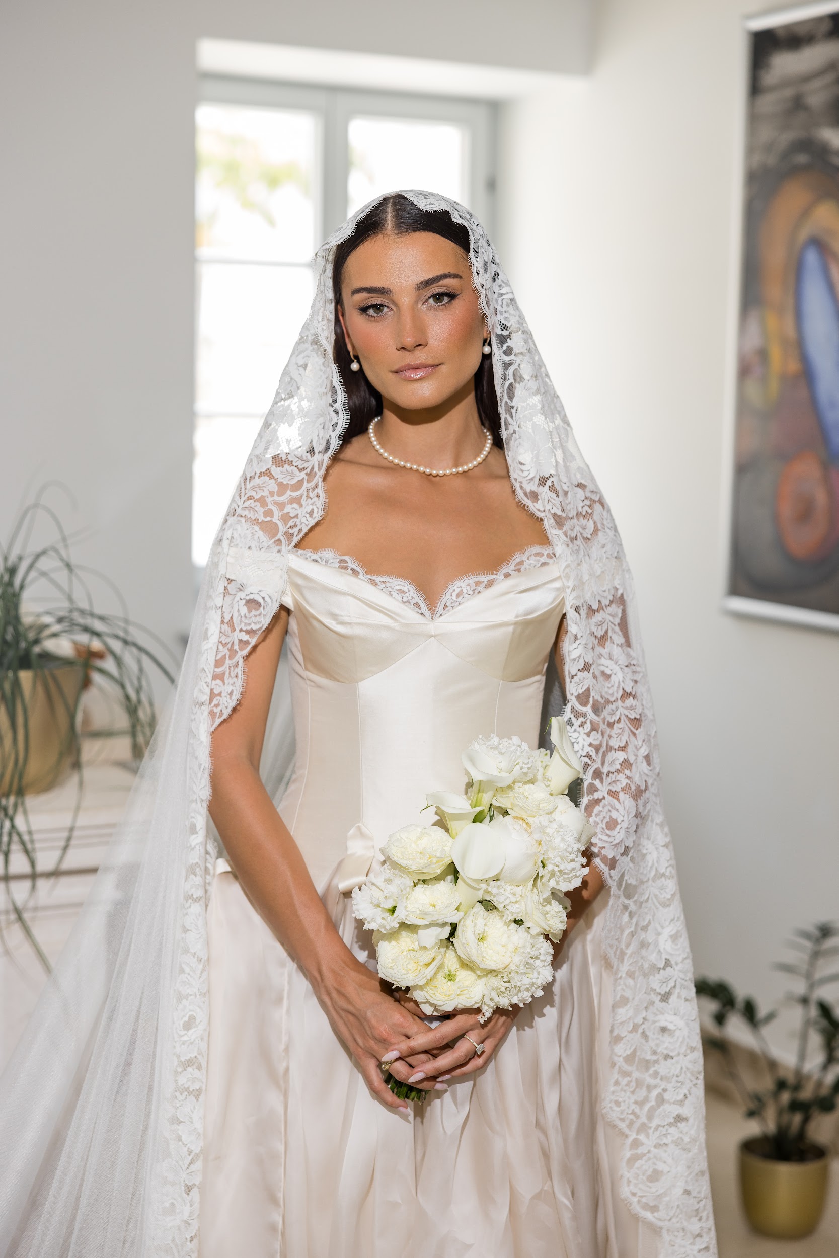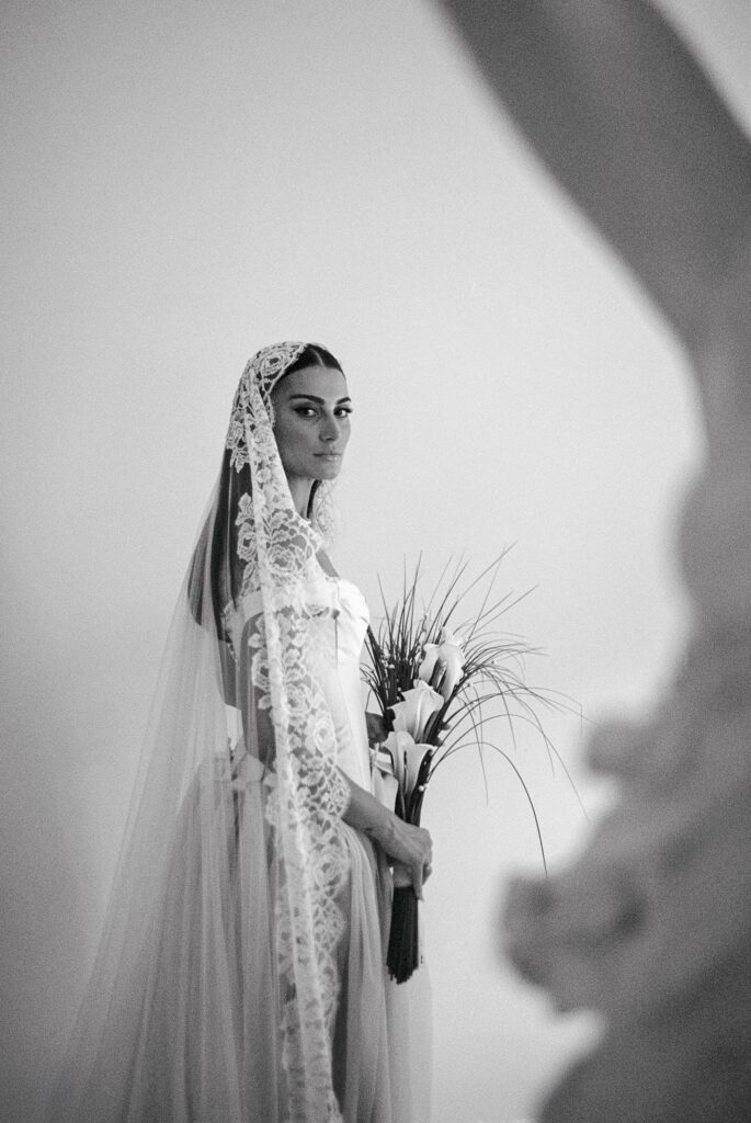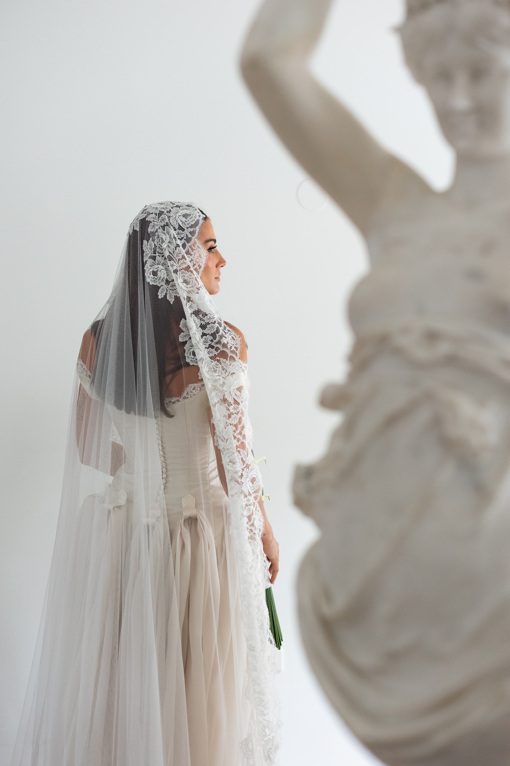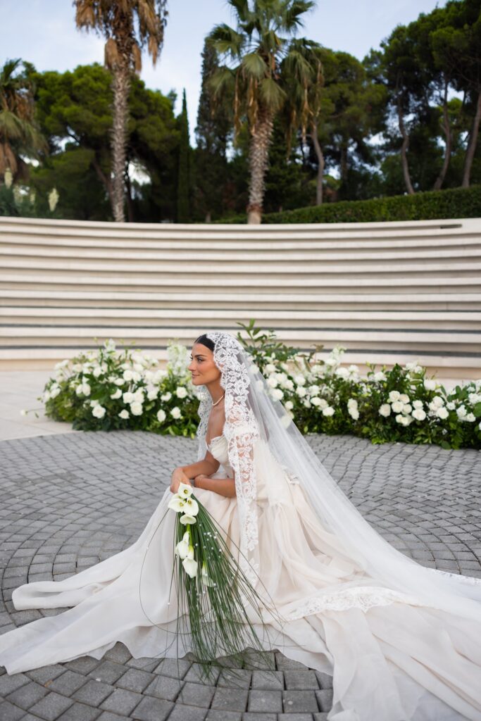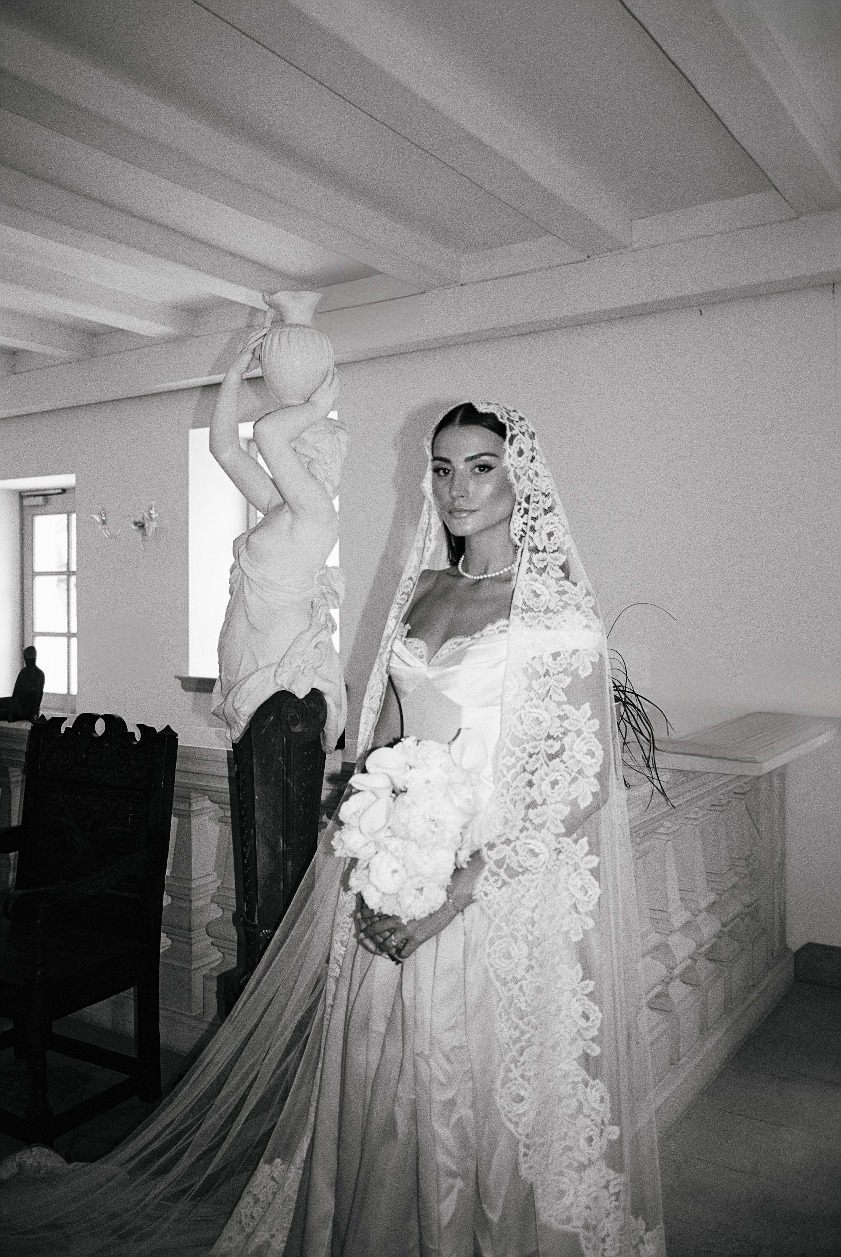 Lauren’s bridal look echoed the spirit of the day: timeless, restrained, and deeply personal. Her off-the-shoulder gown balanced structure and softness, finished with delicate lace detailing and a long, mantilla-style veil that moved beautifully through the historic interiors of Martinis Marchi. Her jewellery belonged to her grandmother — heirloom pieces worn as a quiet tribute, adding another layer of meaning to the day. Paired with a bouquet of white calla lilies, the look felt sculptural and calm, never overworked. Inside the castle, surrounded by classical statues and stone floors, the portraits felt almost cinematic — moments of stillness before the celebration continued.