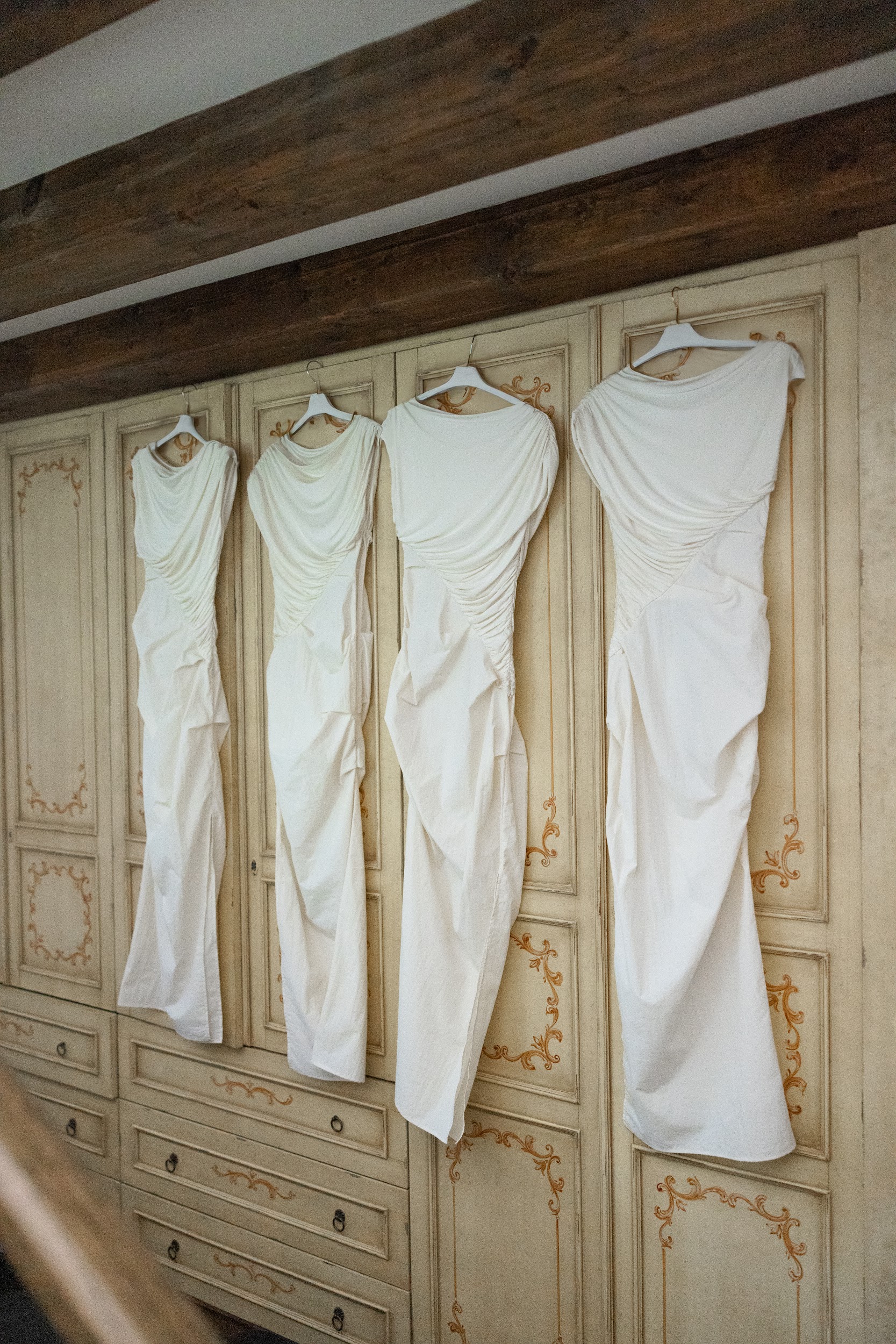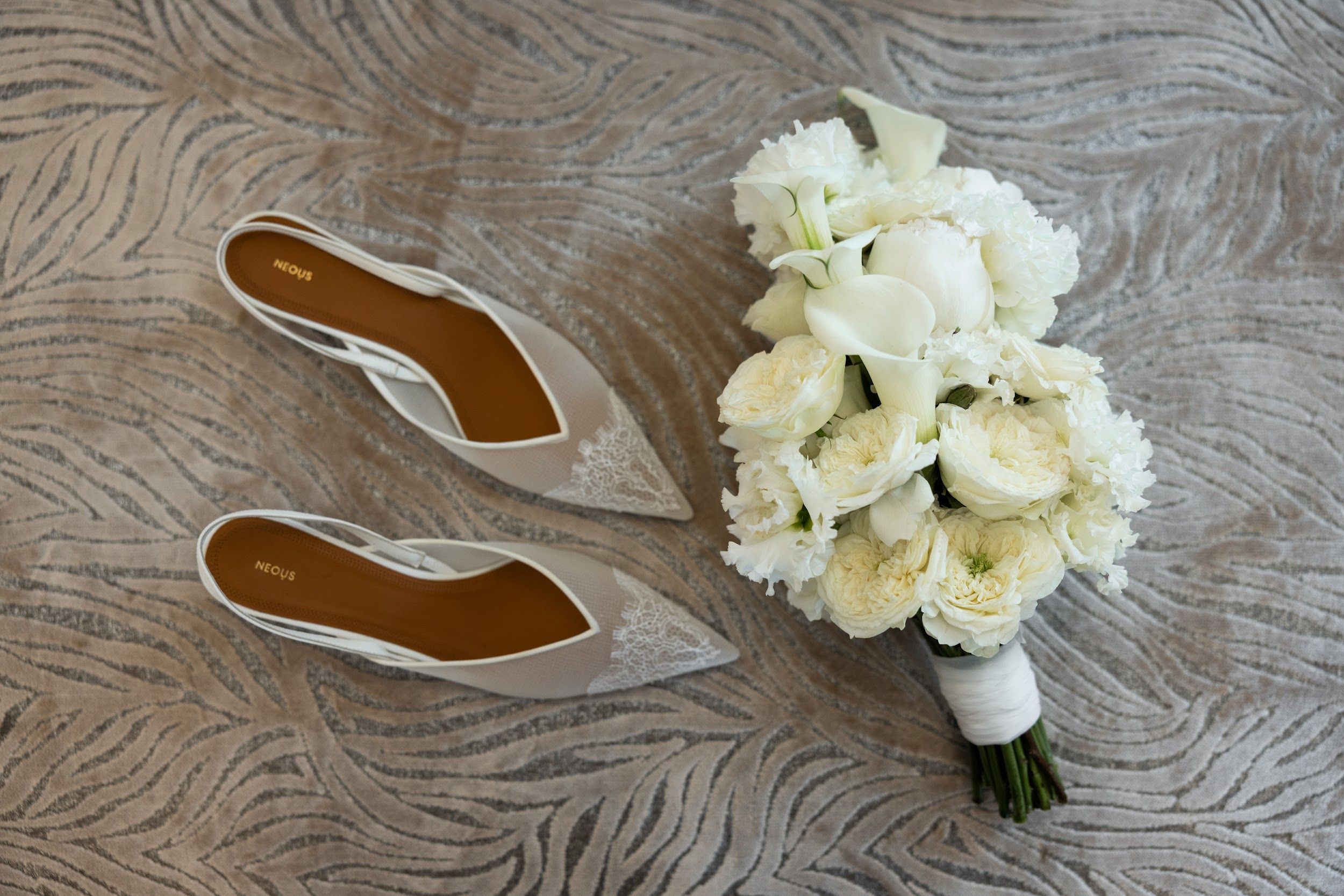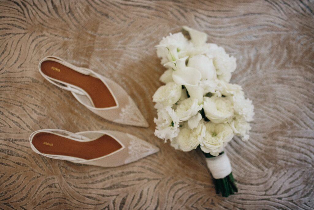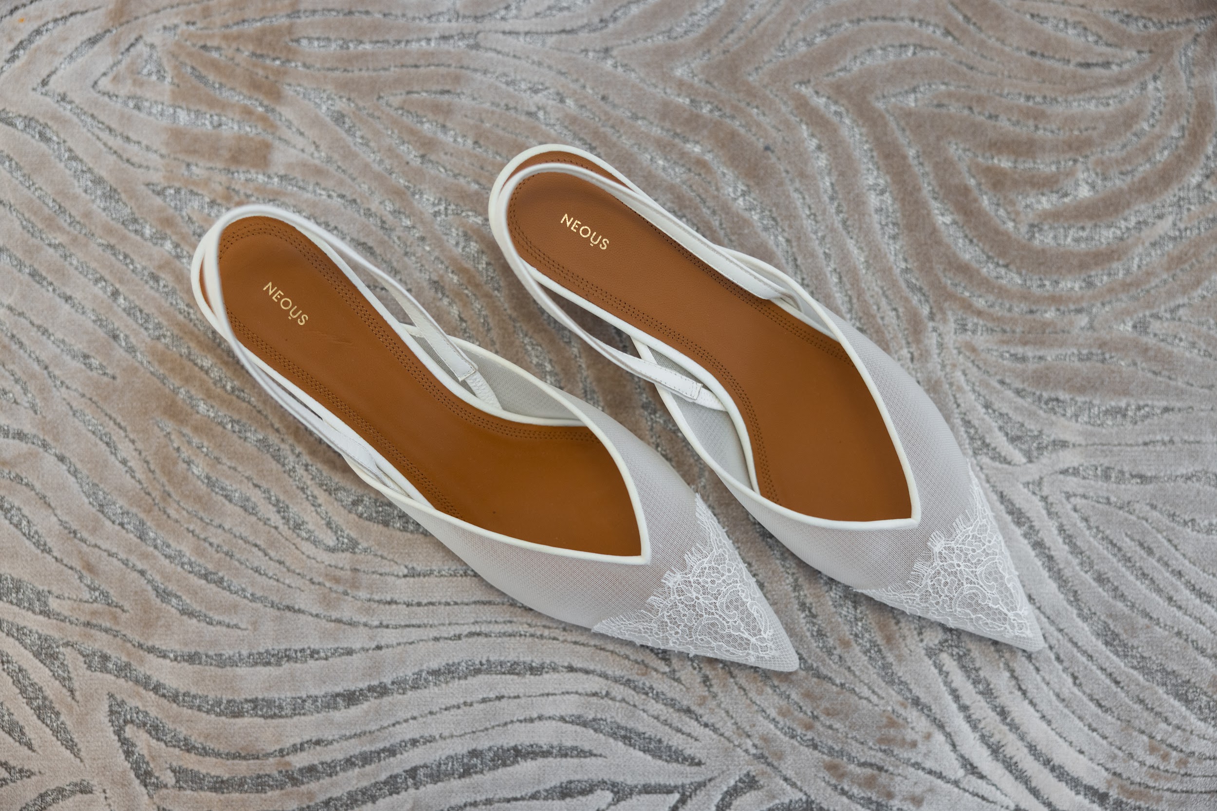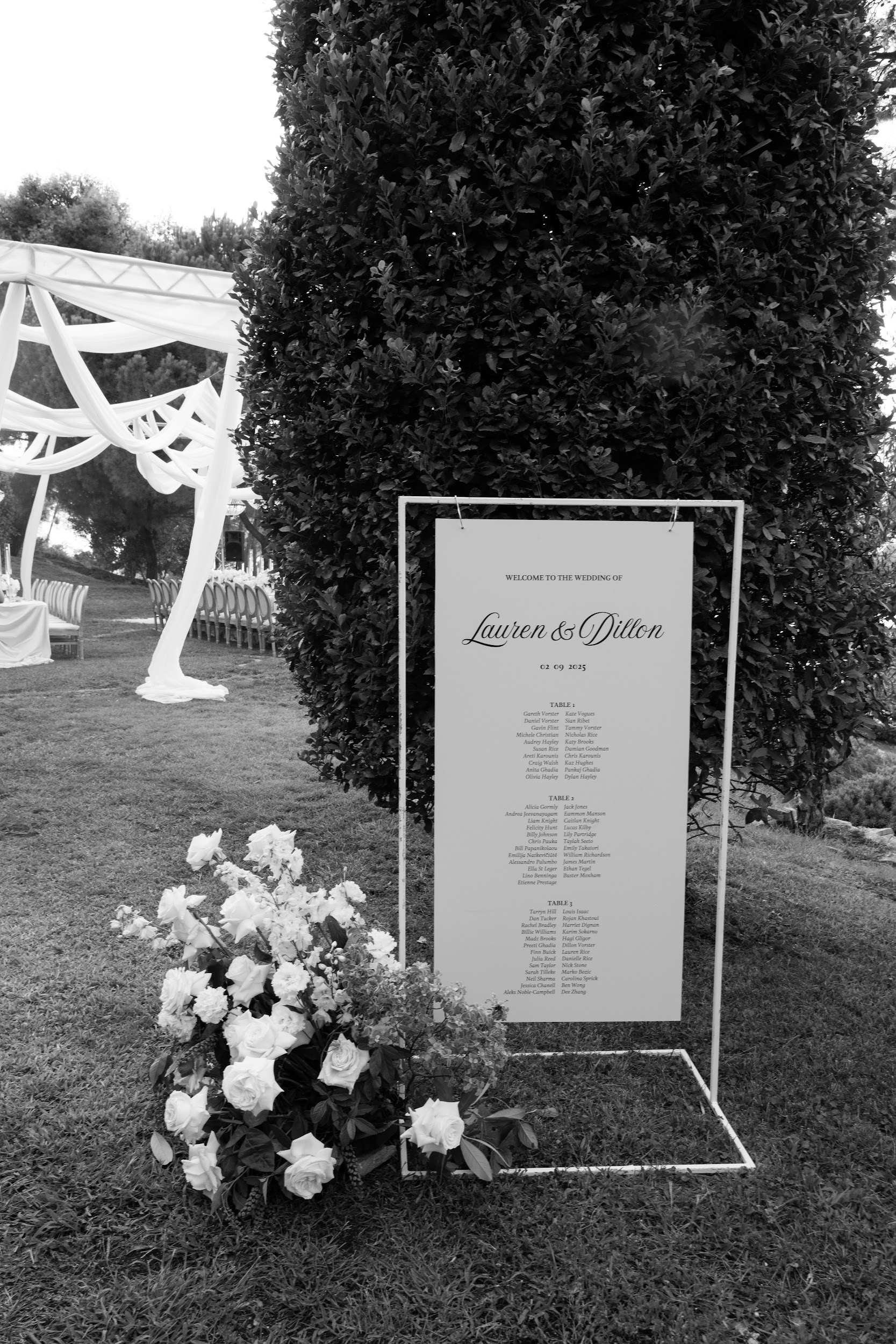 Lauren’s bridal look echoed the spirit of the day: timeless, restrained, and deeply personal. Her off-the-shoulder gown balanced structure and softness, finished with delicate lace detailing and a long, mantilla-style veil that moved beautifully through the historic interiors of Martinis Marchi. Her jewellery belonged to her grandmother — heirloom pieces worn as a quiet tribute, adding another layer of meaning to the day. Paired with a bouquet of white calla lilies, the look felt sculptural and calm, never overworked. Inside the castle, surrounded by classical statues and stone floors, the portraits felt almost cinematic — moments of stillness before the celebration continued.