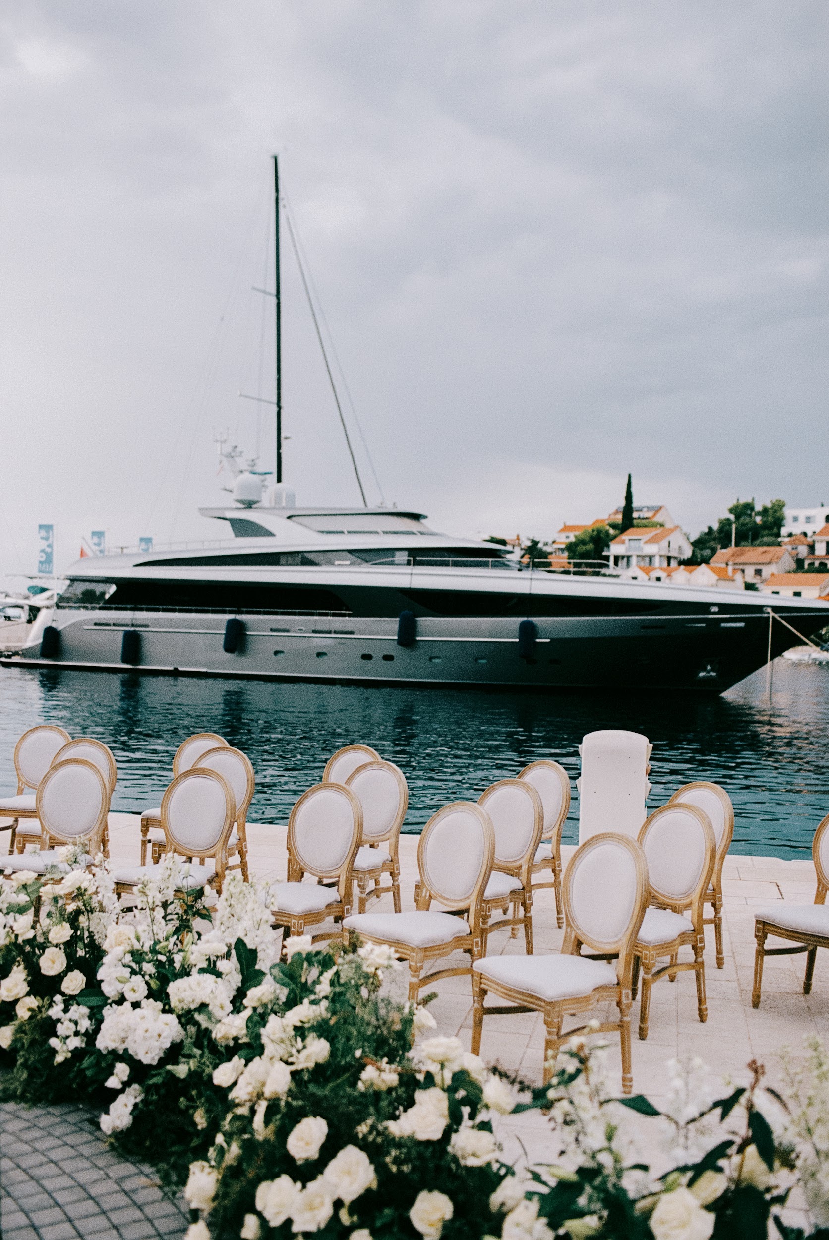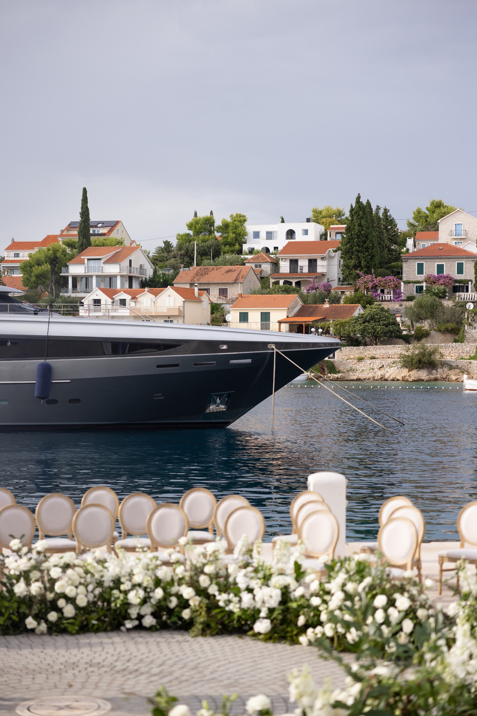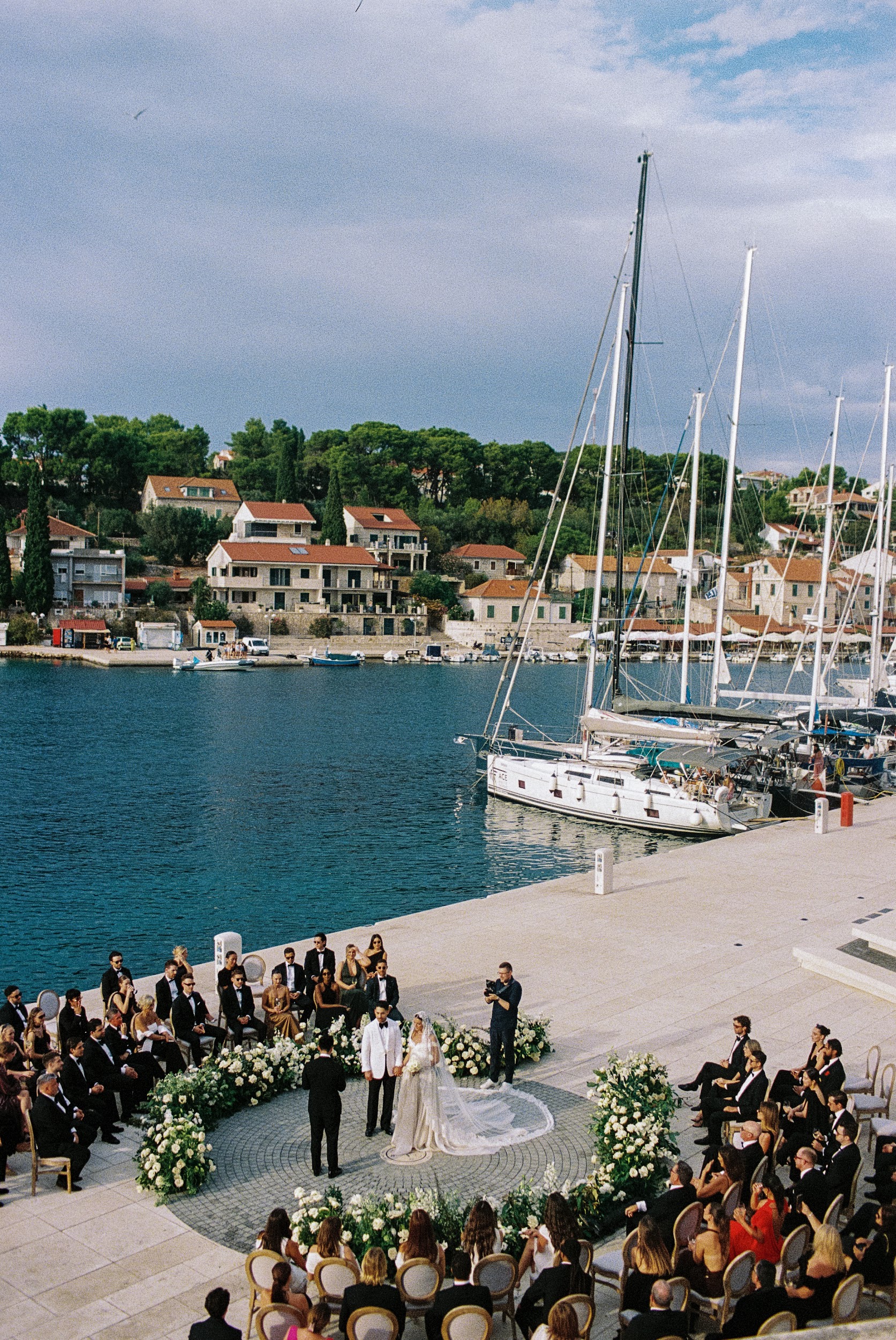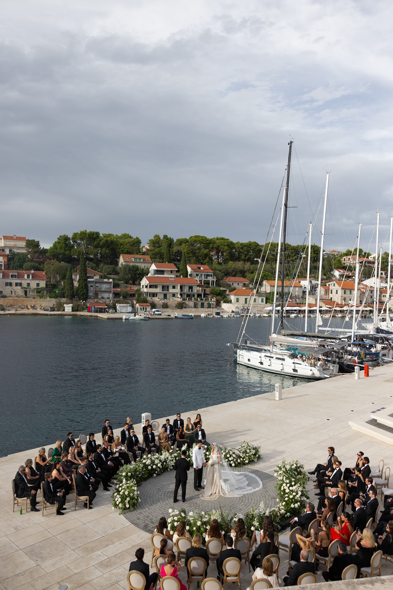 The ceremony took place directly beside the water, arranged in a sculptural circular formation. Pale timber chairs framed a central stone motif, surrounded by soft white florals that felt natural rather than ornamental. Beyond the ceremony space, masts and sails swayed gently, grounding the moment in place. As Lauren made her entrance to “Every Kind of Way” by H.E.R, the atmosphere shifted — intimate, emotional, and quiet. A traditional klapa group followed, their harmonies carrying across the marina and anchoring the ceremony in Croatian heritage. It was one of those moments that cannot be replicated elsewhere — music, sea, and silence working together. A few heartfelt speeches followed. Nothing excessive. Just enough.