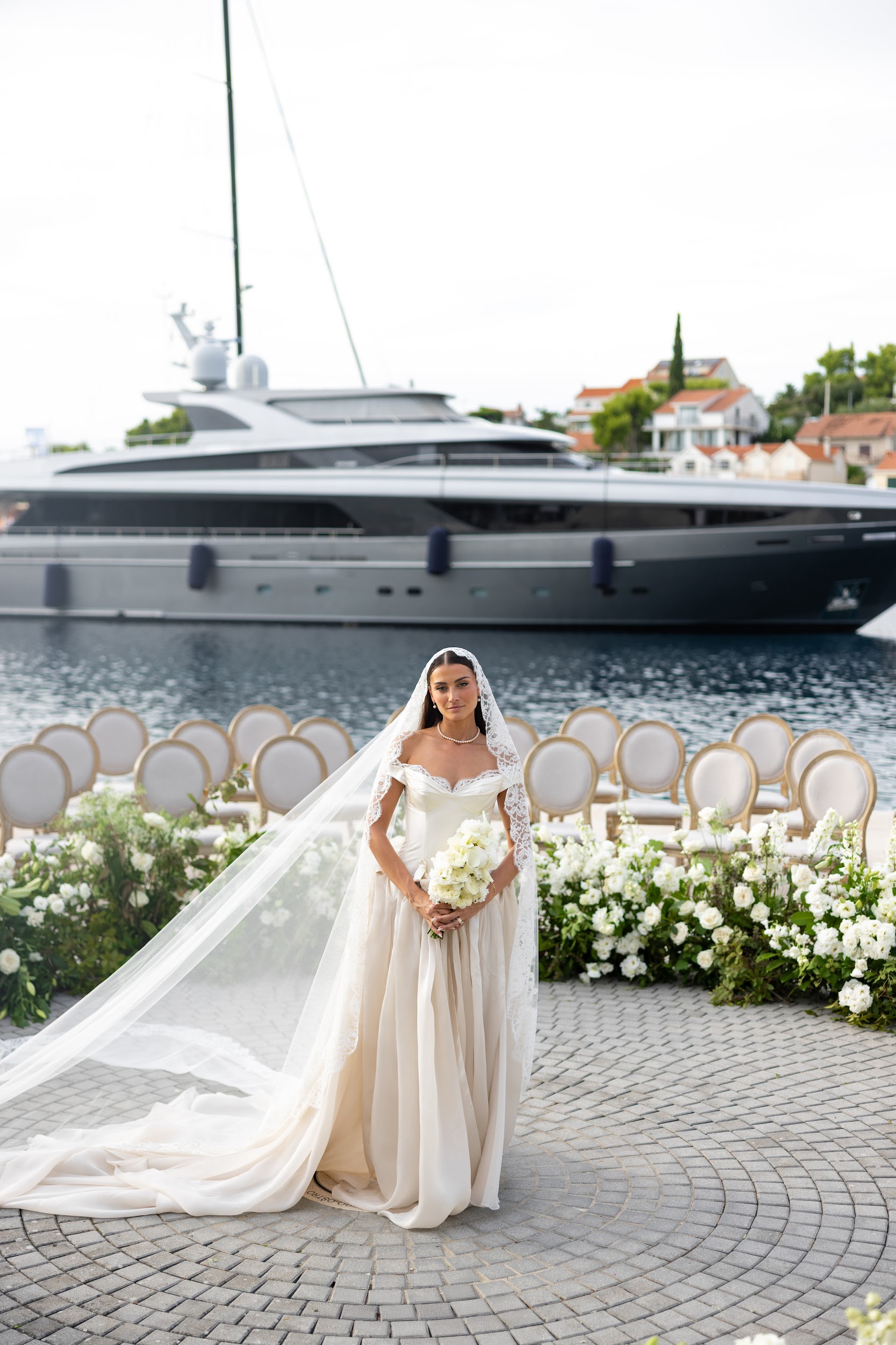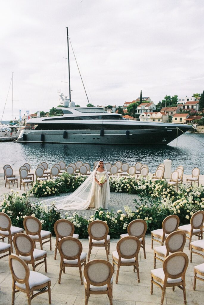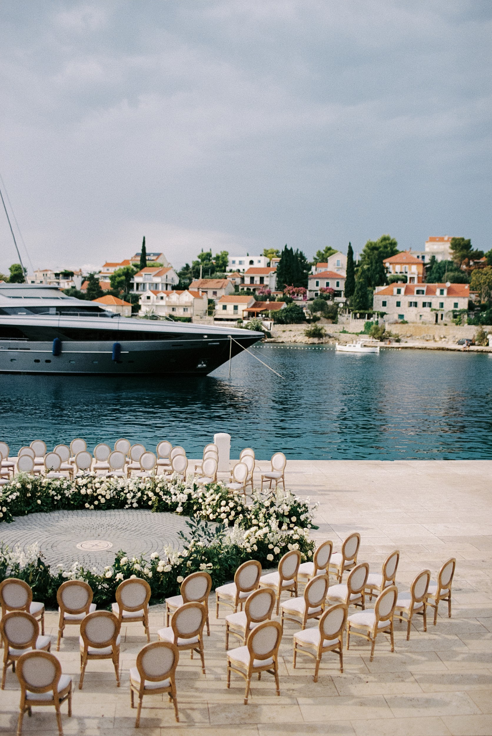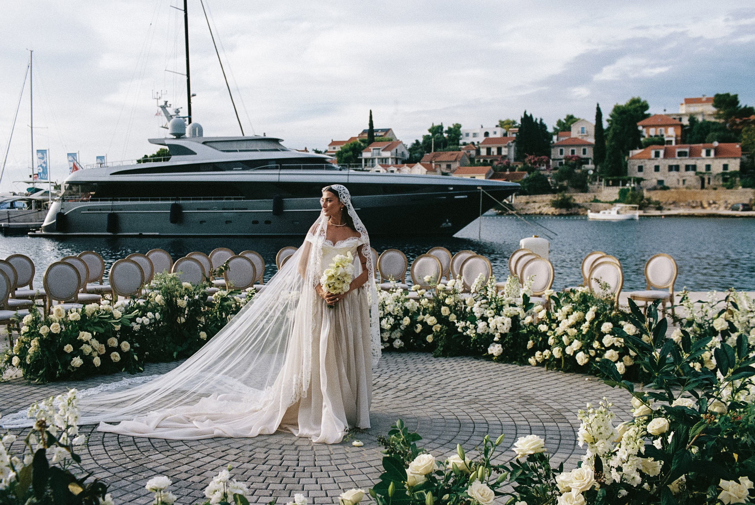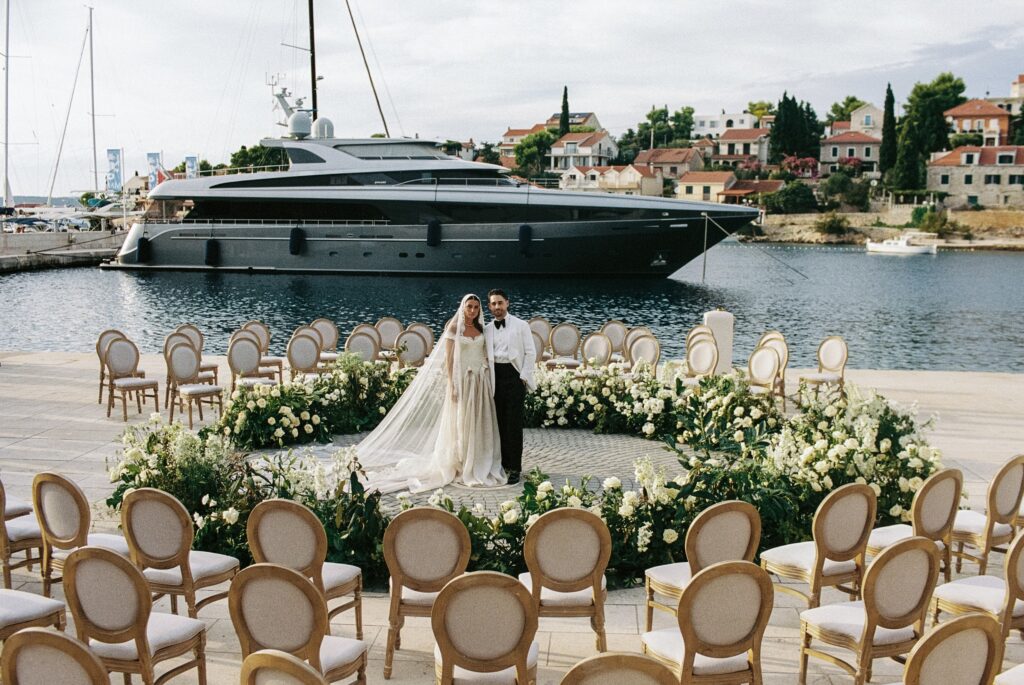 The ceremony took place directly beside the water, arranged in a sculptural circular formation. Pale timber chairs framed a central stone motif, surrounded by soft white florals that felt natural rather than ornamental. Beyond the ceremony space, masts and sails swayed gently, grounding the moment in place. As Lauren made her entrance to “Every Kind of Way” by H.E.R, the atmosphere shifted — intimate, emotional, and quiet. A traditional klapa group followed, their harmonies carrying across the marina and anchoring the ceremony in Croatian heritage. It was one of those moments that cannot be replicated elsewhere — music, sea, and silence working together. A few heartfelt speeches followed. Nothing excessive. Just enough.