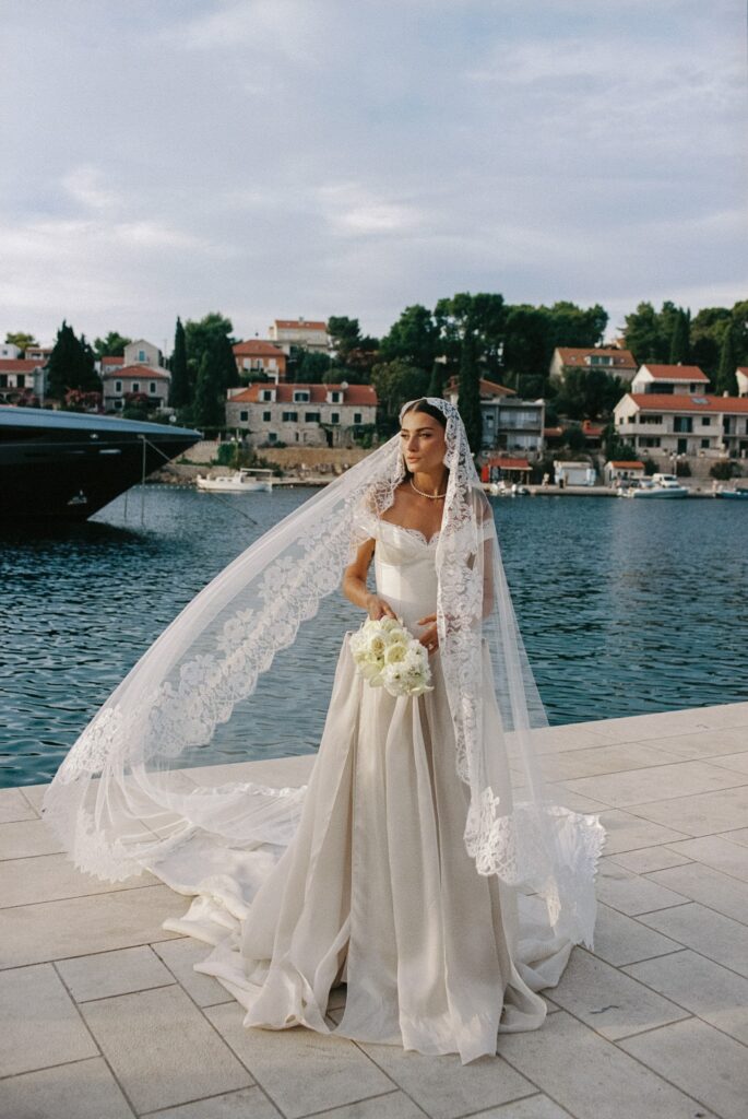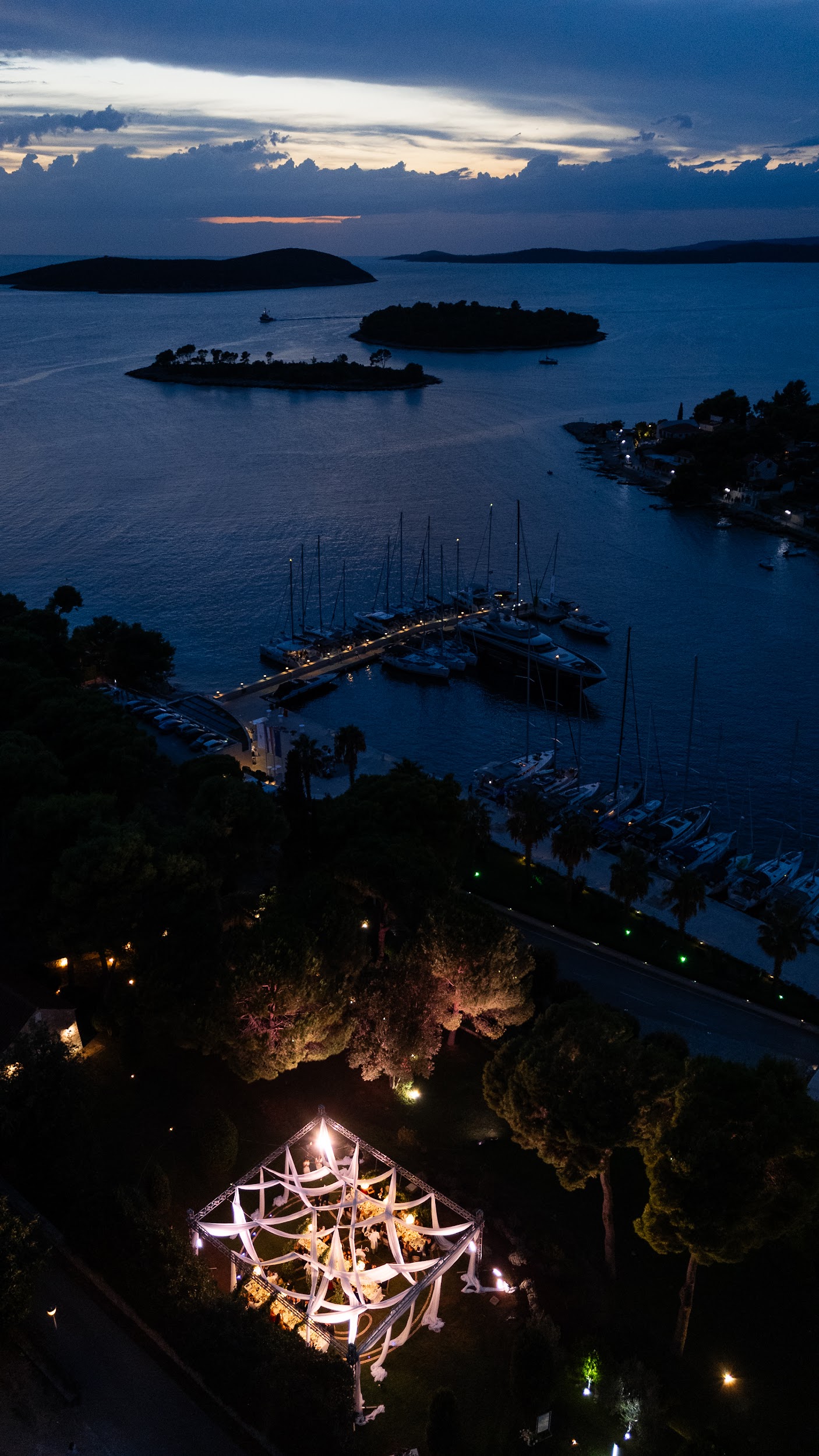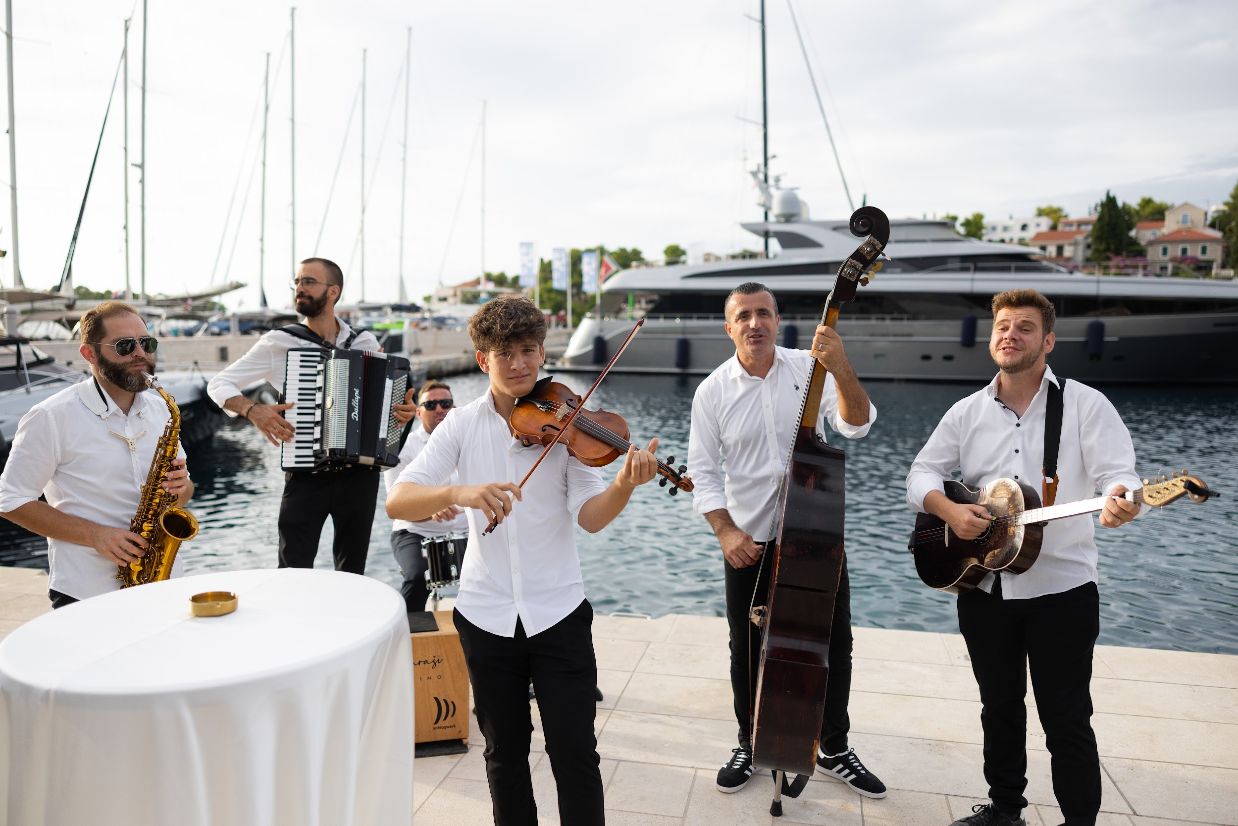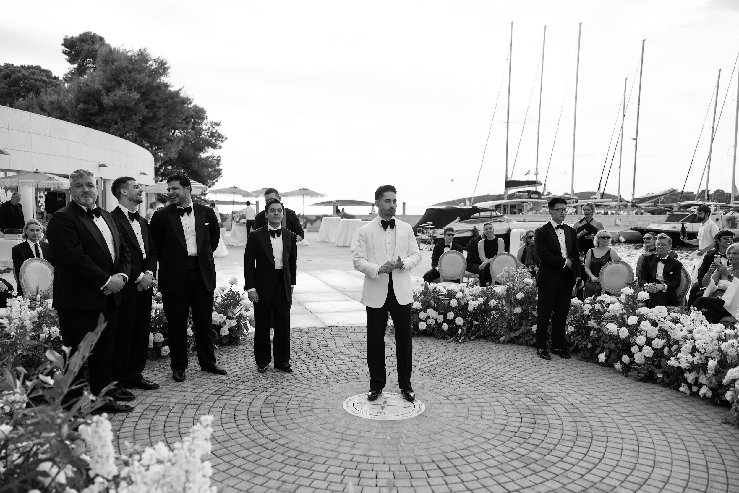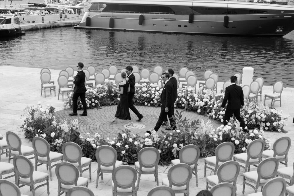 The ceremony took place directly beside the water, arranged in a sculptural circular formation. Pale timber chairs framed a central stone motif, surrounded by soft white florals that felt natural rather than ornamental. Beyond the ceremony space, masts and sails swayed gently, grounding the moment in place. As Lauren made her entrance to “Every Kind of Way” by H.E.R, the atmosphere shifted — intimate, emotional, and quiet. A traditional klapa group followed, their harmonies carrying across the marina and anchoring the ceremony in Croatian heritage. It was one of those moments that cannot be replicated elsewhere — music, sea, and silence working together. A few heartfelt speeches followed. Nothing excessive. Just enough.