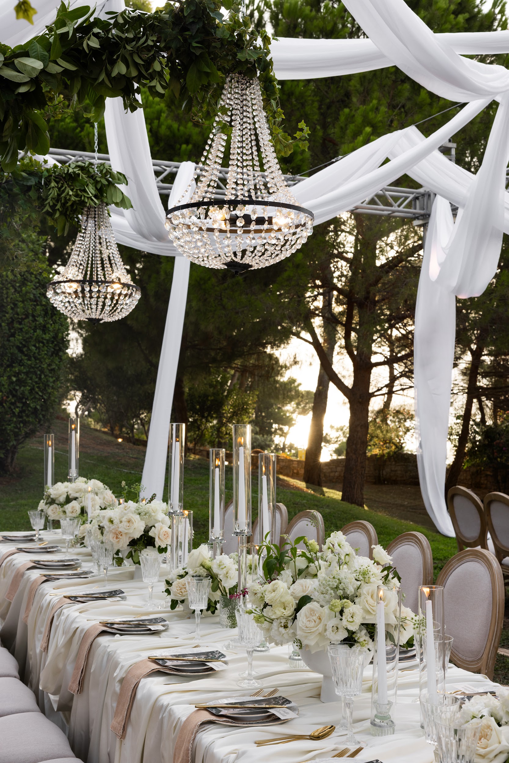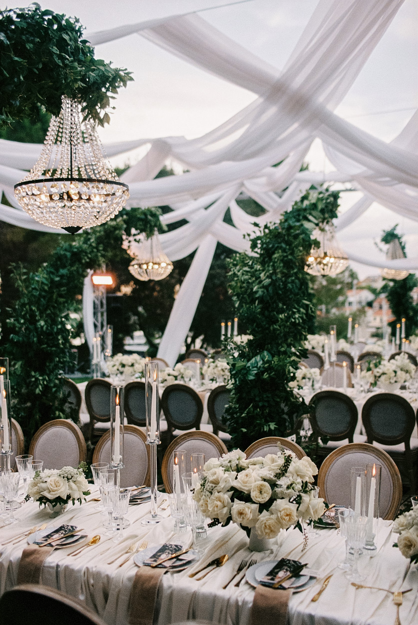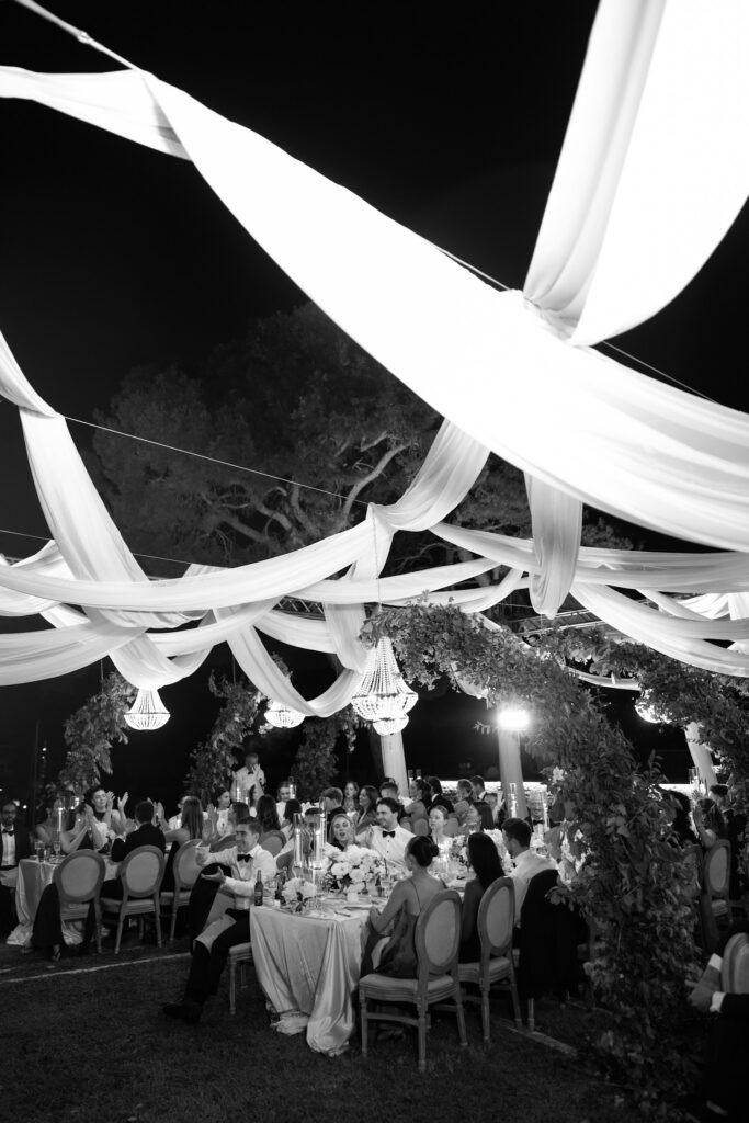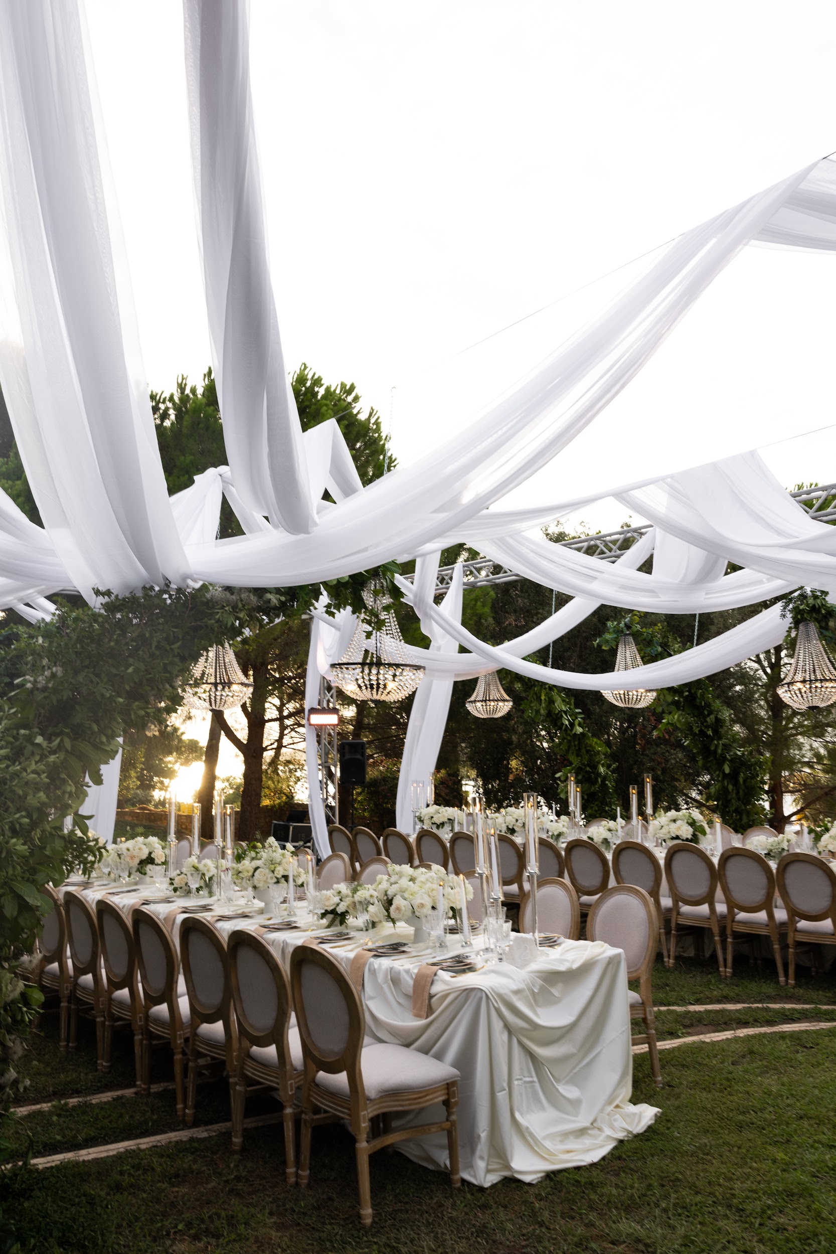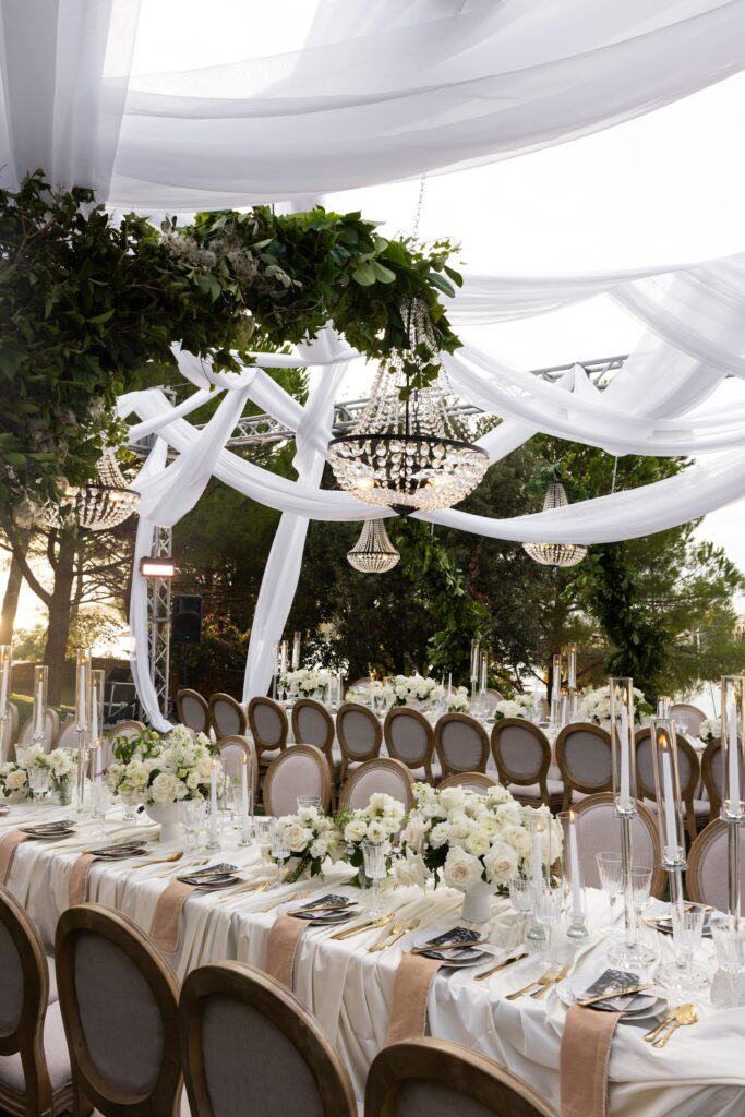 As evening fell, the reception space transformed into something extraordinary. Flowing white drapery cascaded overhead, intertwined with greenery and crystal chandeliers that glowed softly as the sun disappeared. Tables were dressed in layered textures — crisp linens, soft runners, gold cutlery, and low white floral arrangements that felt lush but restrained. Candlelight reflected gently off glassware, creating a warm, intimate glow beneath the canopy. It was elegant without being stiff — elevated without trying too hard. Dinner was an experience in itself — thoughtfully curated and deeply rooted in local excellence: