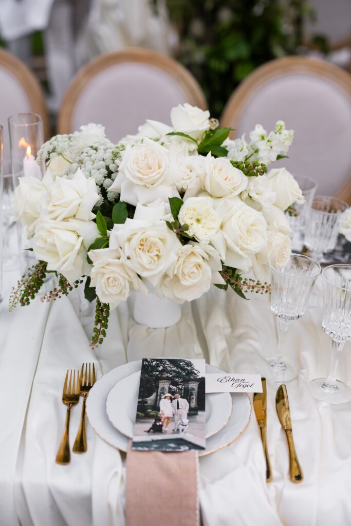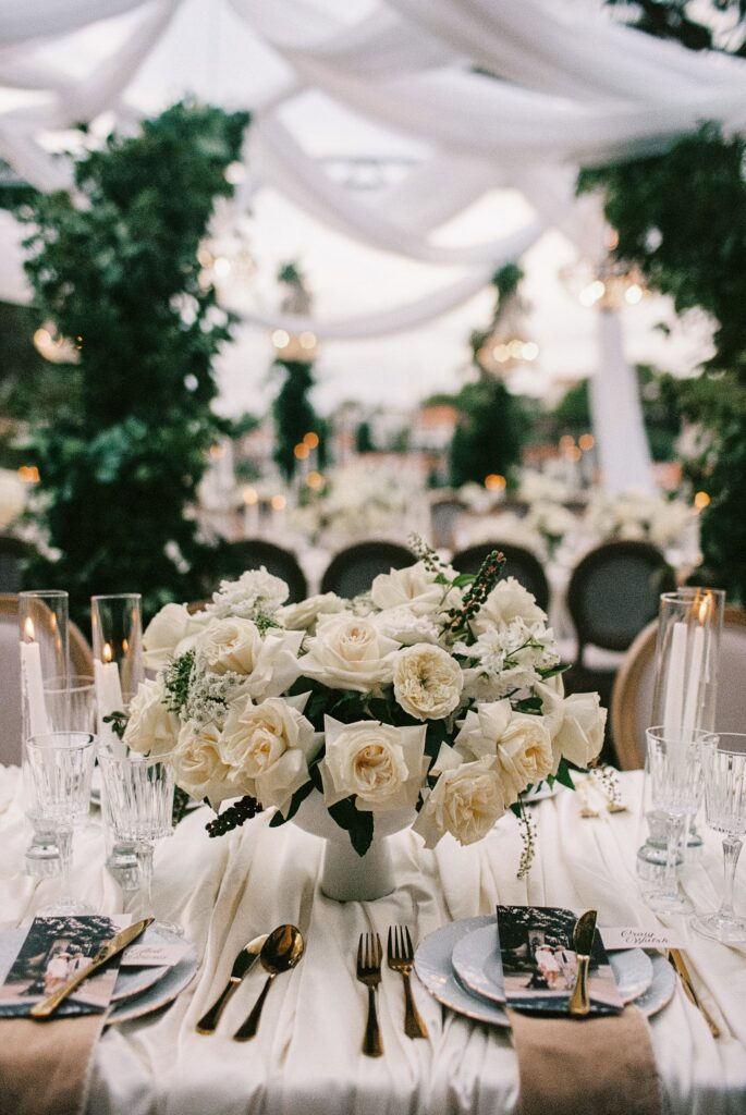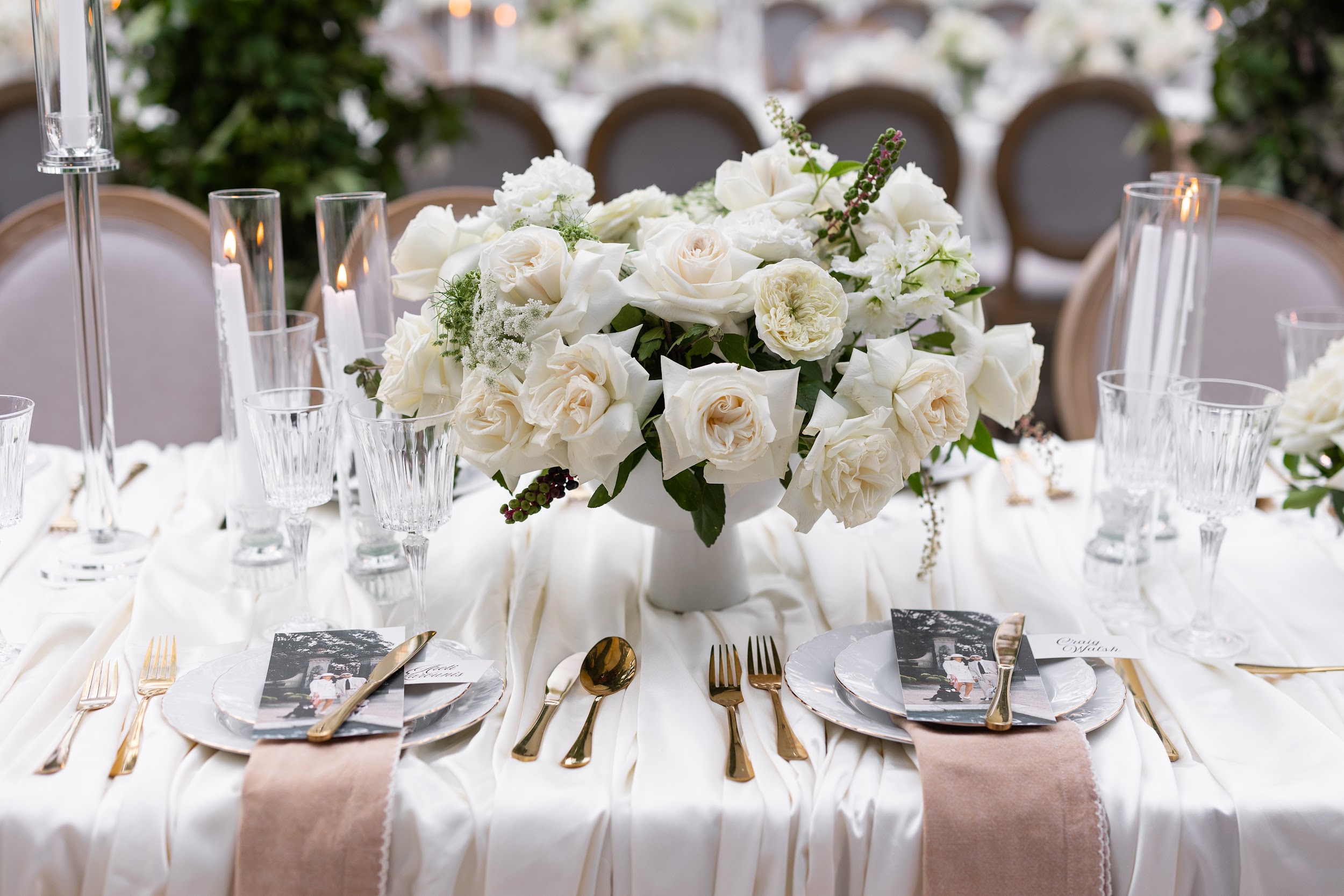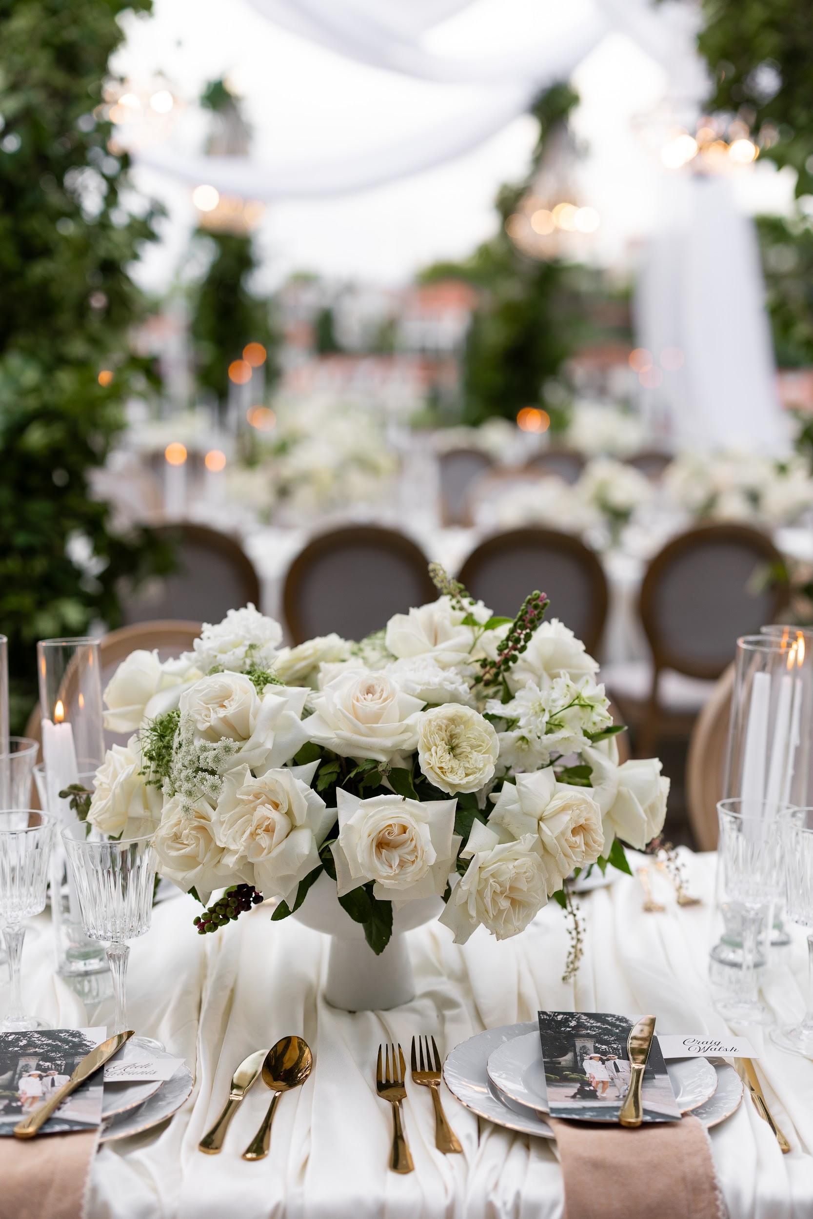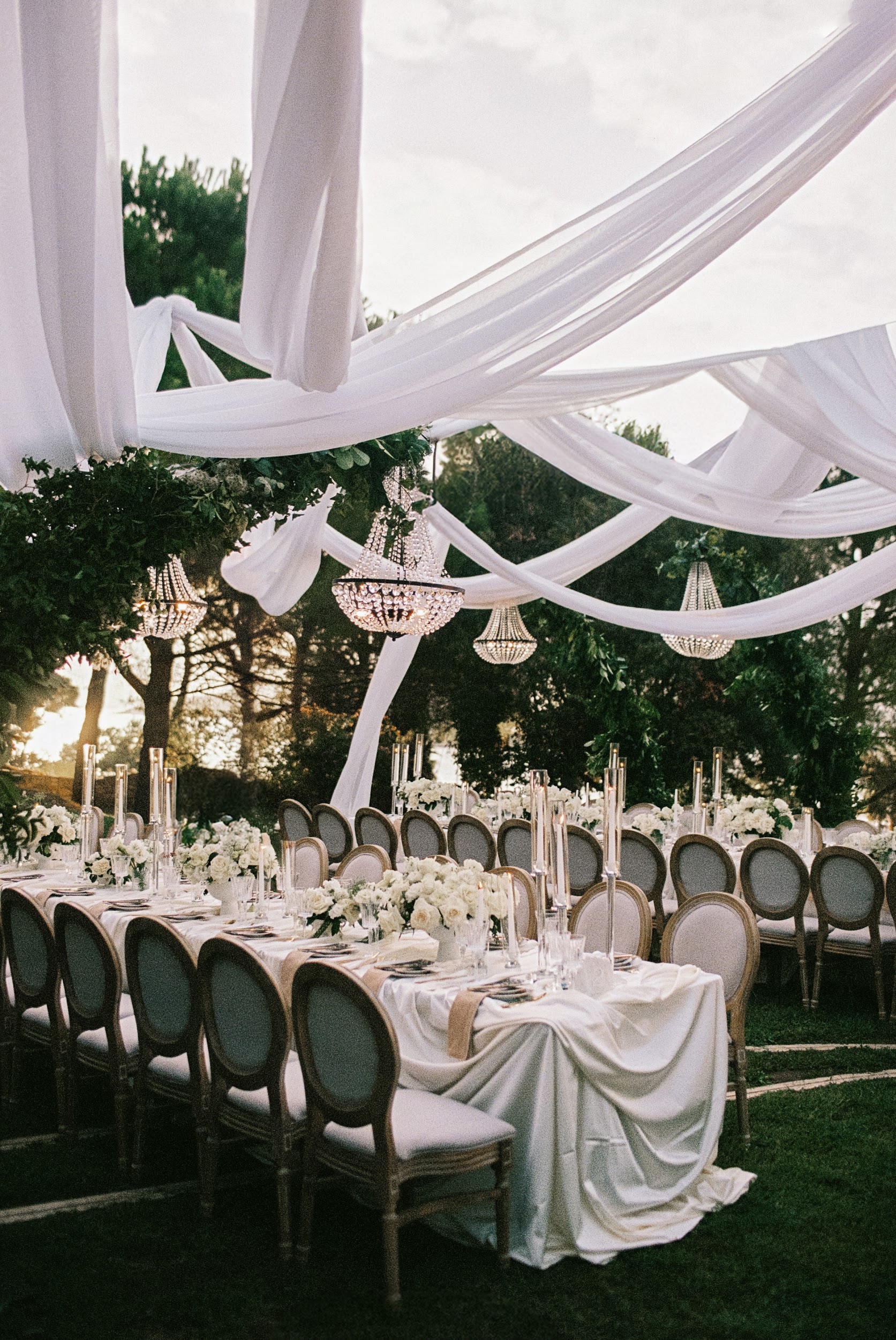 As evening fell, the reception space transformed into something extraordinary. Flowing white drapery cascaded overhead, intertwined with greenery and crystal chandeliers that glowed softly as the sun disappeared. Tables were dressed in layered textures — crisp linens, soft runners, gold cutlery, and low white floral arrangements that felt lush but restrained. Candlelight reflected gently off glassware, creating a warm, intimate glow beneath the canopy. It was elegant without being stiff — elevated without trying too hard. Dinner was an experience in itself — thoughtfully curated and deeply rooted in local excellence: