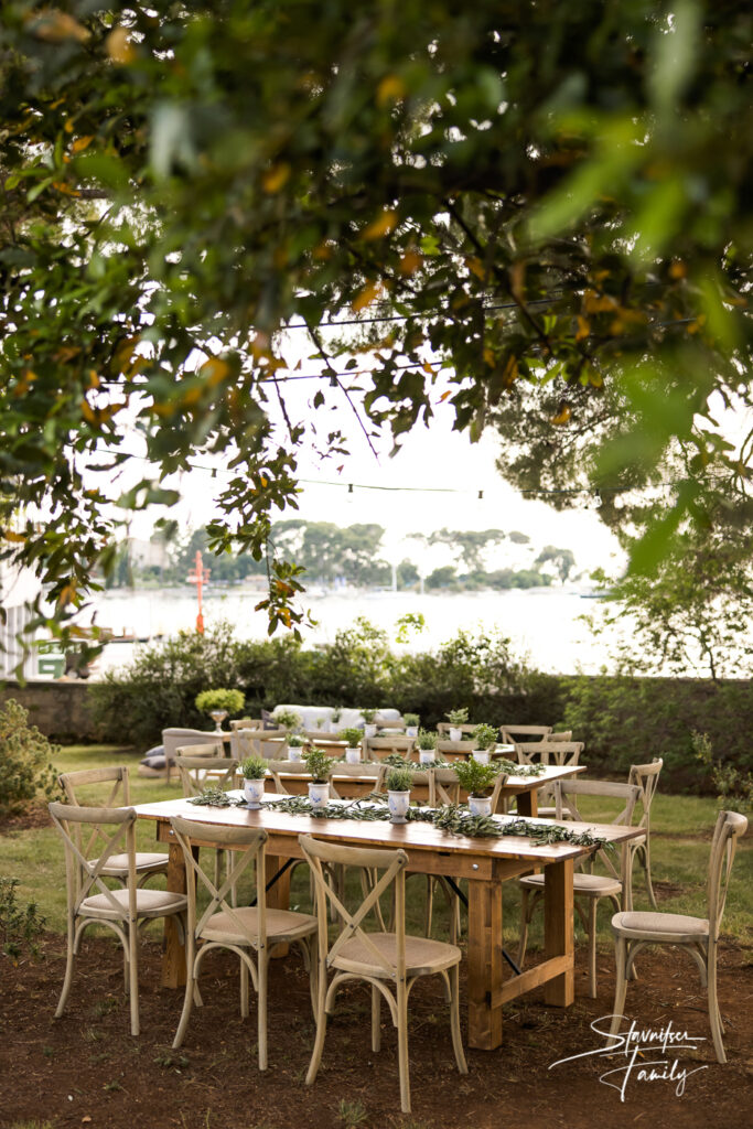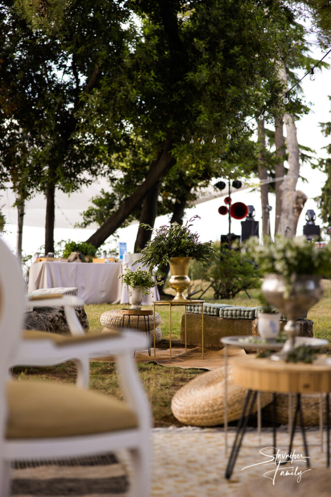 The seating arrangements were as visually captivating as they were comfortable. A mix of armchairs, wooden cross-back chairs, and gold-accented seating created a dynamic and eclectic look. By blending natural materials like wood with metallic accents, the decor achieved a perfect balance of rustic charm and modern sophistication.