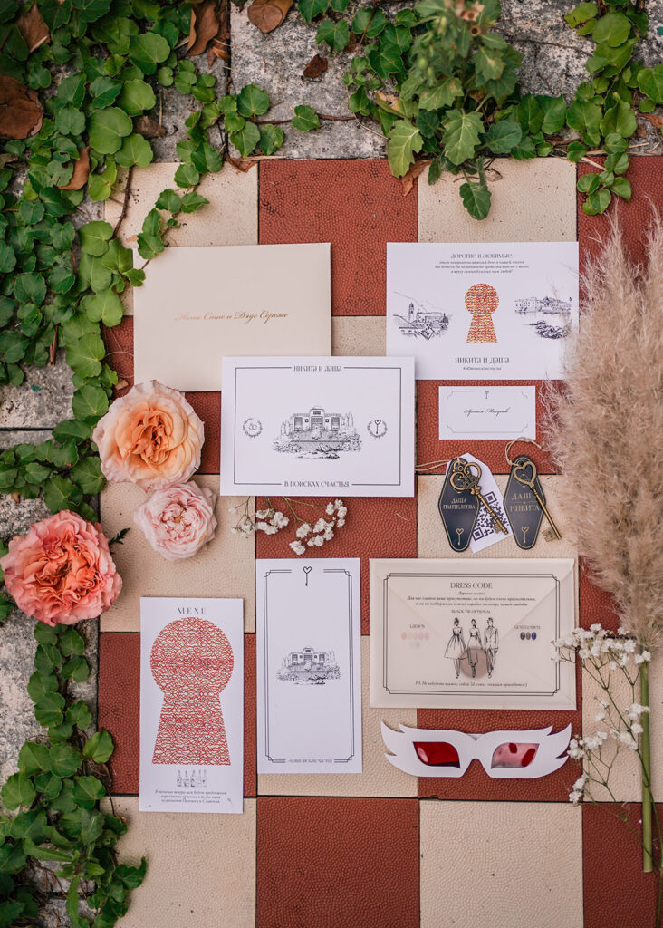 Their wedding stood out due to numerous intriguing quests and personalized touches. Invitations doubled as keys to the event, symbolizing the start of the “In Search of Happiness” journey. From the entrance to dining experiences, everything was planned with creative flair. For instance, the dinner menu required special decoder glasses, designed specifically for this luxury wedding in Dubrovnik.