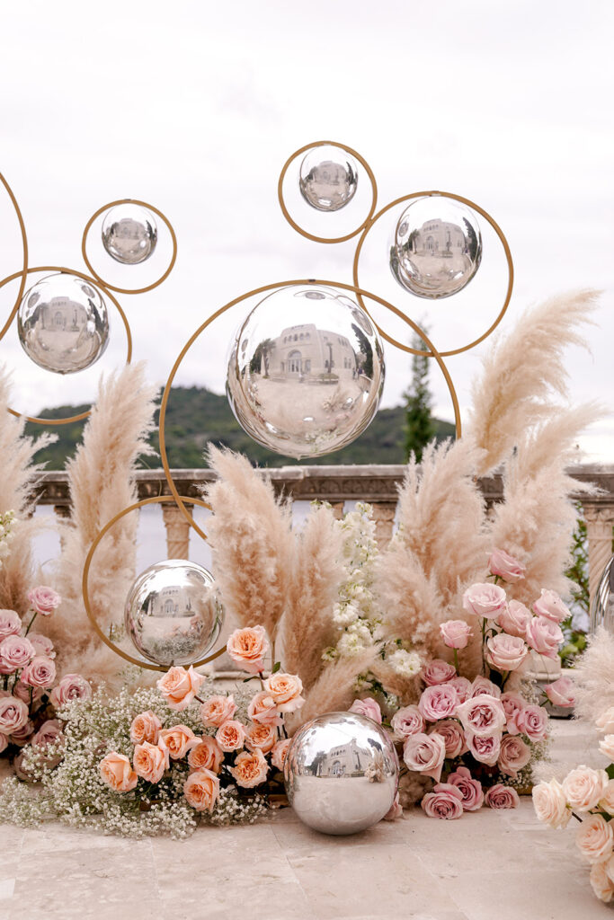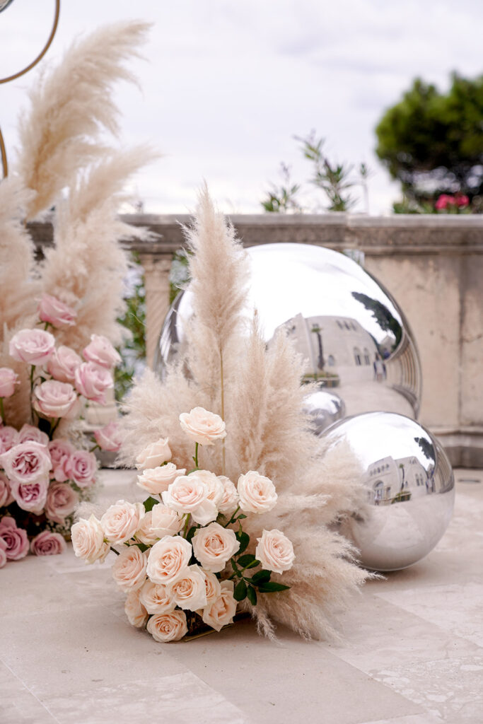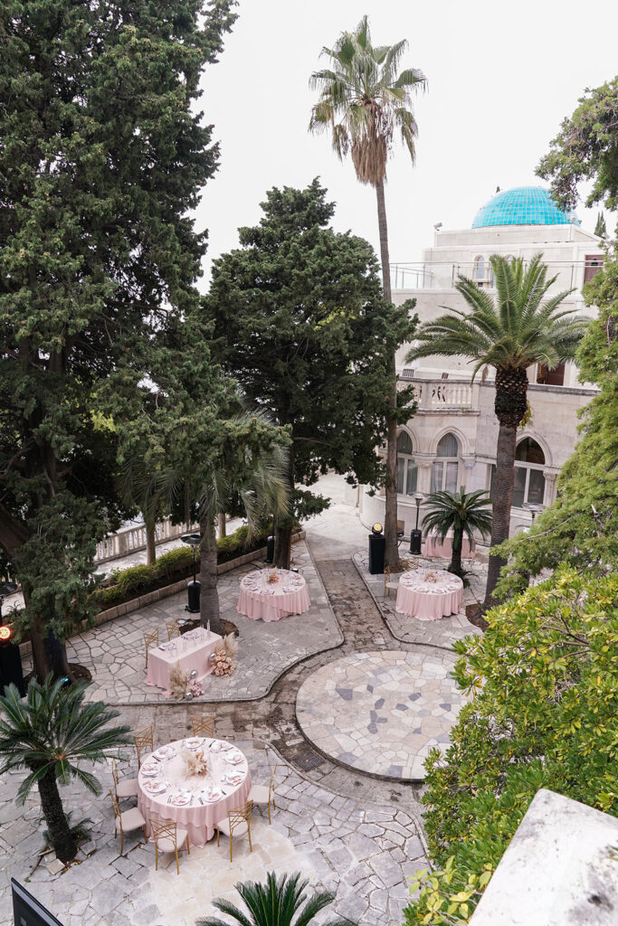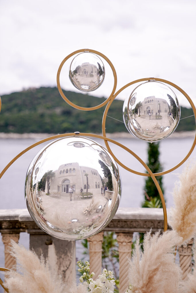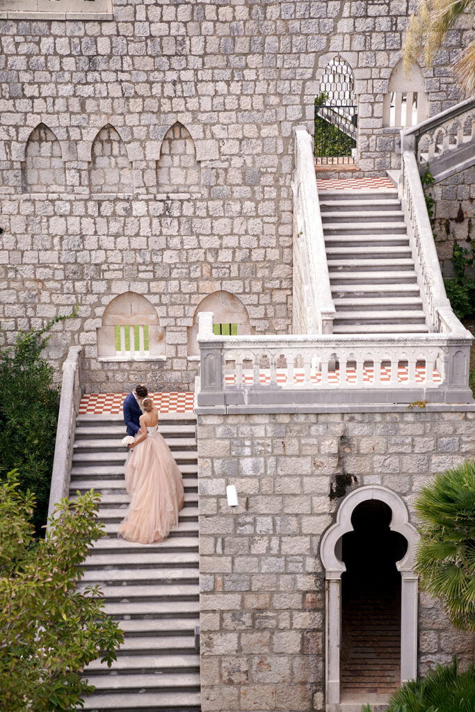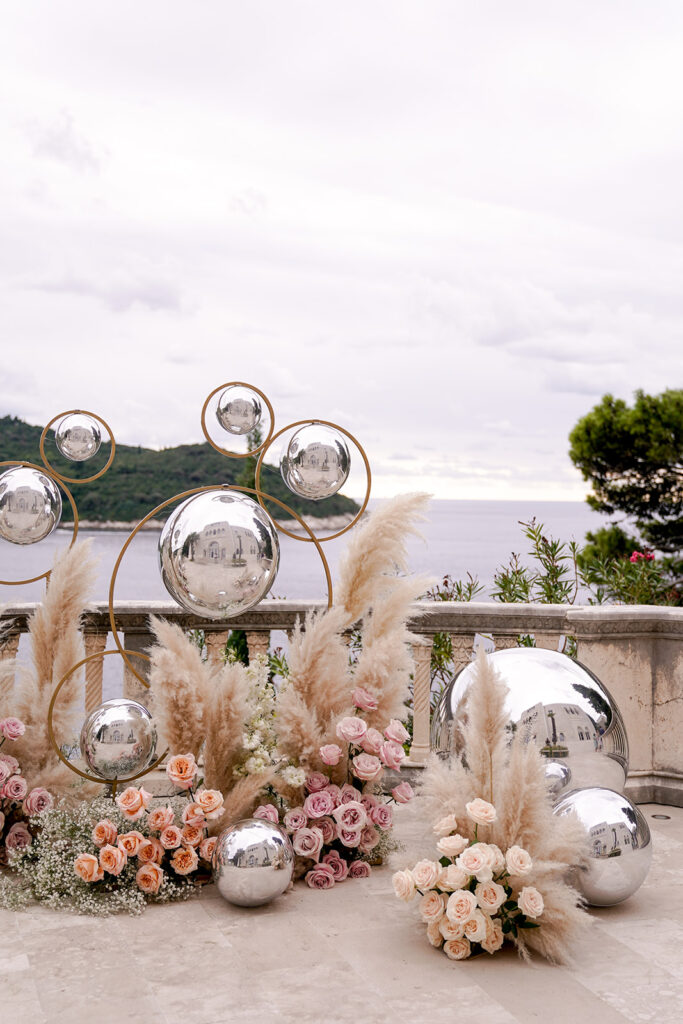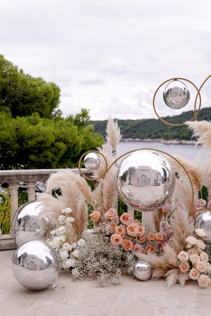 Here’s a luxury wedding in Dubrovnik we planned with our dear partners Wedo Agency at an elite location, Villa Sheherezade. The venue’s thrilling and alluring atmosphere instantly inspired our designs, thoughts, and ideas. Its outstanding surroundings and stunning stone architecture perfectly complemented the event’s theme. We designed the wedding in a classic manner that matched the sweet nature of the couple. We carefully arranged every detail—the staircase, guests' tables, and dance floor—to look remarkable and fascinating for every attendee.