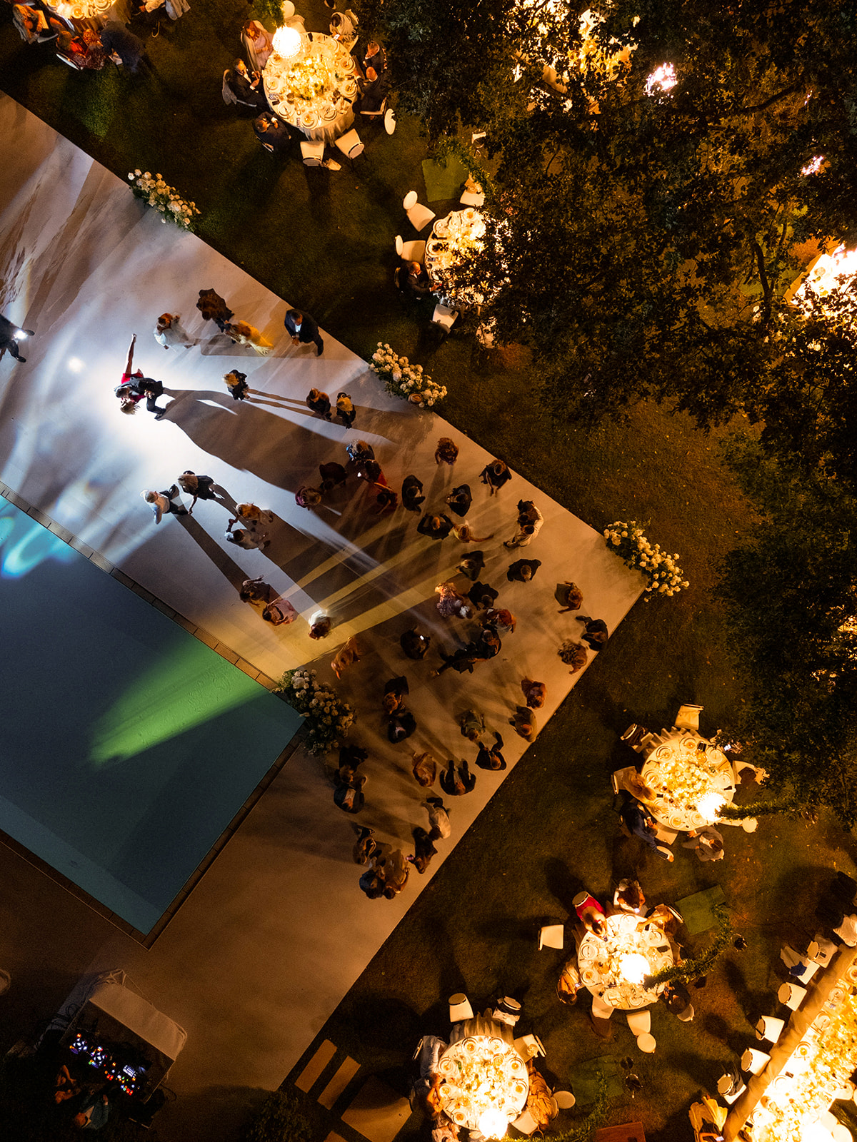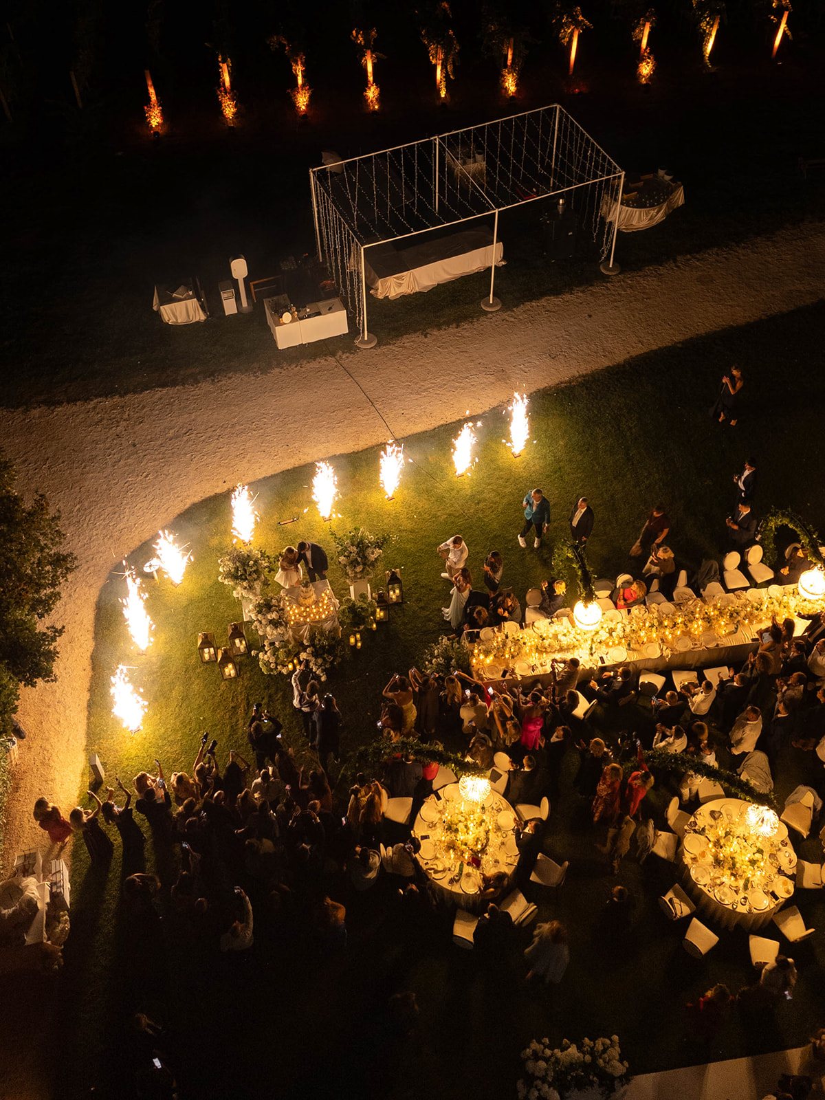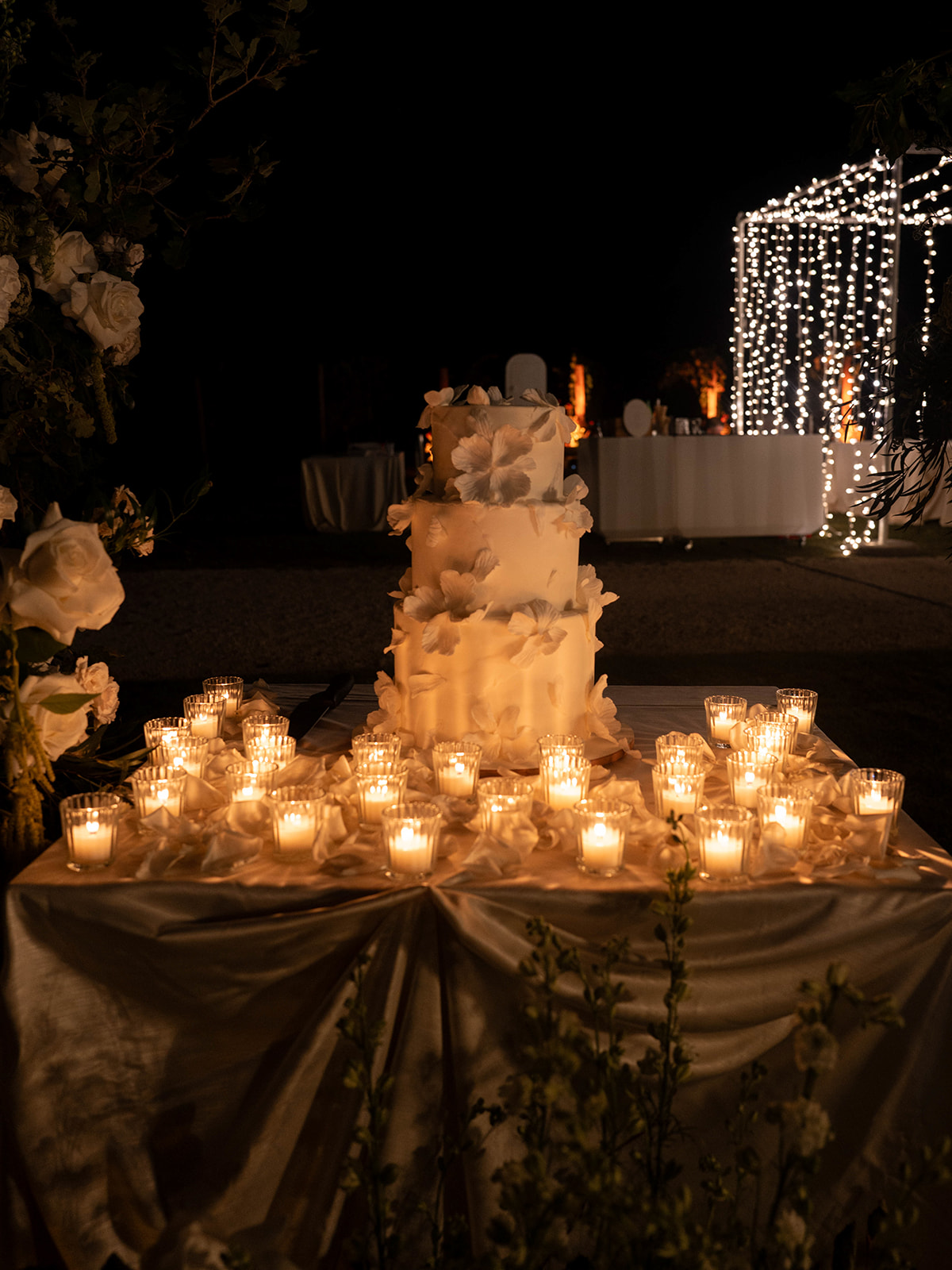 The evening reached its crescendo with an elegant fireworks display above the estate, illuminating the vineyards and marking a joyful shift into the night. Shortly after, the wedding cake was presented outdoors beneath the trees, surrounded by candlelight and live music, turning a traditional moment into a shared, intimate experience.
