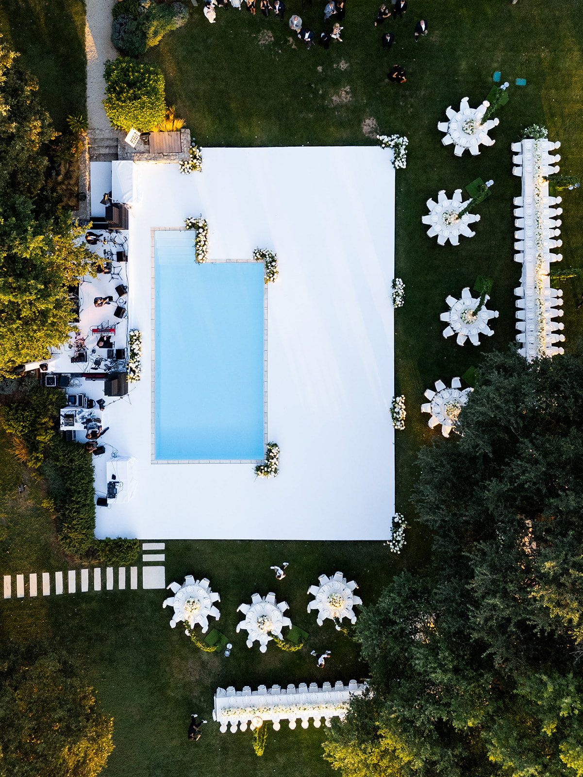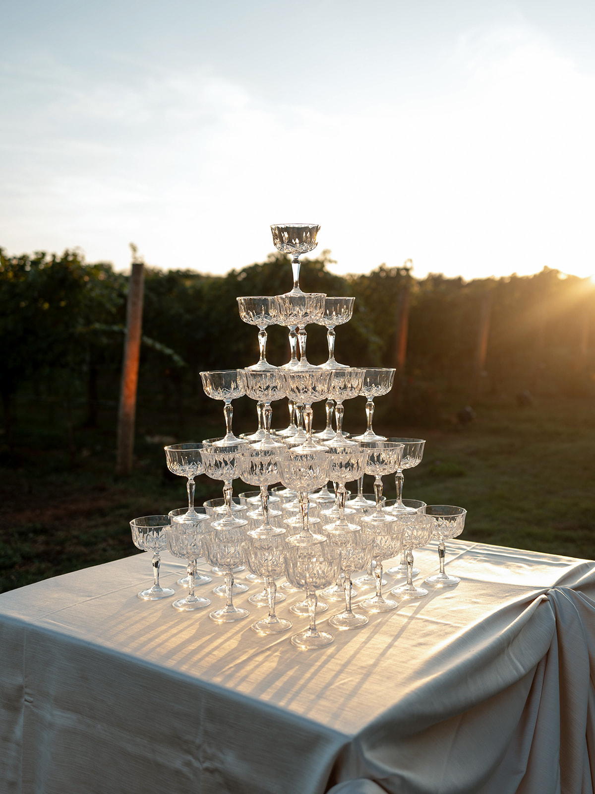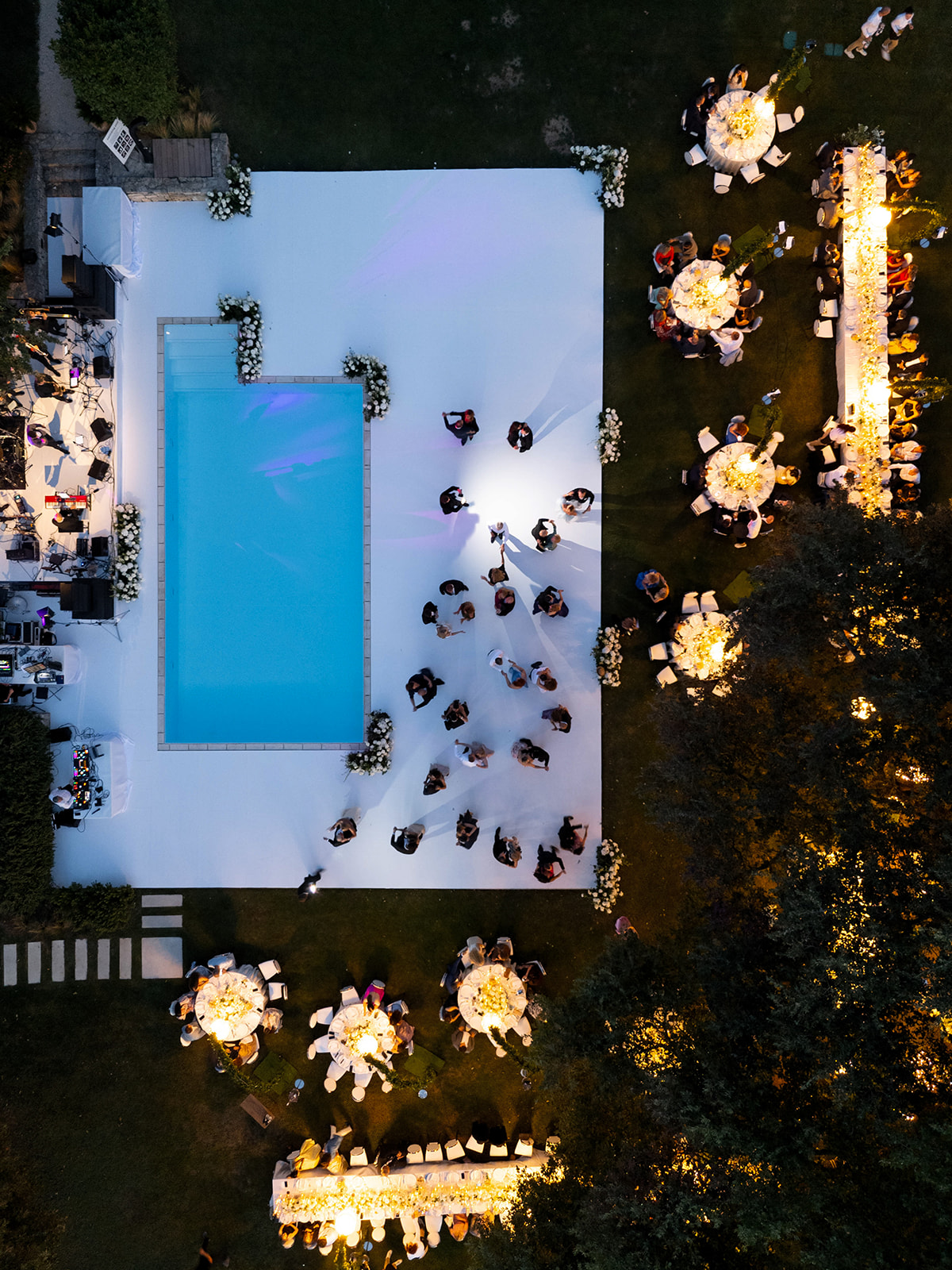 The evening reached its crescendo with an elegant fireworks display above the estate, illuminating the vineyards and marking a joyful shift into the night. Shortly after, the wedding cake was presented outdoors beneath the trees, surrounded by candlelight and live music, turning a traditional moment into a shared, intimate experience.