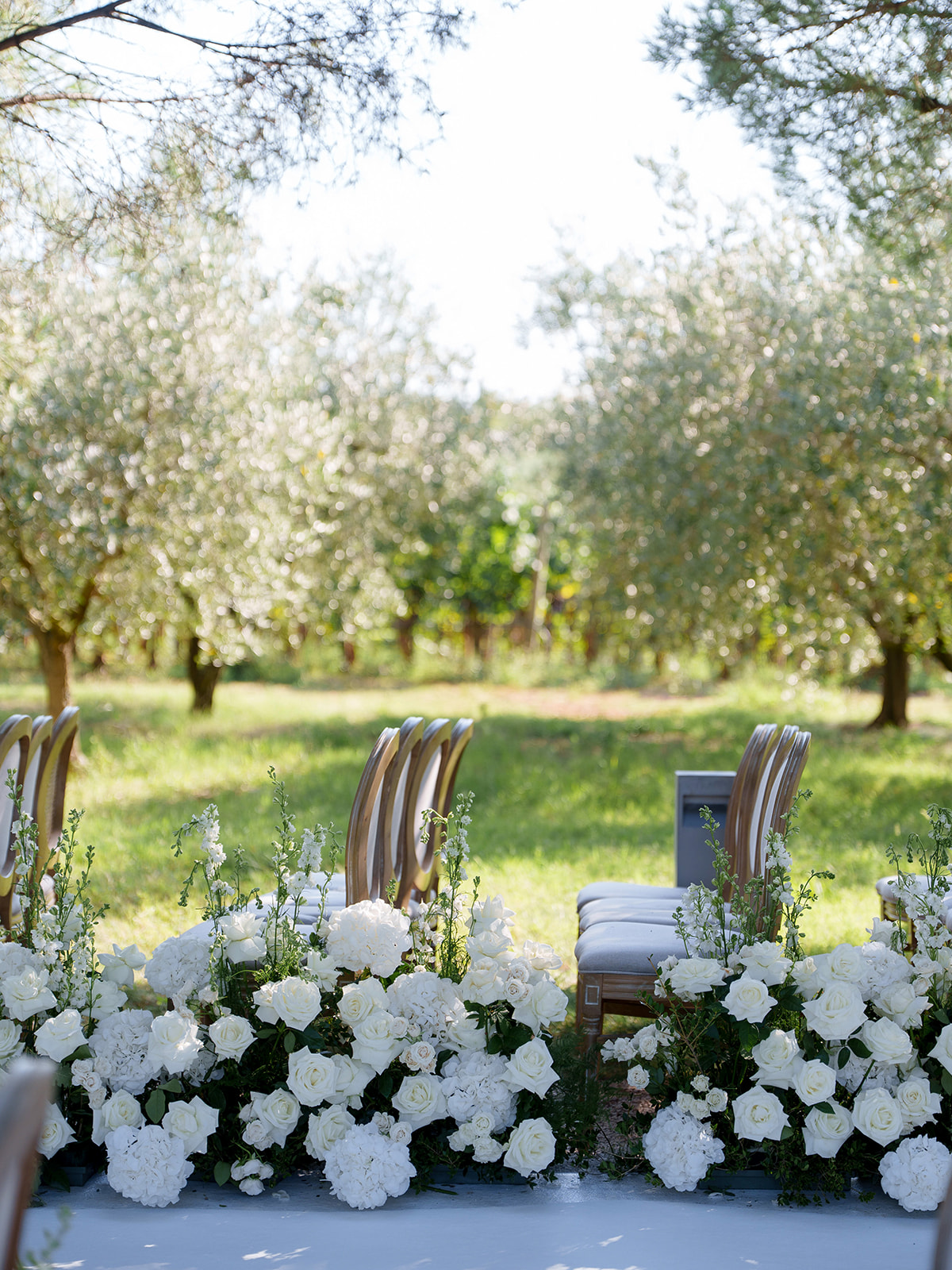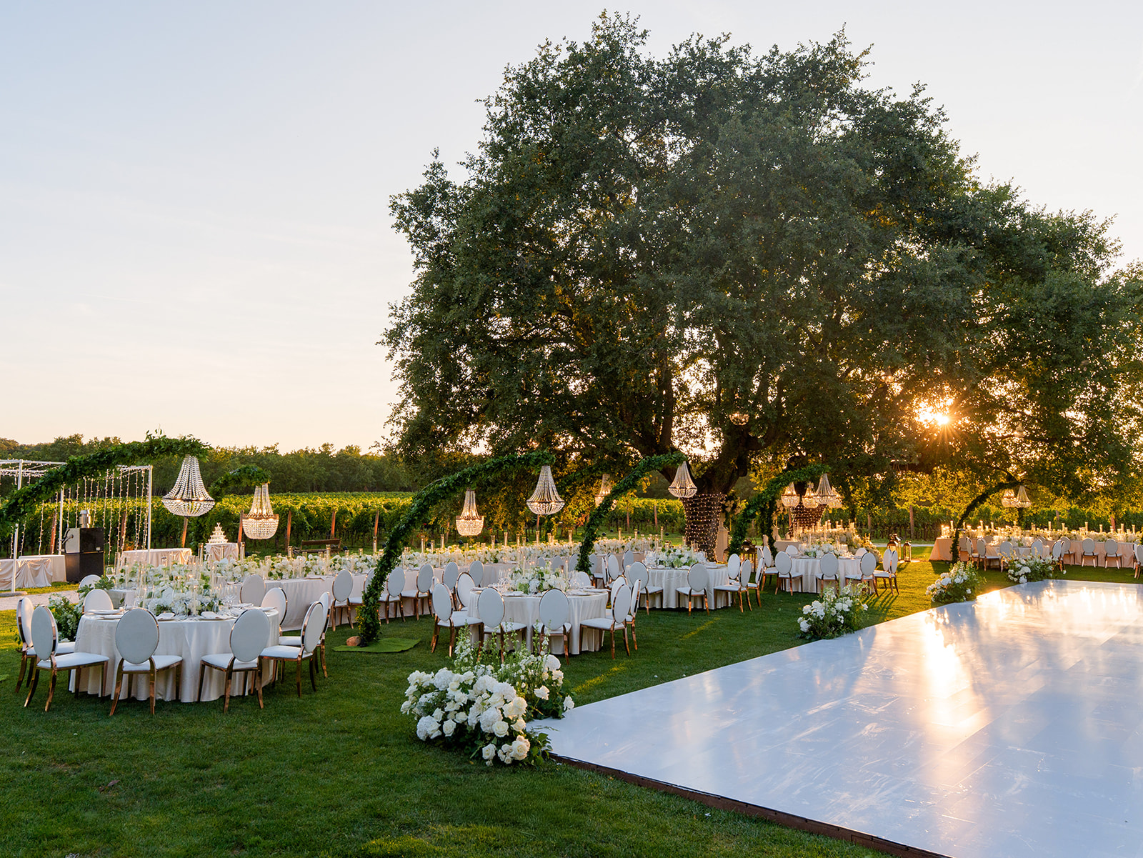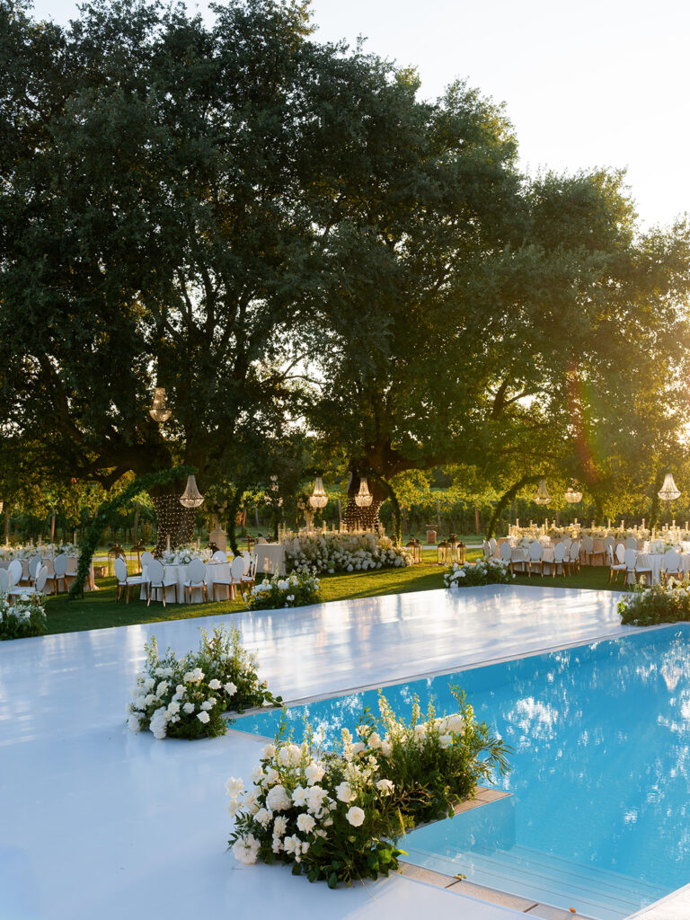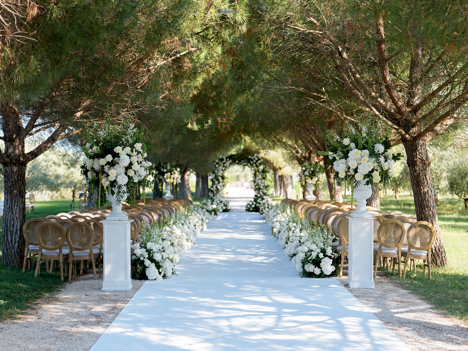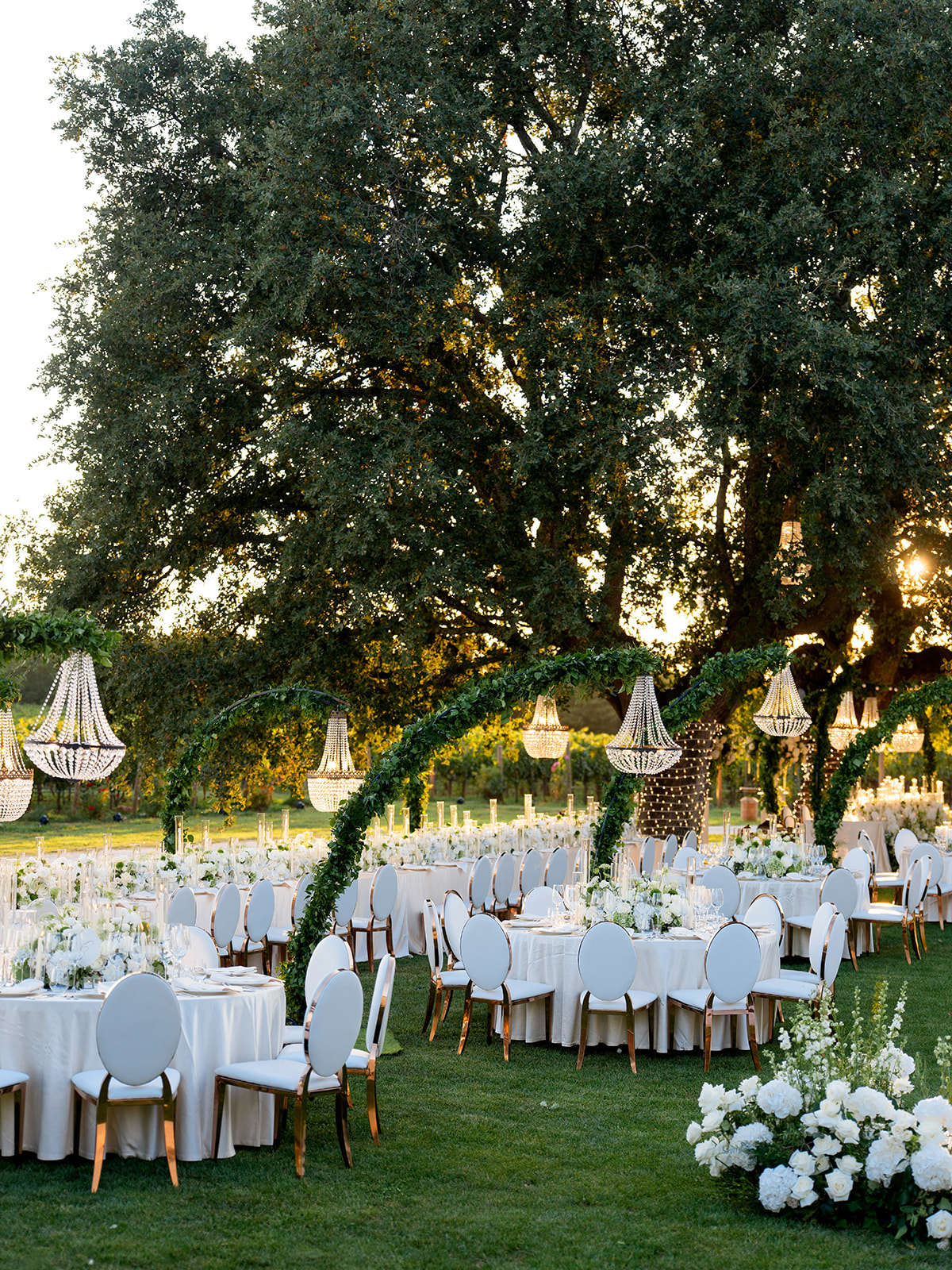 The wedding ceremony took place beneath Meneghetti’s iconic trees, with a refined aisle framed by white florals and greenery. Guests gathered in a setting that felt timeless and organic, where the landscape itself became the design. A Meneghetti wedding ceremony is defined by simplicity and balance — elegant, natural, and deeply connected to its surroundings.