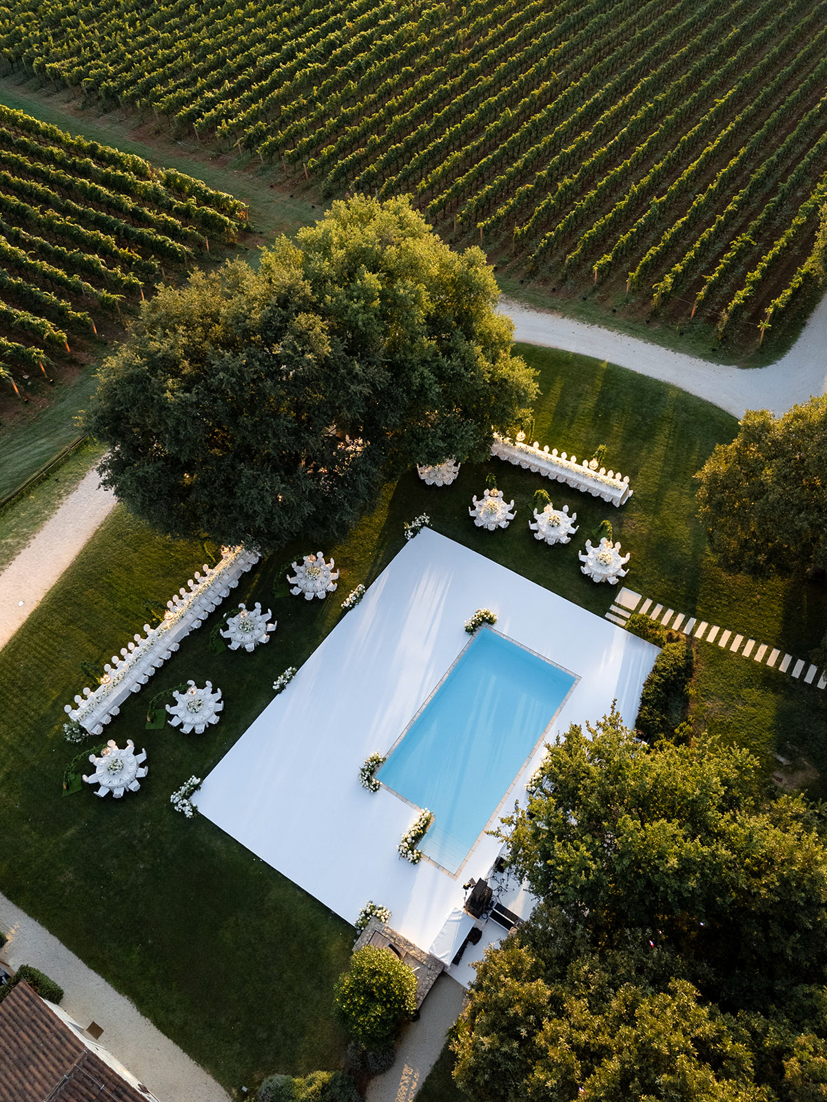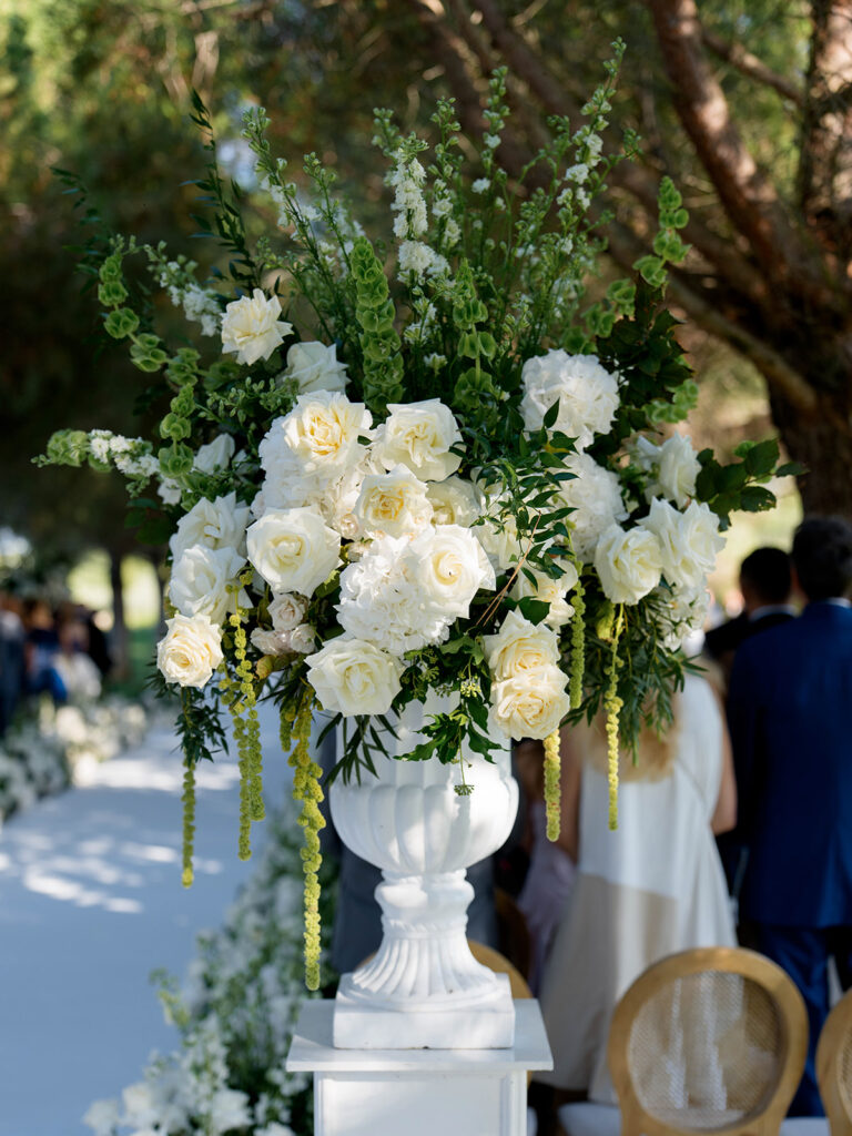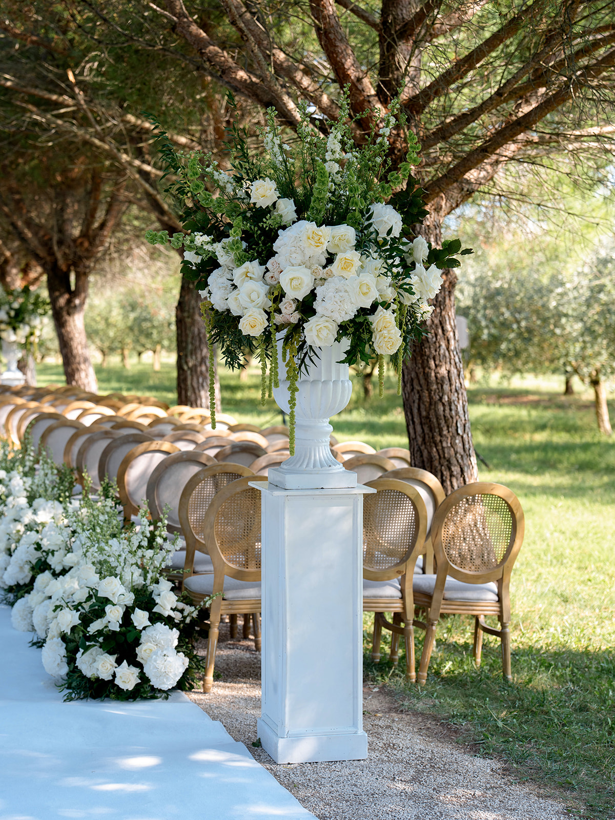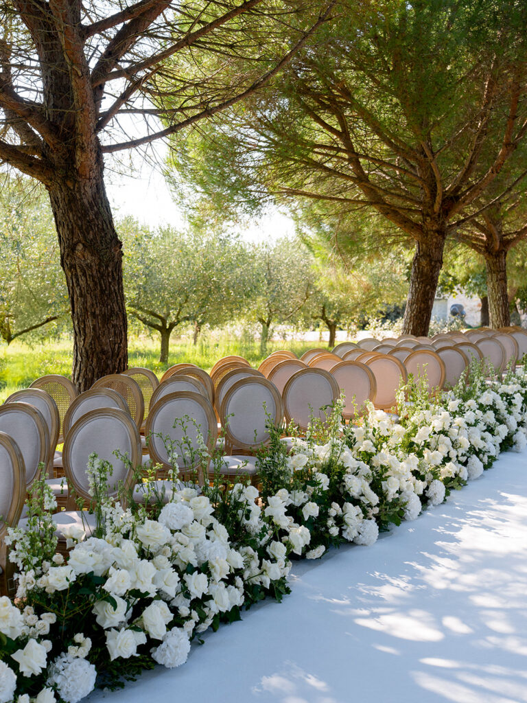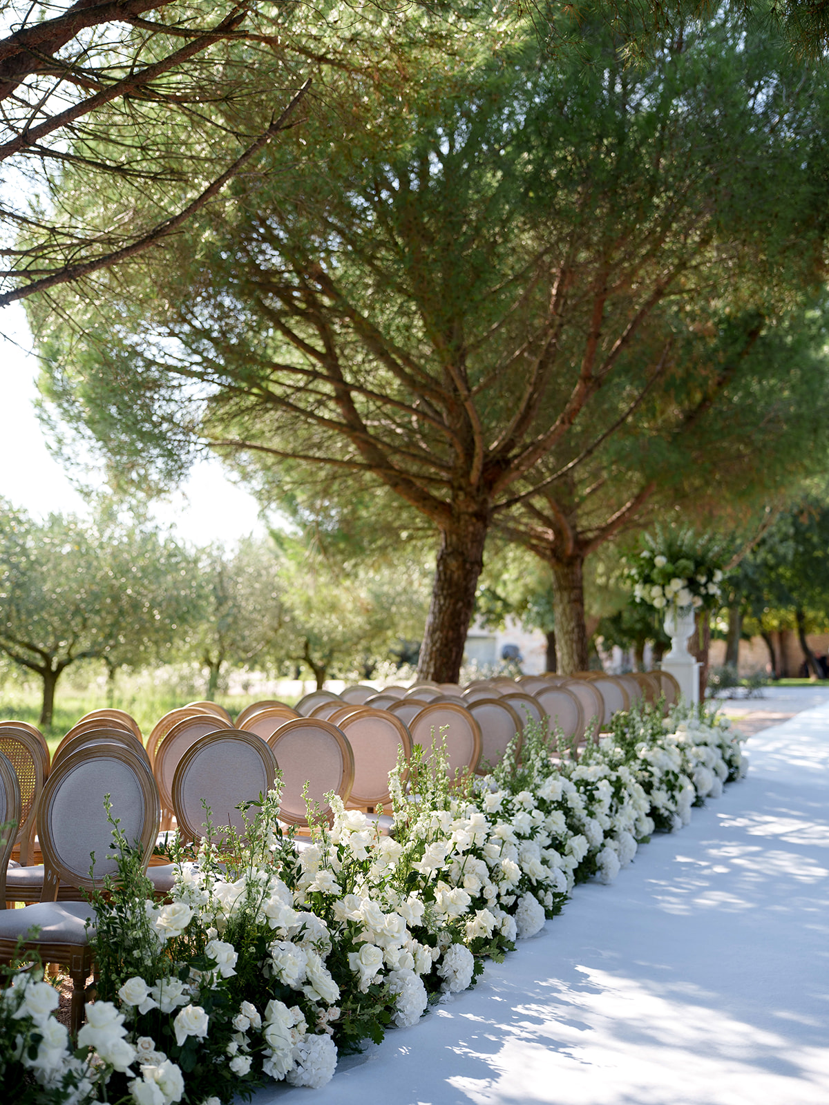 The wedding ceremony took place beneath Meneghetti’s iconic trees, with a refined aisle framed by white florals and greenery. Guests gathered in a setting that felt timeless and organic, where the landscape itself became the design. A Meneghetti wedding ceremony is defined by simplicity and balance — elegant, natural, and deeply connected to its surroundings.
