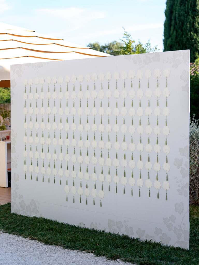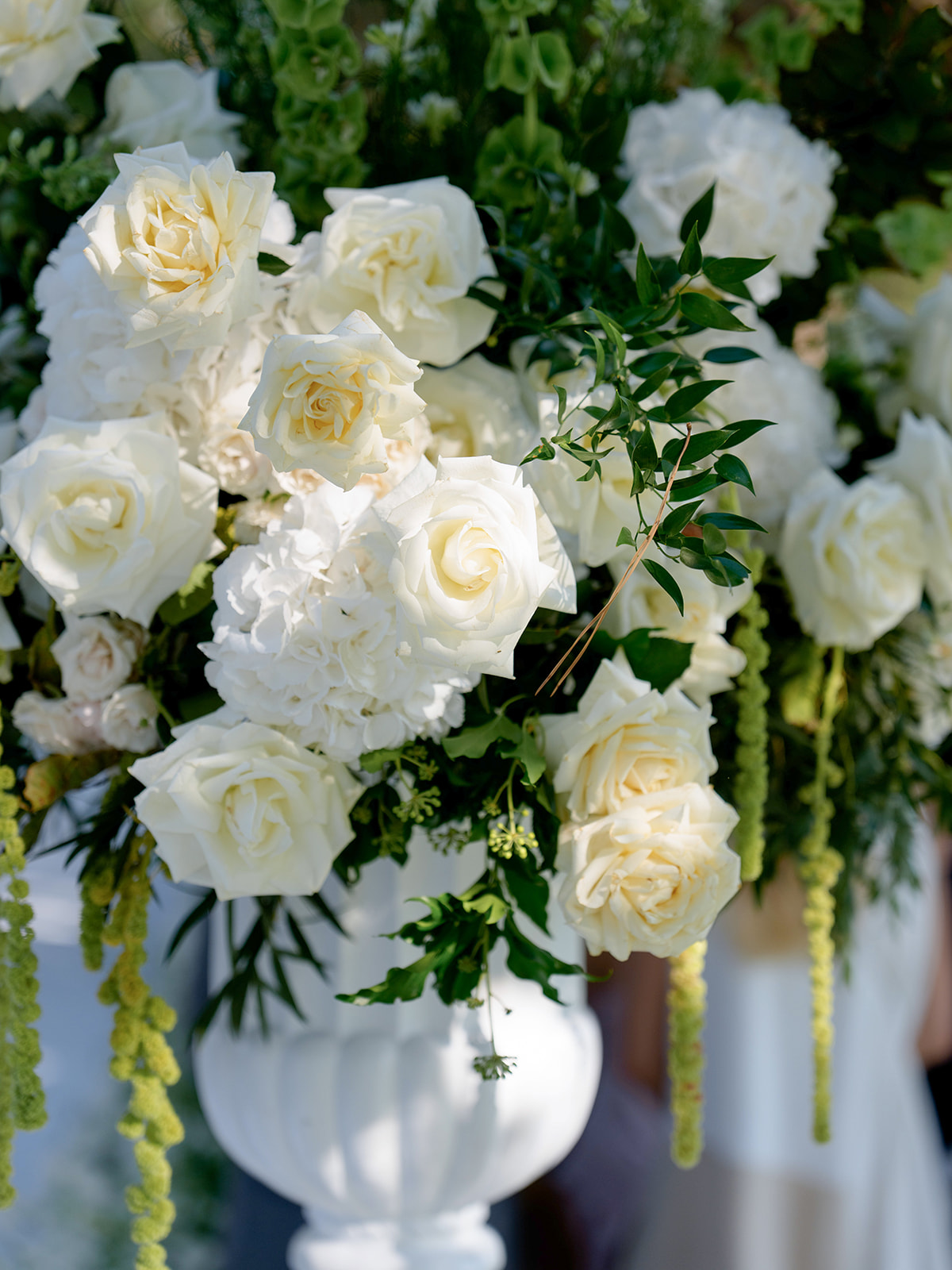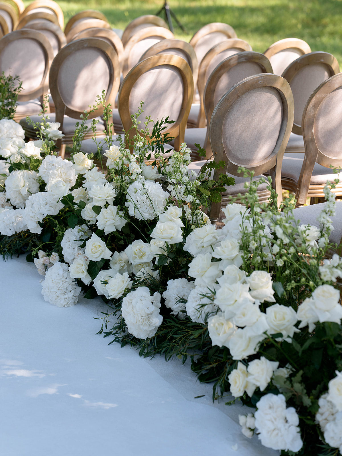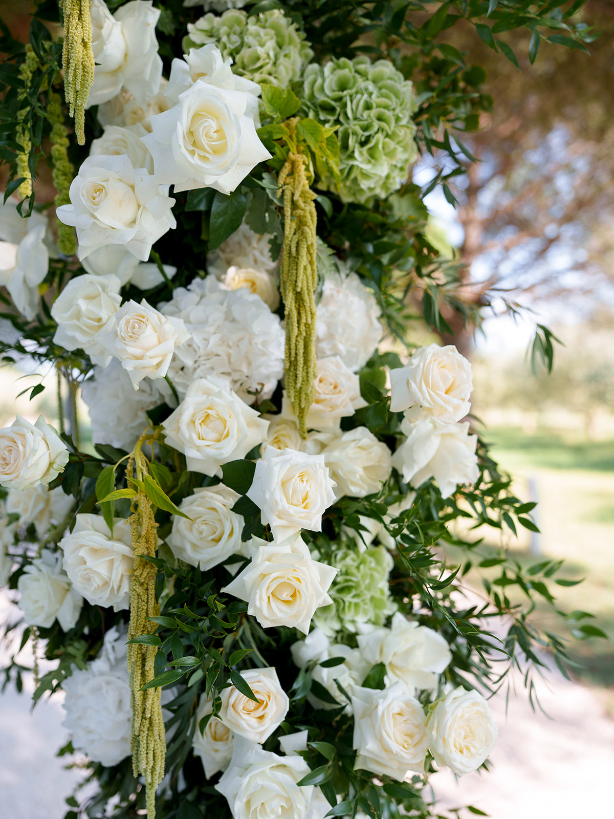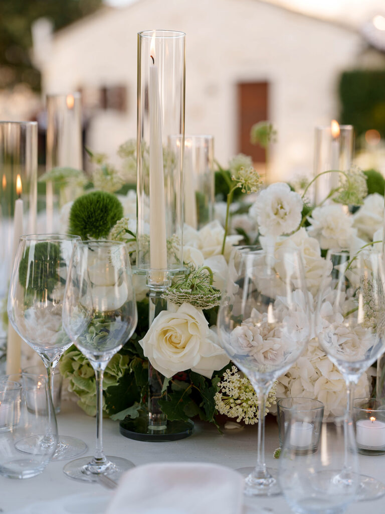 The wedding ceremony took place beneath Meneghetti’s iconic trees, with a refined aisle framed by white florals and greenery. Guests gathered in a setting that felt timeless and organic, where the landscape itself became the design. A Meneghetti wedding ceremony is defined by simplicity and balance — elegant, natural, and deeply connected to its surroundings.