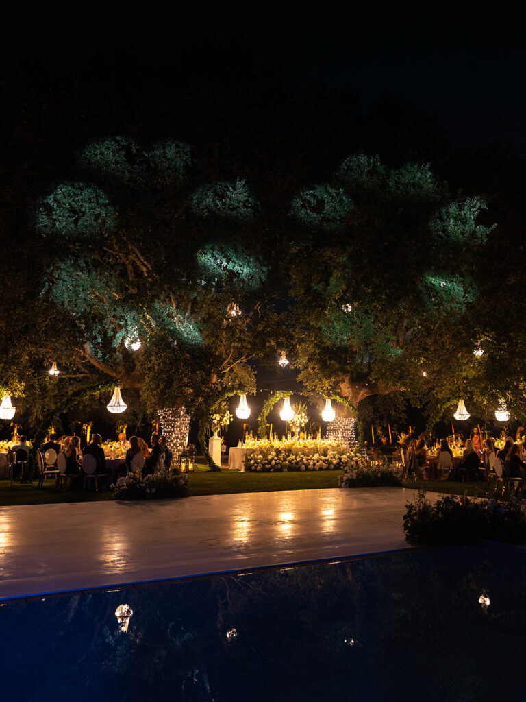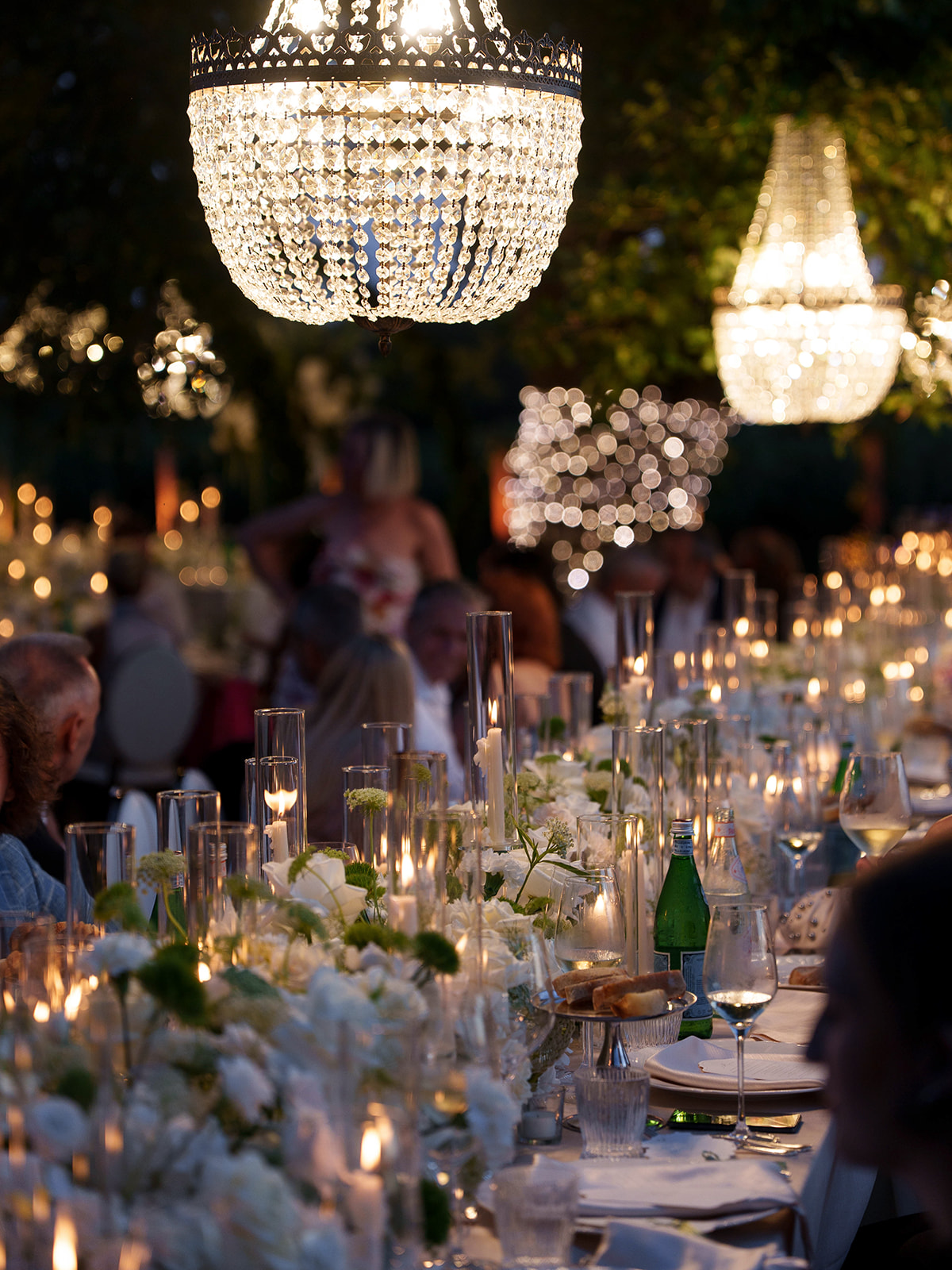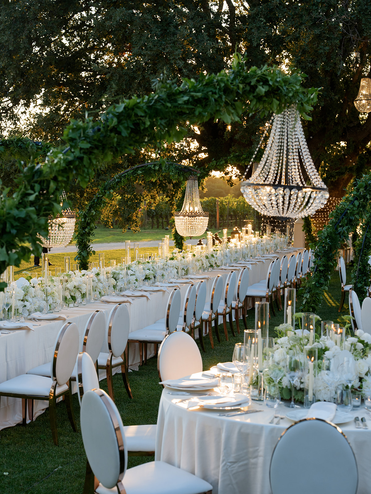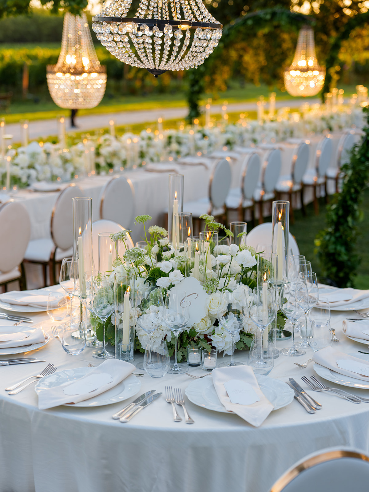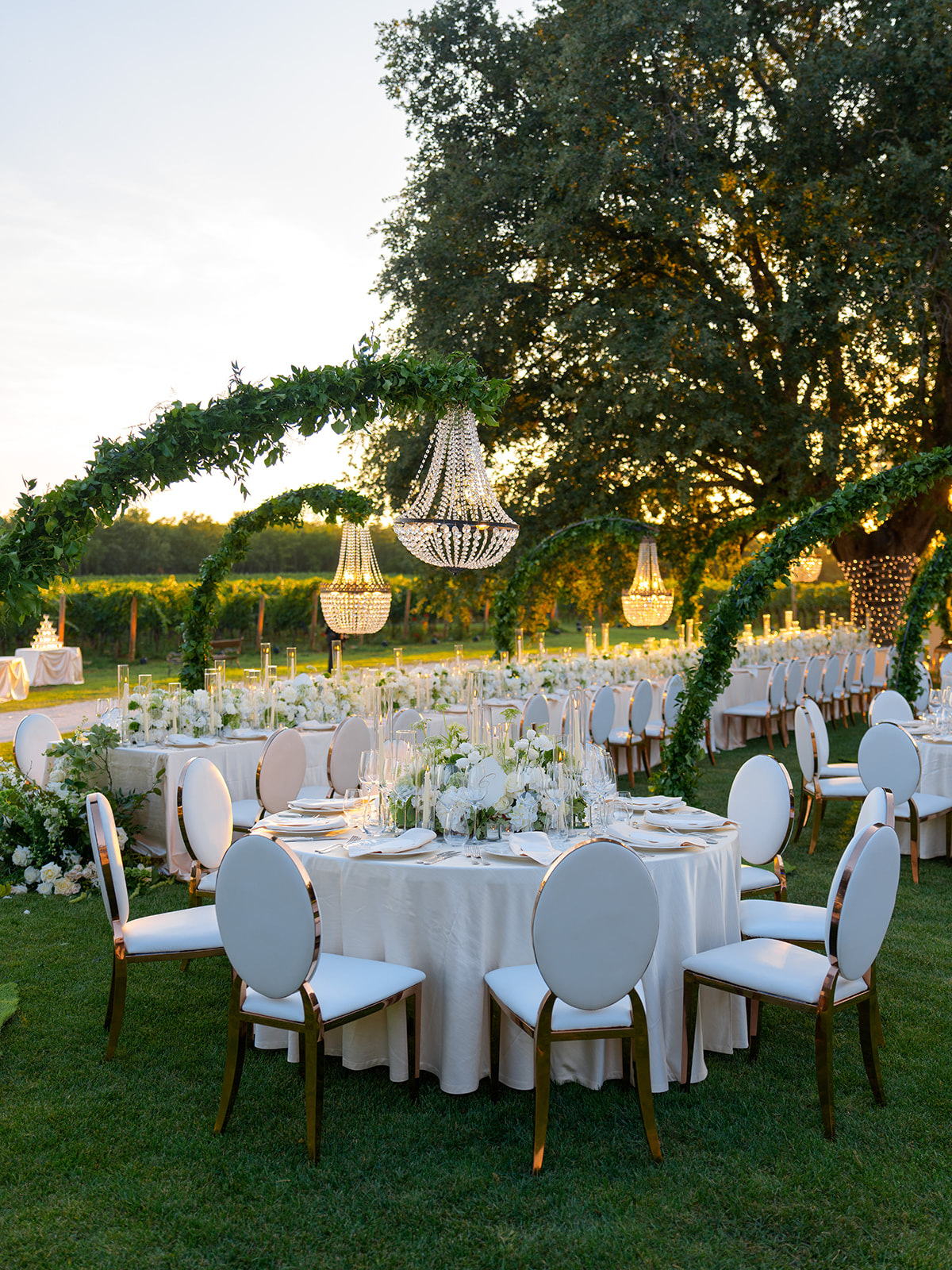 As night fell, the celebration continued beneath centuries-old trees, where a combination of long banquet tables and elegant round tables was arranged across the lawn. Candlelight, subtle florals, and chandeliers created an atmosphere that felt intimate yet expansive. This layered reception design encouraged movement, conversation, and a natural flow between dining, music, and celebration — a hallmark of a luxury wedding at Meneghetti.