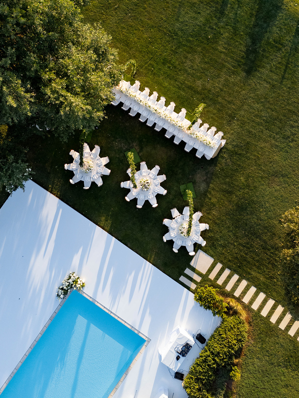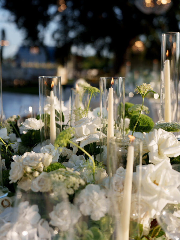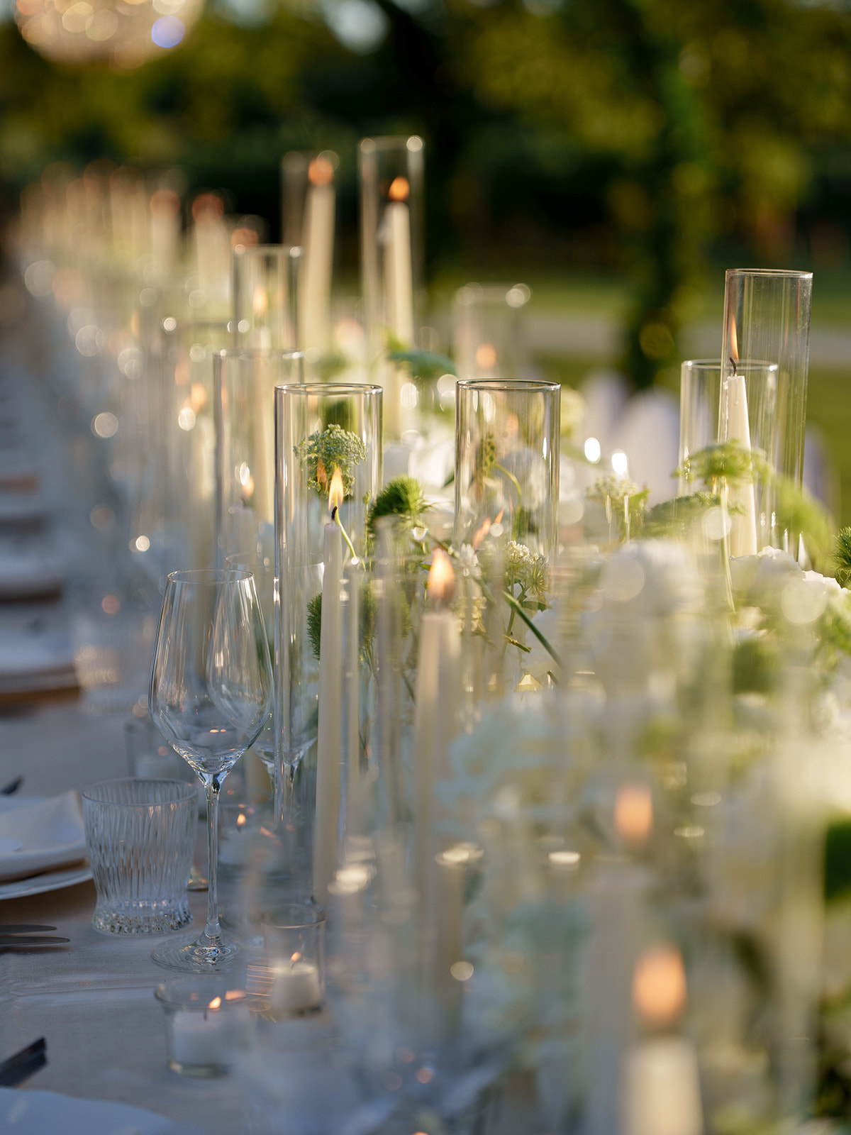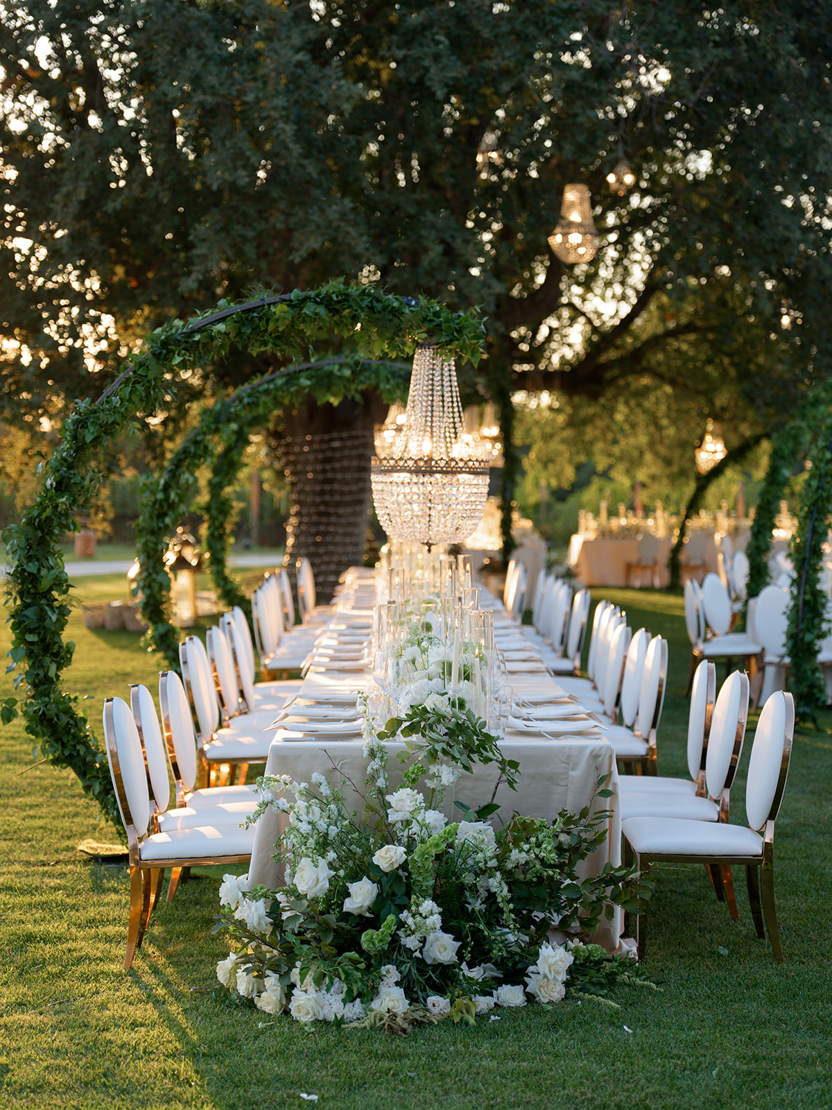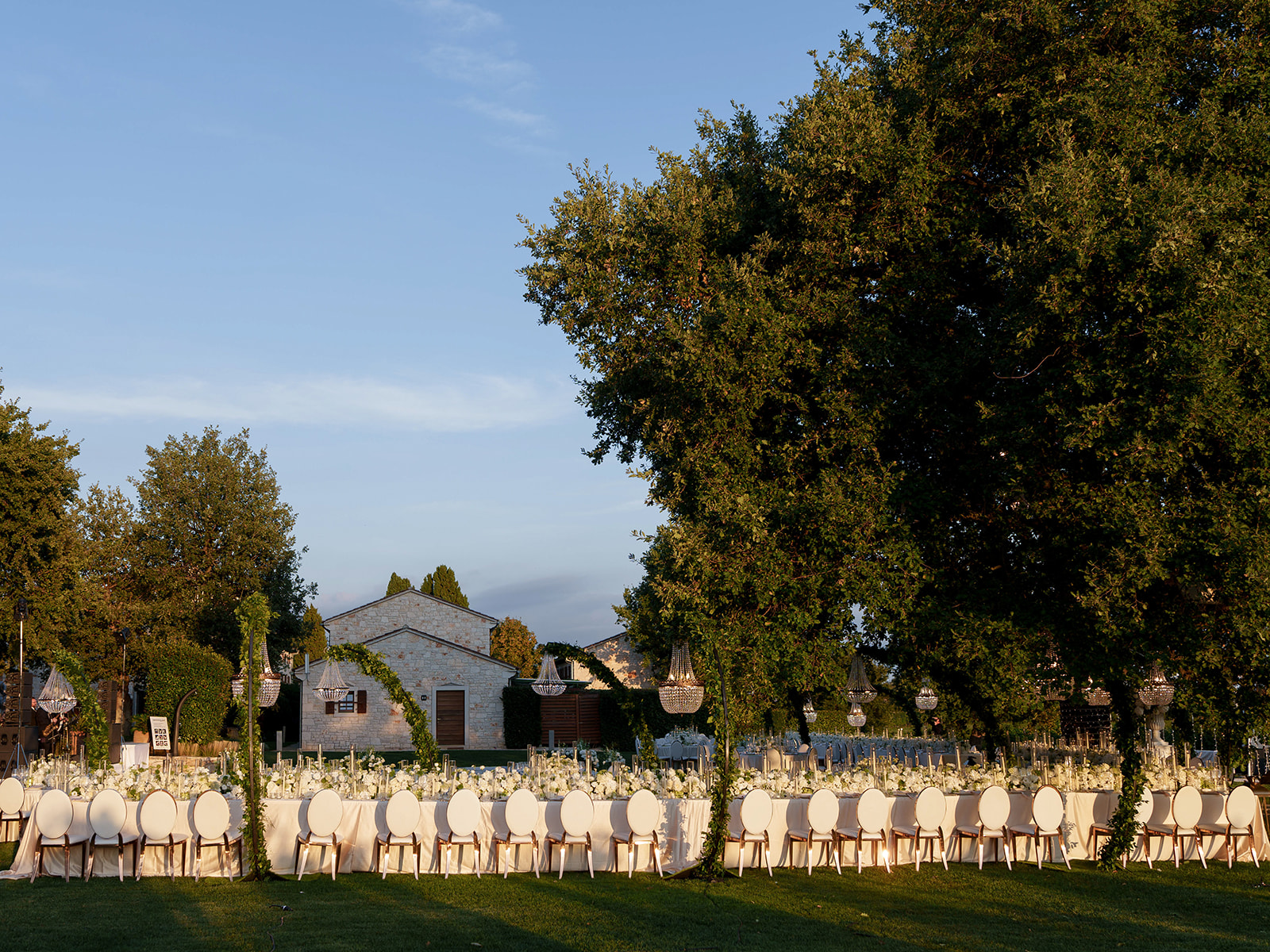 As night fell, the celebration continued beneath centuries-old trees, where a combination of long banquet tables and elegant round tables was arranged across the lawn. Candlelight, subtle florals, and chandeliers created an atmosphere that felt intimate yet expansive. This layered reception design encouraged movement, conversation, and a natural flow between dining, music, and celebration — a hallmark of a luxury wedding at Meneghetti.